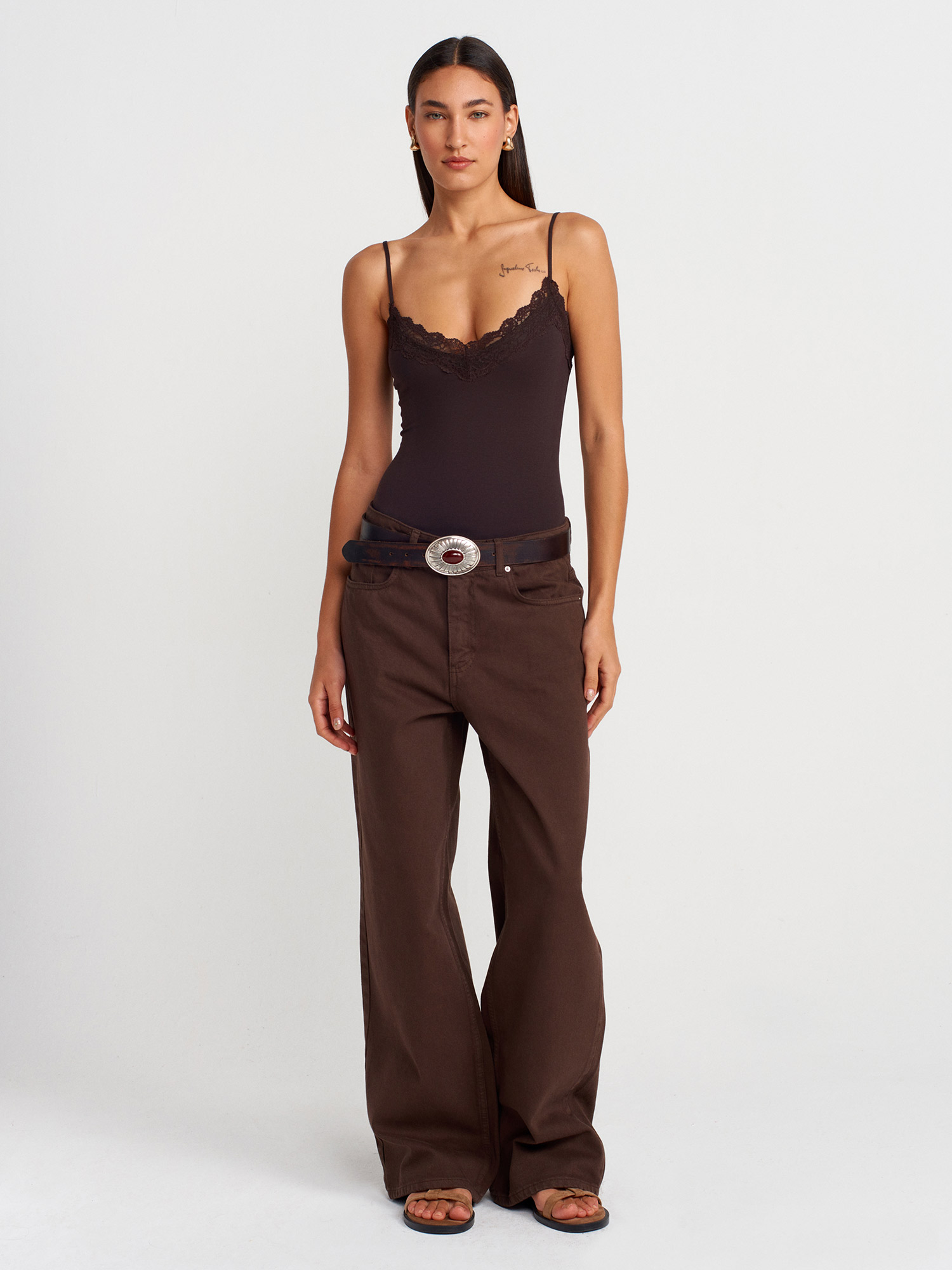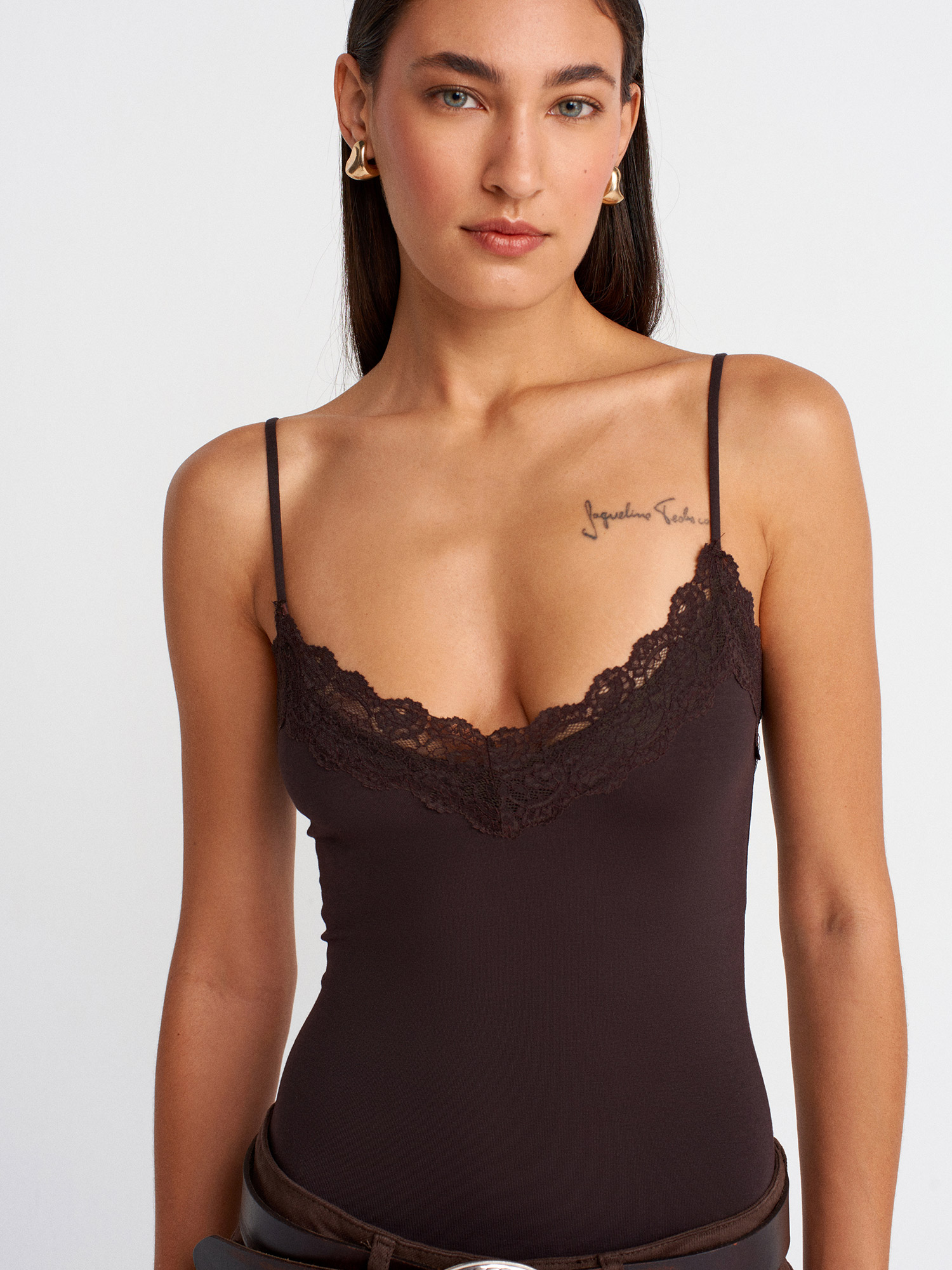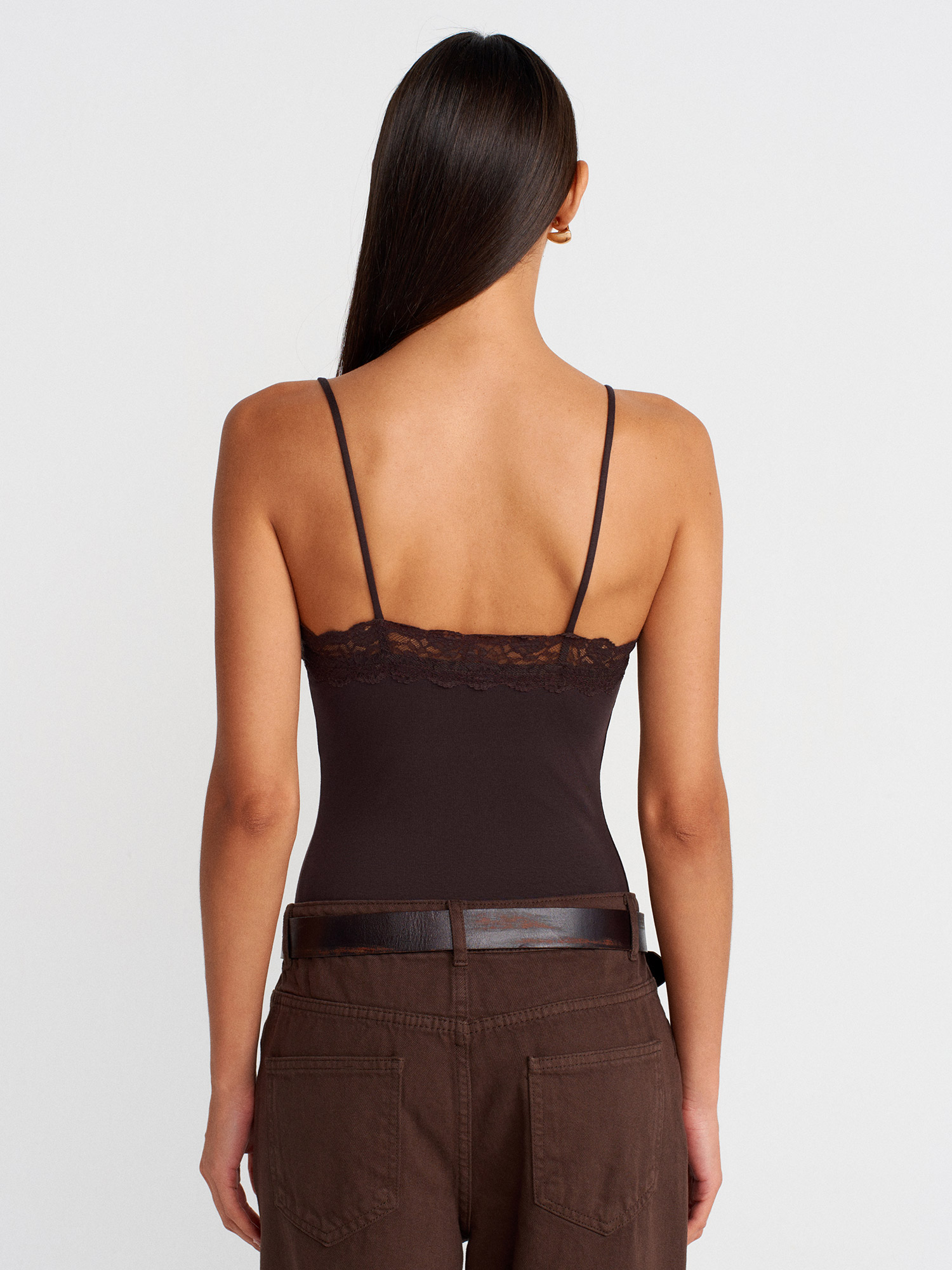 21030 Dantel Detaylı Bodysuit-Koyu Kahve