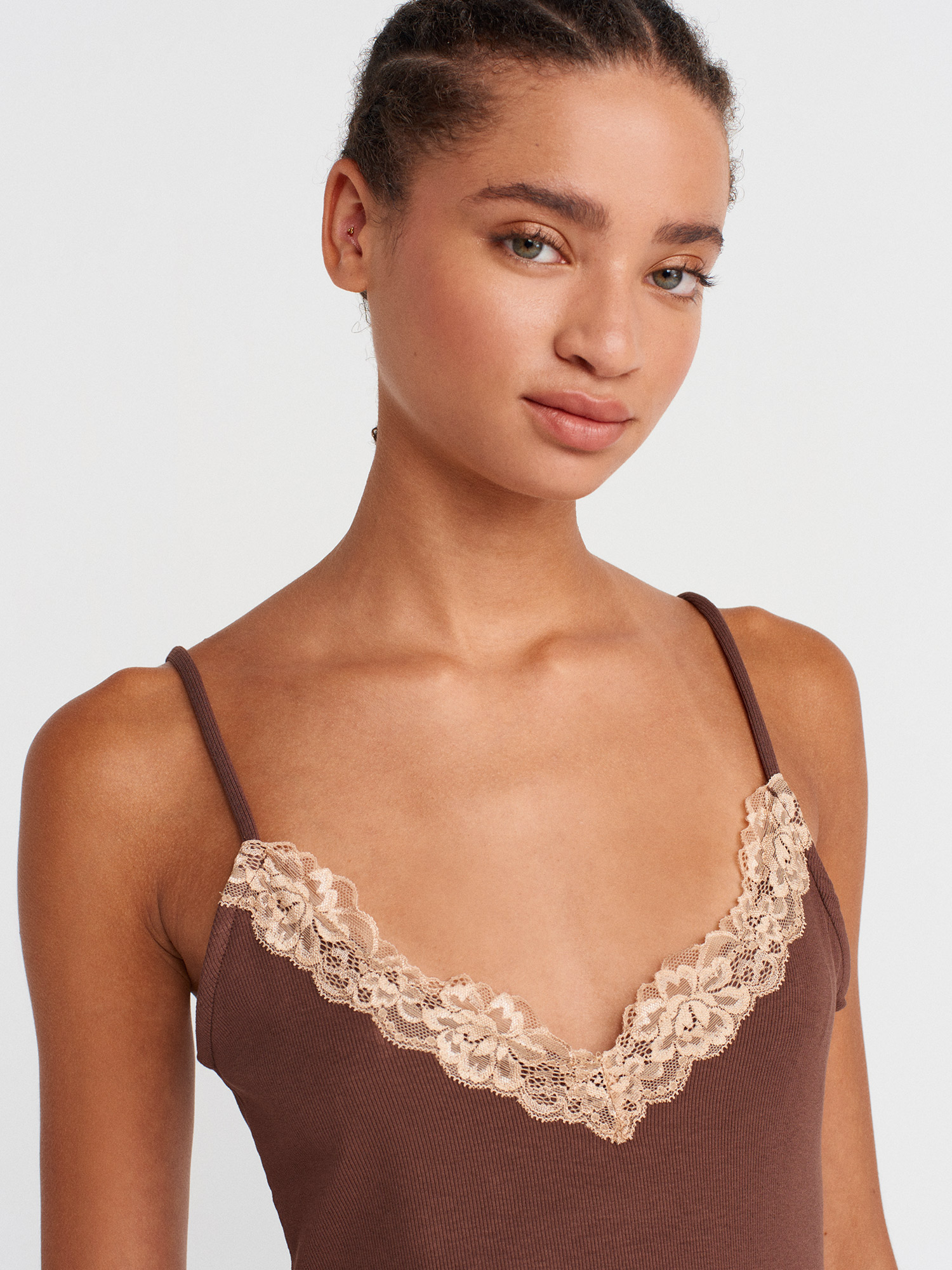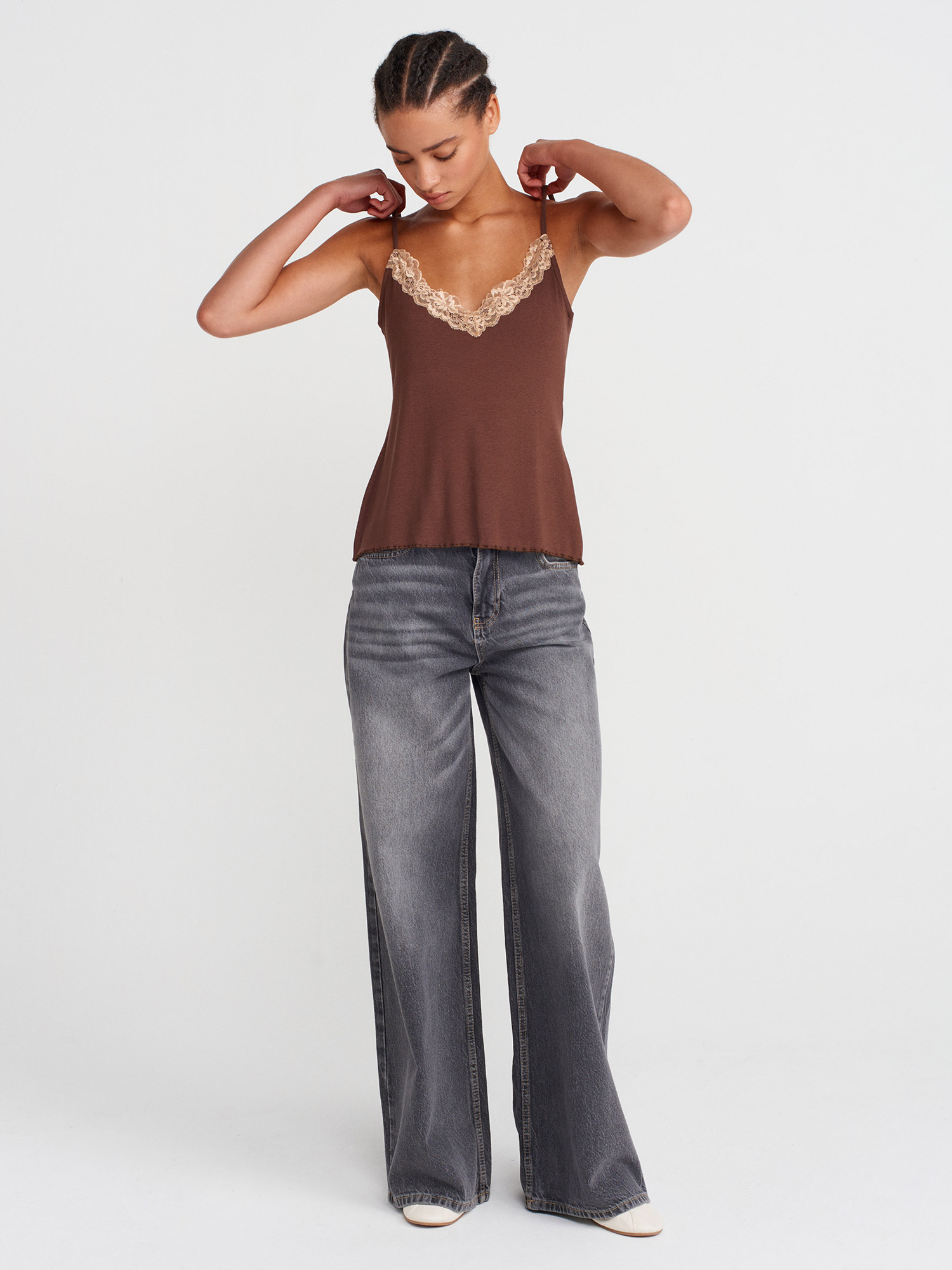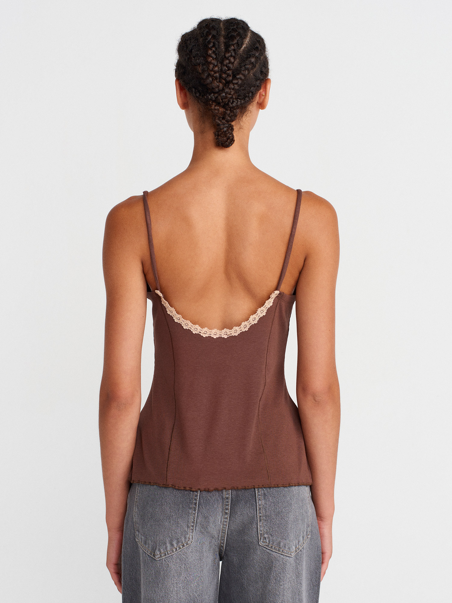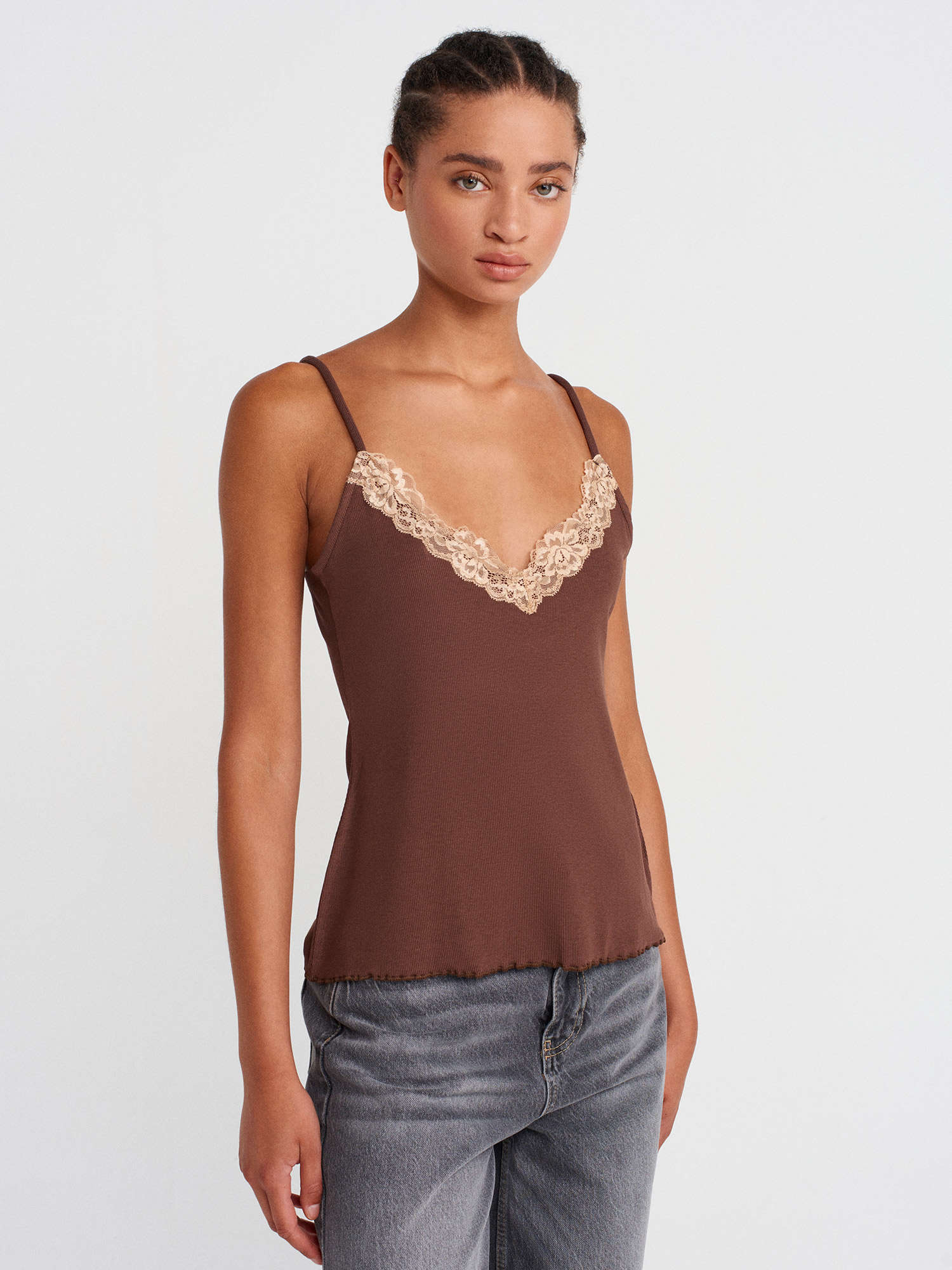 21066 Dantel Şeritli Askılı Top-Açık Kahve