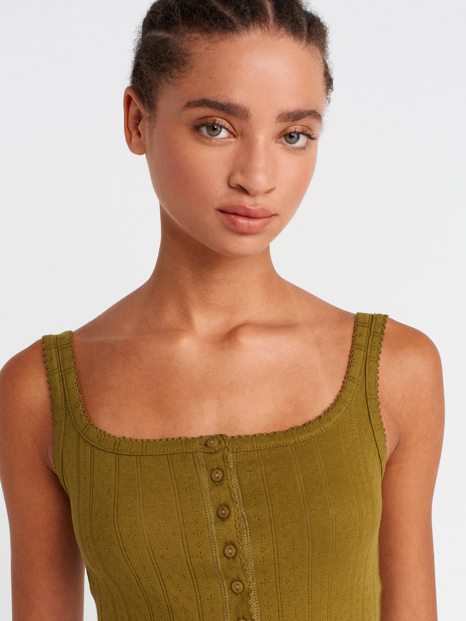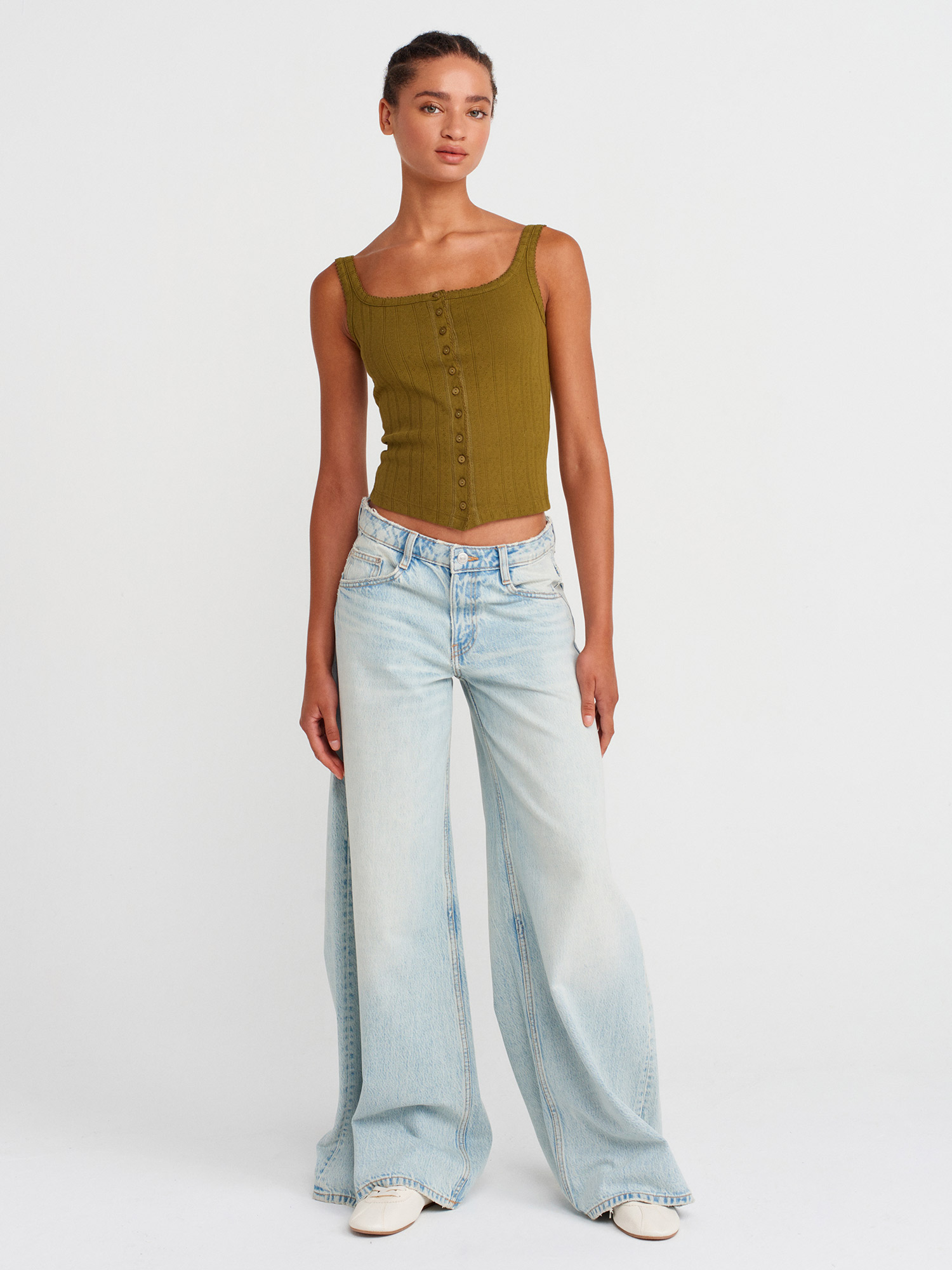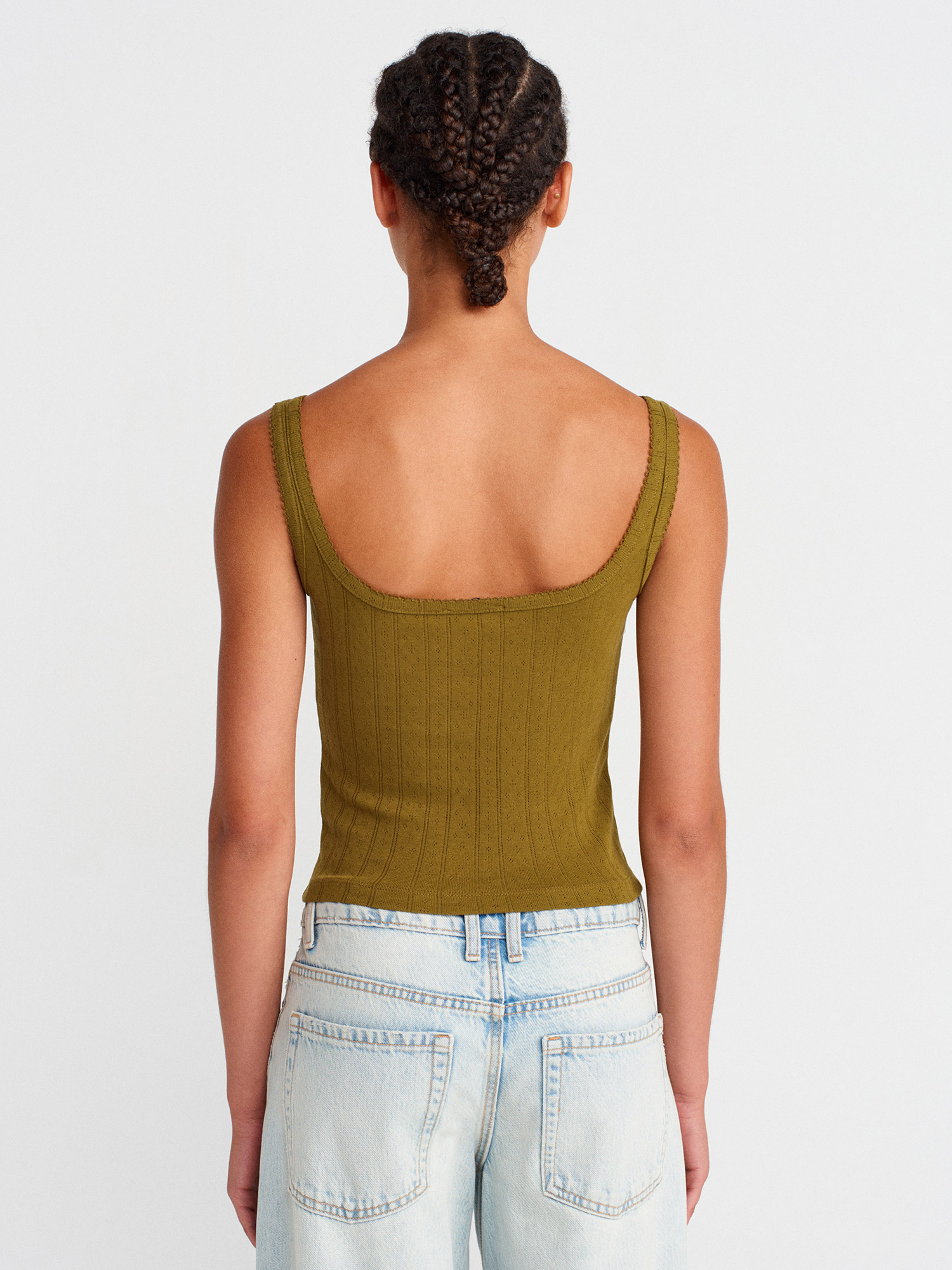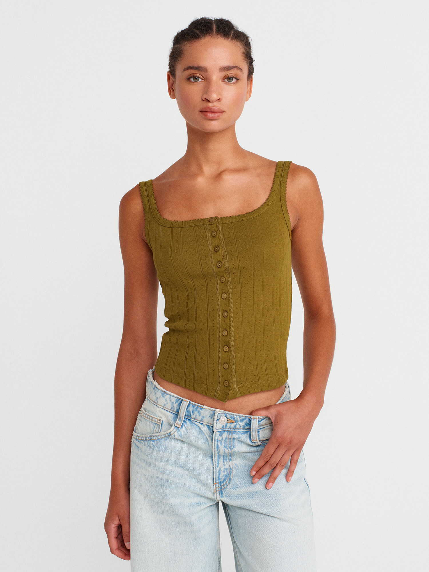 21068 Düğmeli Kare Yaka Top-Koyu Yeşil