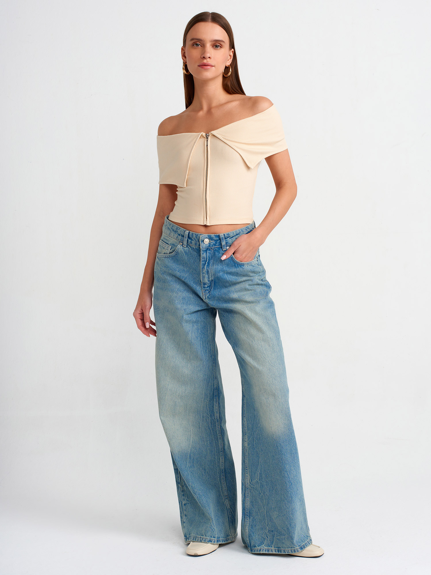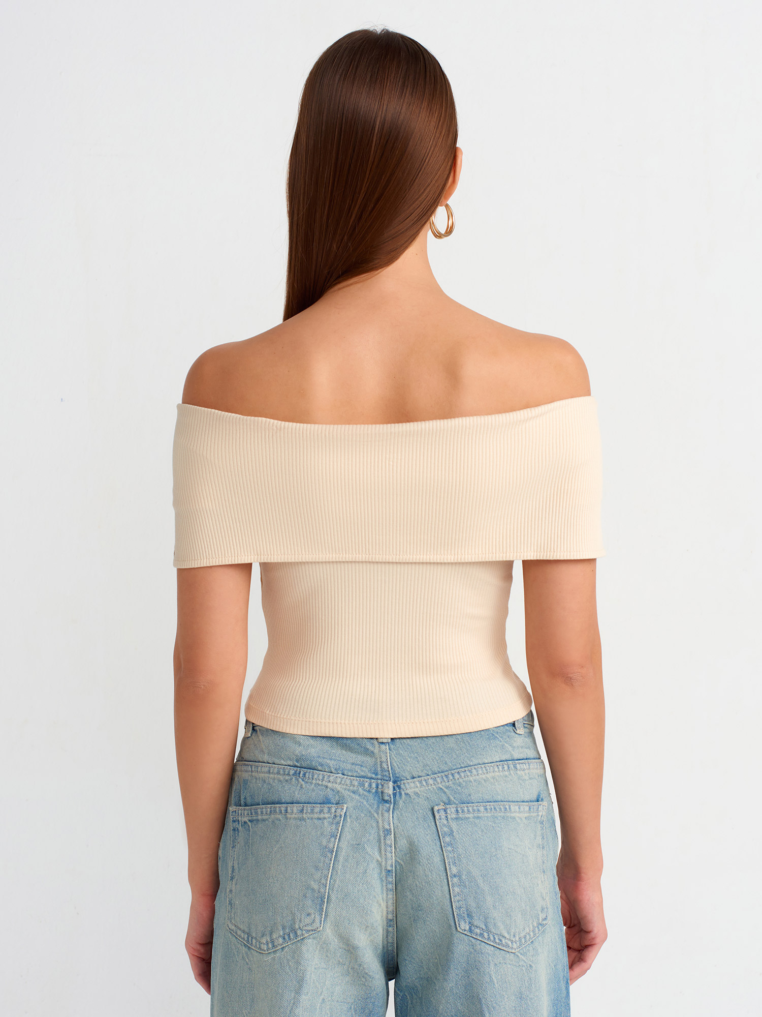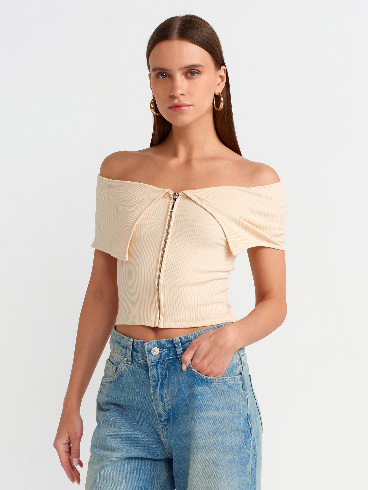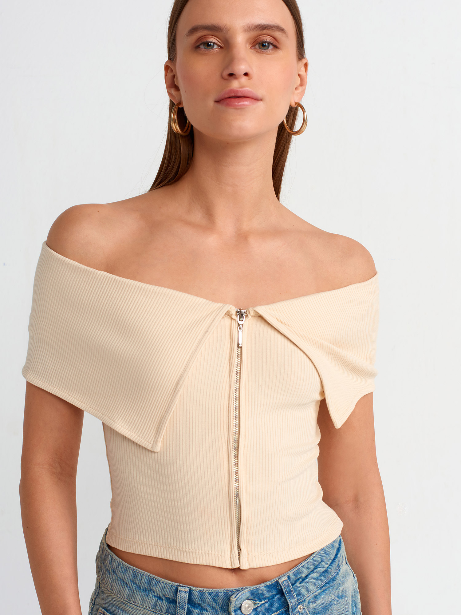 30748 Omuzları Açık Fermuar Detaylı Top-Bej