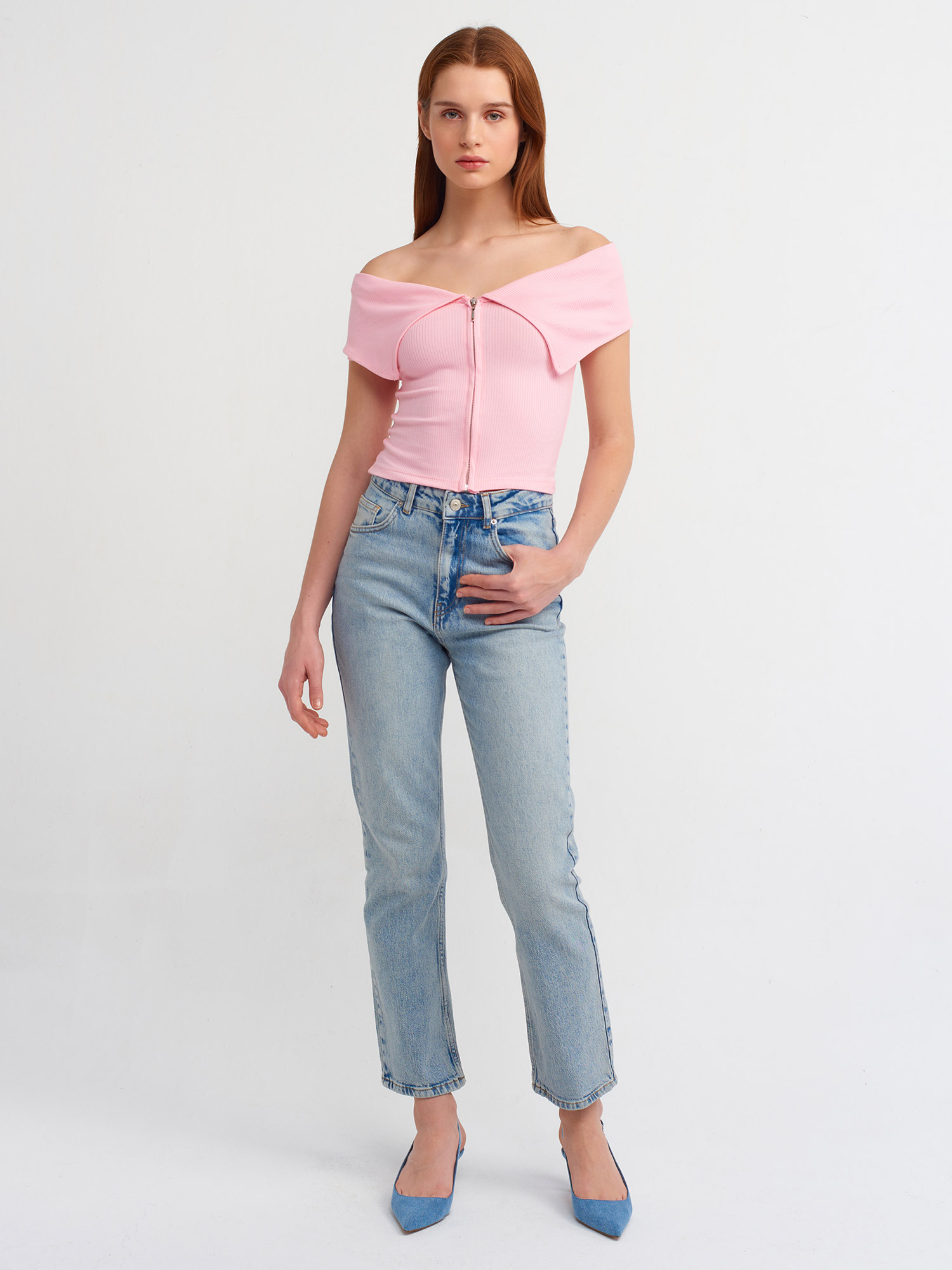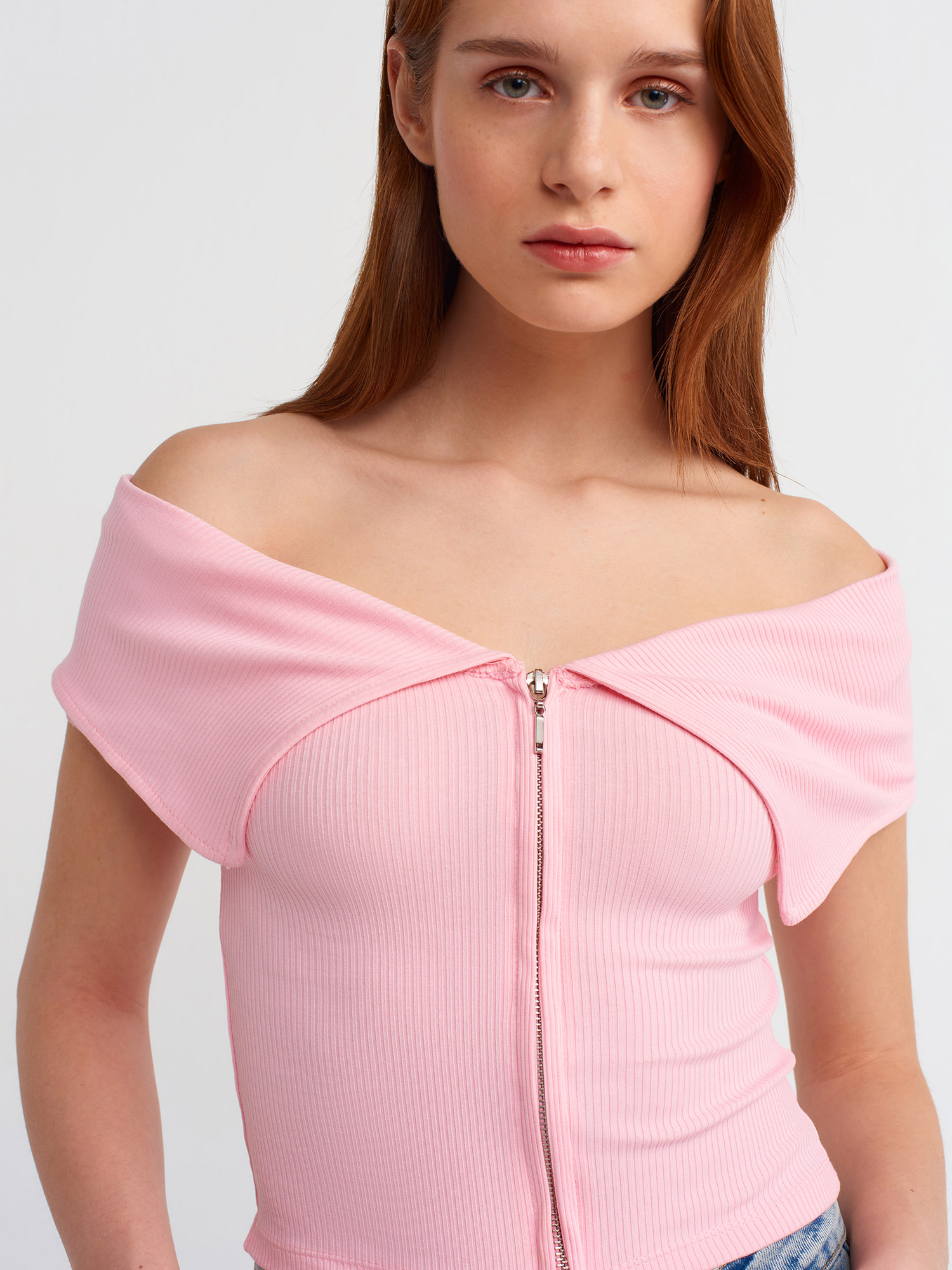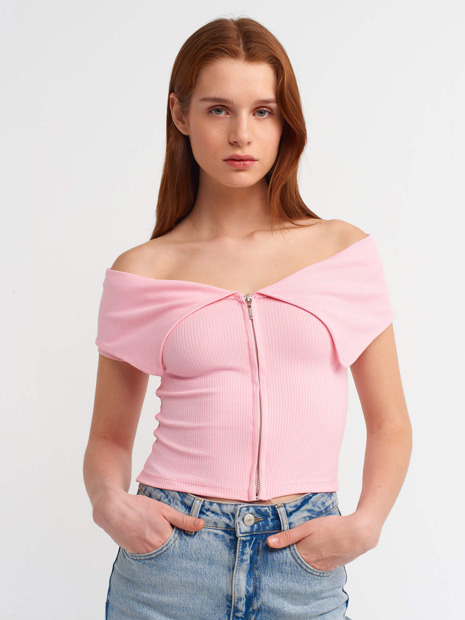 30748 Omuzları Açık Fermuar Detaylı Top-Pembe