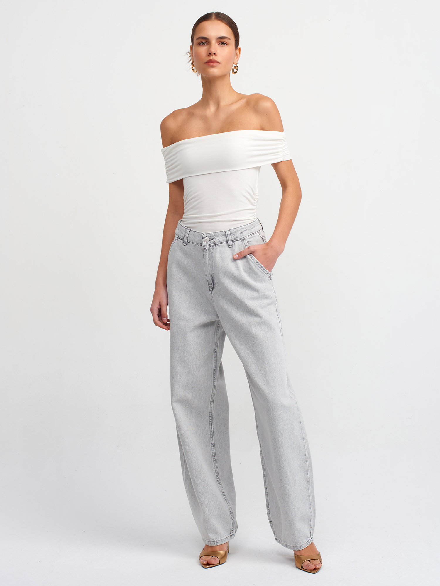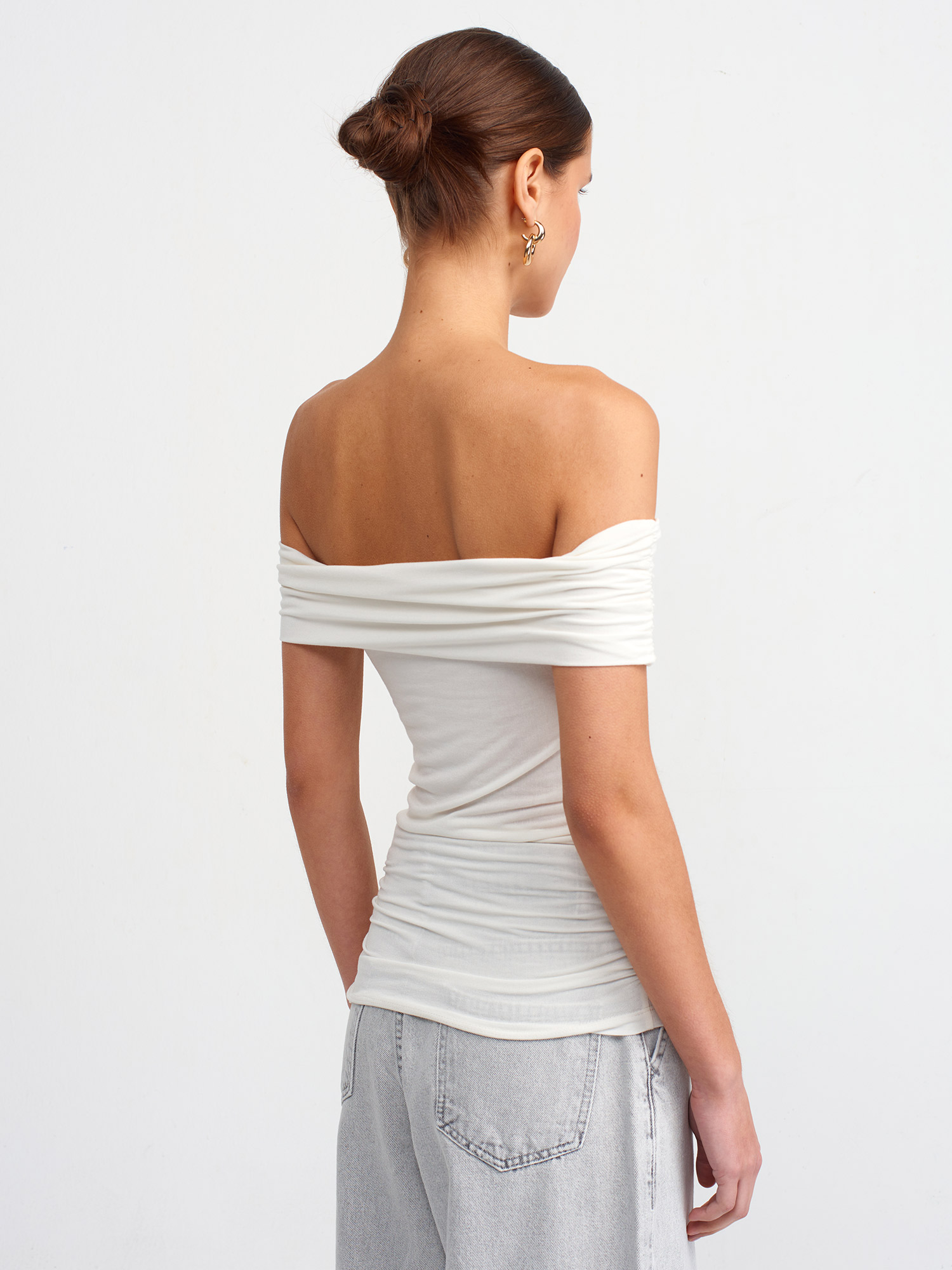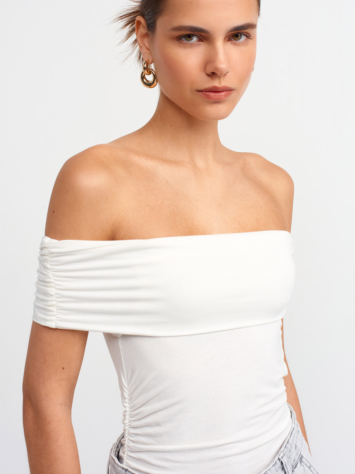 30902 Omuzları Açık Büzgülü Top-Ekru