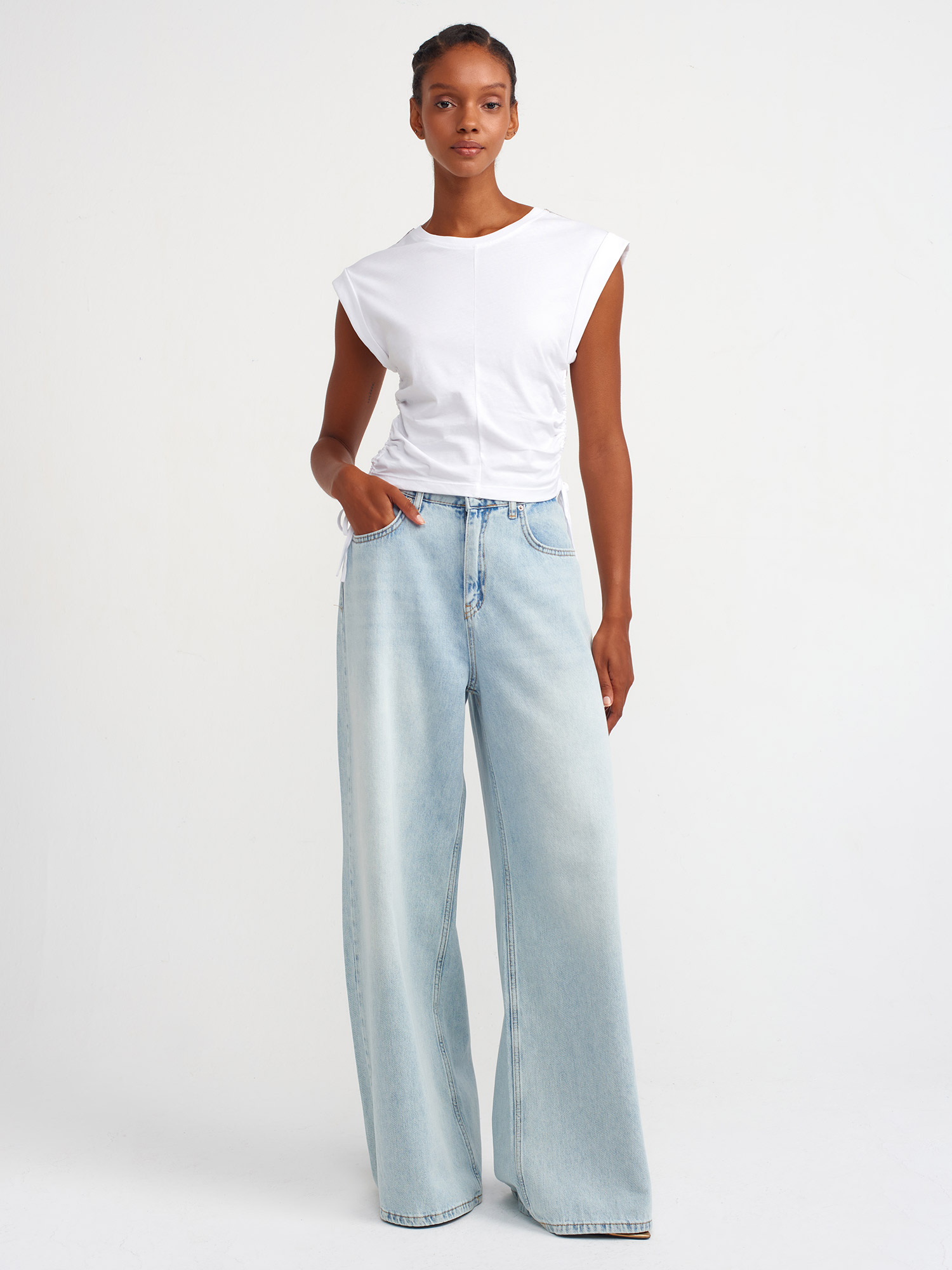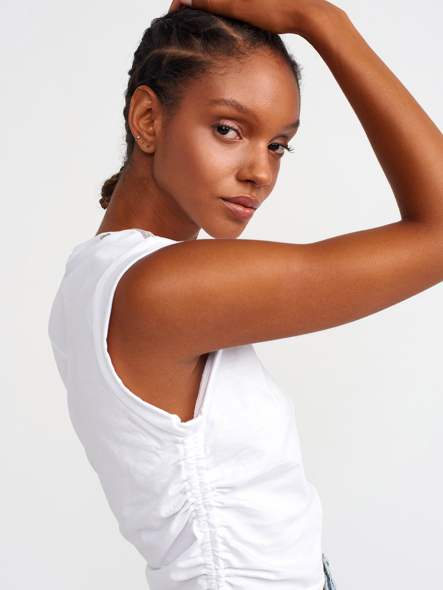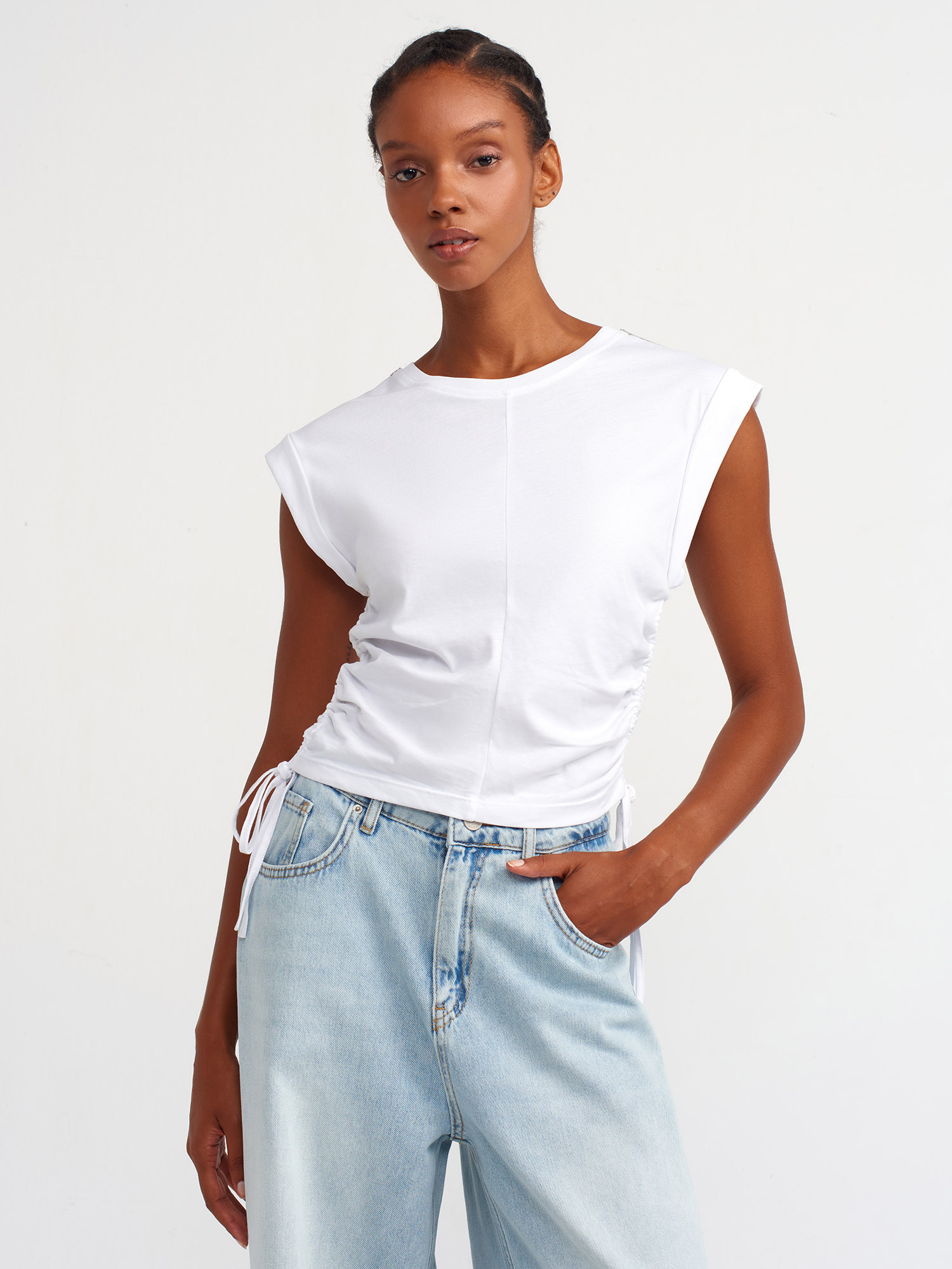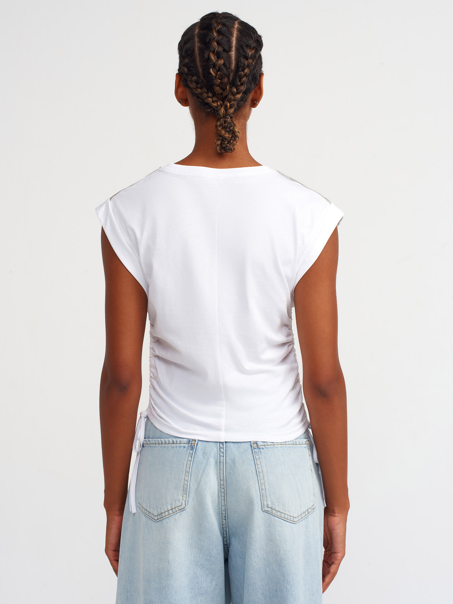 31075 Yanları Büzgü Detaylı Taşlı T-shirt-Beyaz