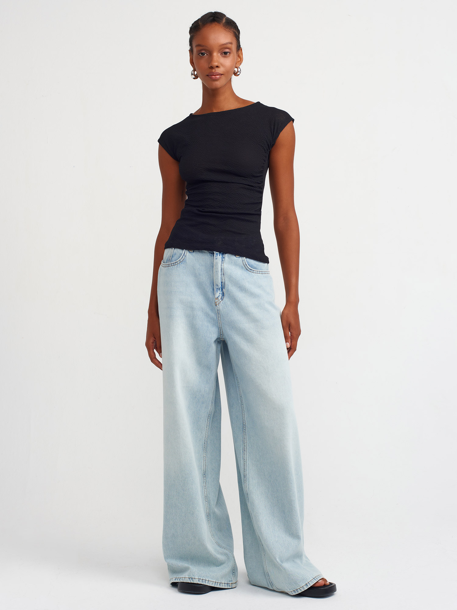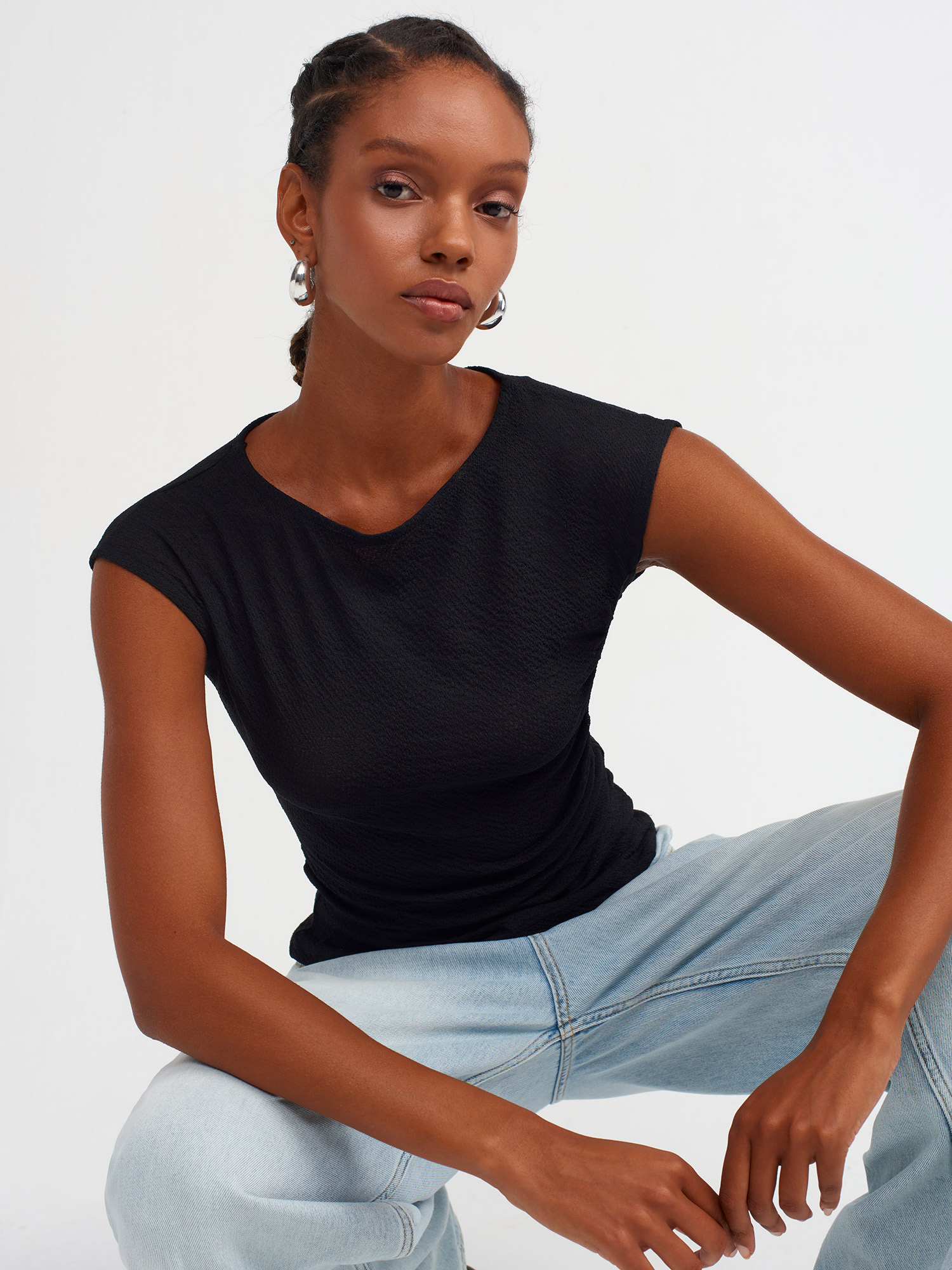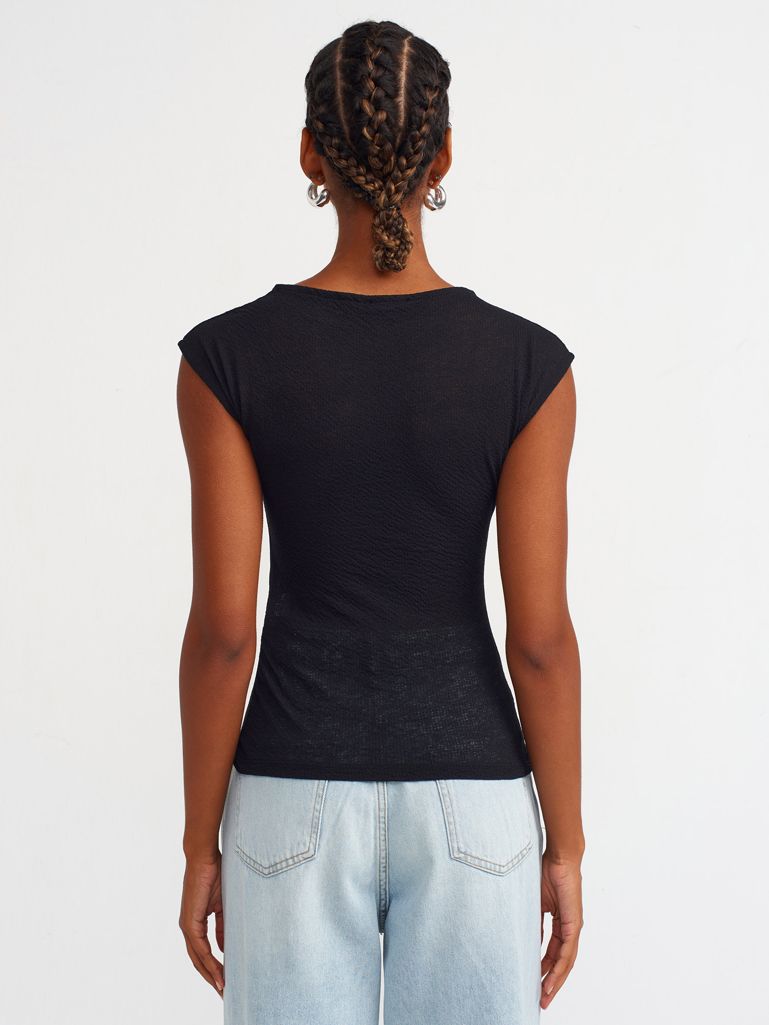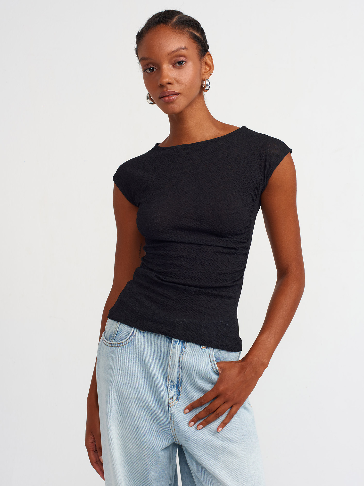 31091 Büzgülü Kayık Yaka Top-Siyah