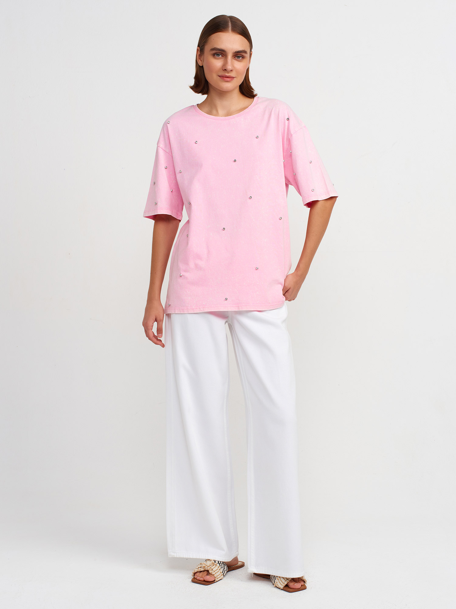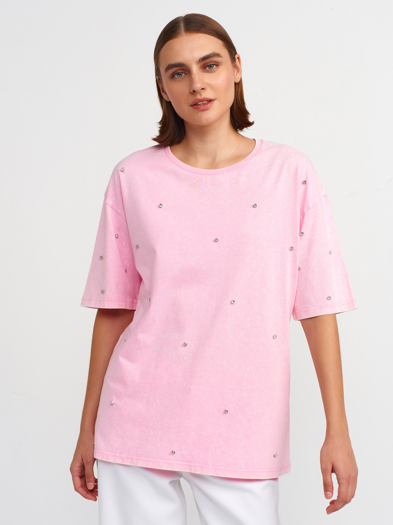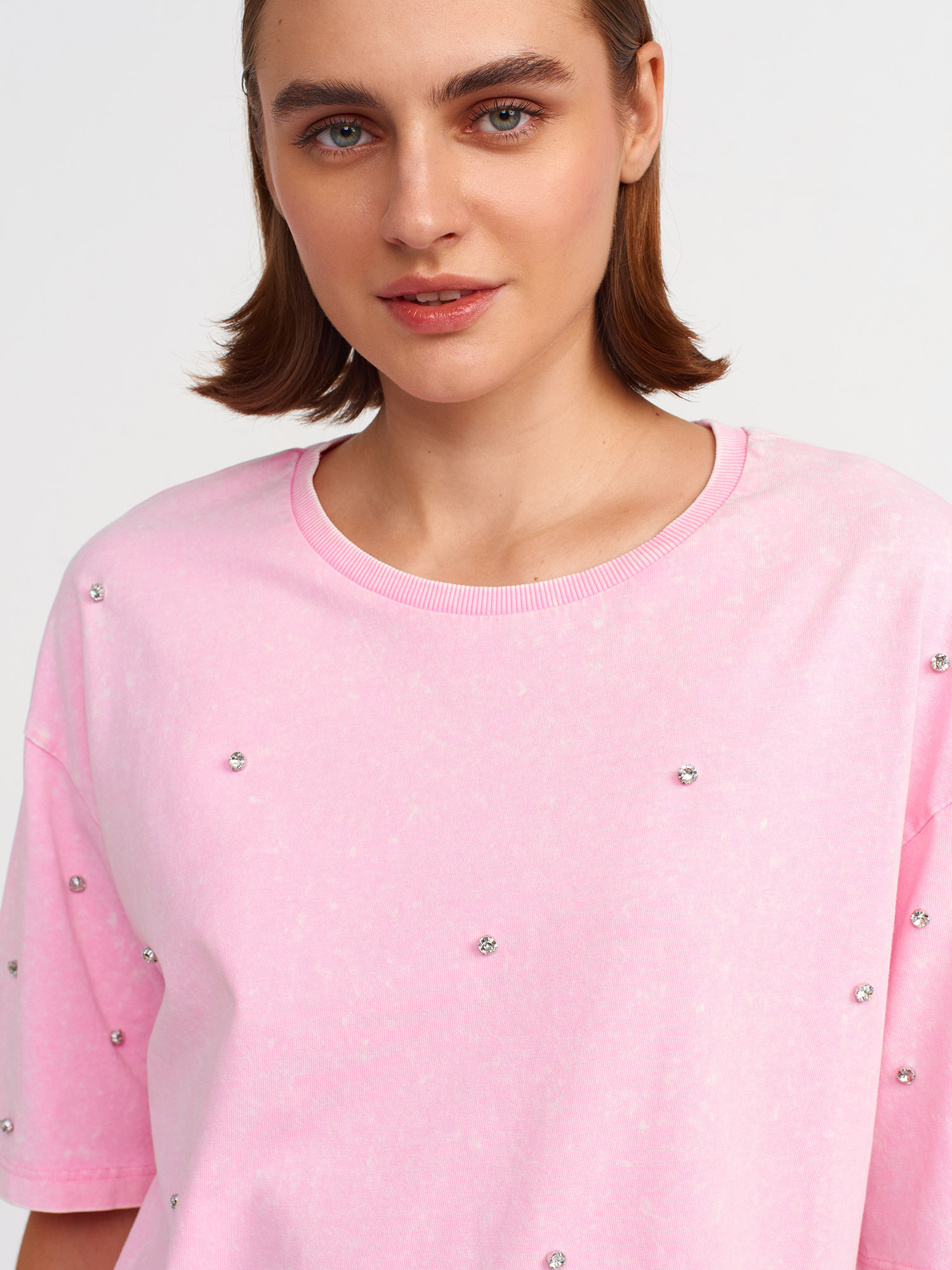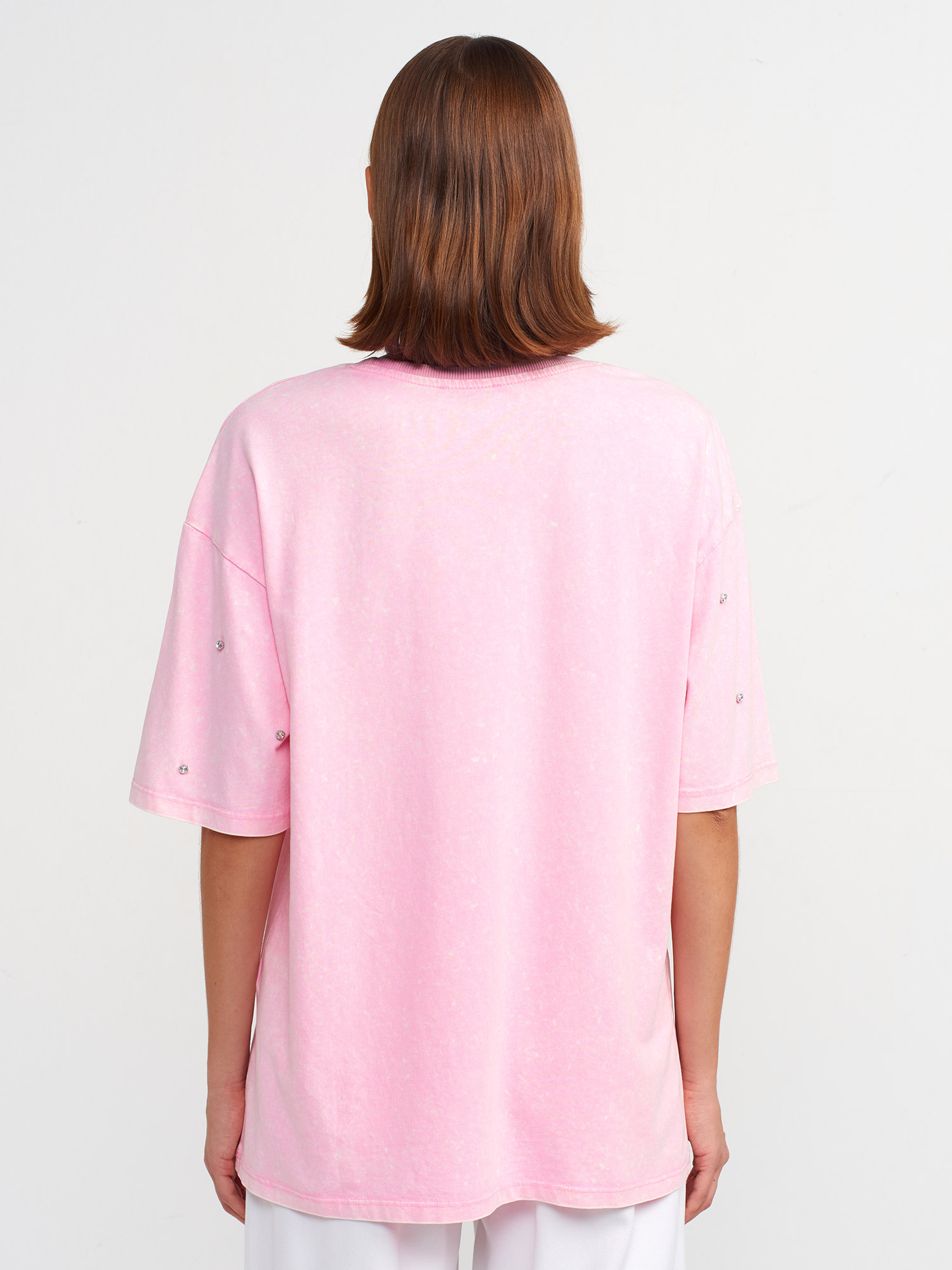 31150 Yıkama Efektli Taşlı T-shirt-Açık Pembe