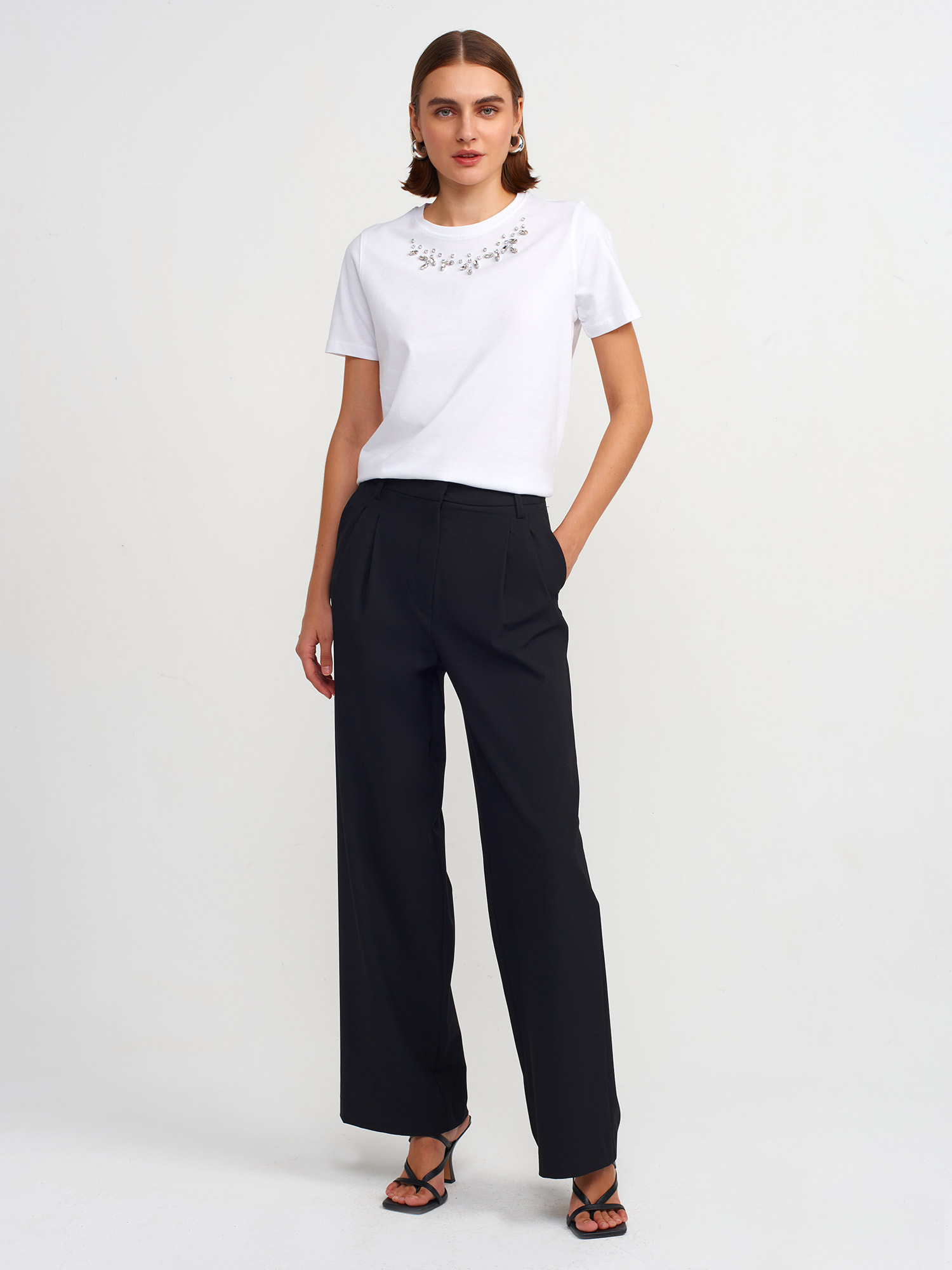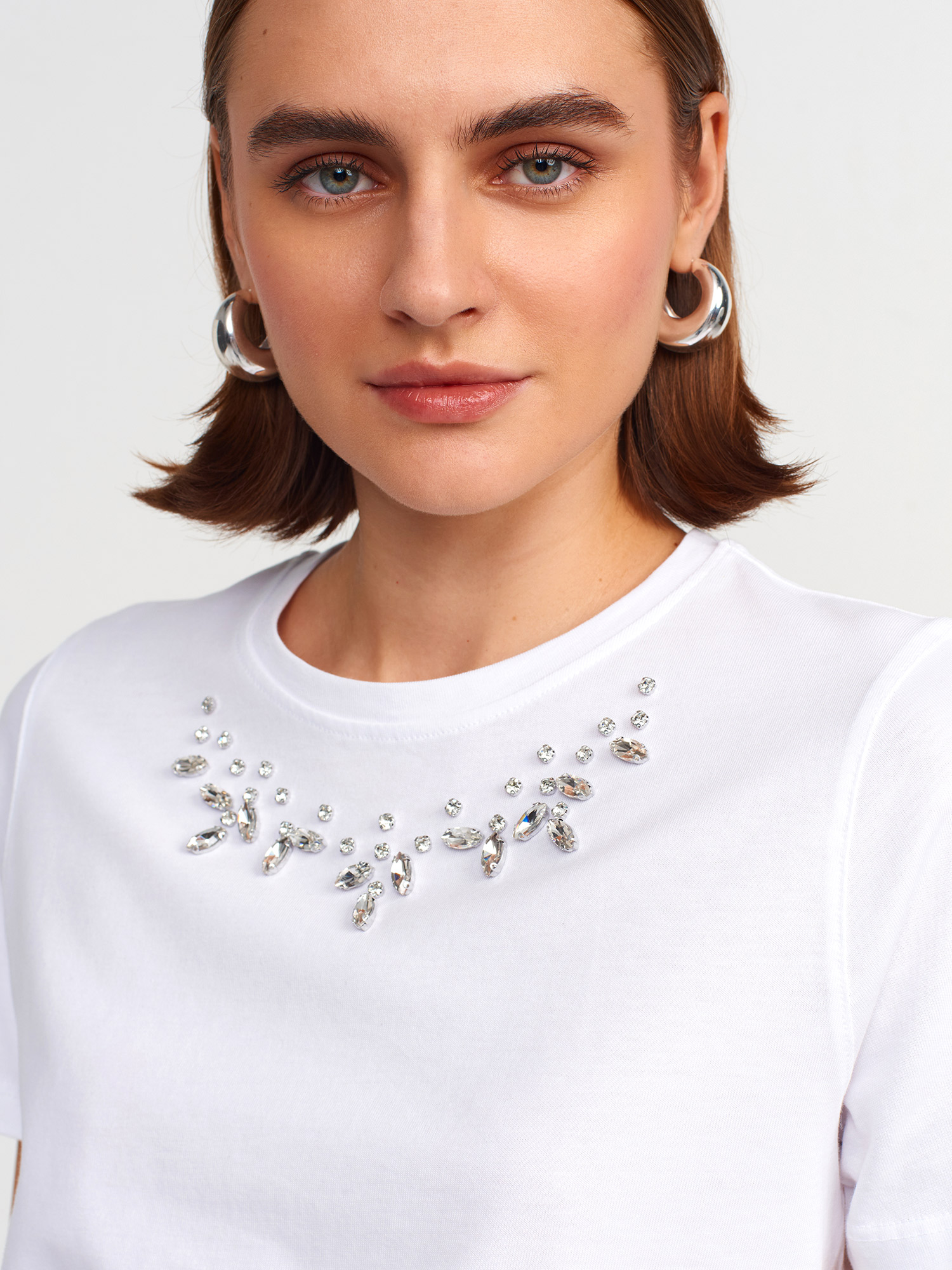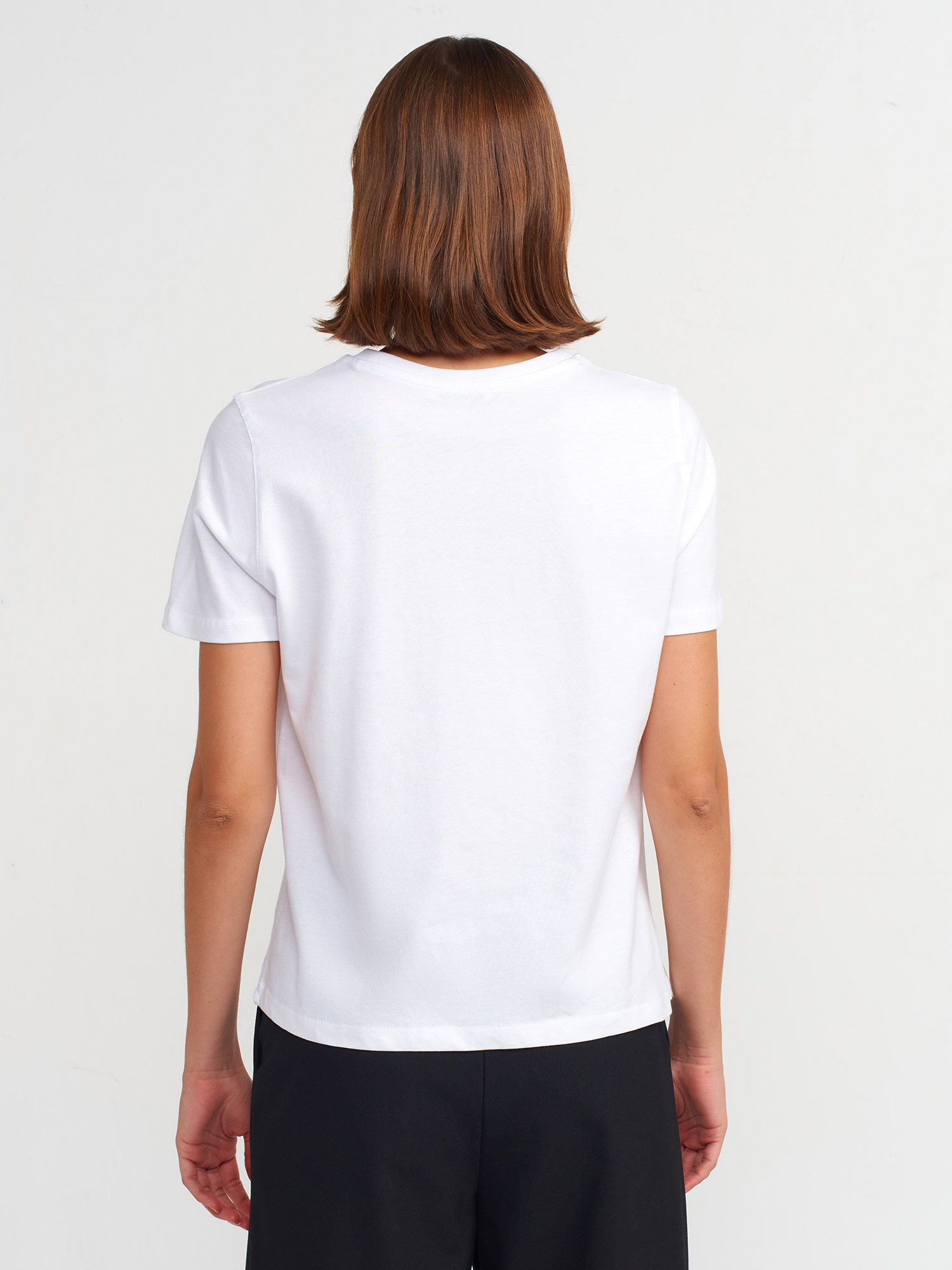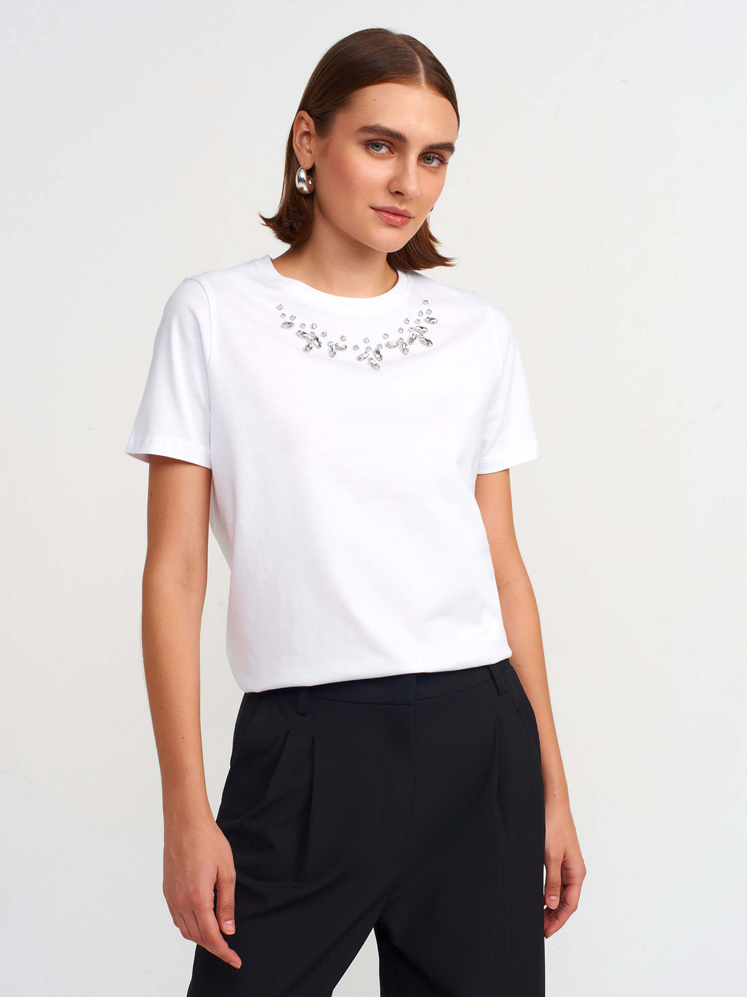 31168 Yakası Taş İşlemeli T-shirt-Beyaz