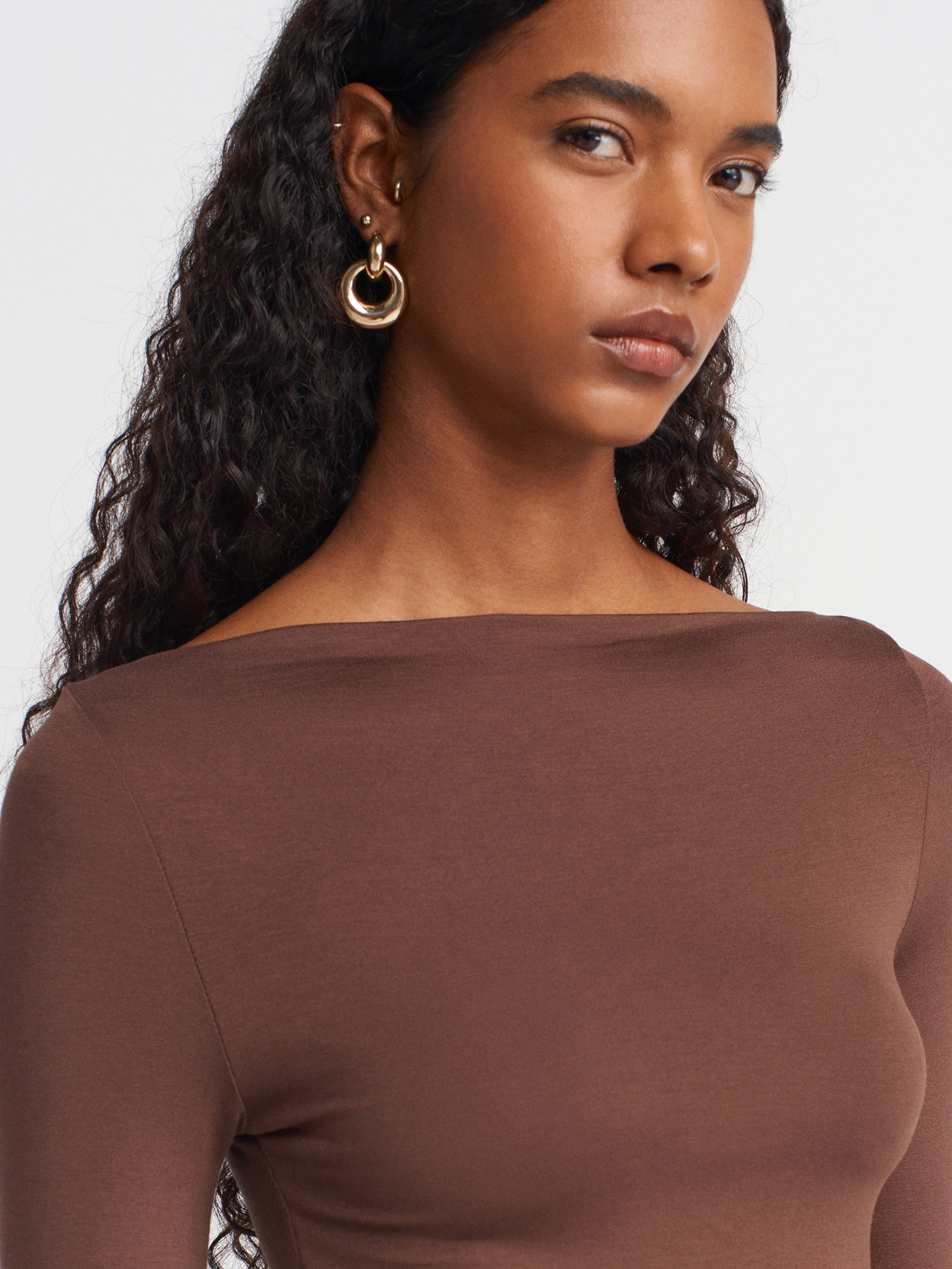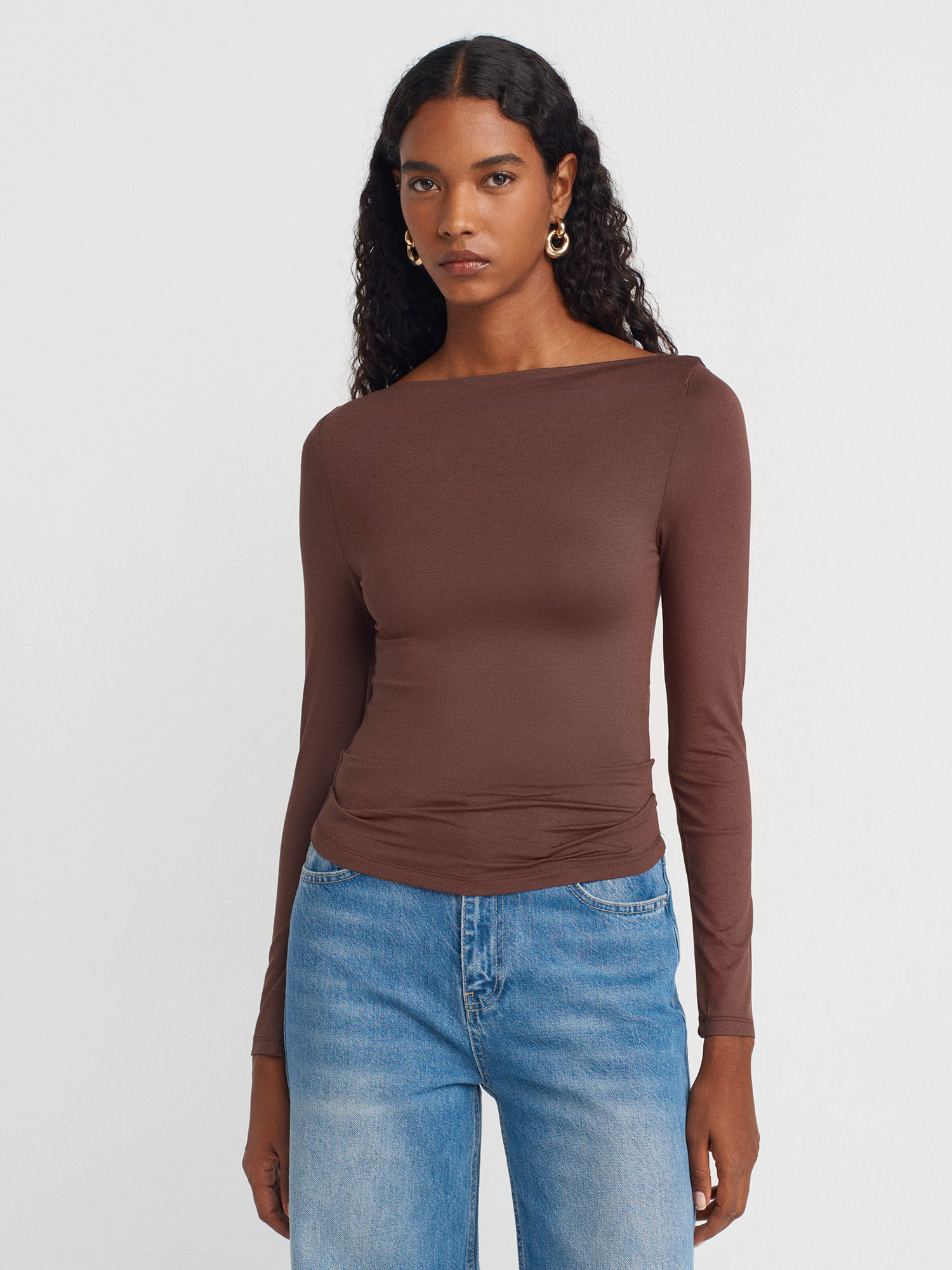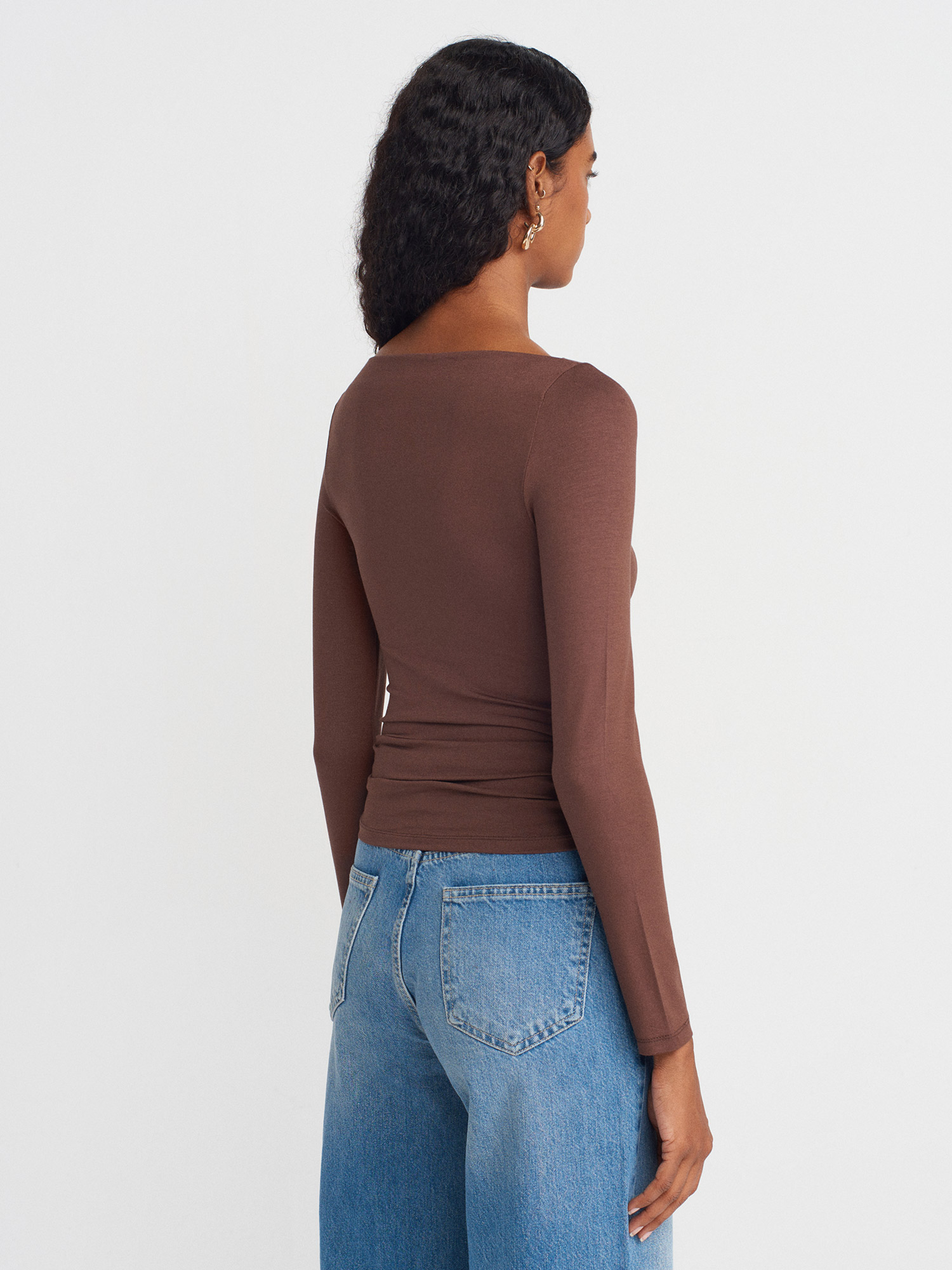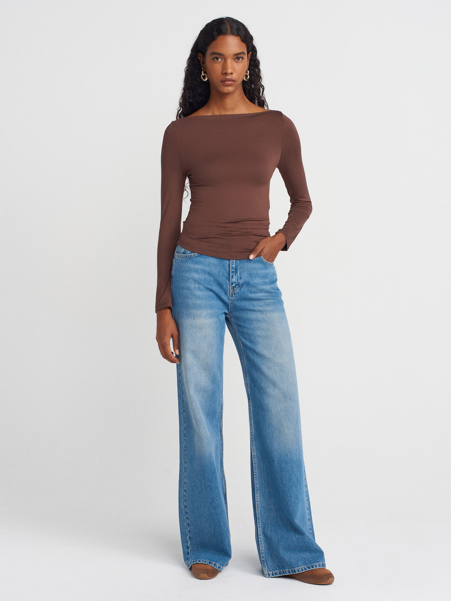 31213 Kayık Yaka Uzun Kollu Top-Açık Kahve
