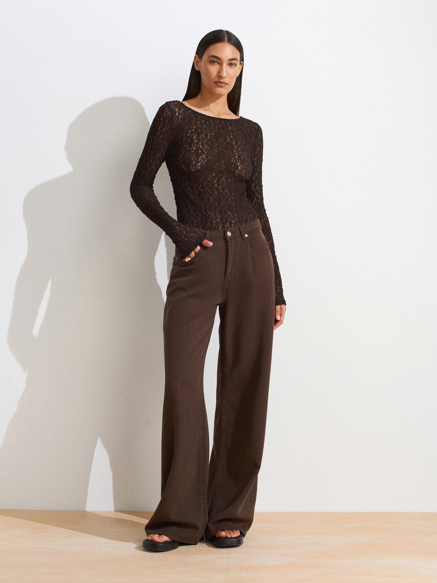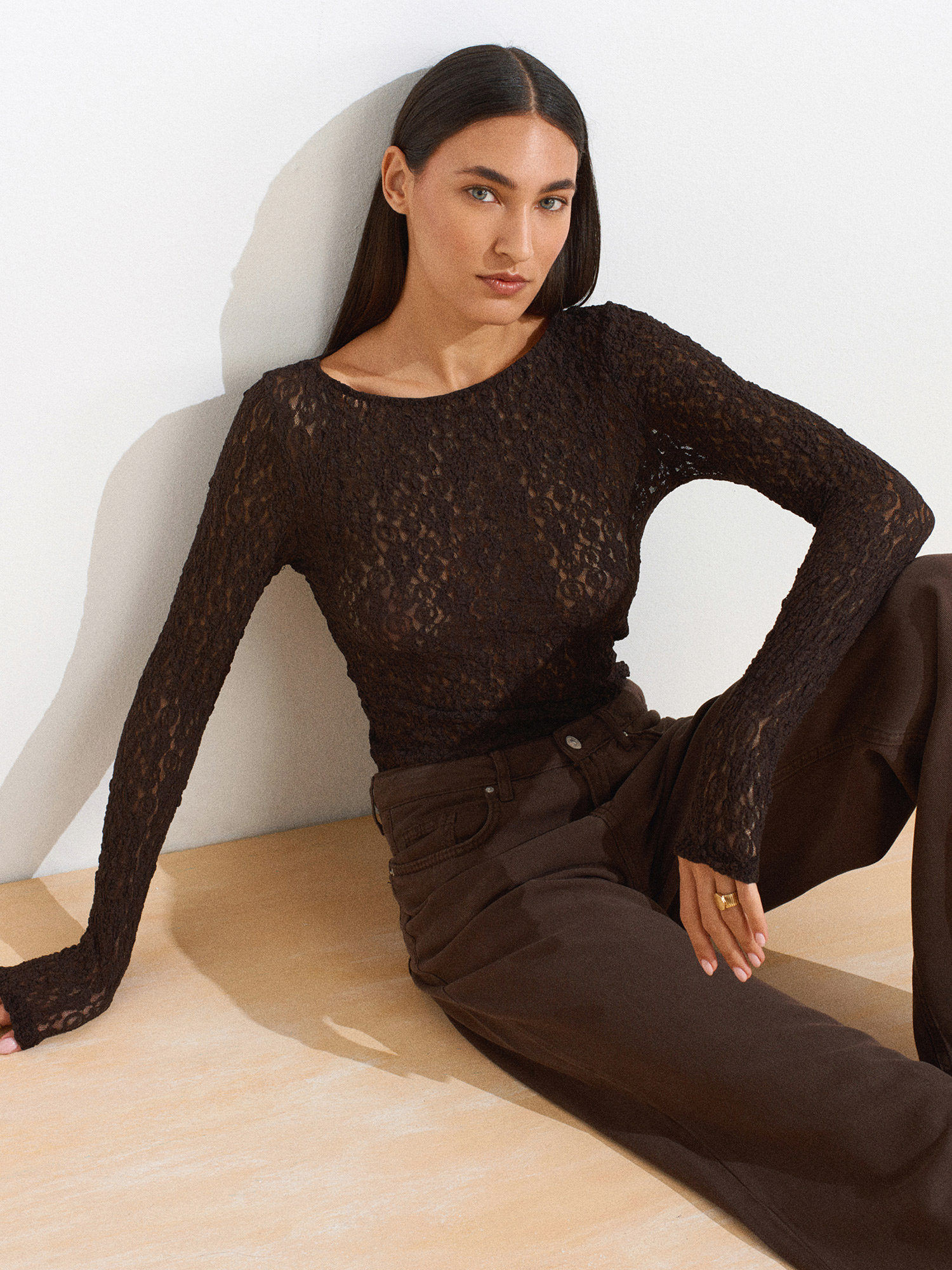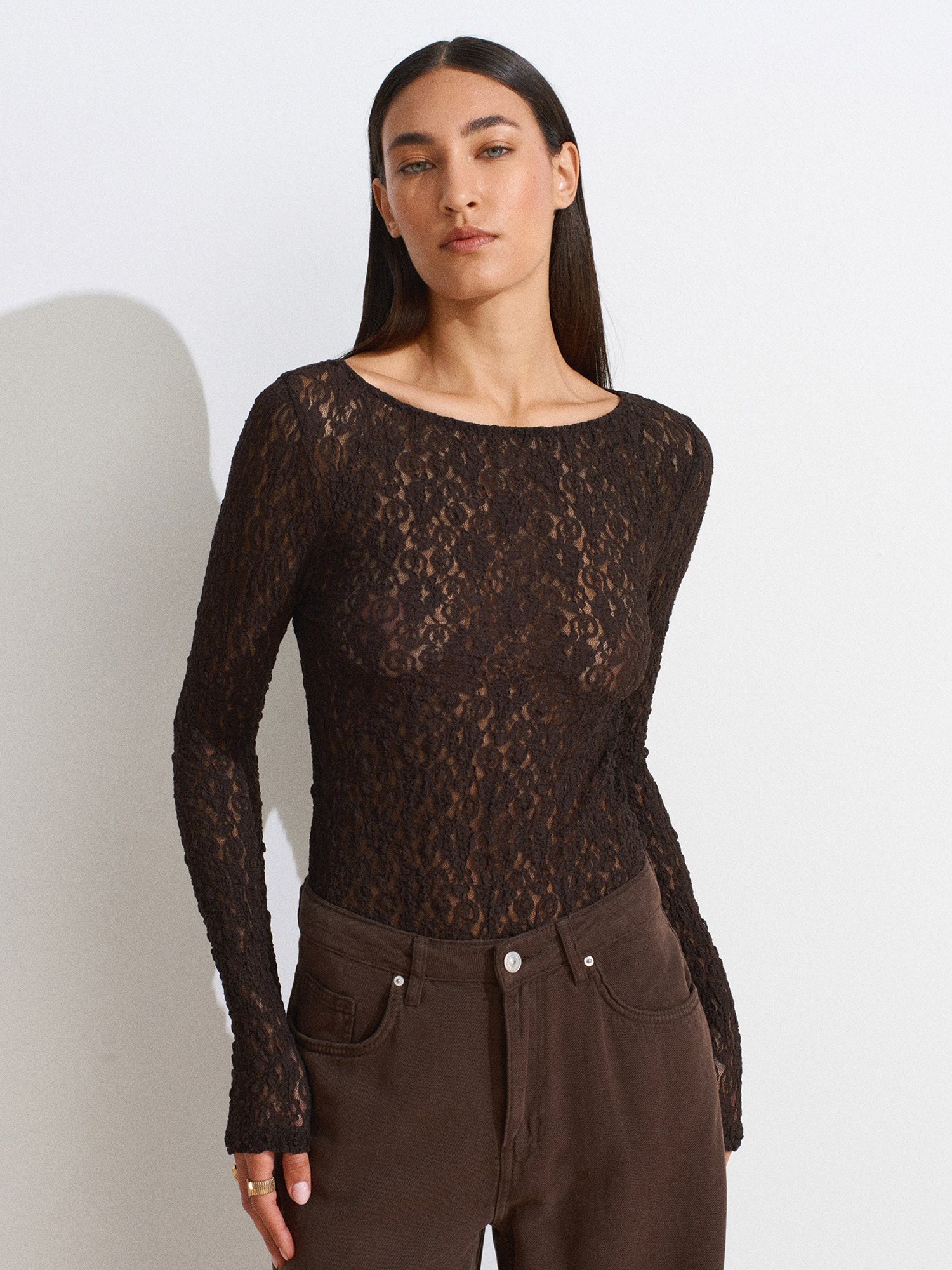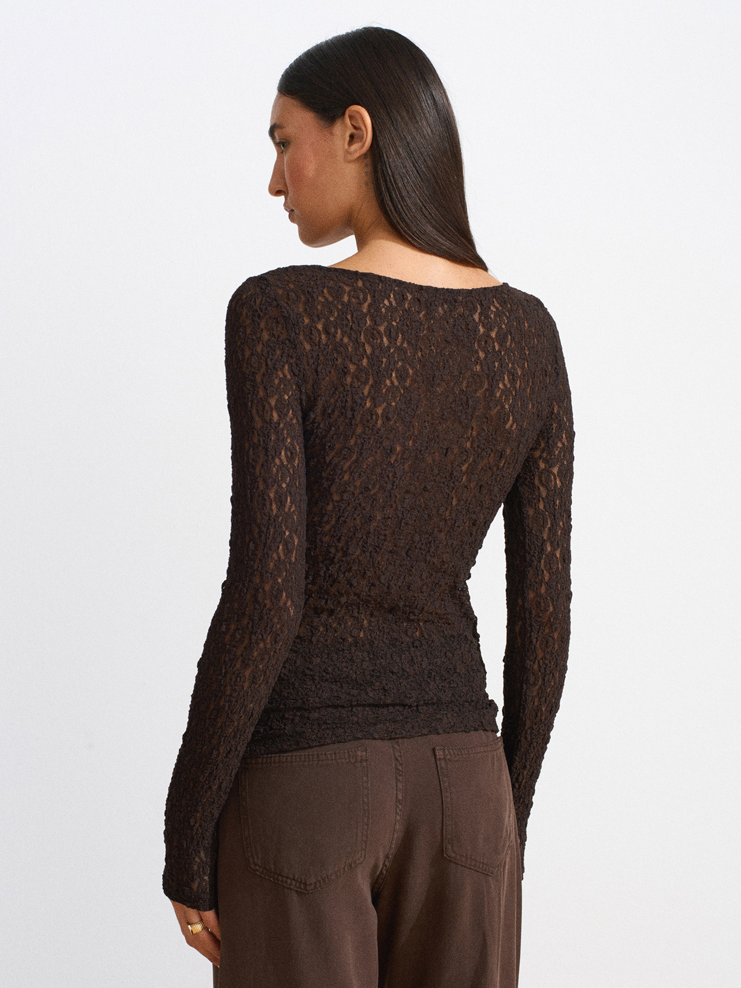 31312 Kayık Yaka Dantel Top-Koyu Kahve