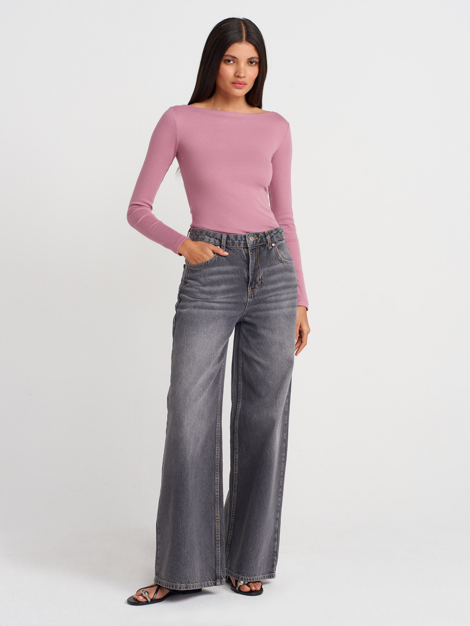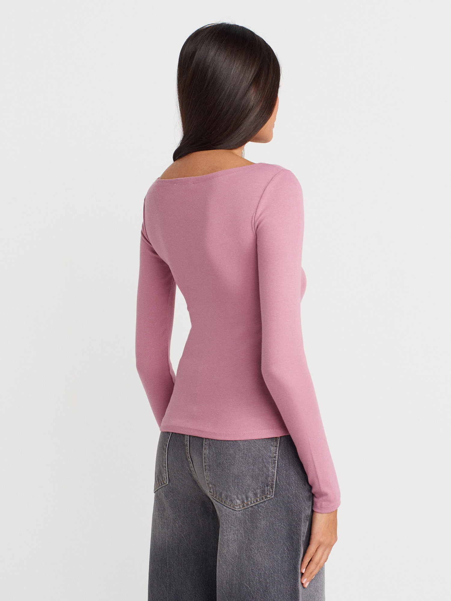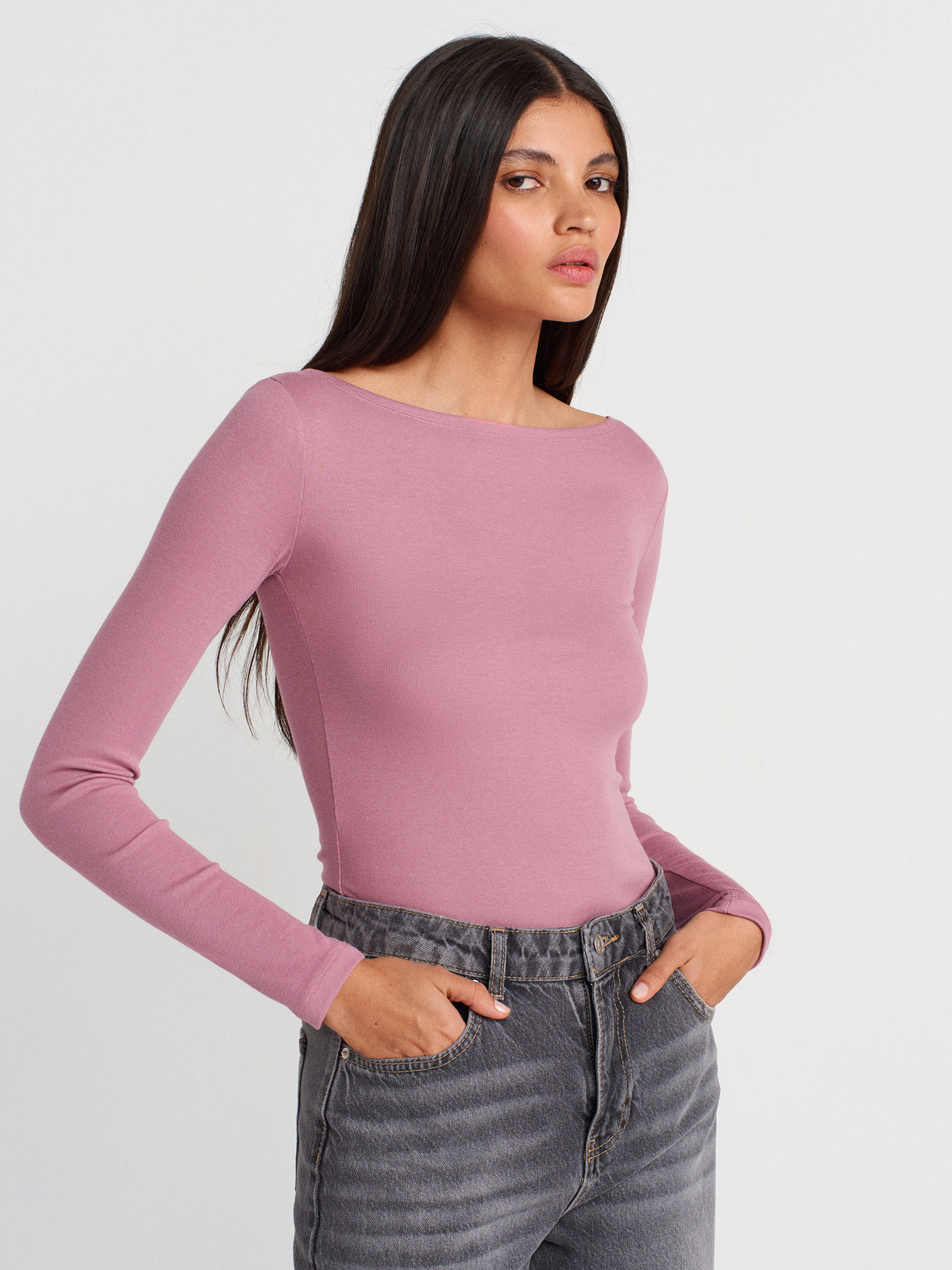 31332 Kayık Yaka Uzun Kollu Top-Gül