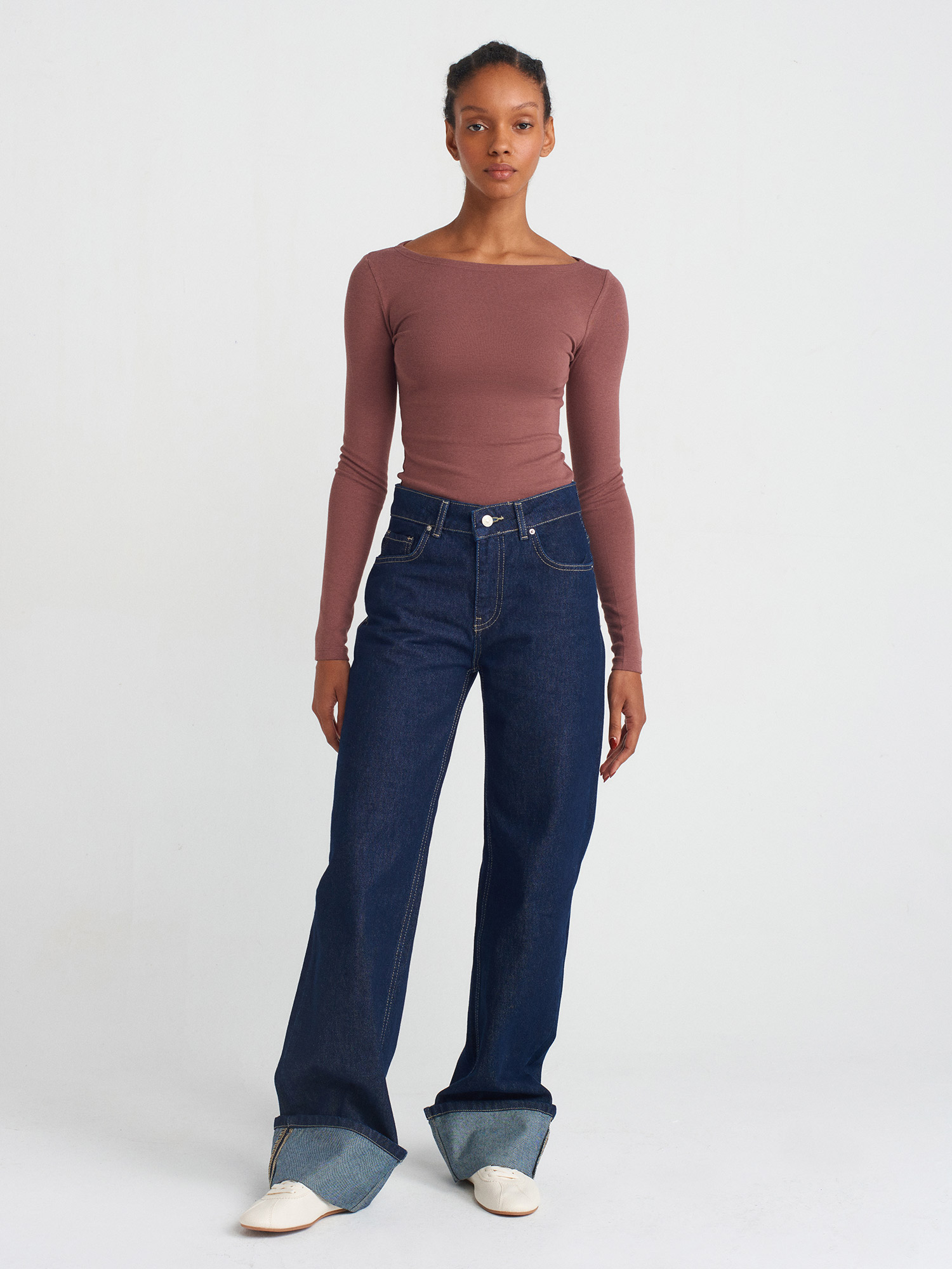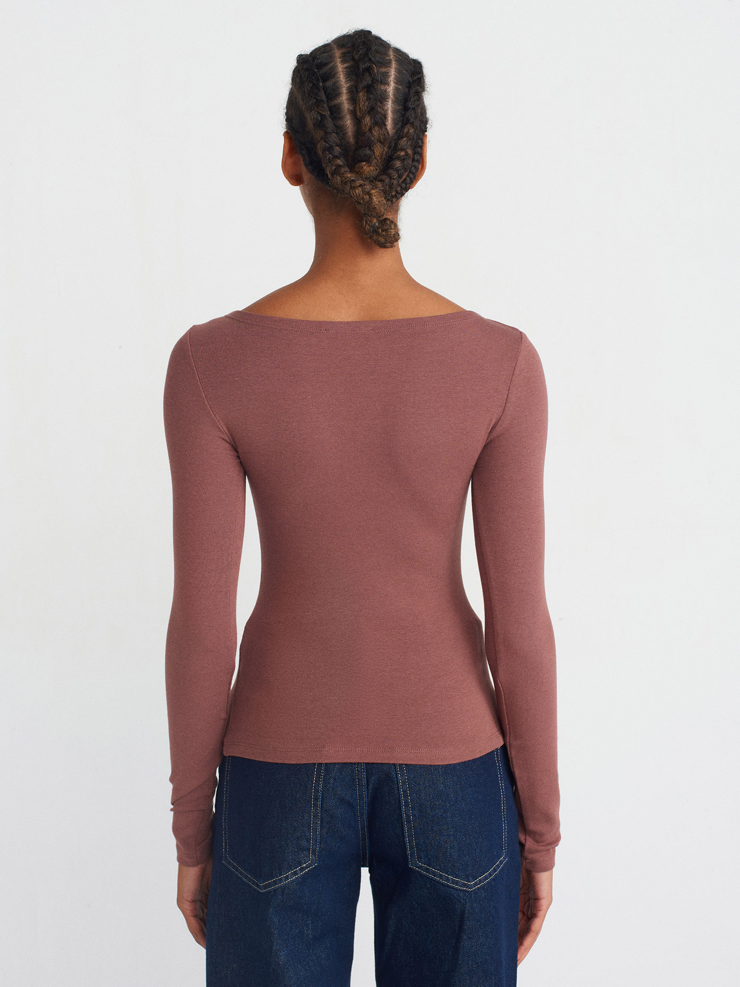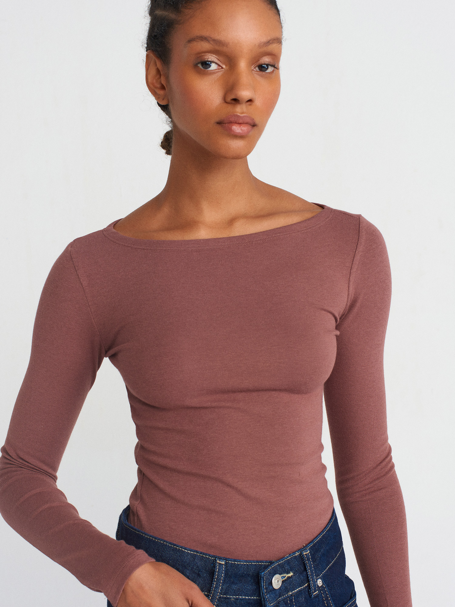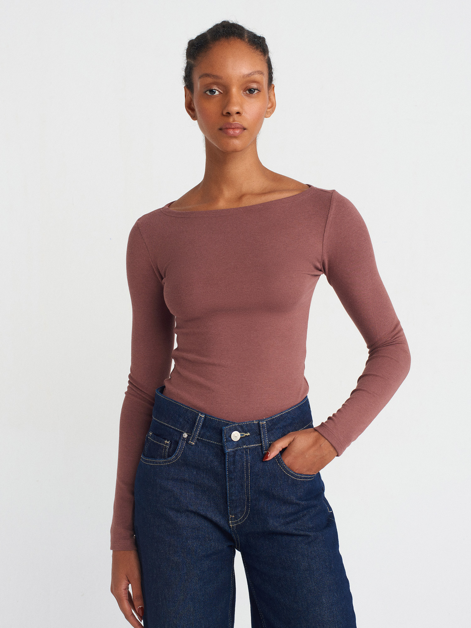 31332 Kayık Yaka Uzun Kollu Top-Kahve