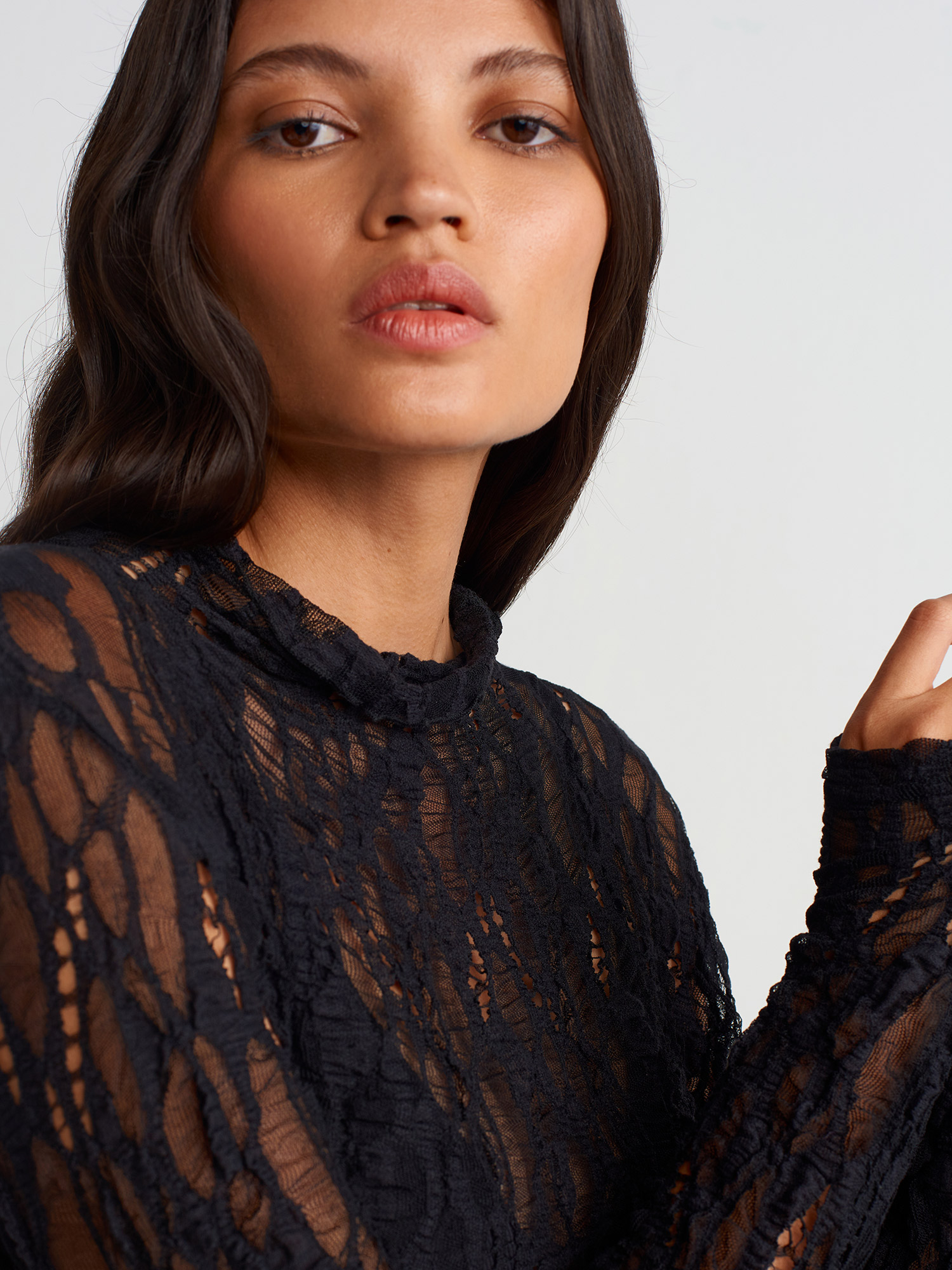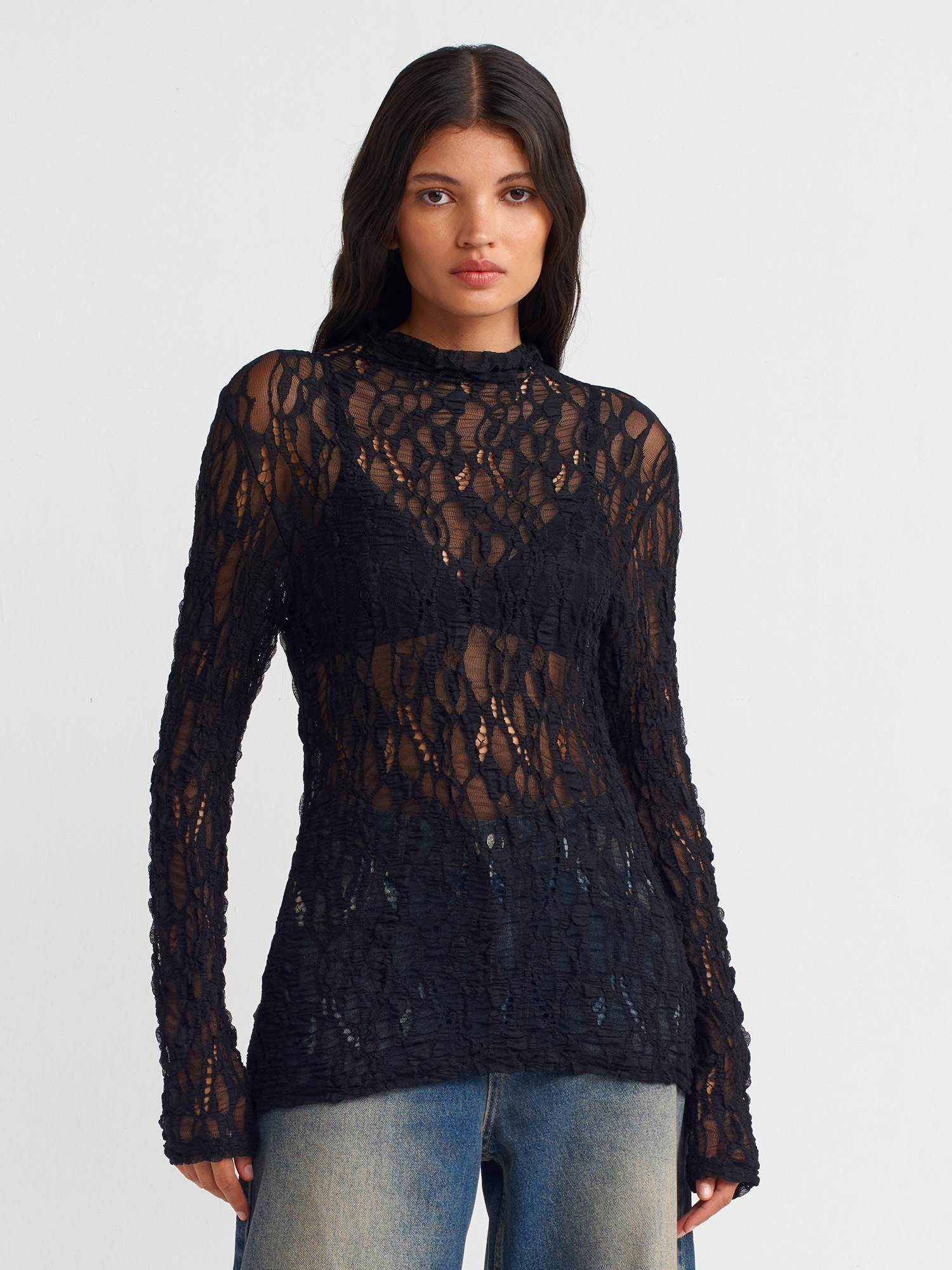 31336 Parmak Detaylı Dantel Top-Siyah