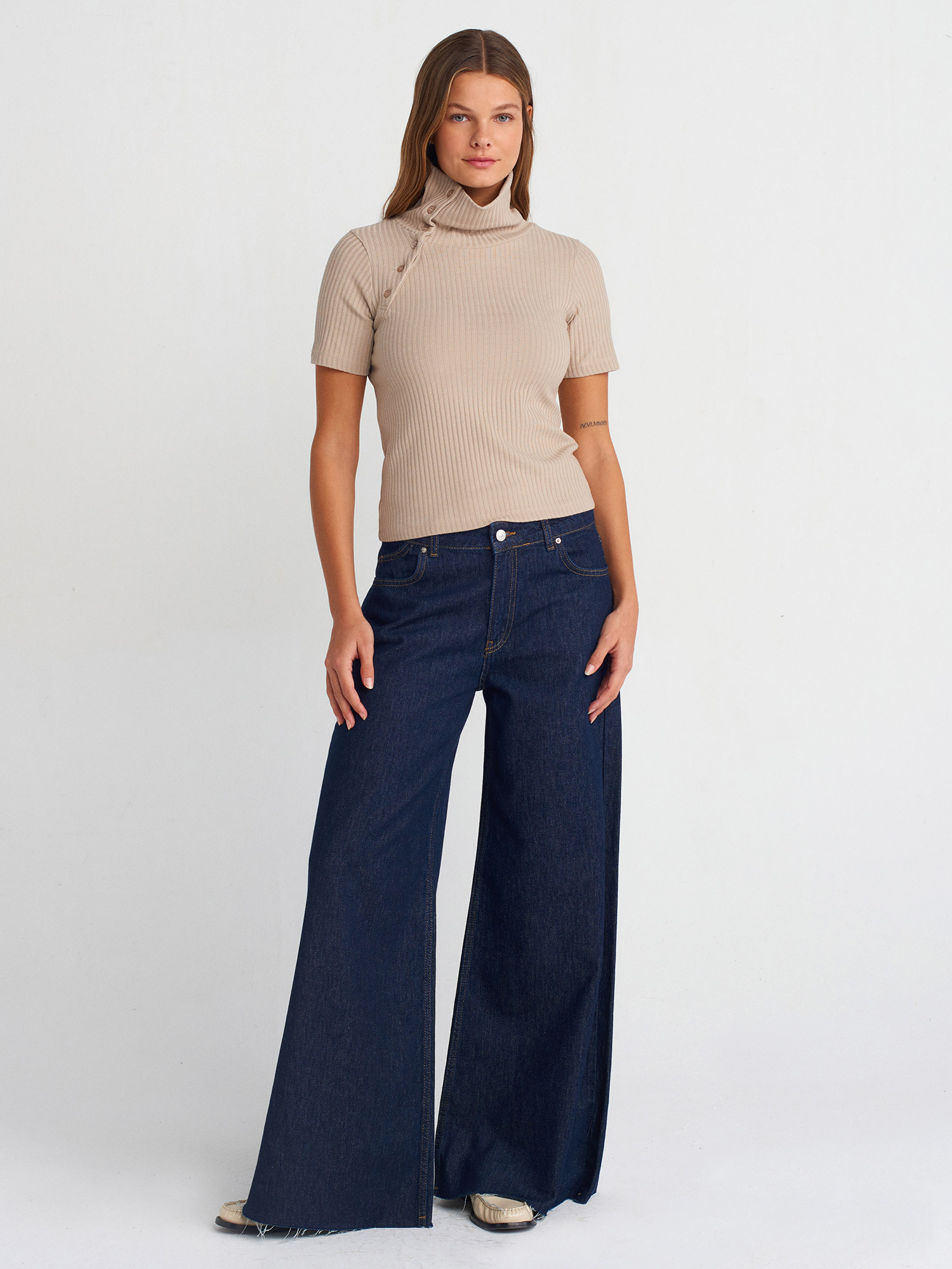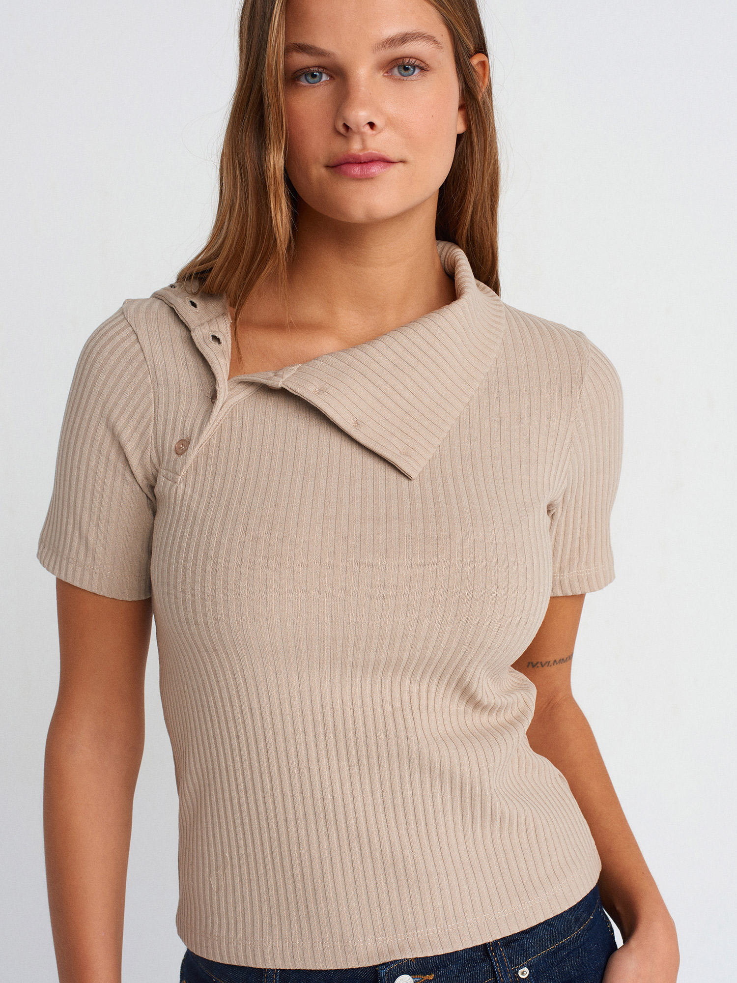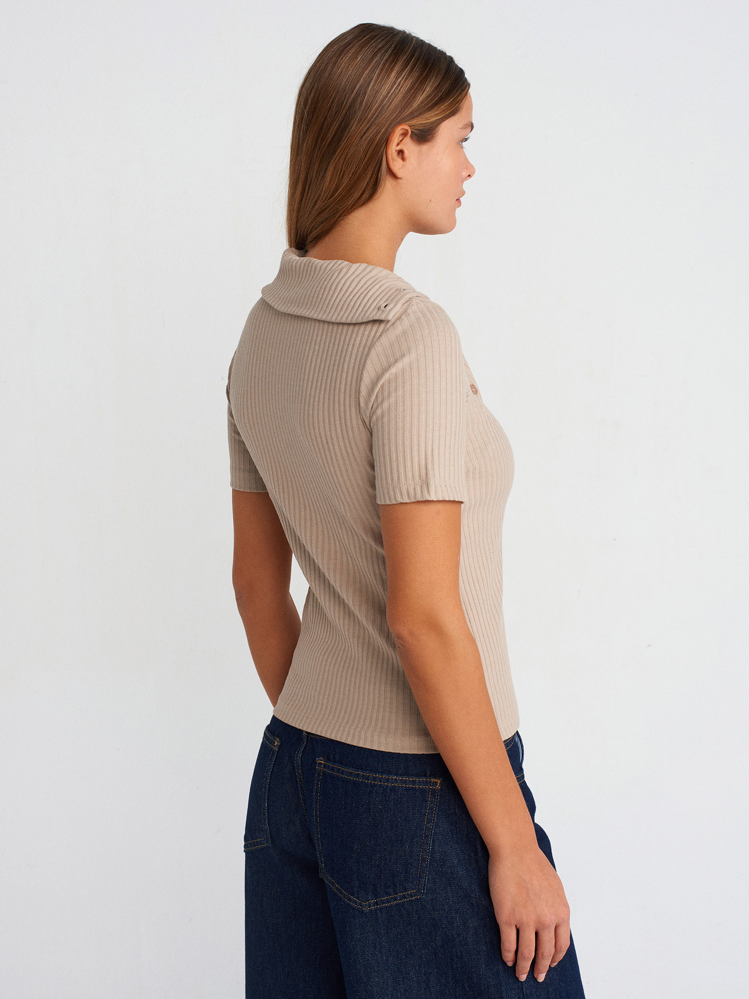 31389 Düğme Detaylı Kısa Kollu Top-Açık Taş