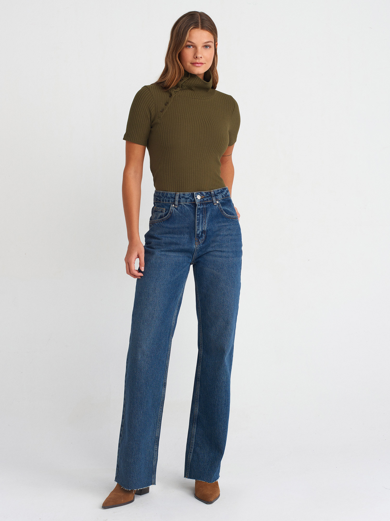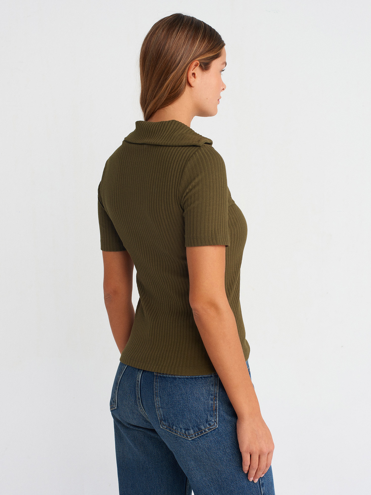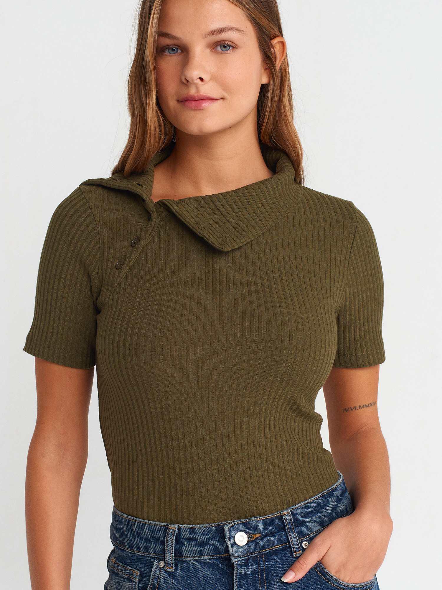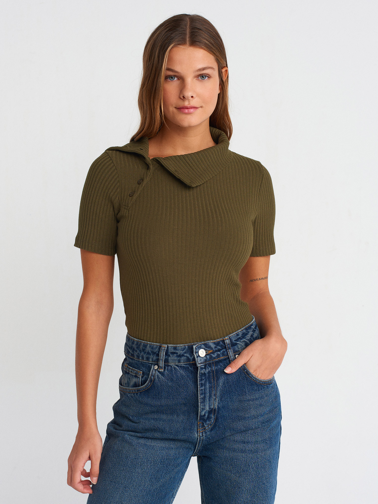 31389 Düğme Detaylı Kısa Kollu Top-Yağ Yeşil