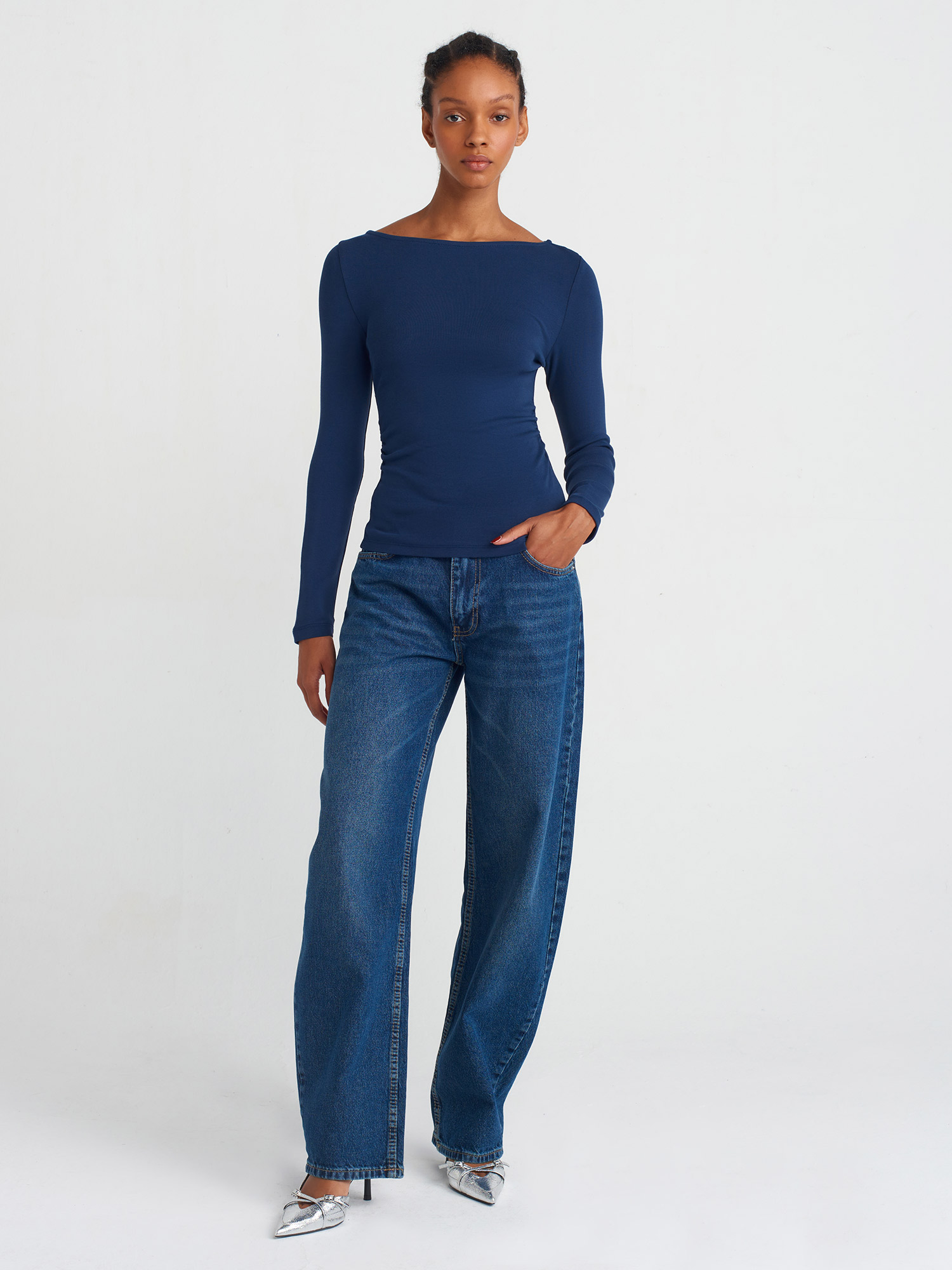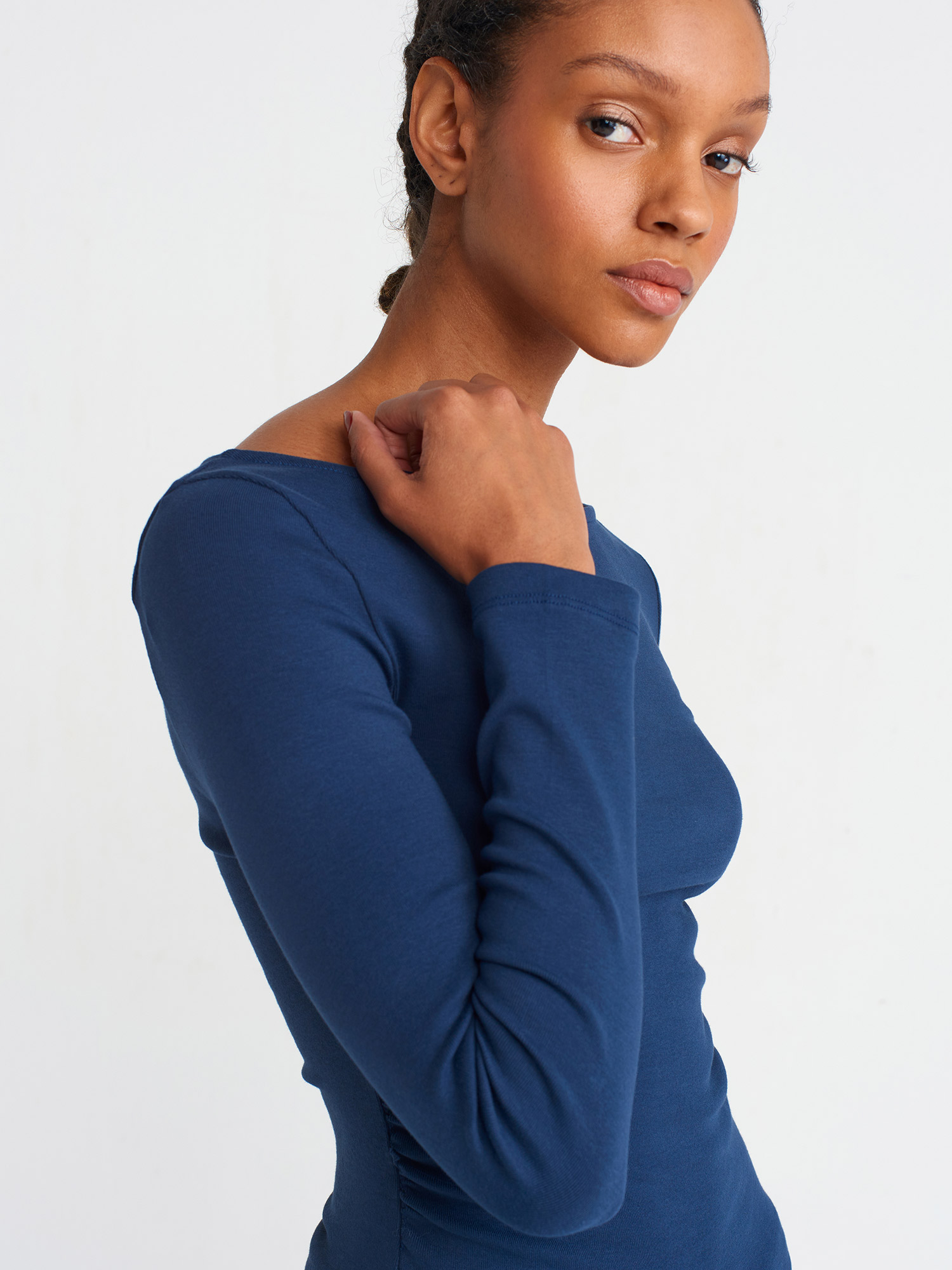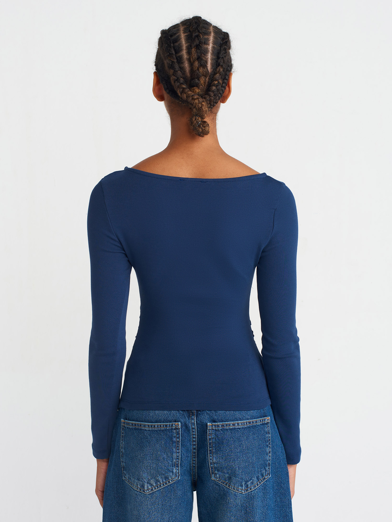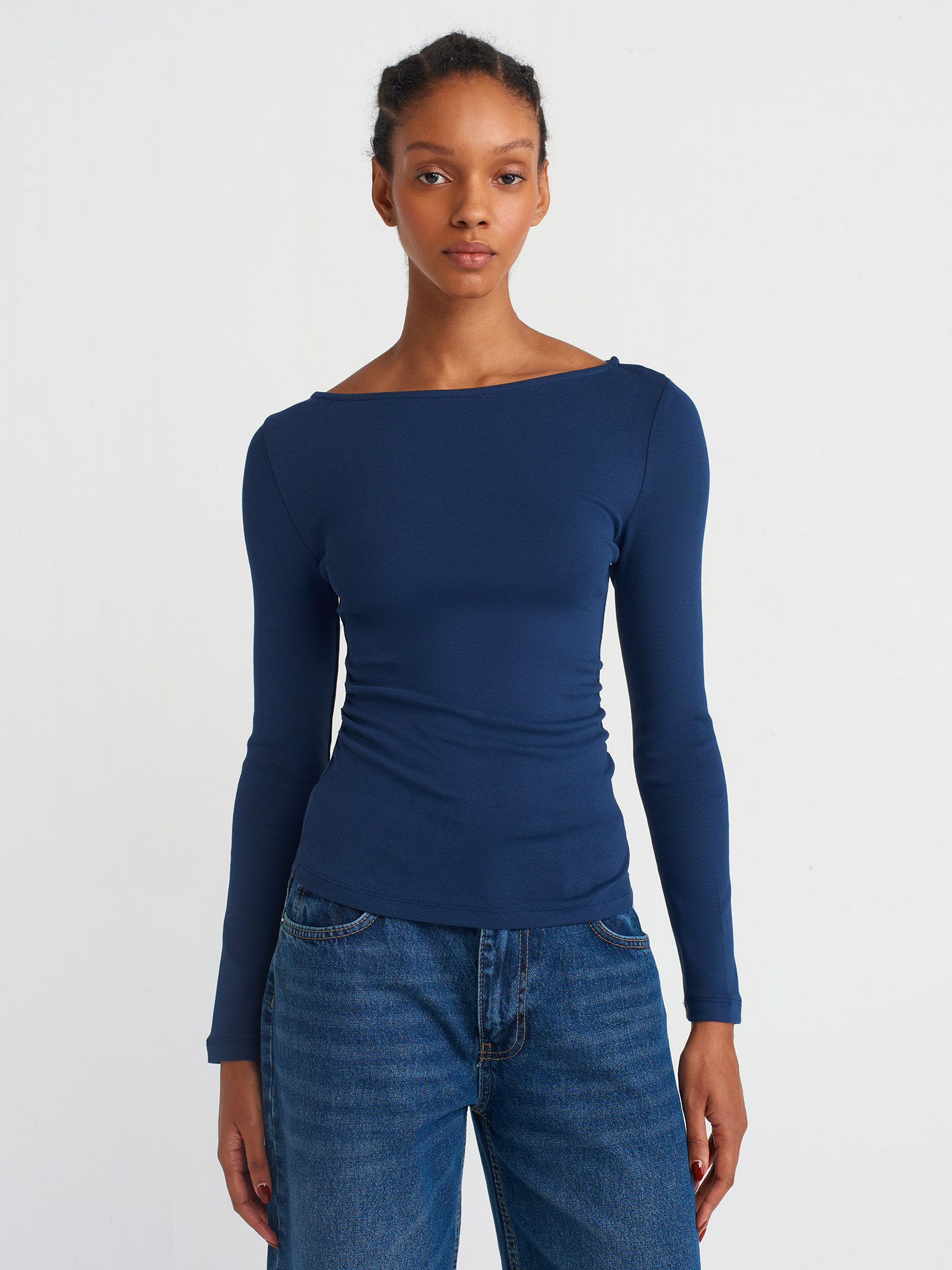 31401 Büzgülü Kayık Yaka Top-Lacivert