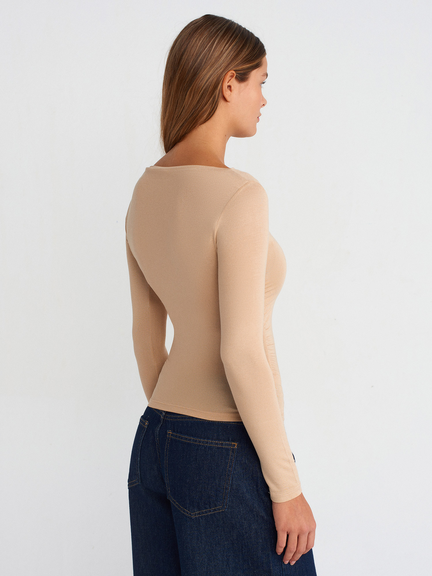 31431 Asimetrik Uzun Kollu Top-Koyu Bej