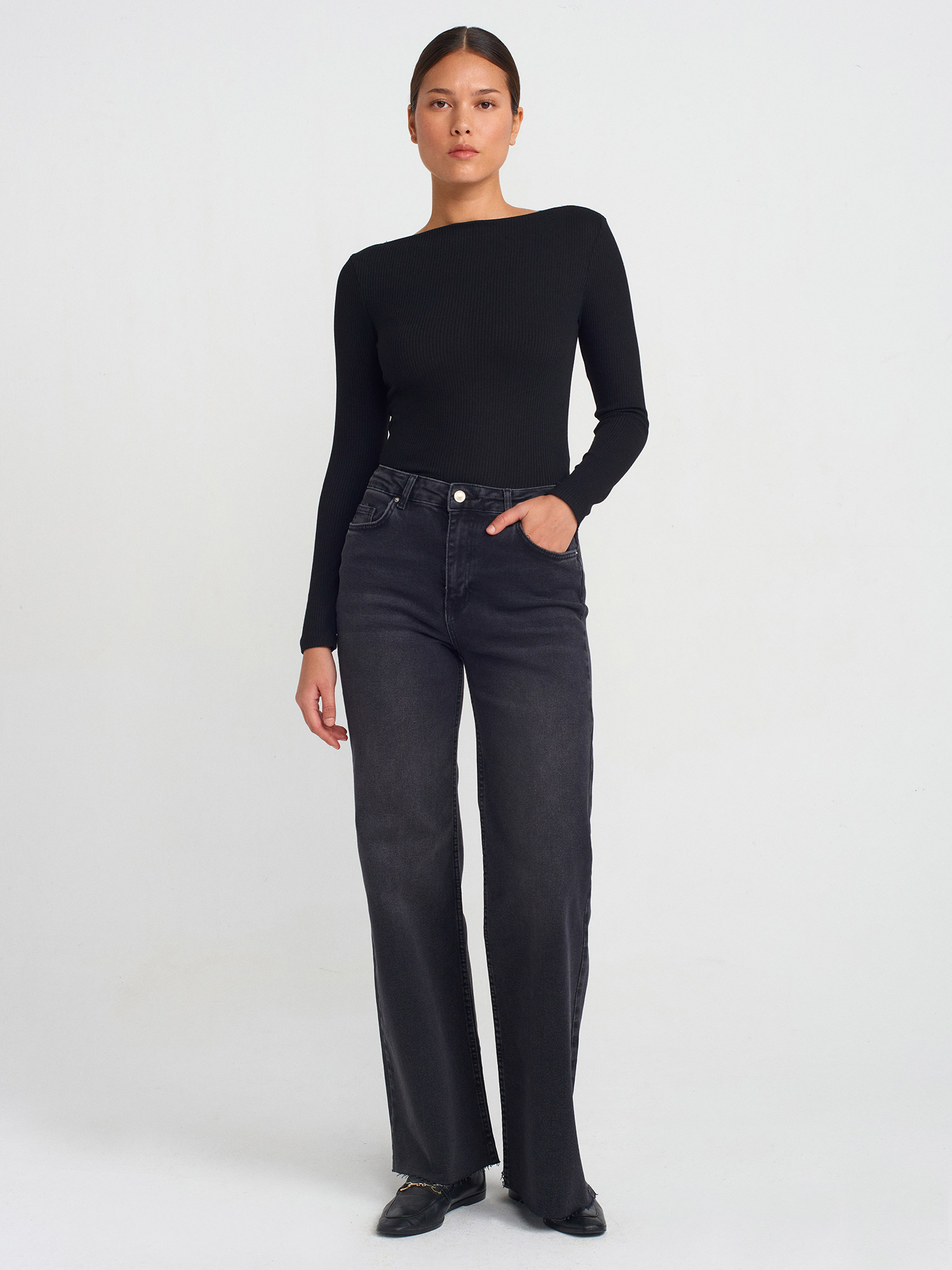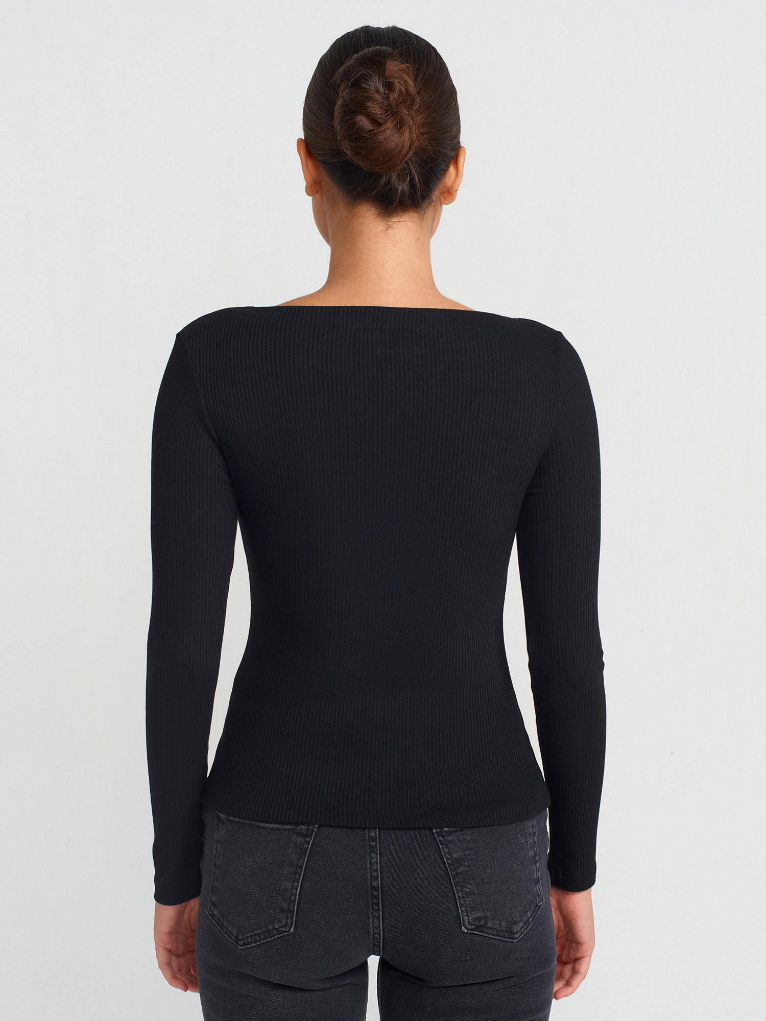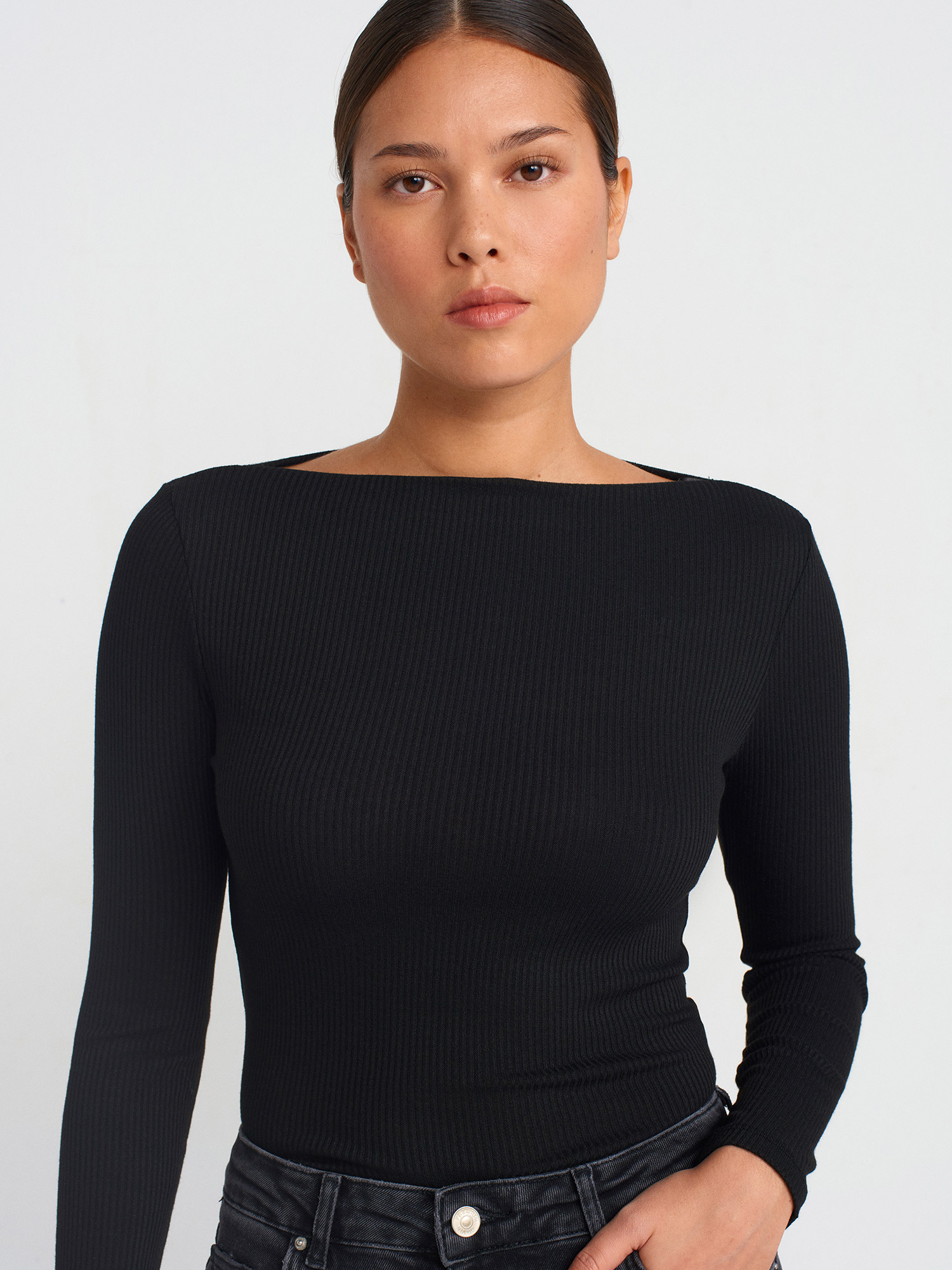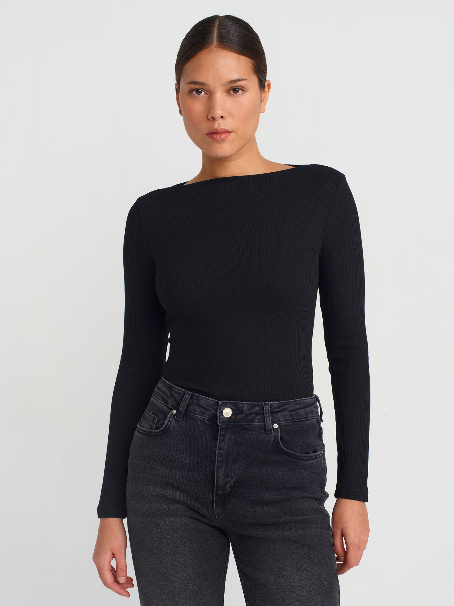 31462 Kayık Yaka Uzun Kollu Top-Siyah