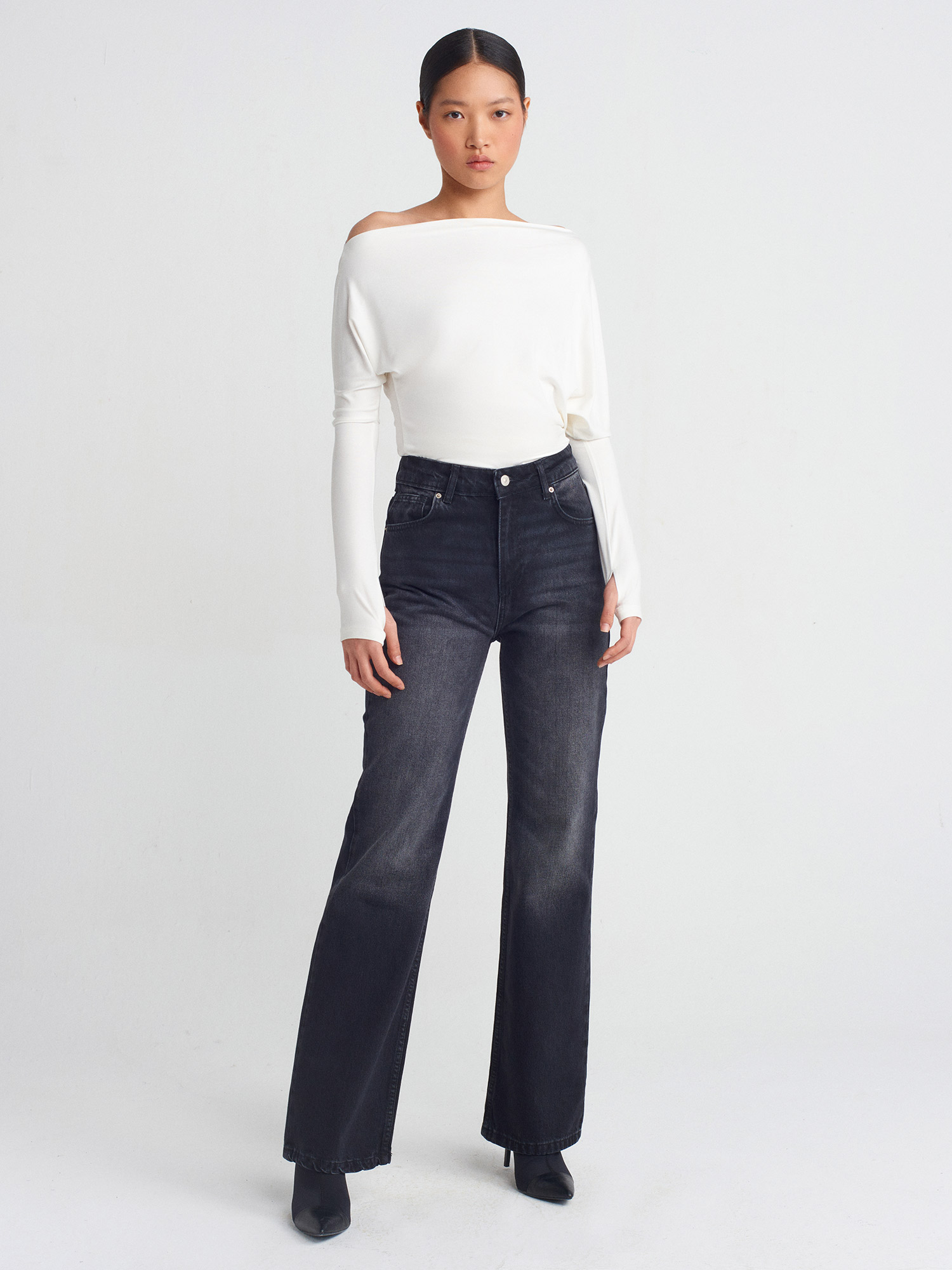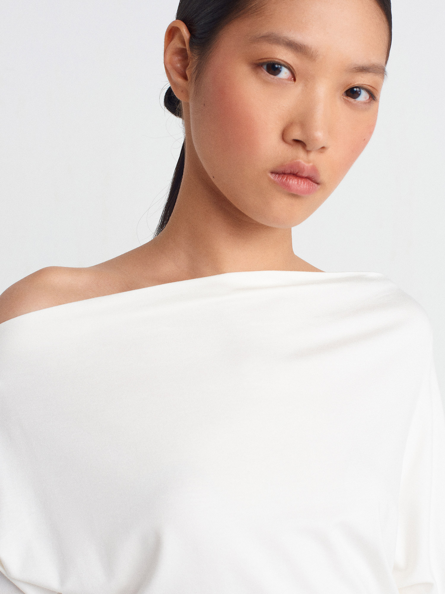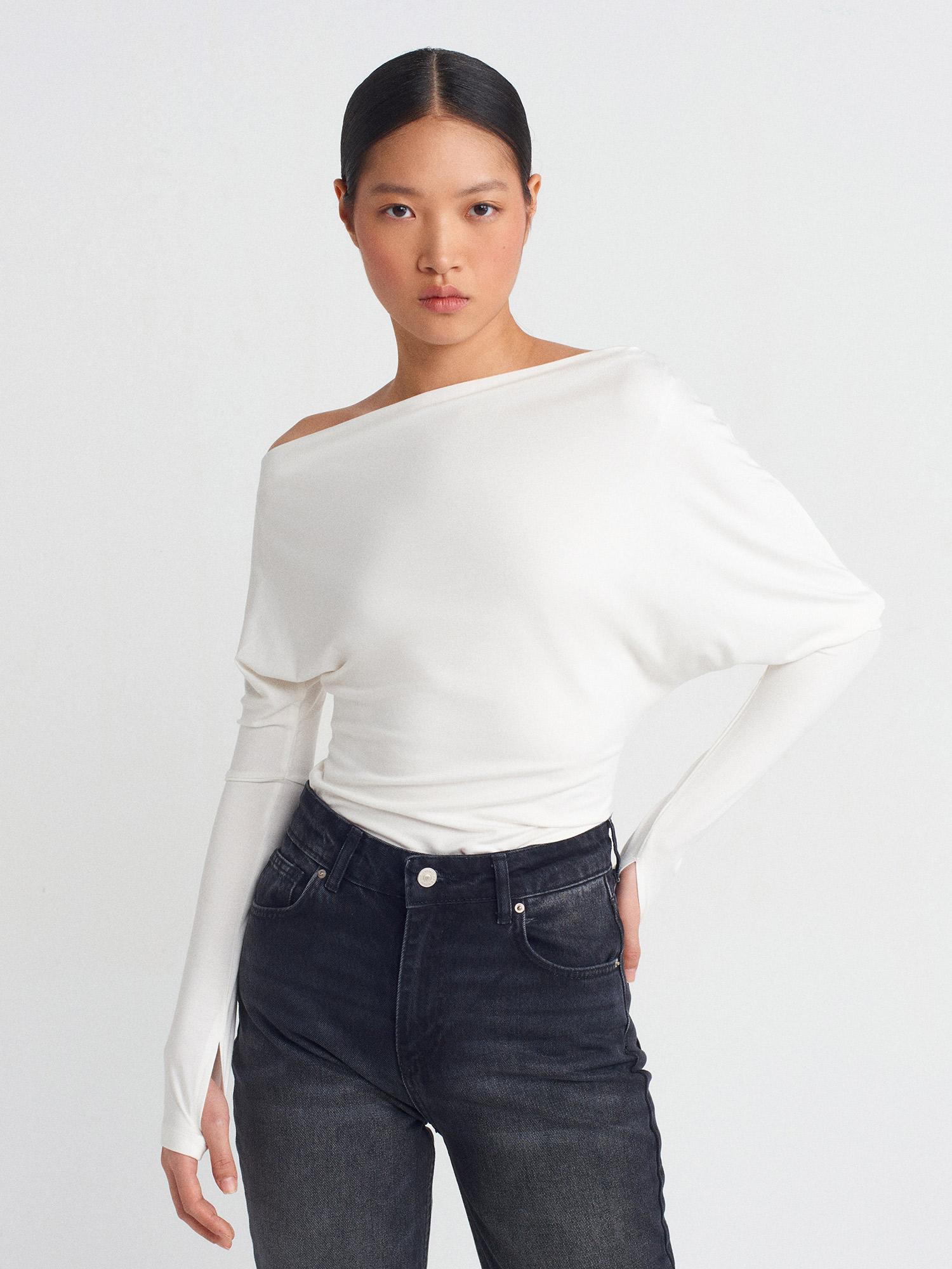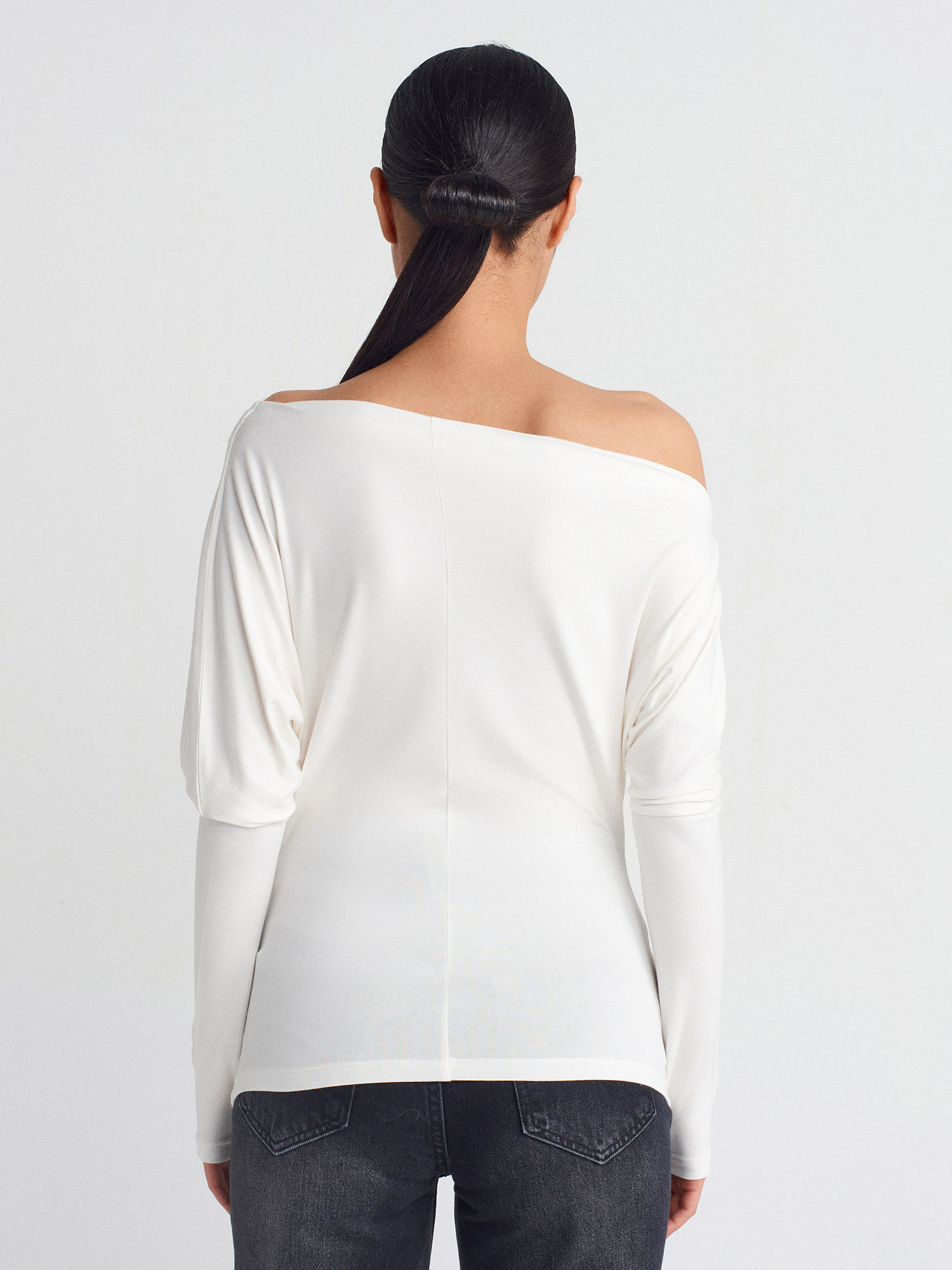 31487 Parmak Detaylı Asimetrik Yaka Top-Ekru