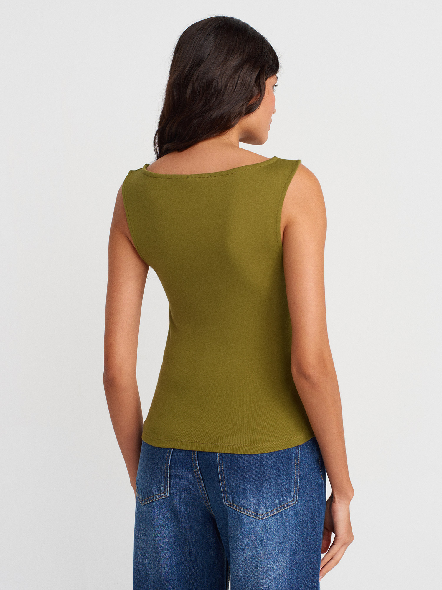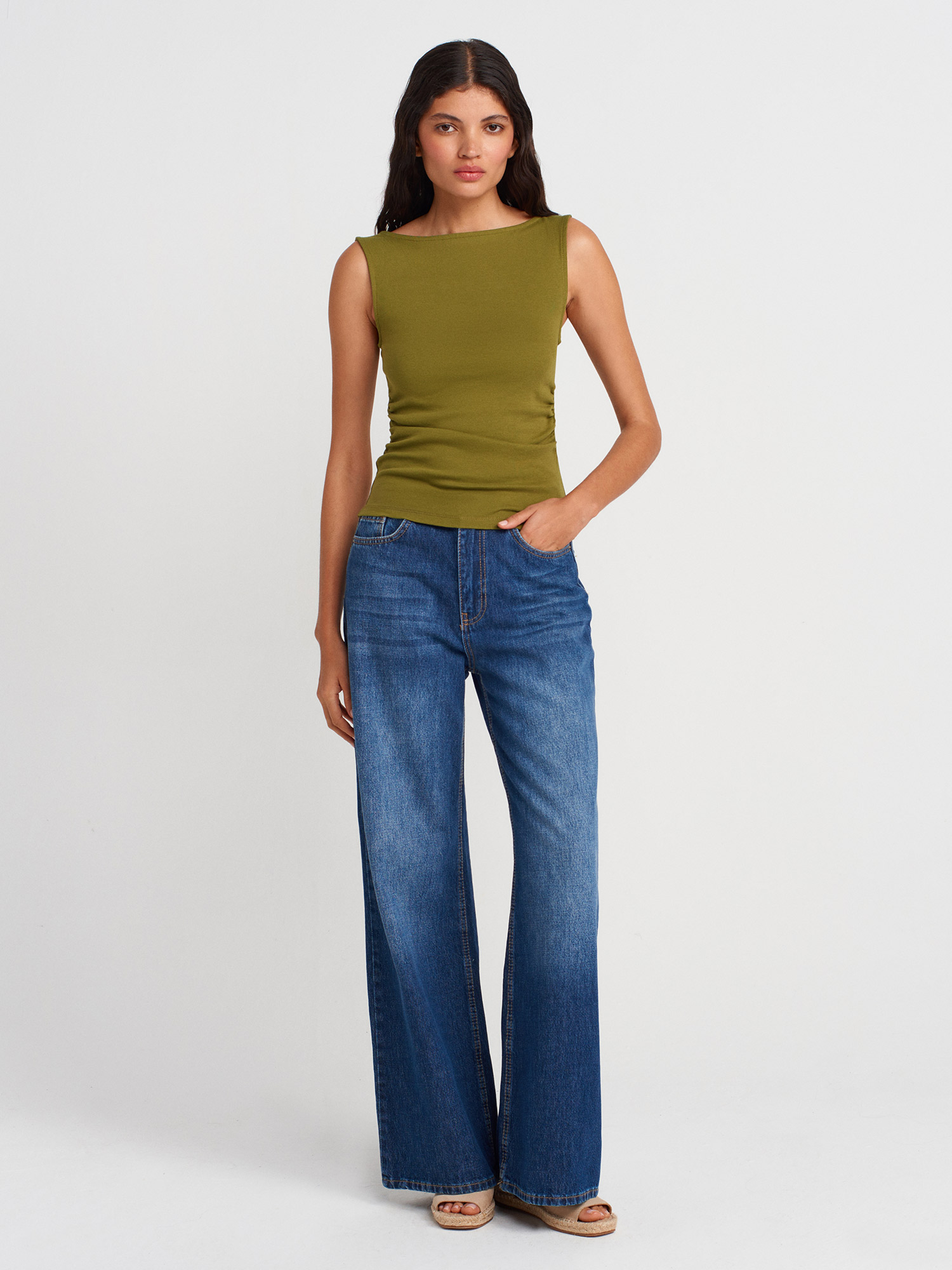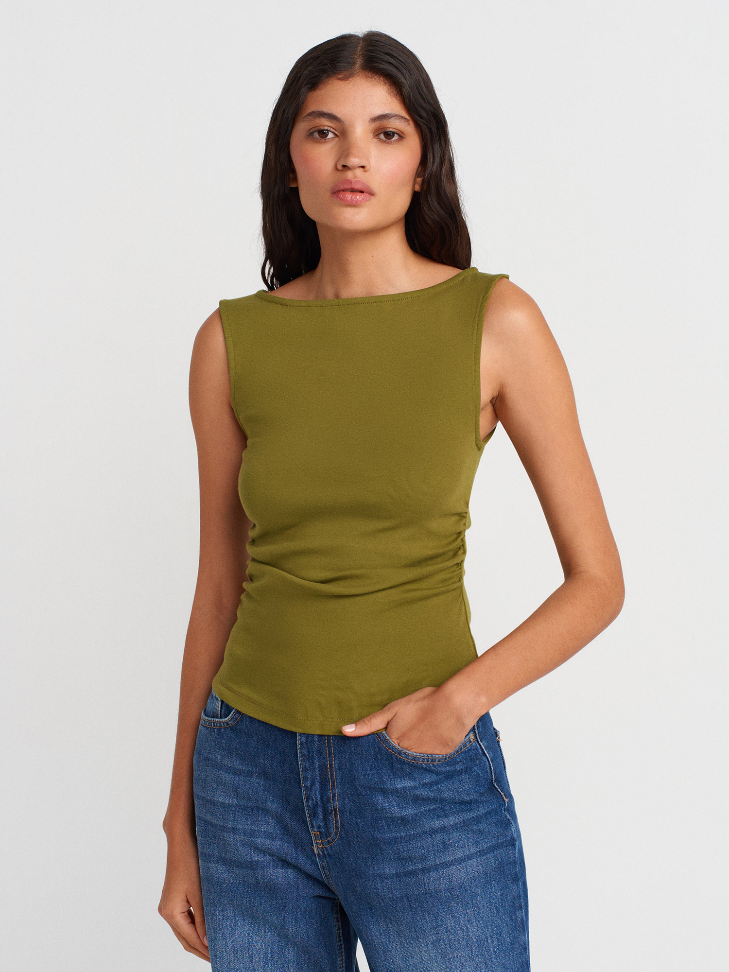 31589 Büzgülü Kayık Yaka Top-Yağ Yeşil