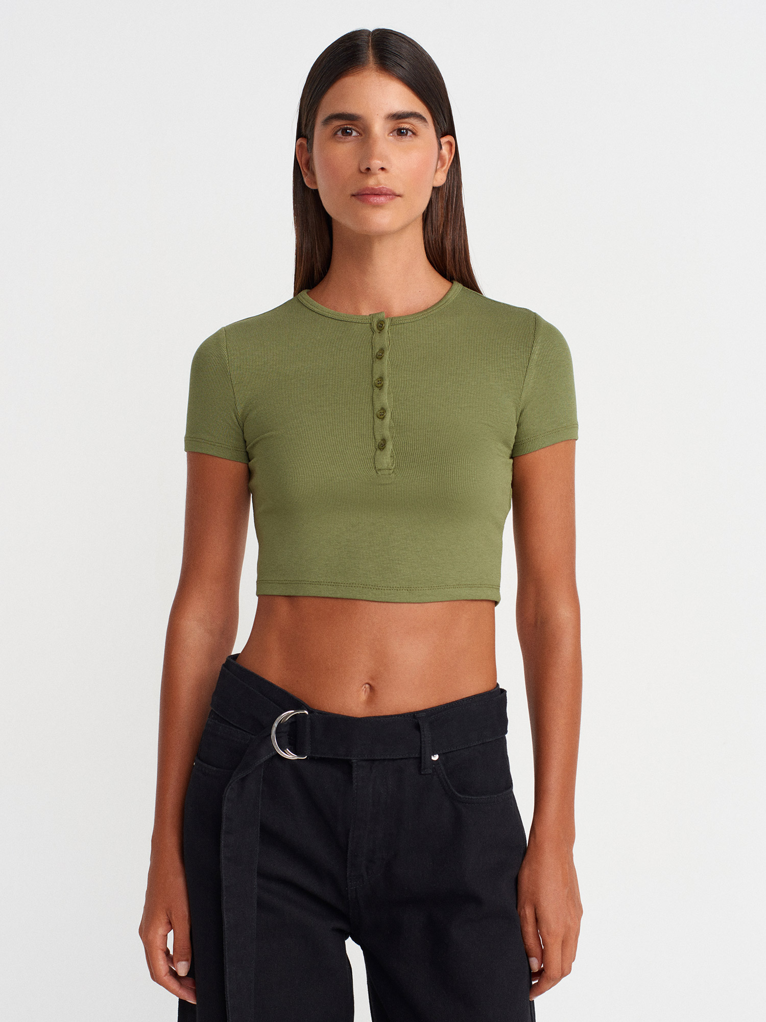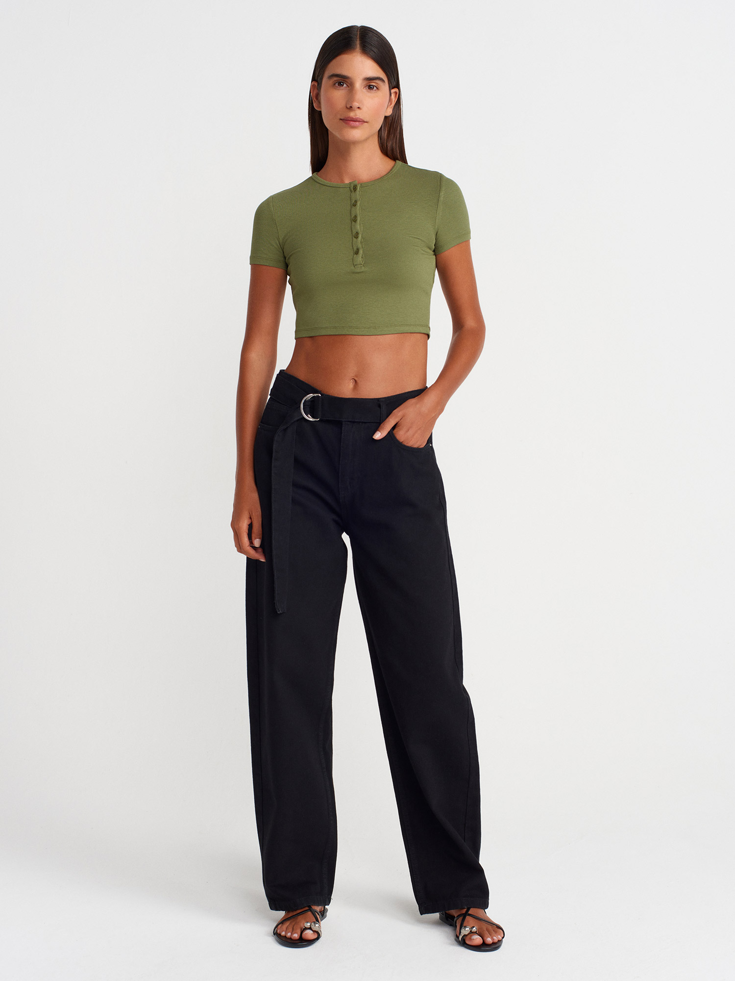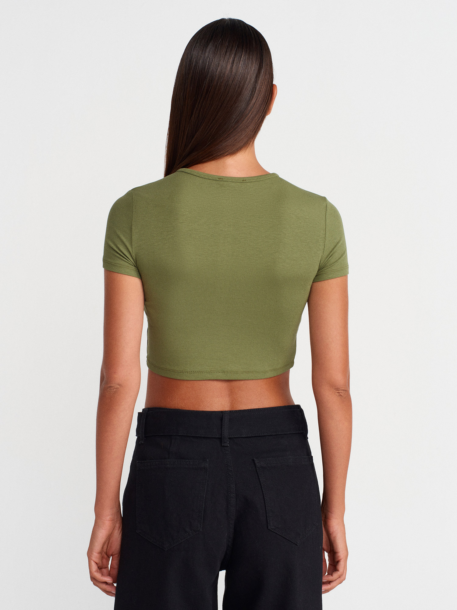 31647 Düğme Detaylı Crop Top-Açık Haki