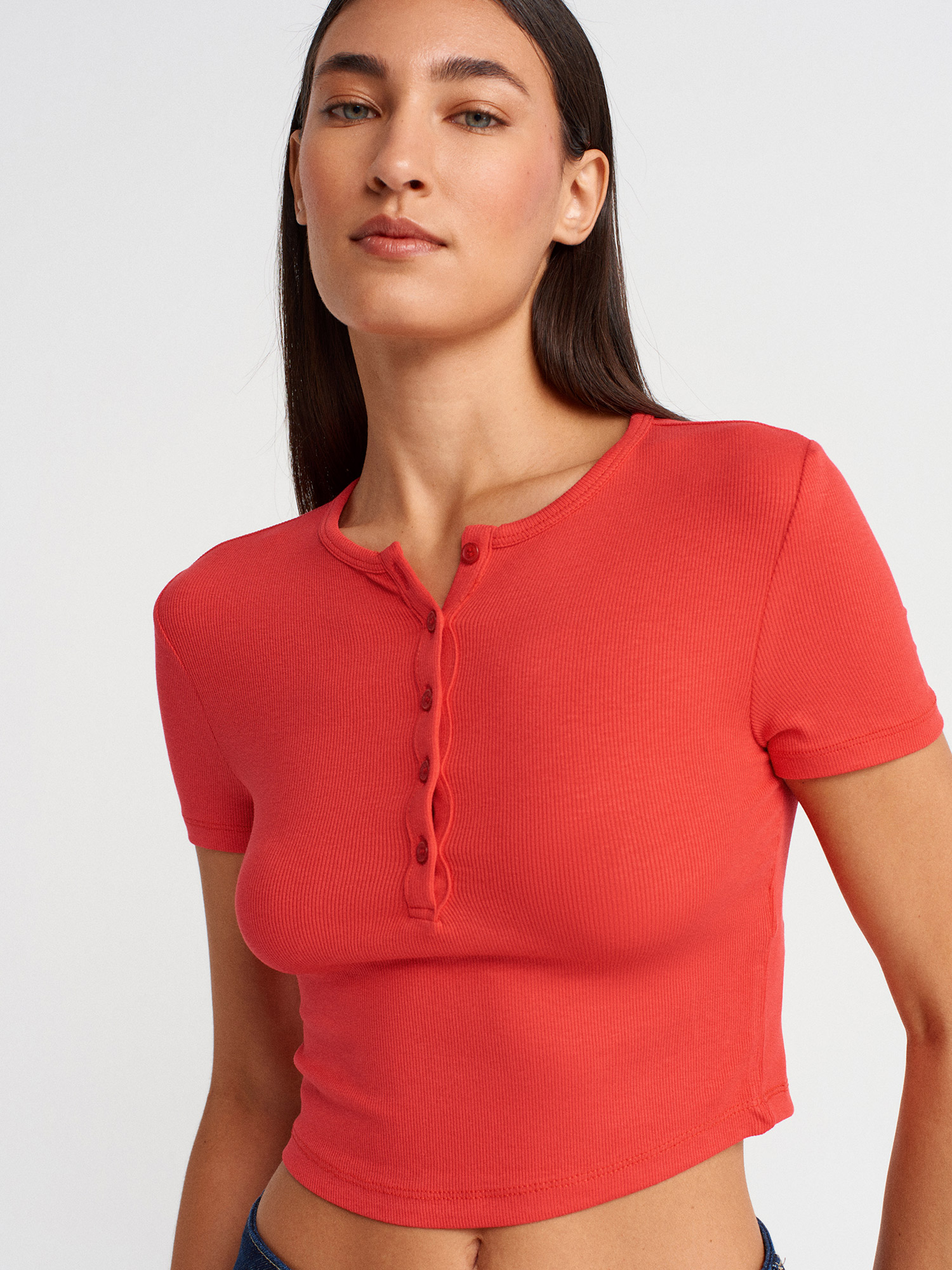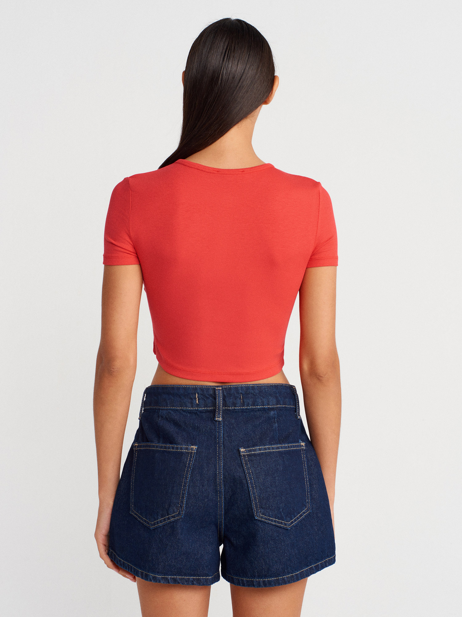 31647 Düğme Detaylı Crop Top-Kırmızı