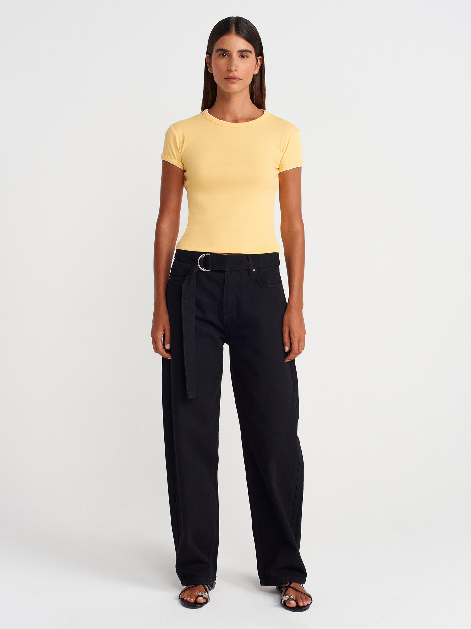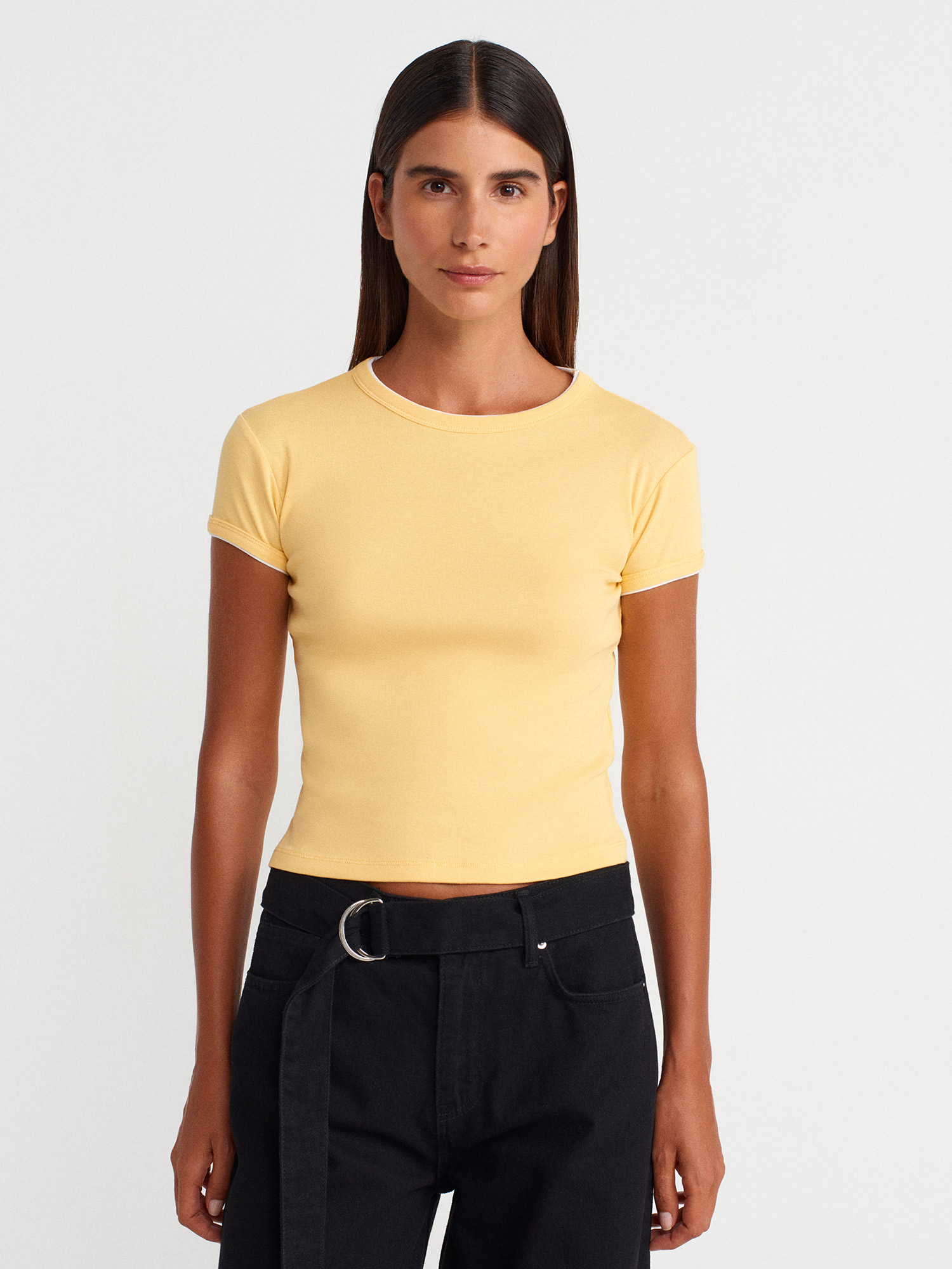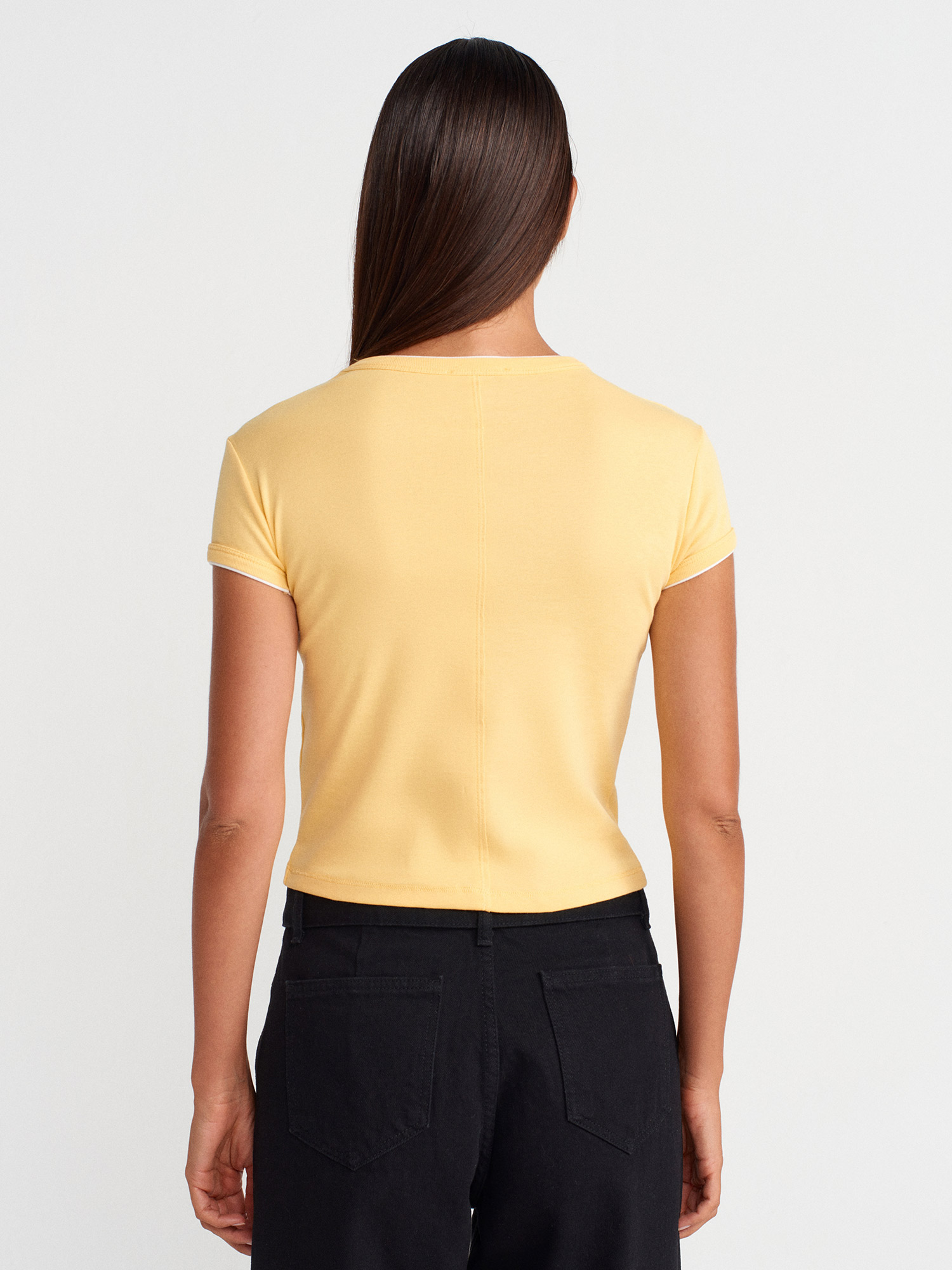 31750 %100 Pamuk Kontrast Kısa Kollu T-shirt-Sarı