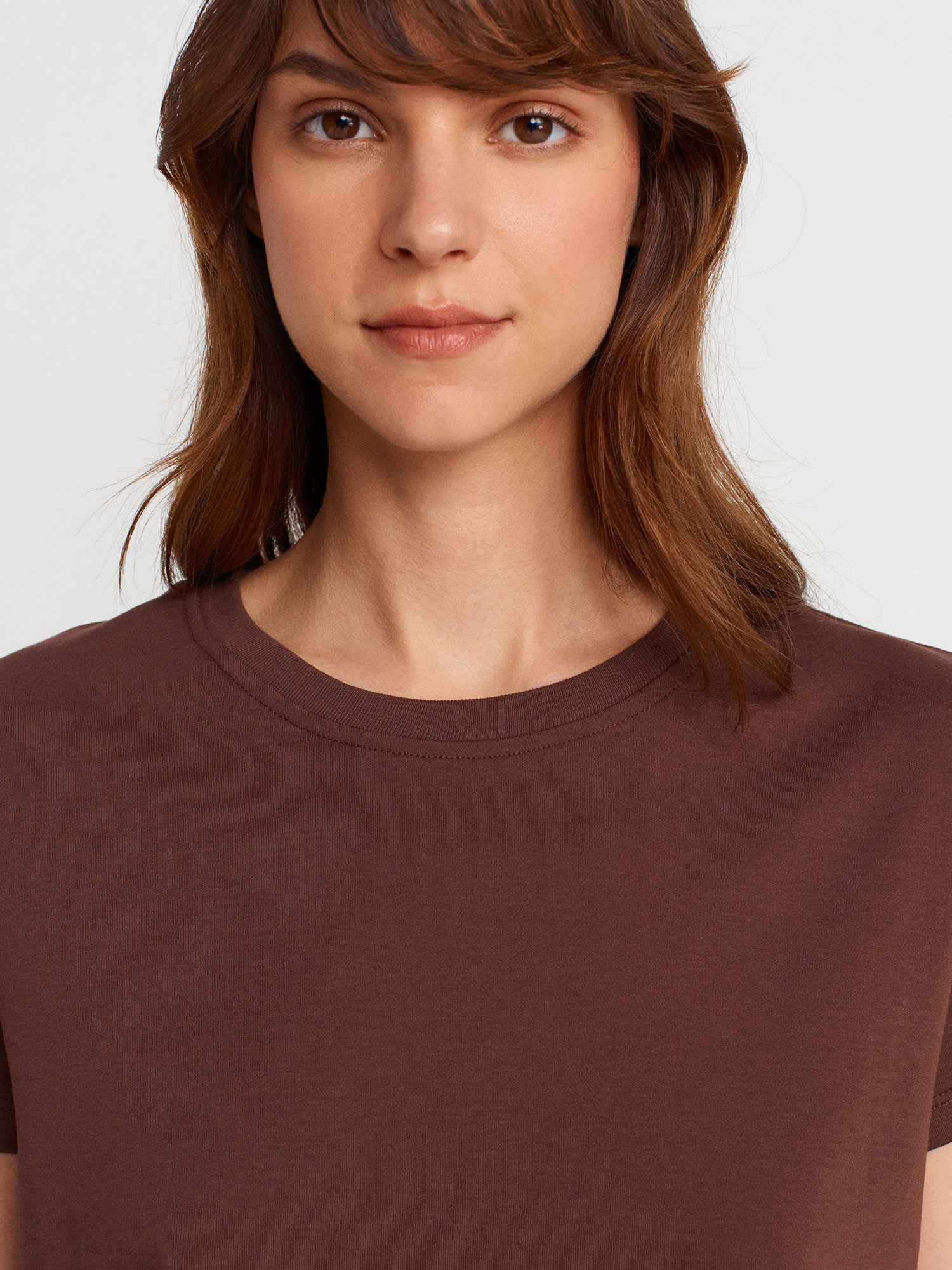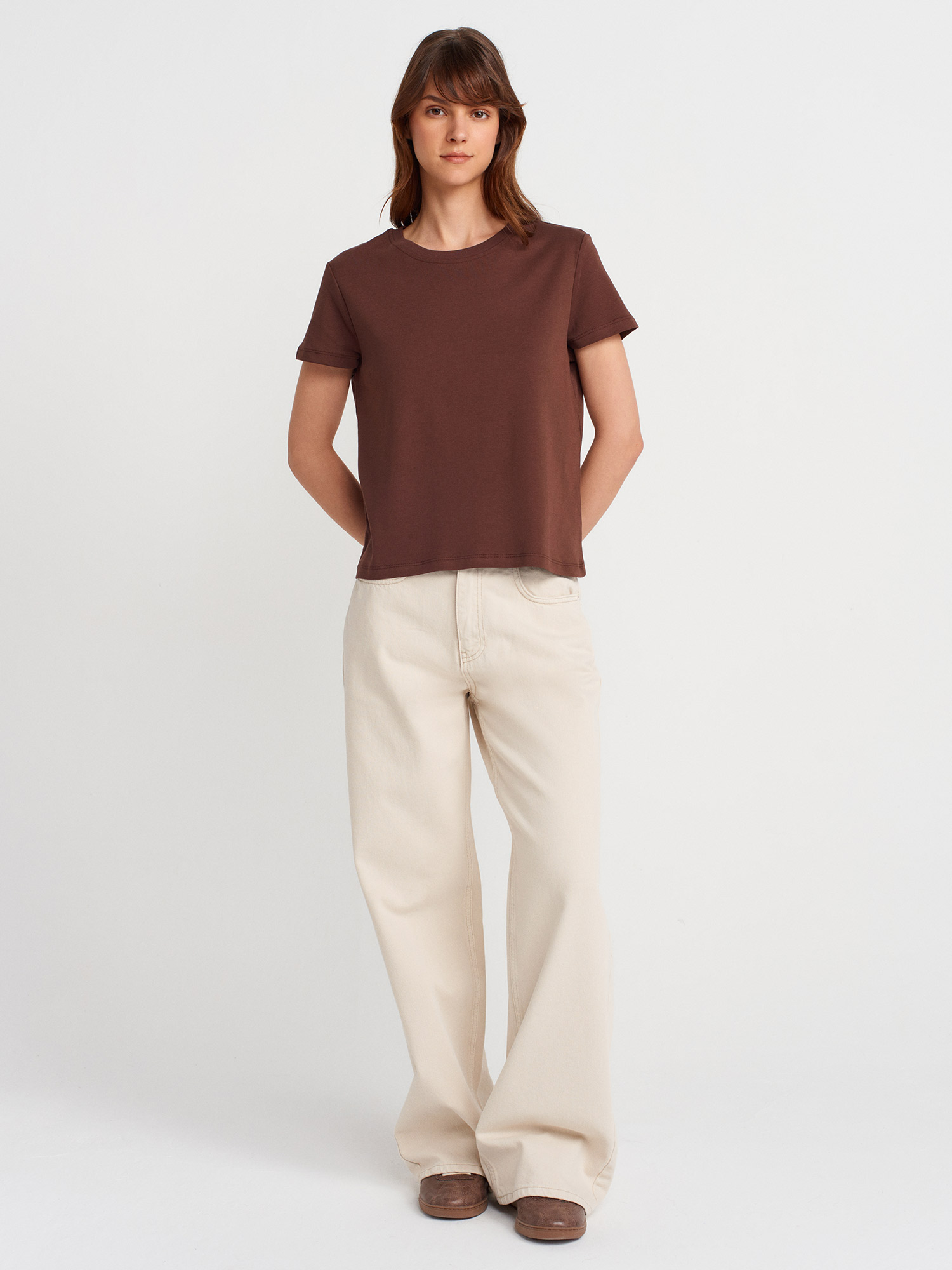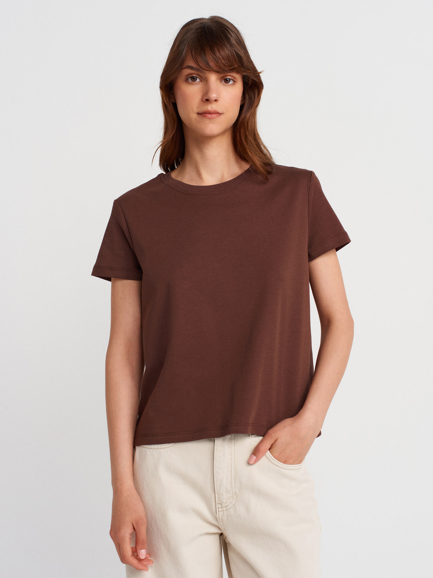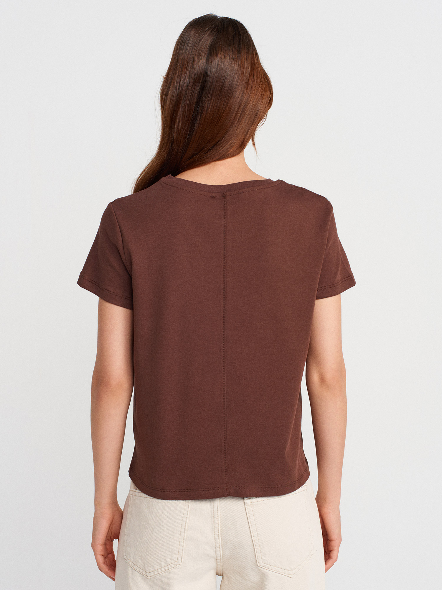 31757 Bisiklet Yaka Dikiş Detaylı T-shirt-Açık Kahve