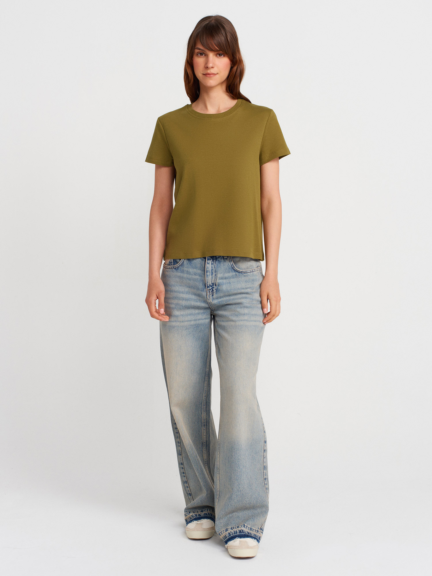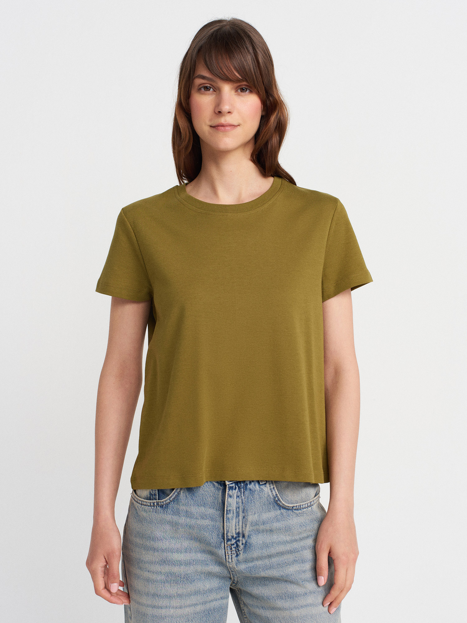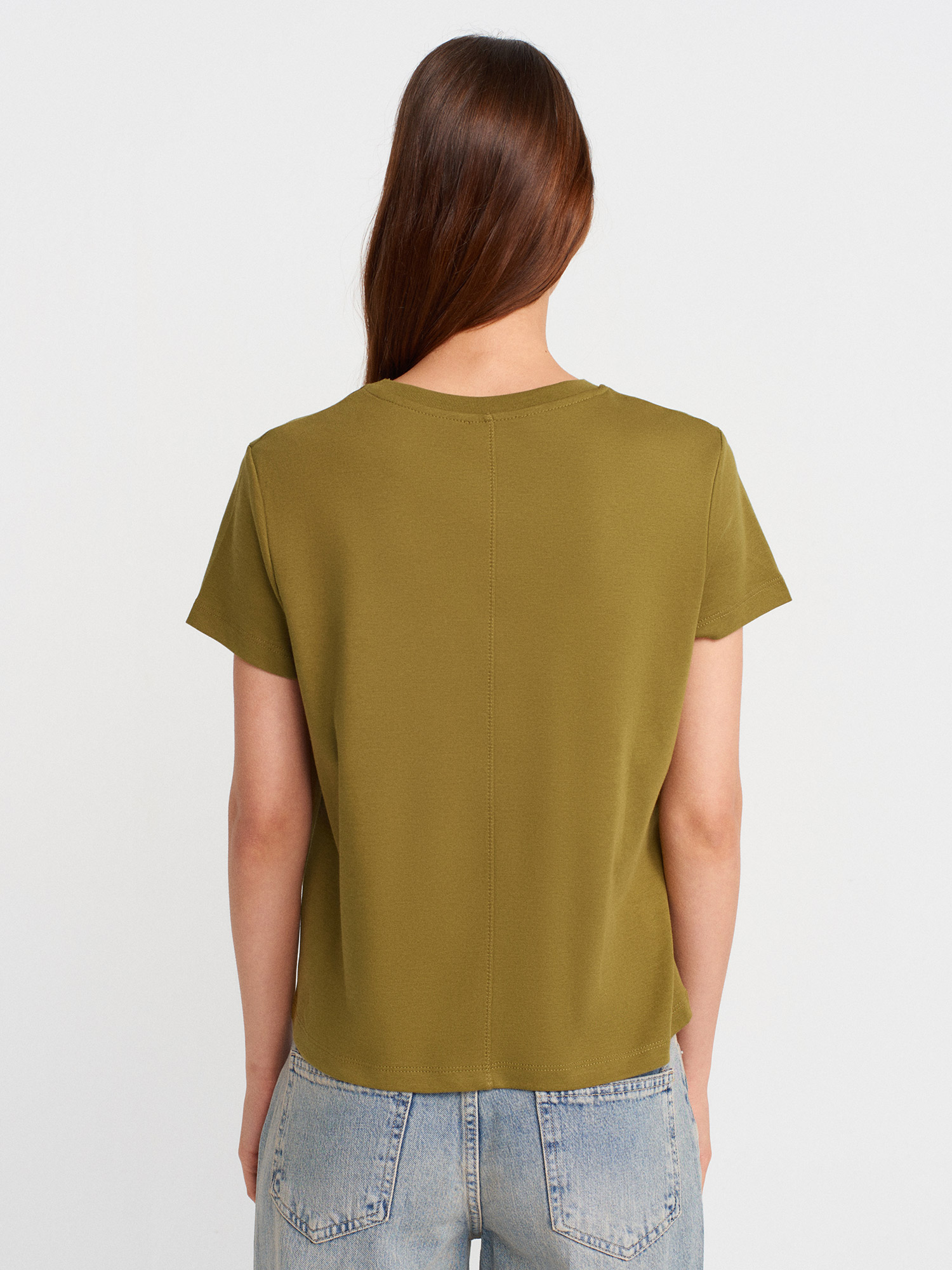 31757 Bisiklet Yaka Dikiş Detaylı T-shirt-Yağ Yeşil
