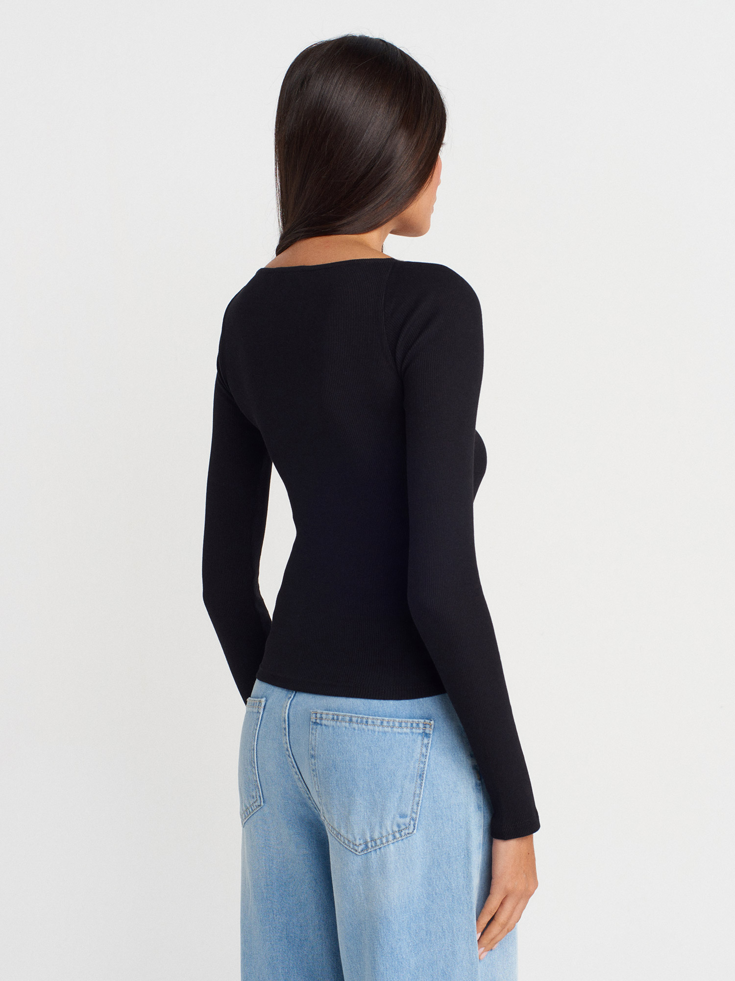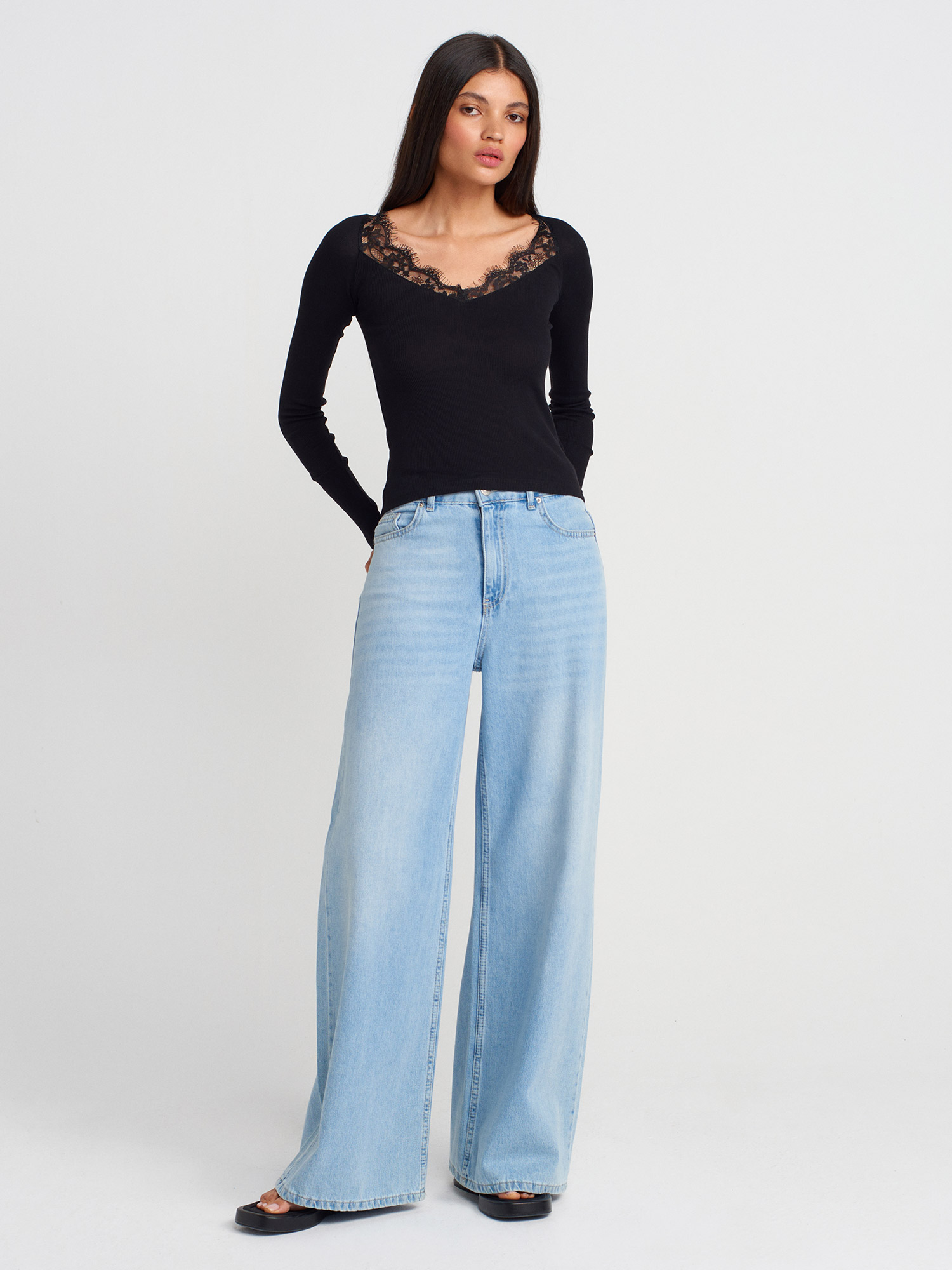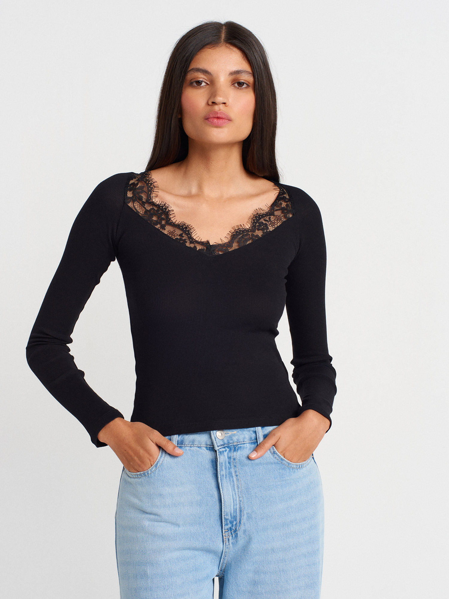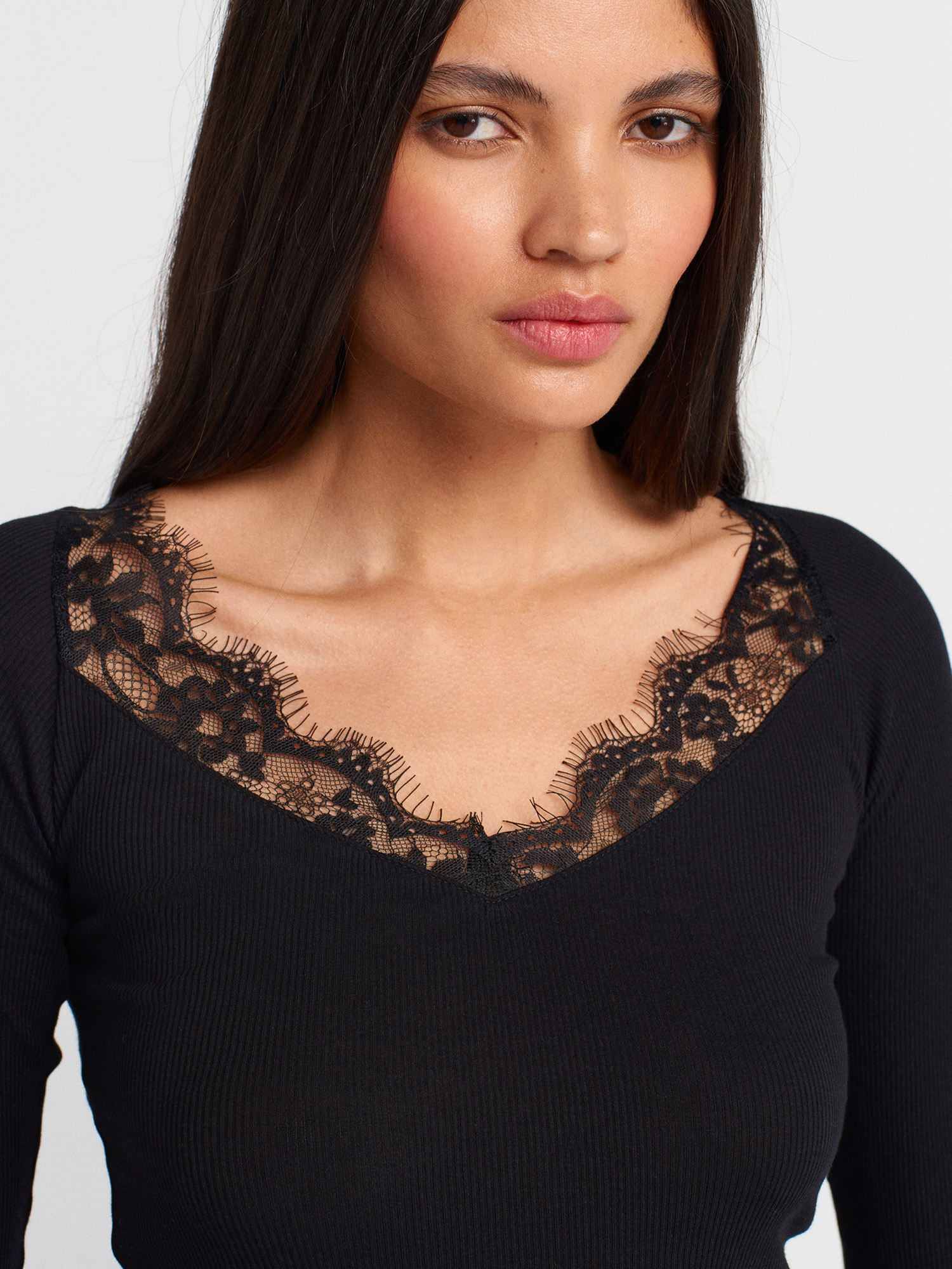 31782 Dantel Şeritli Uzun Kollu Top-Siyah