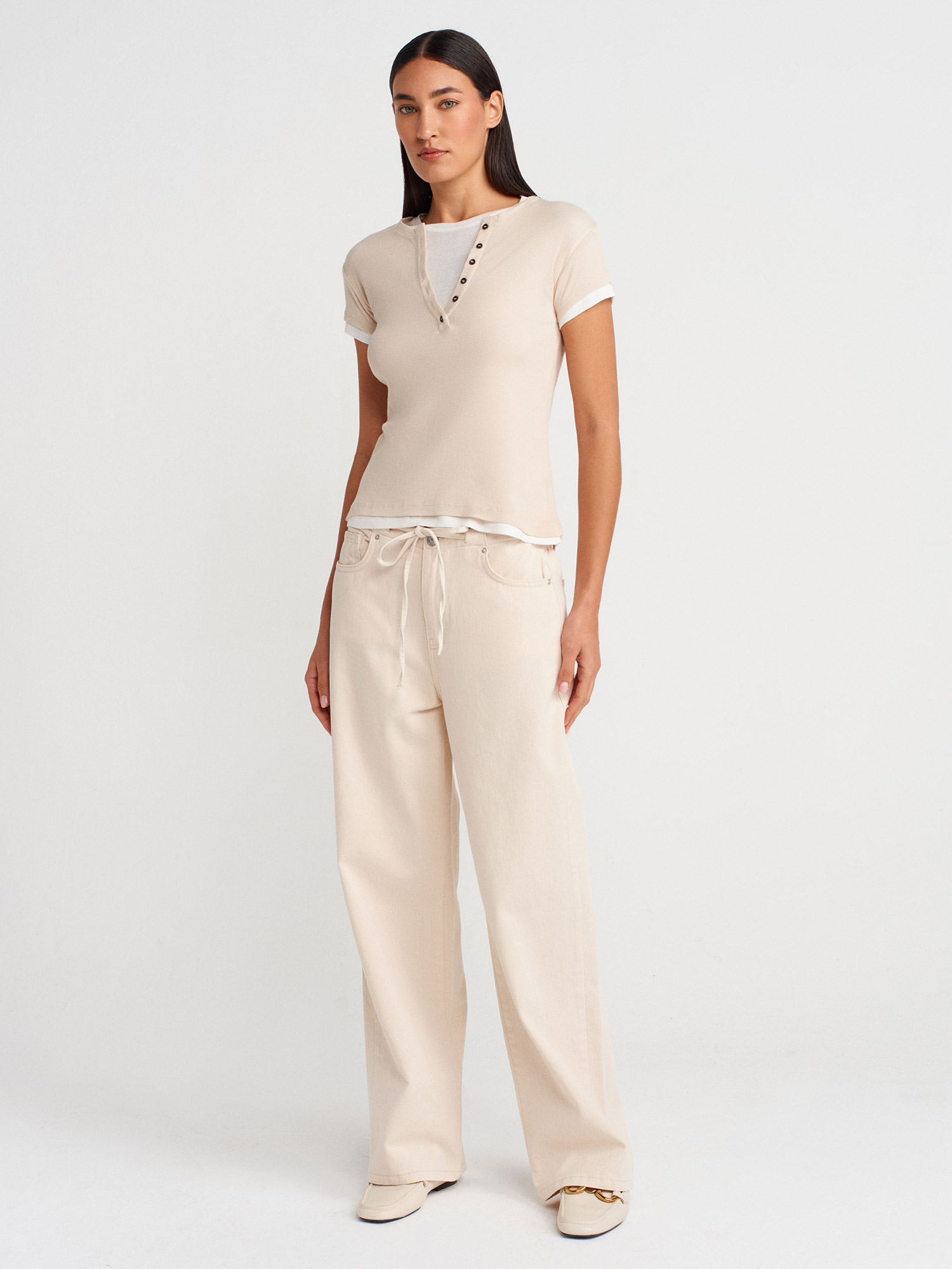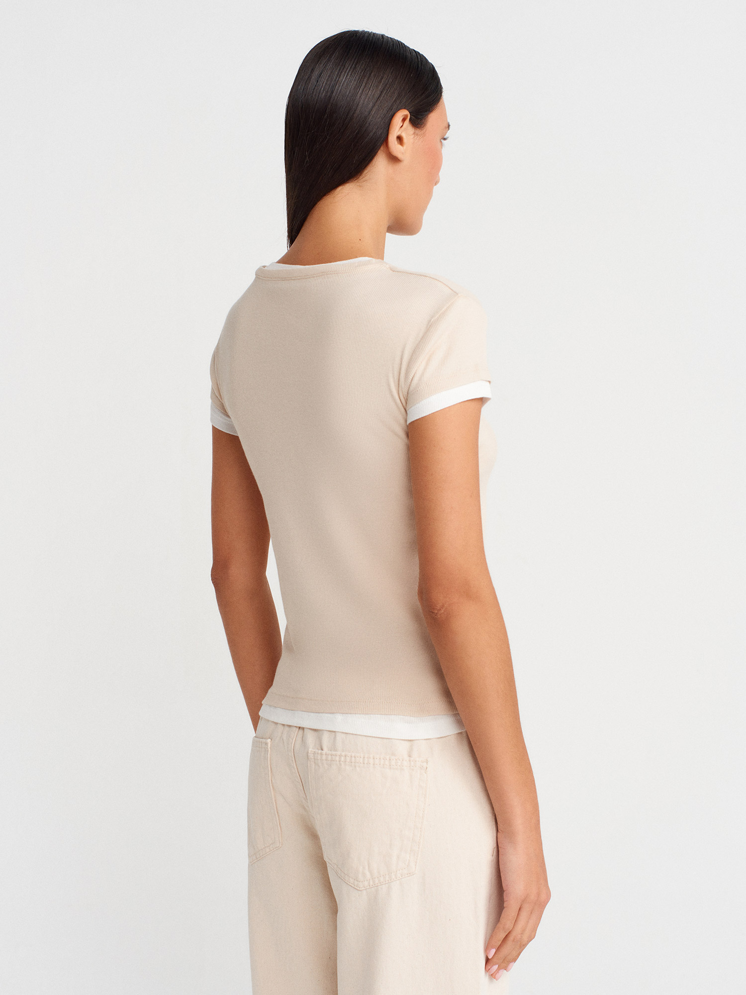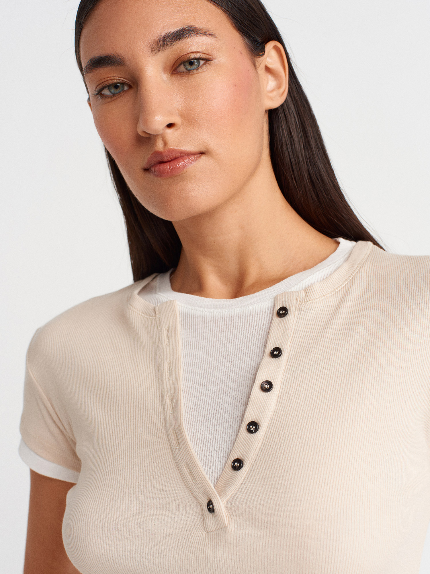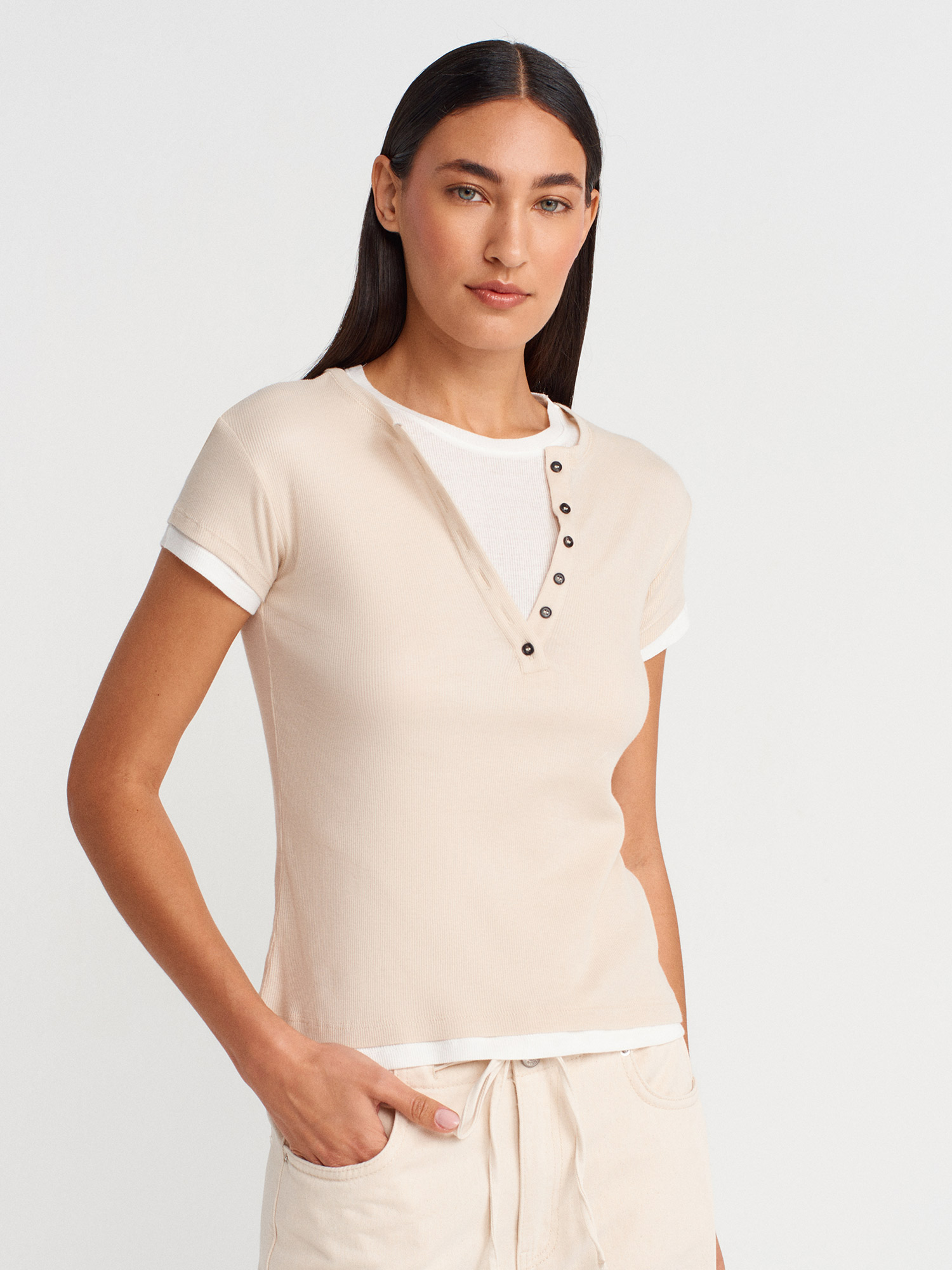 31783 Çift Katlı Düğmeli T-shirt-Bej