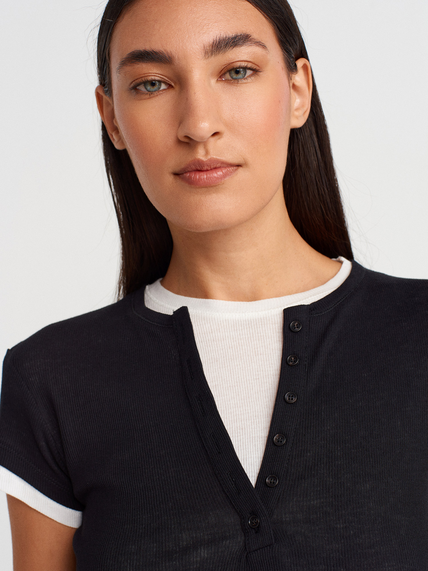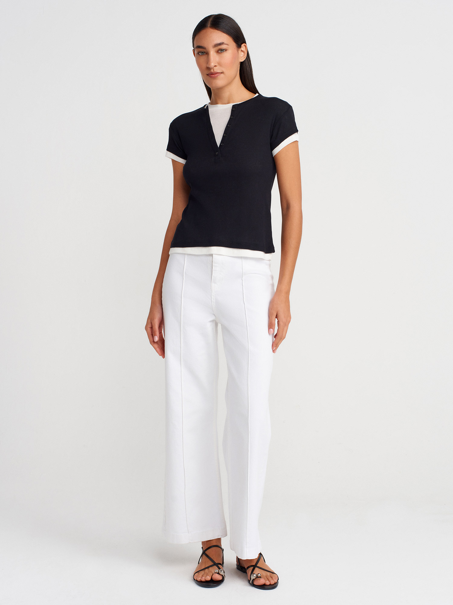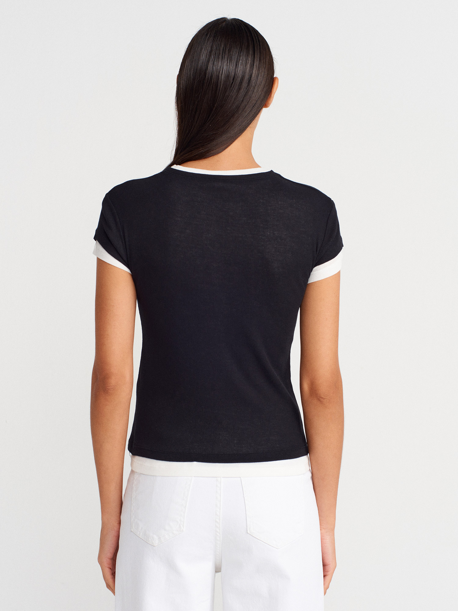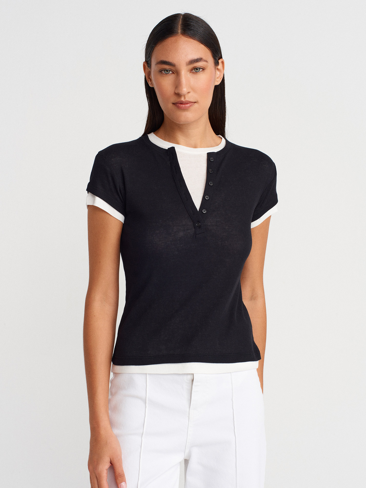 31783 Çift Katlı Düğmeli T-shirt-Siyah