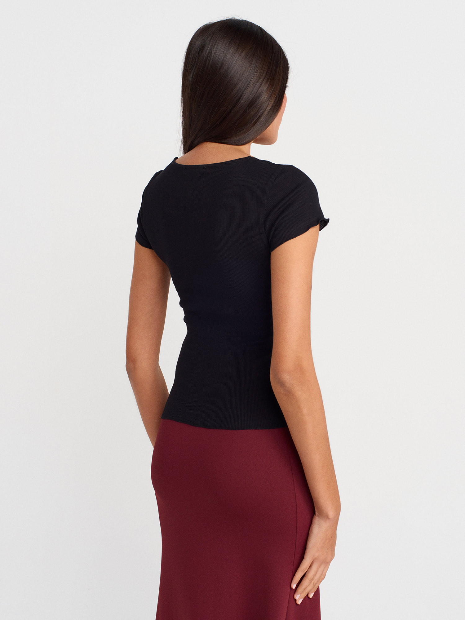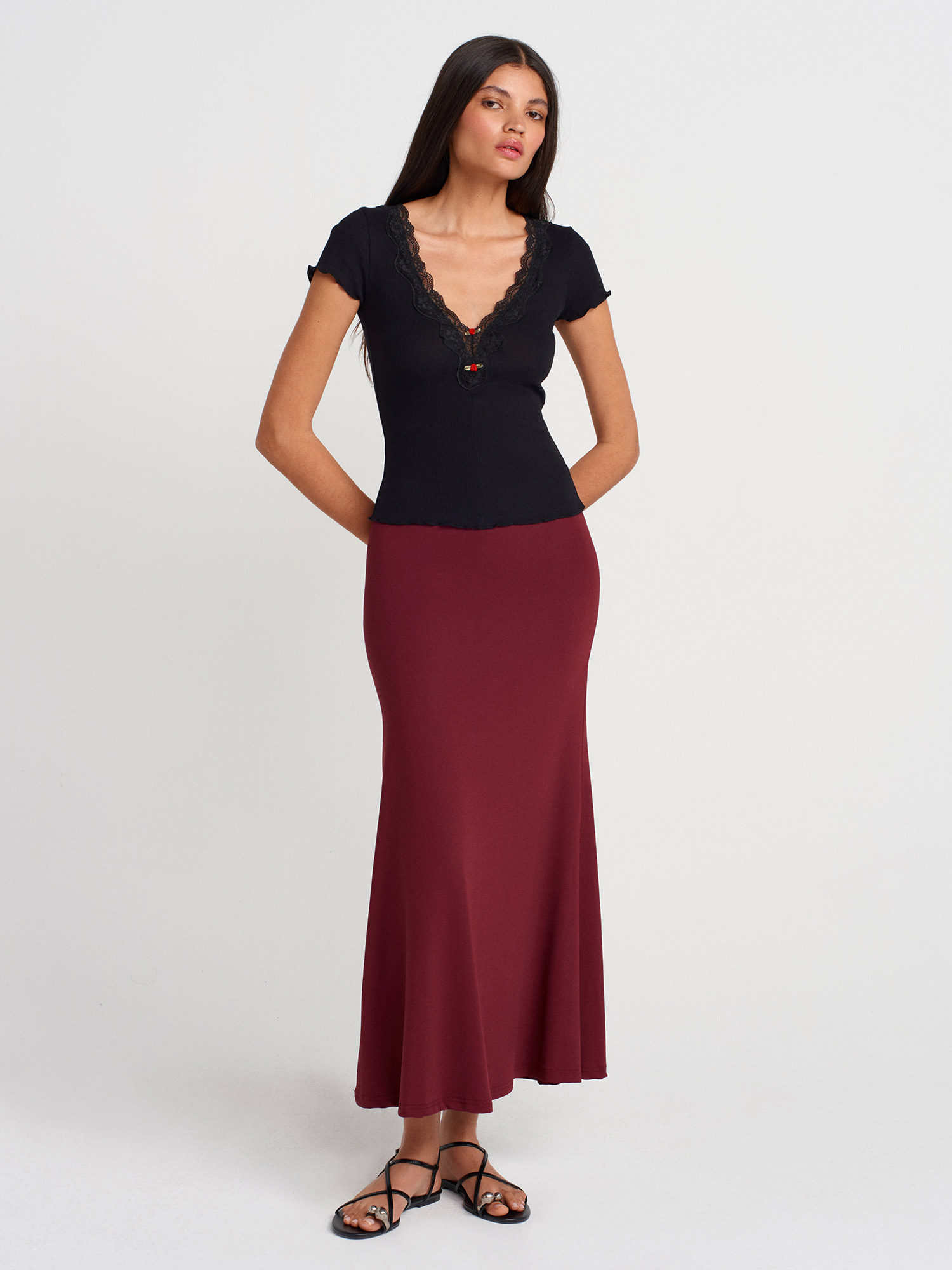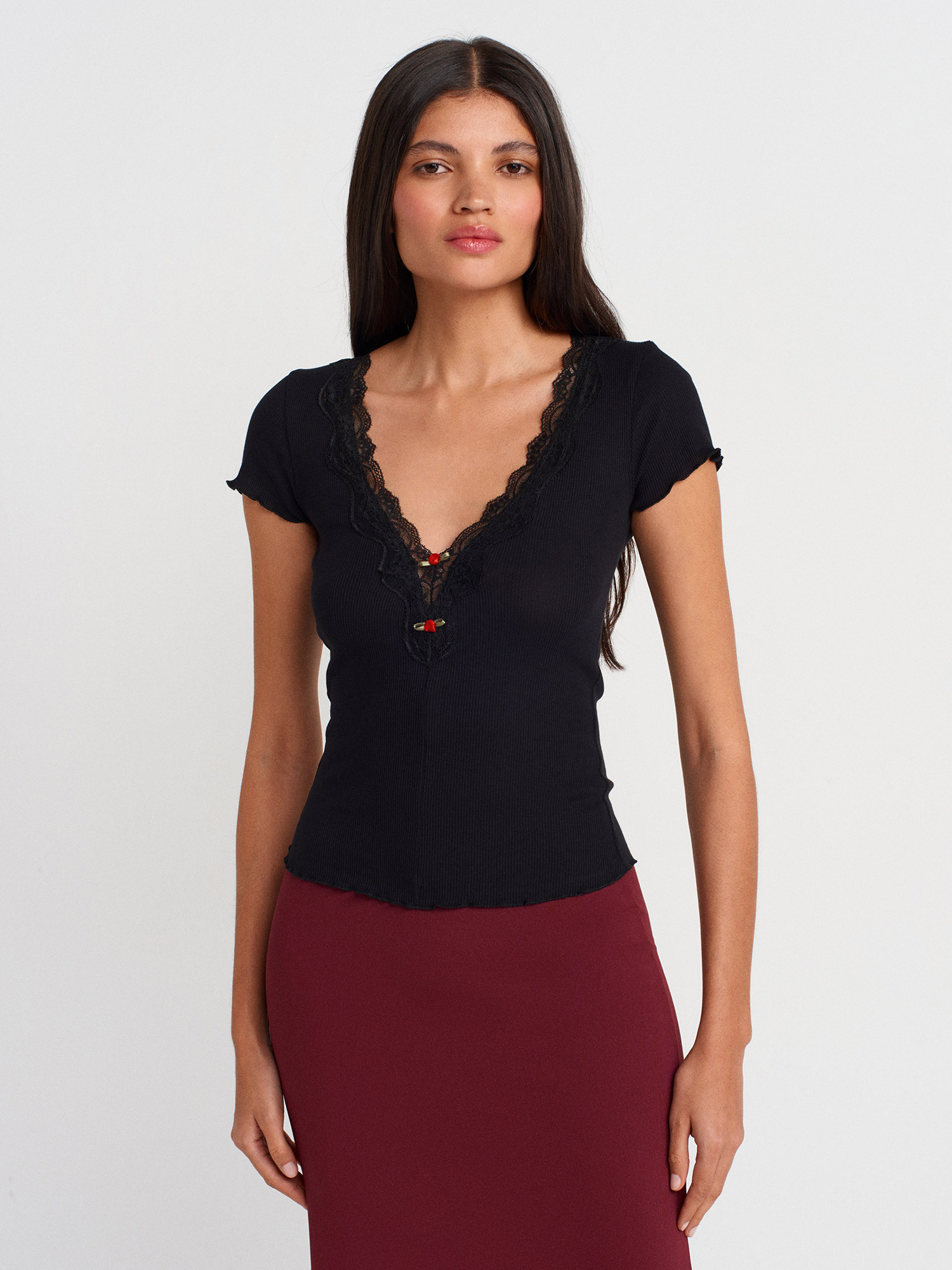 31789 Dantel Şeritli V Yaka Top-Siyah