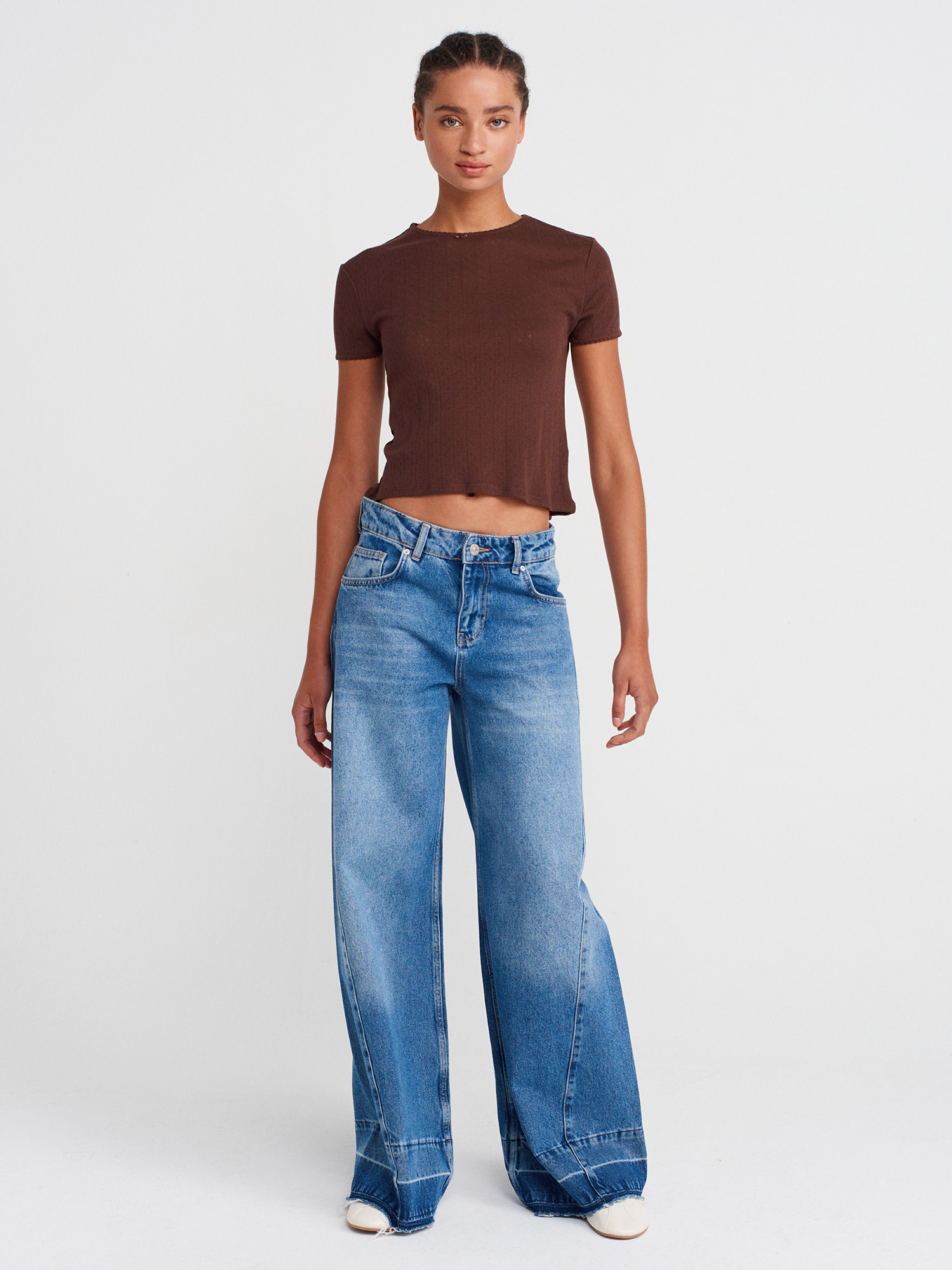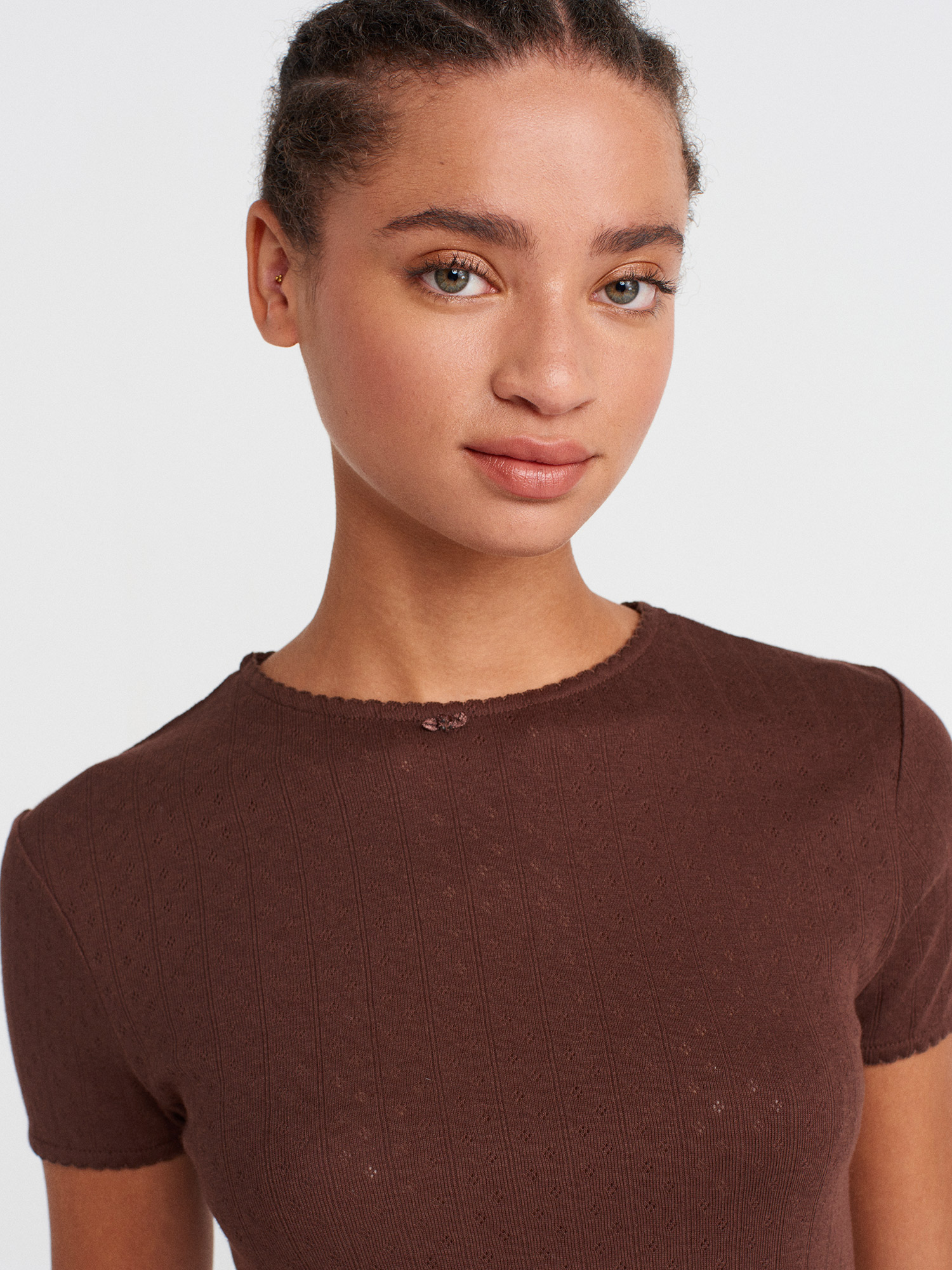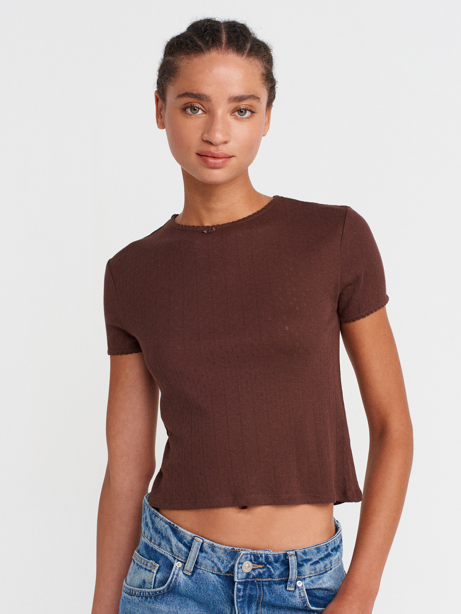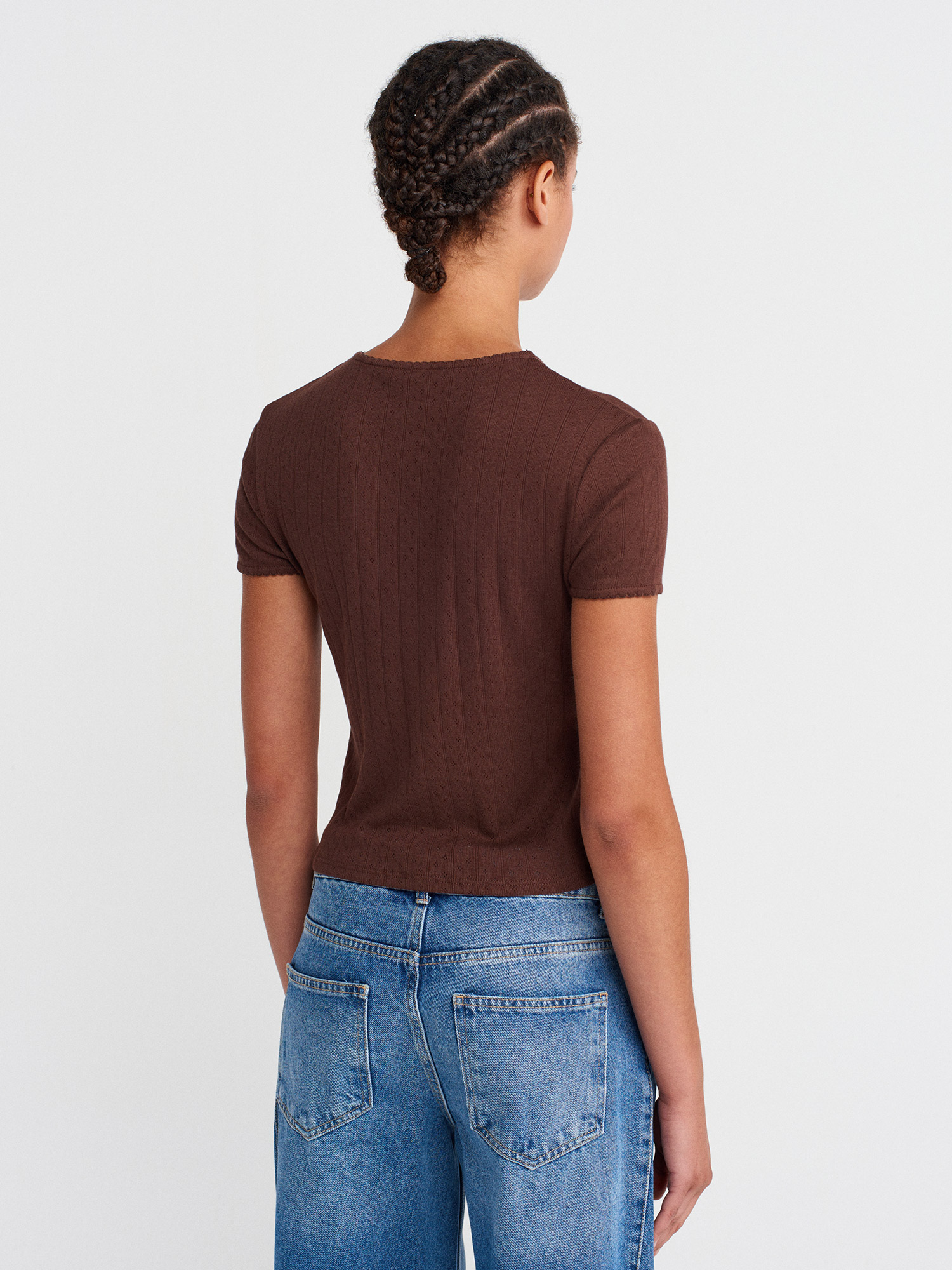 31795 Fiyonk Detaylı Kısa Kollu Kontrast T-shirt-Açık Kahve