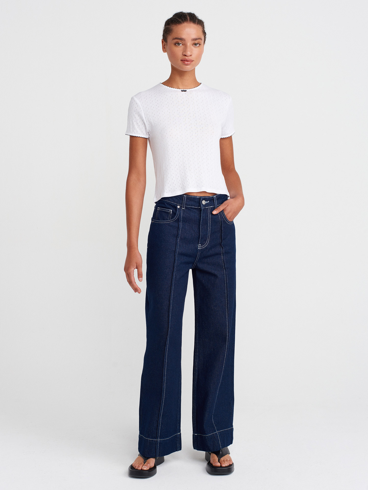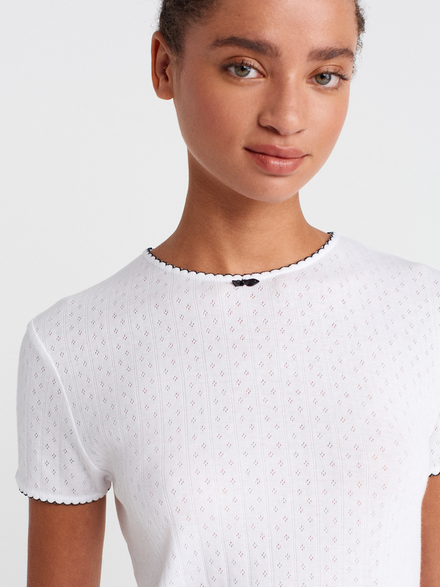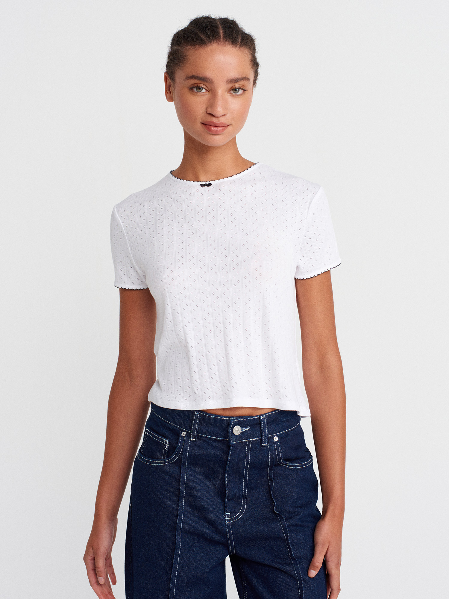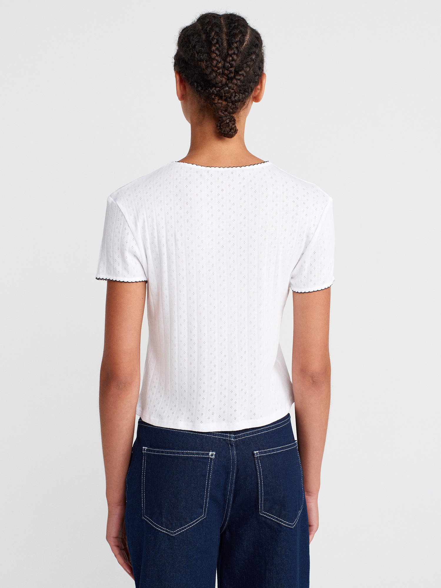 31795 Fiyonk Detaylı Kısa Kollu Kontrast T-shirt-Beyaz
