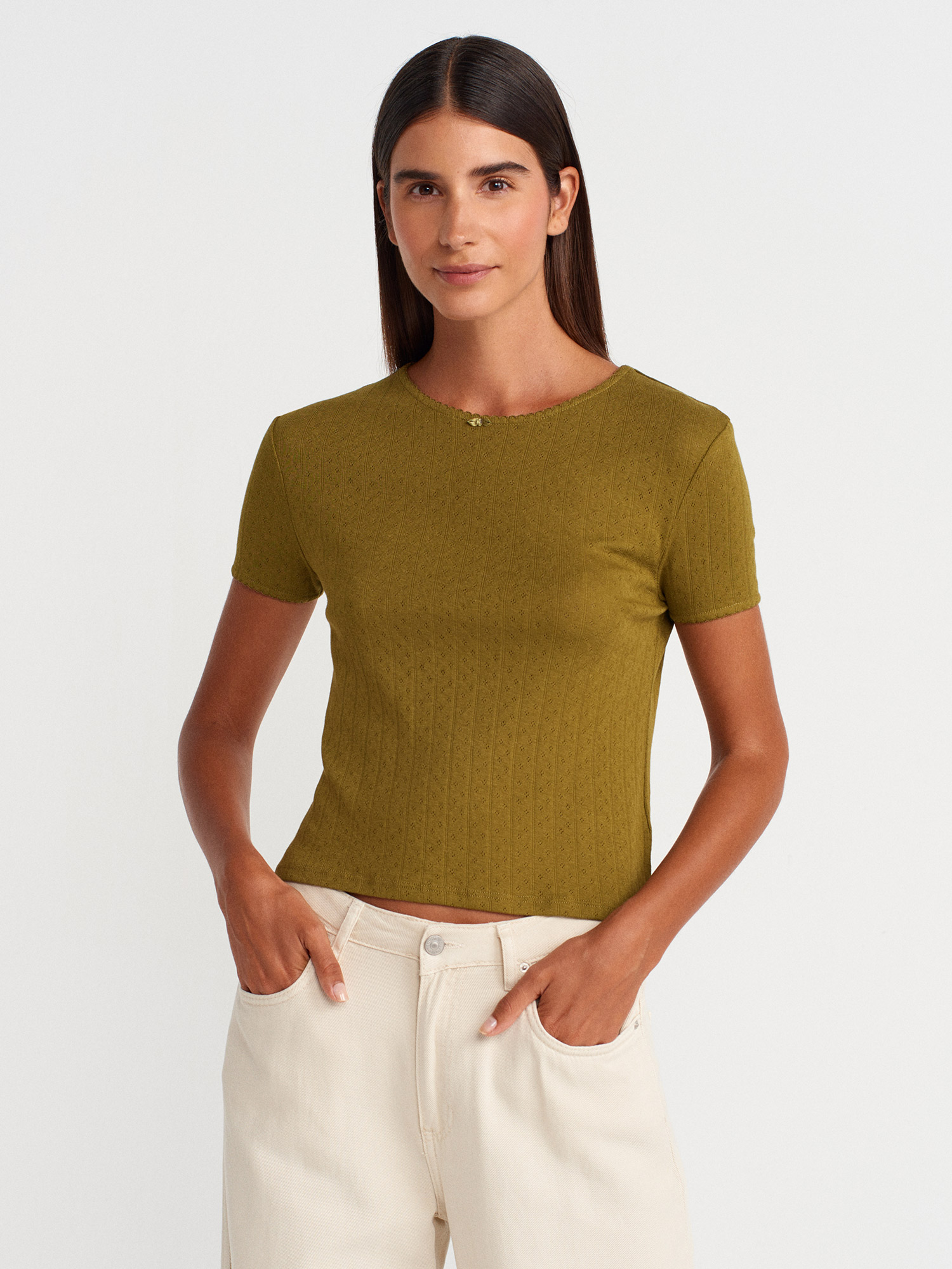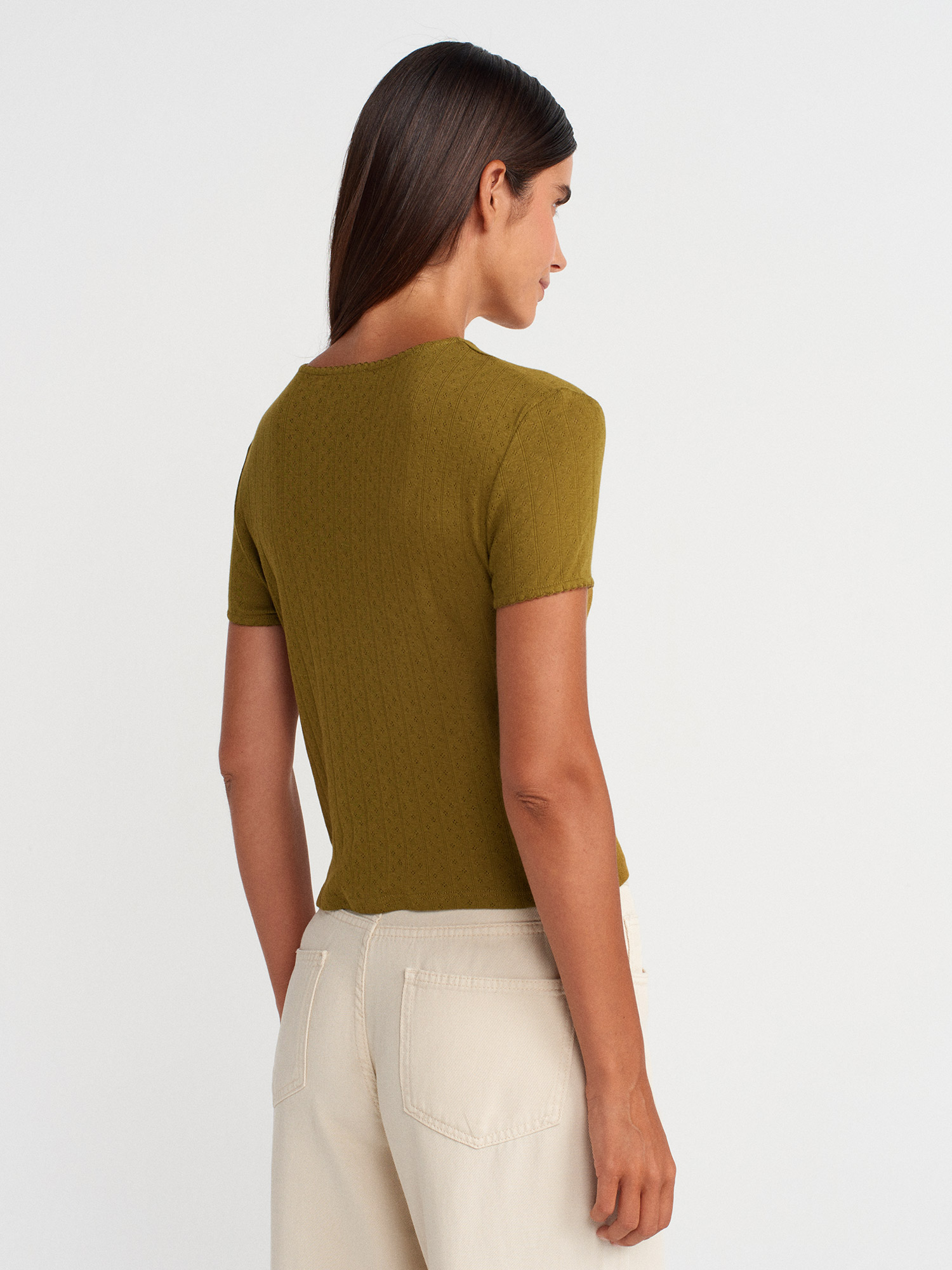 31795 Fiyonk Detaylı Kısa Kollu Kontrast T-shirt-Koyu Yeşil