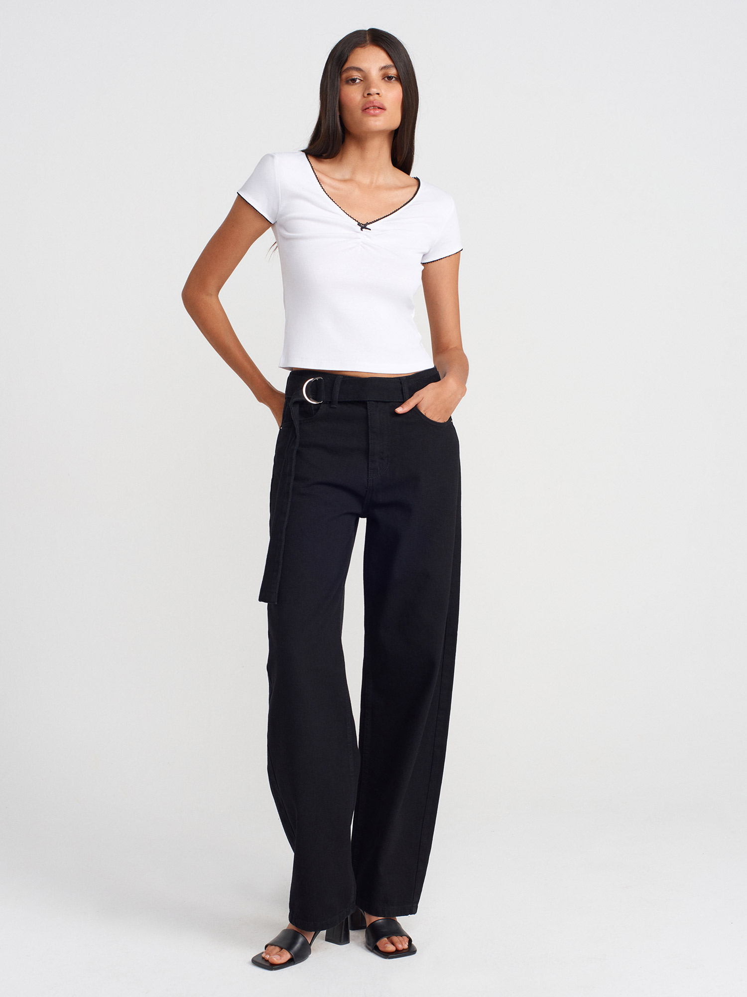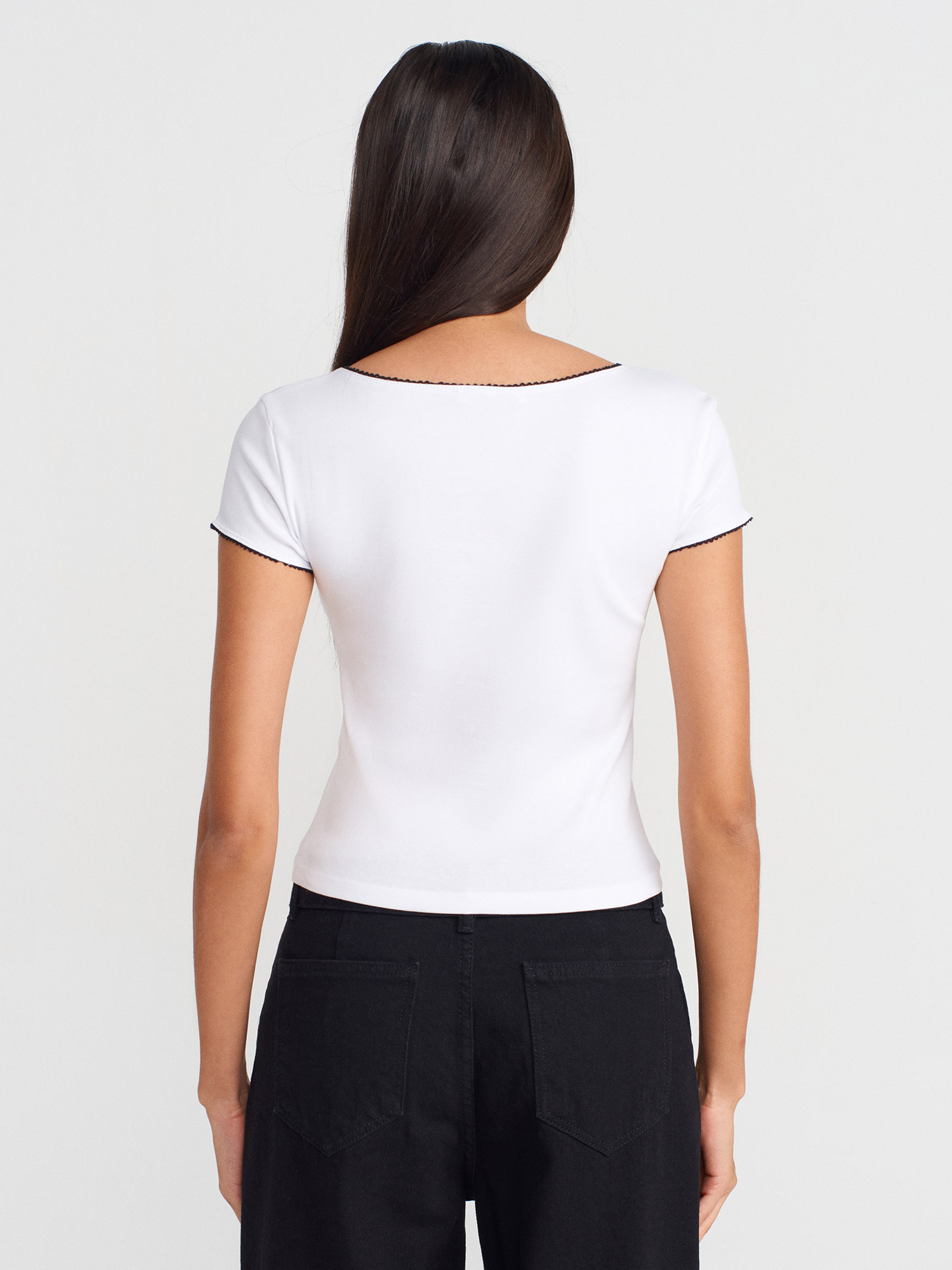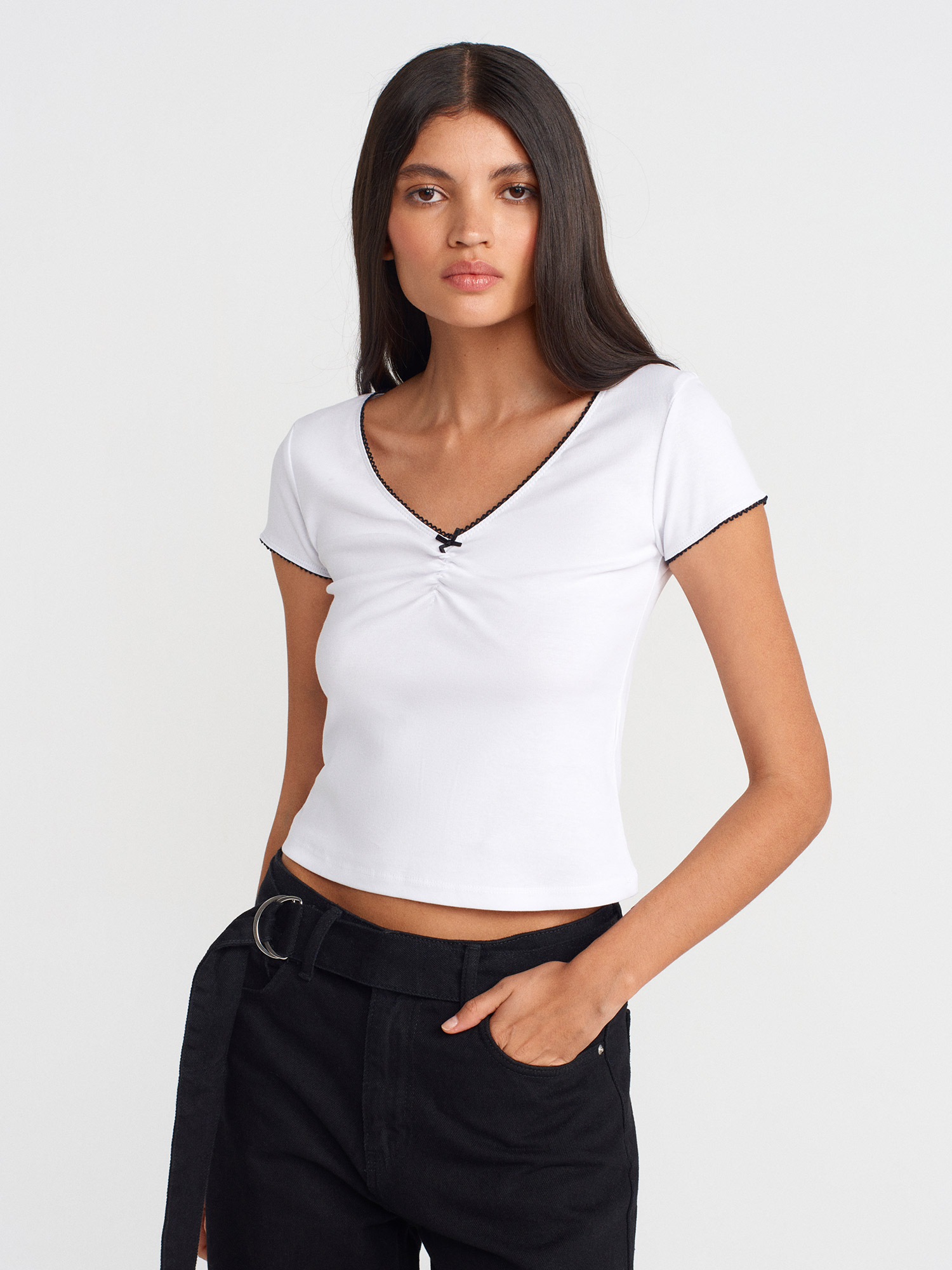 31798 Kısa Kollu Büzgülü Top-Beyaz