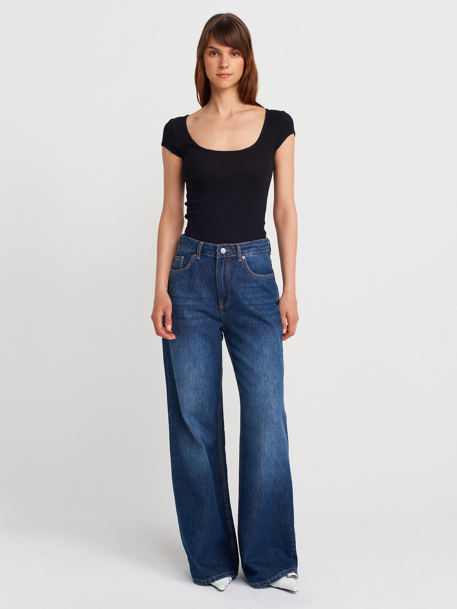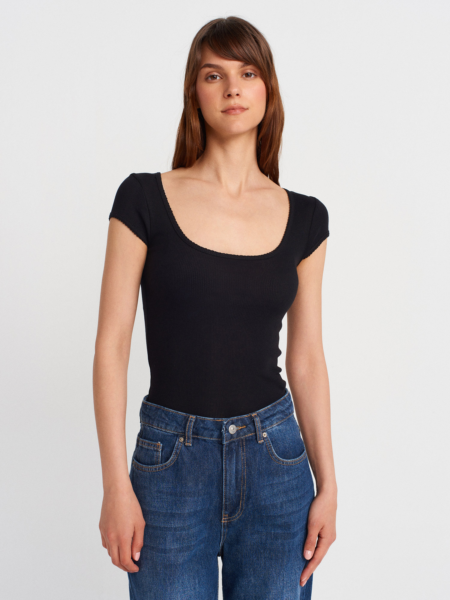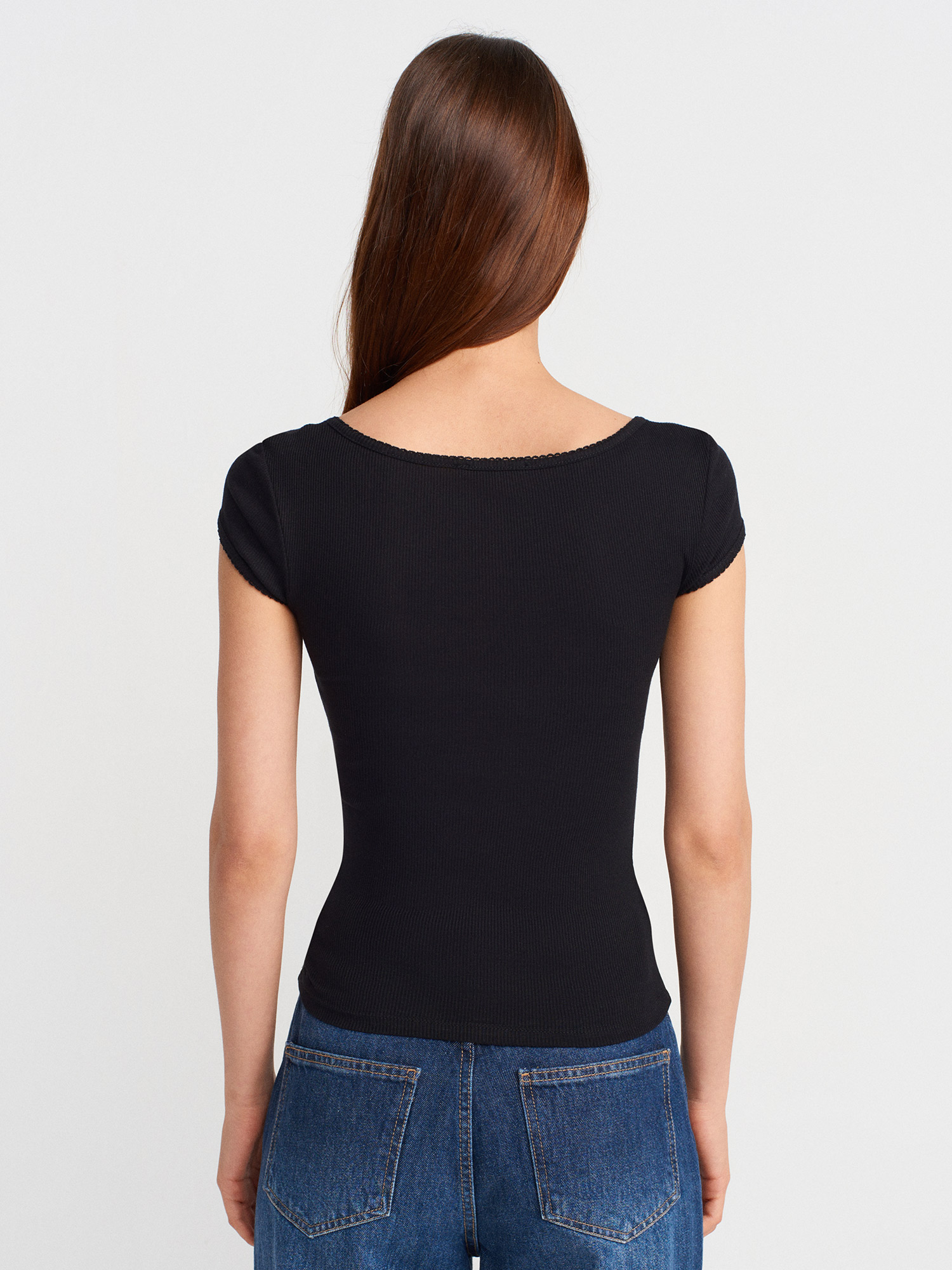 31807 Bisiklet Yaka Fitilli T-shirt-Siyah
