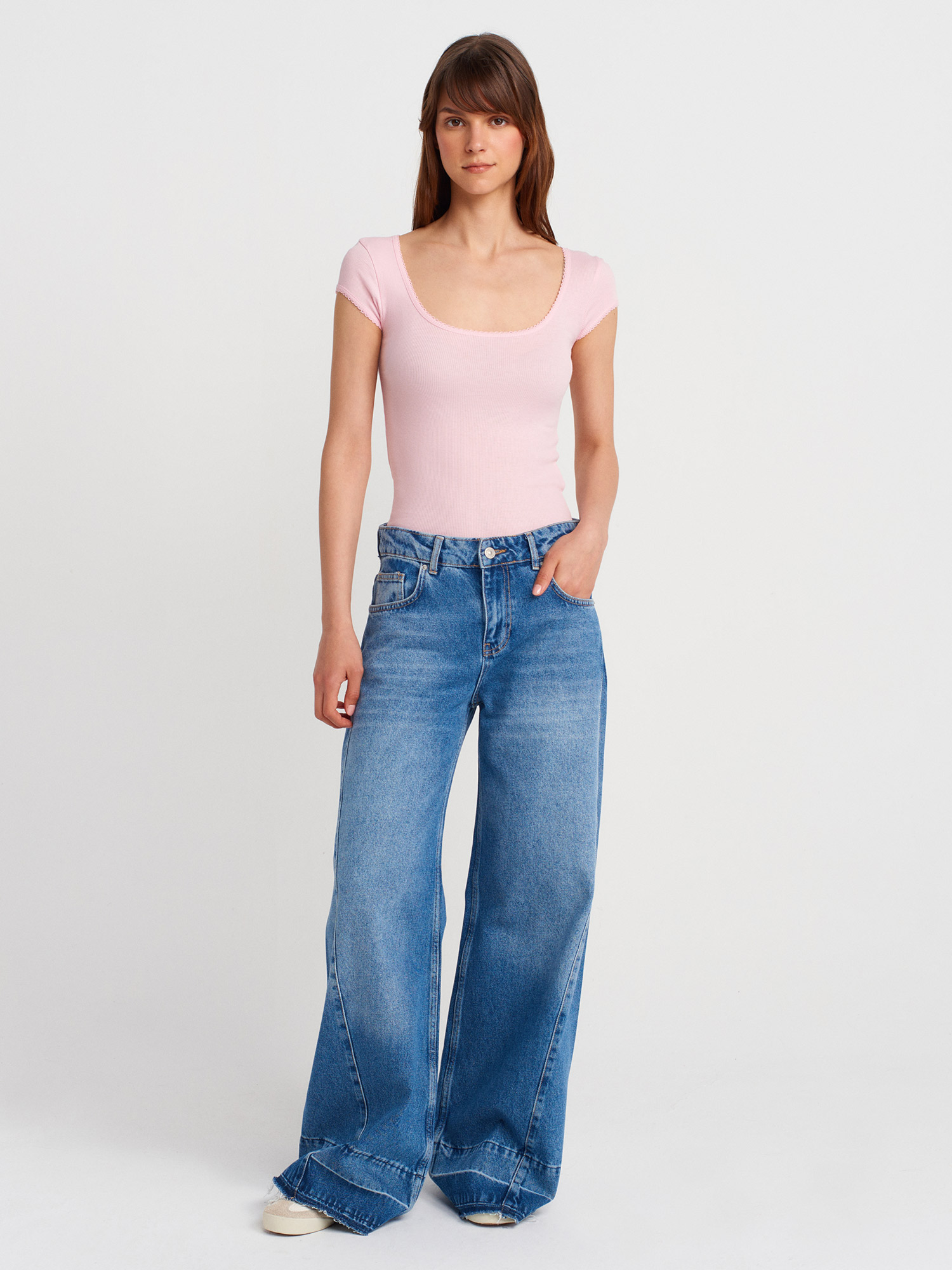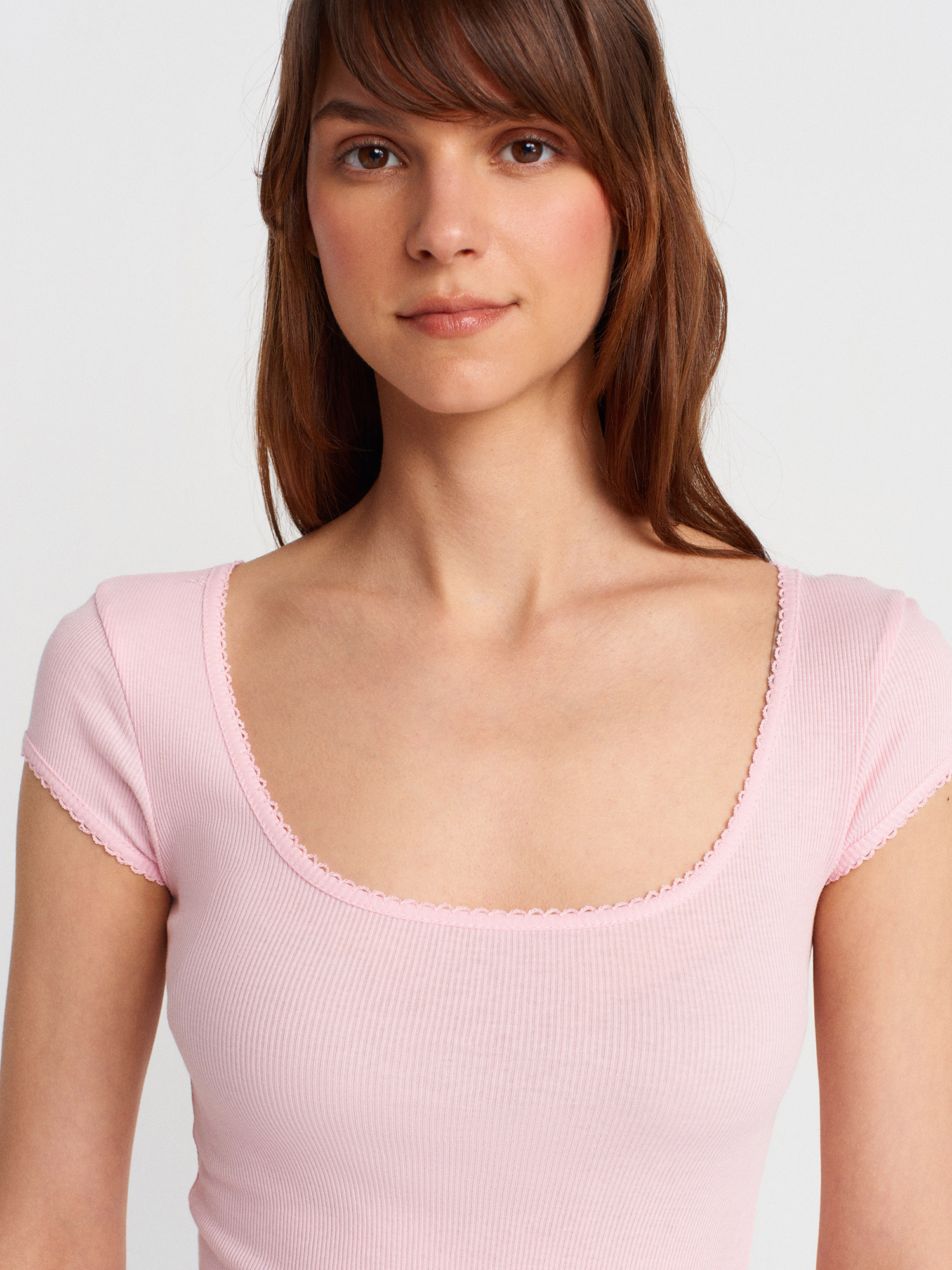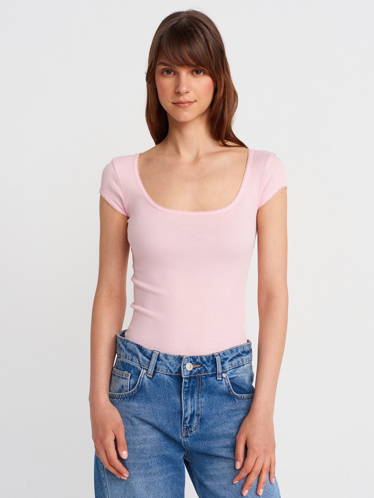 31807 Bisiklet Yaka Fitilli T-shirt-Toz Pembe