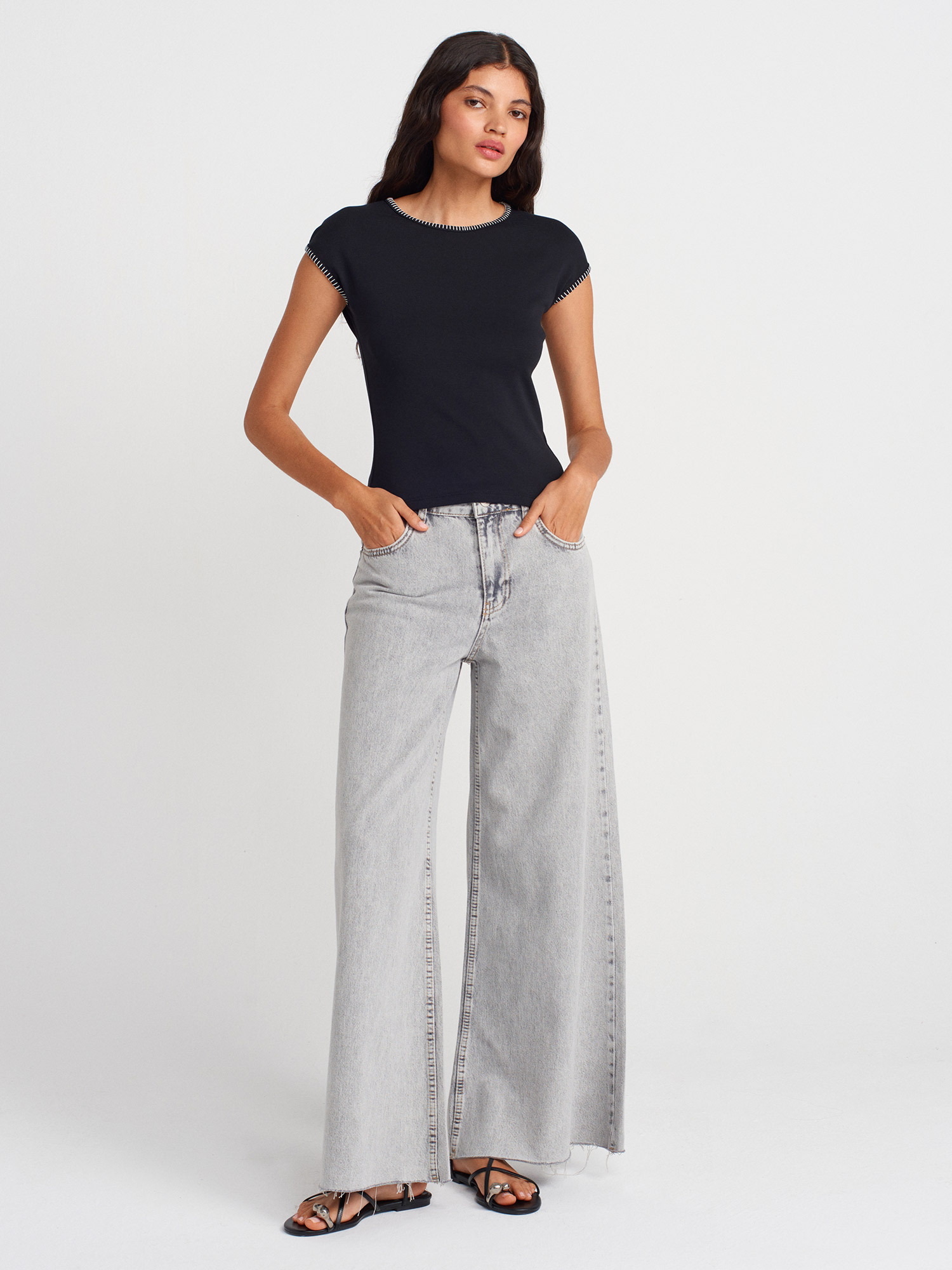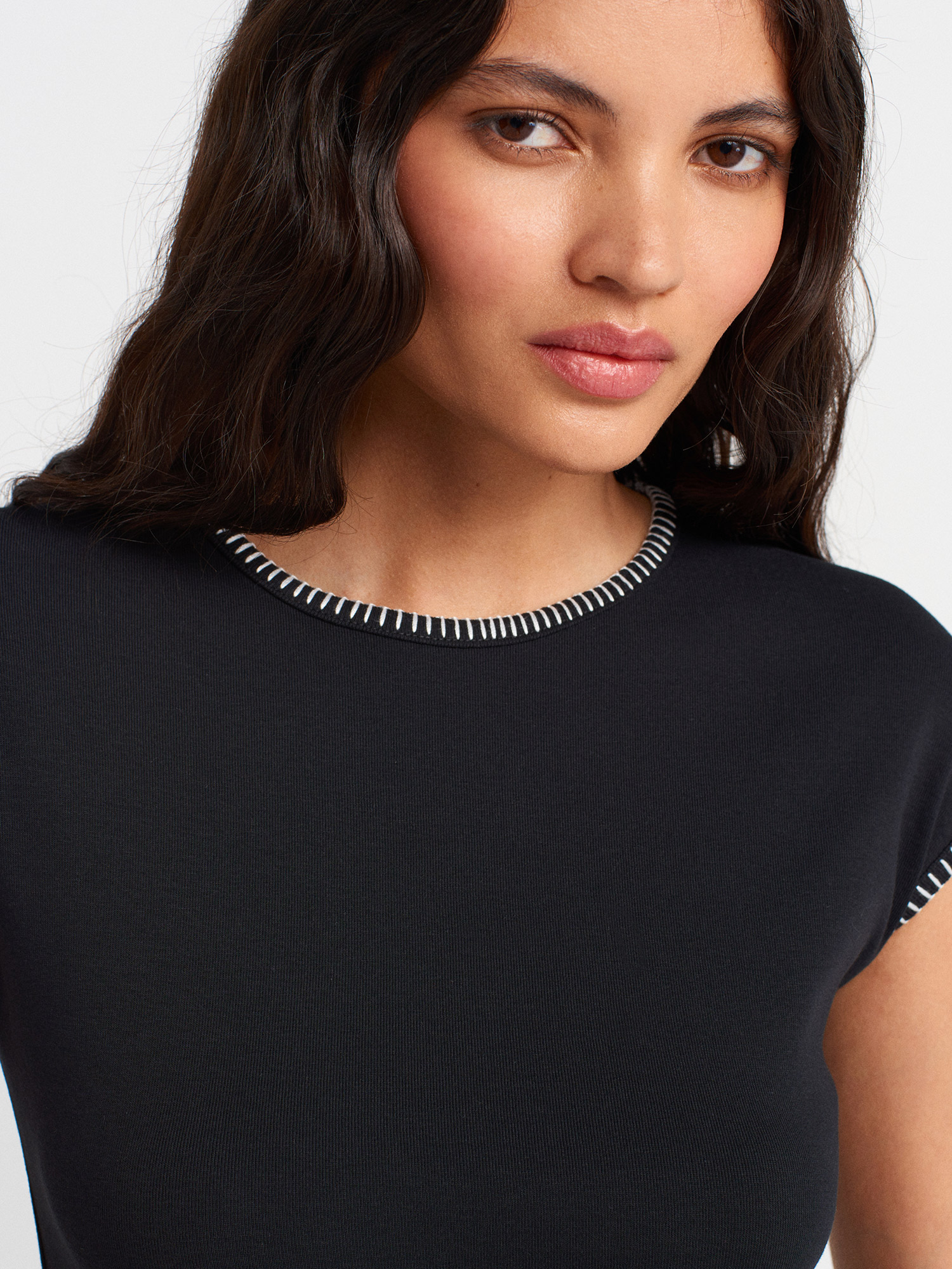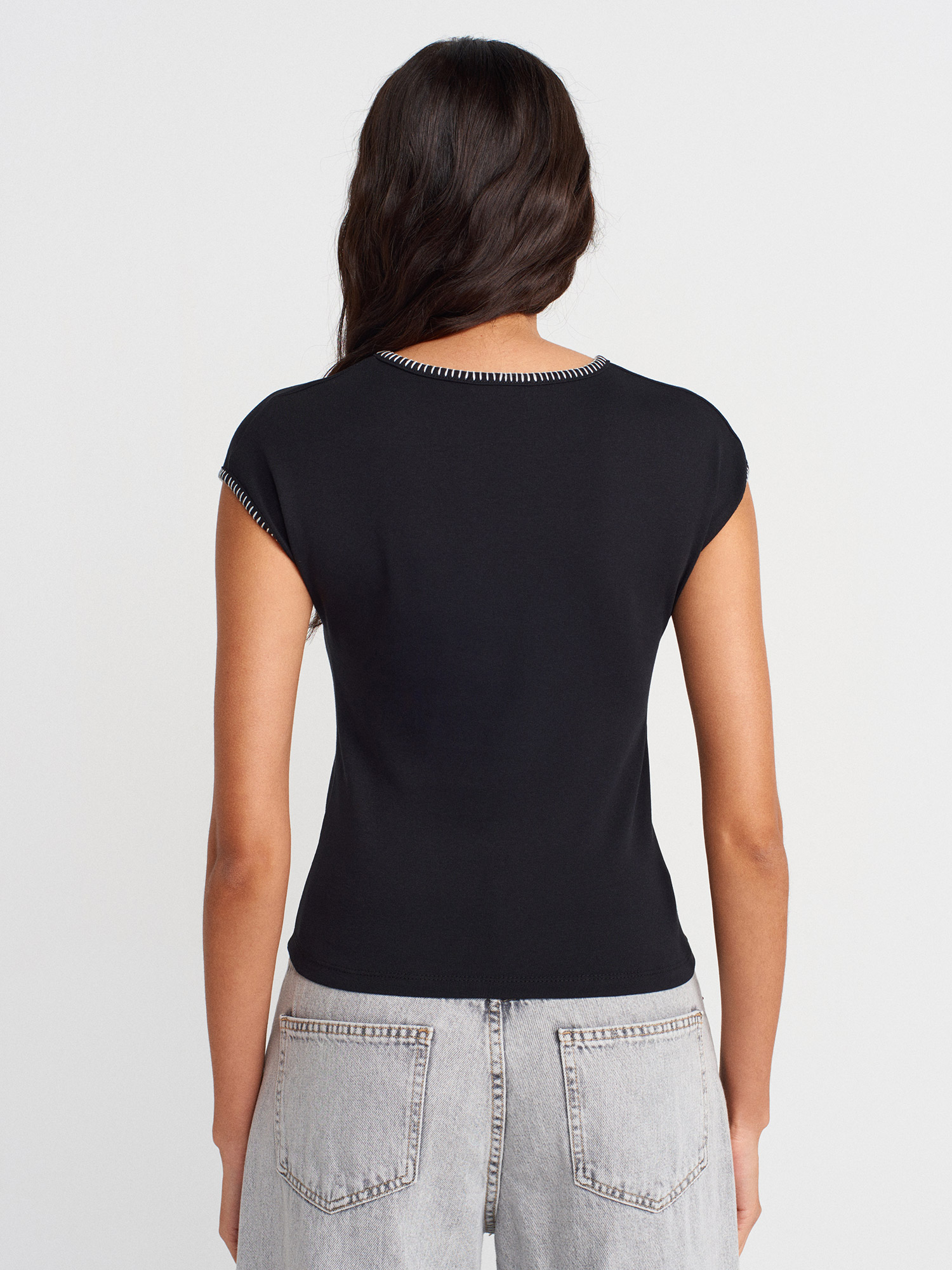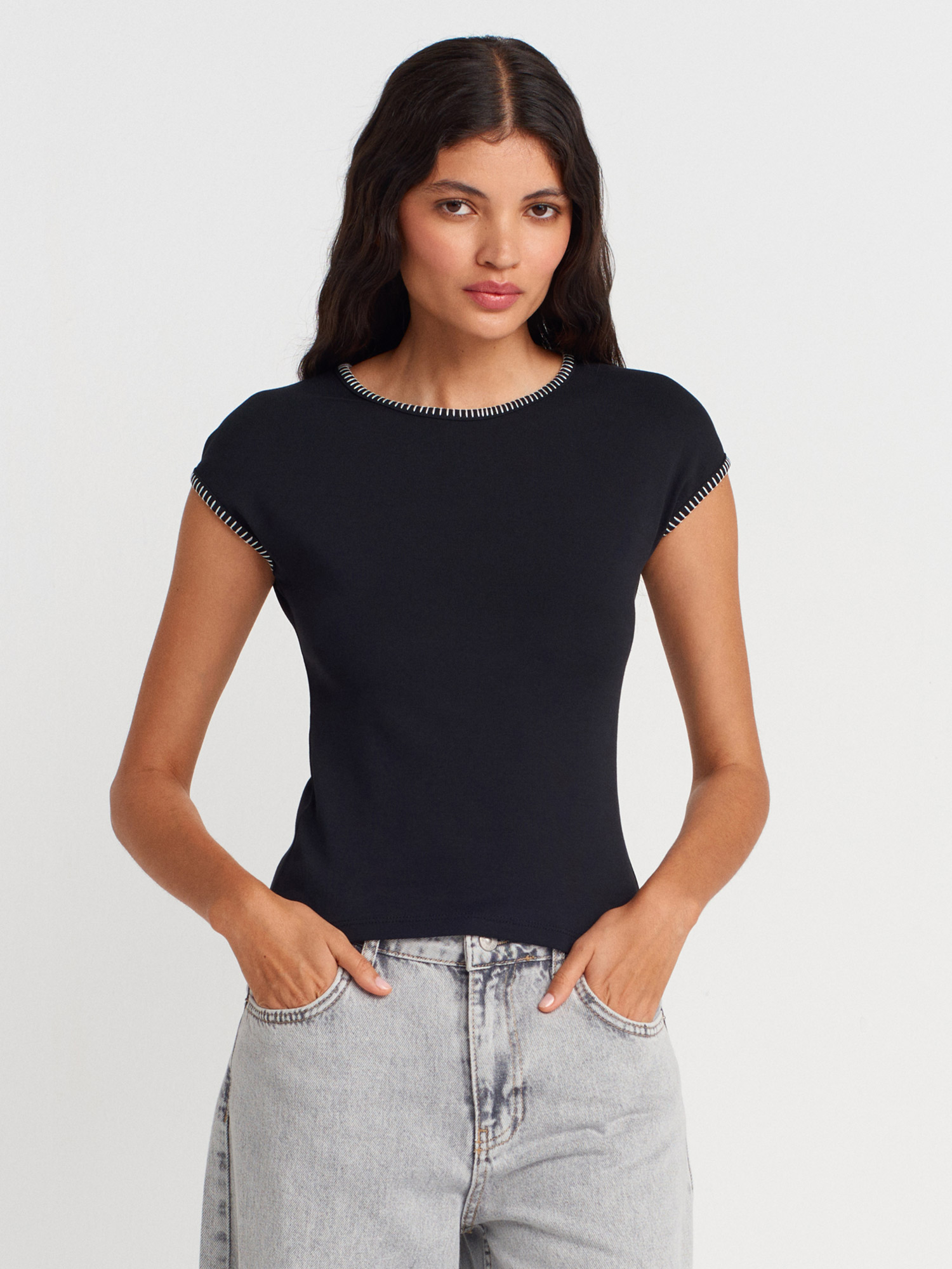 31814 Kontrast Dikiş Detaylı T-Shirt-Siyah