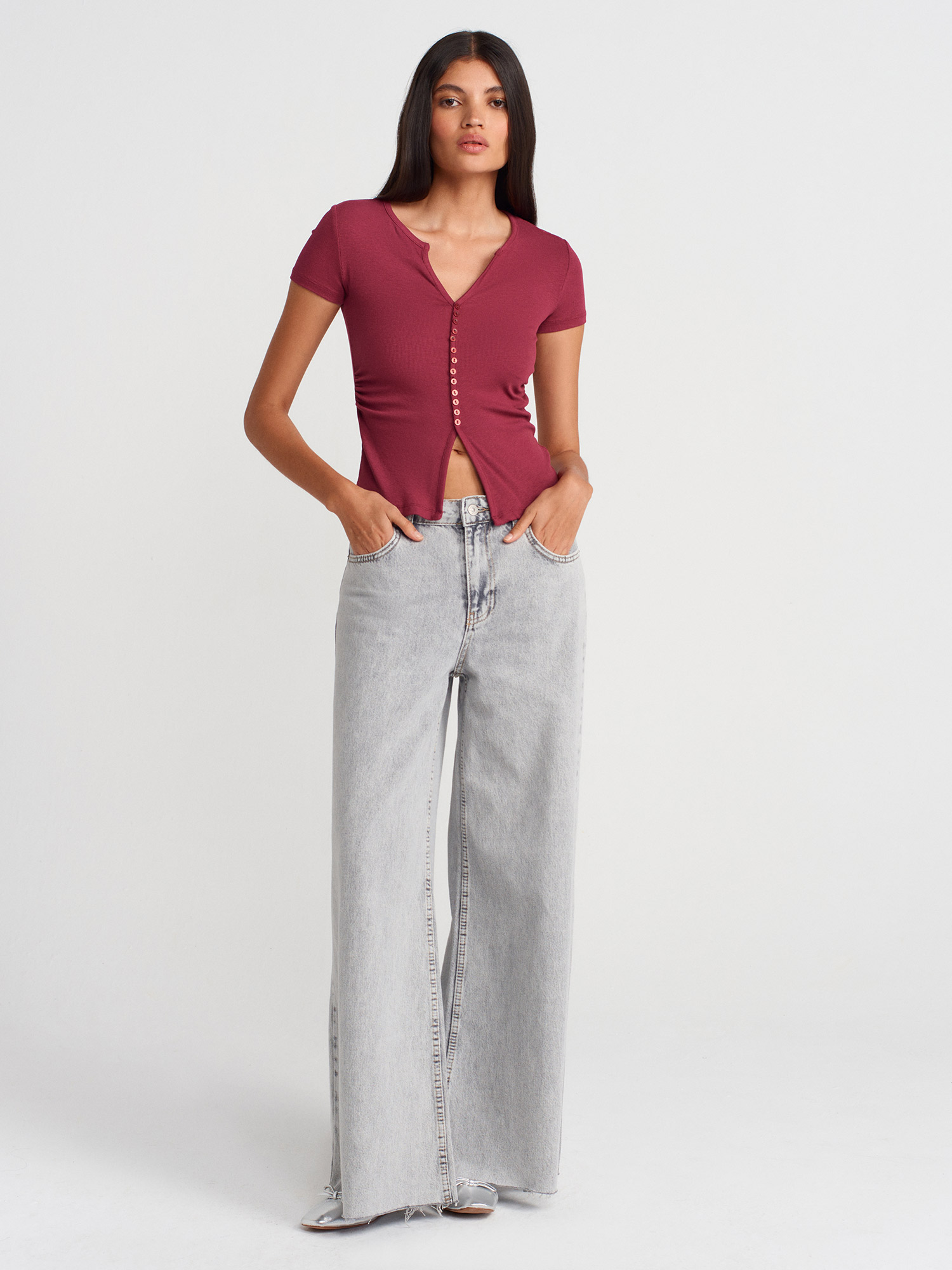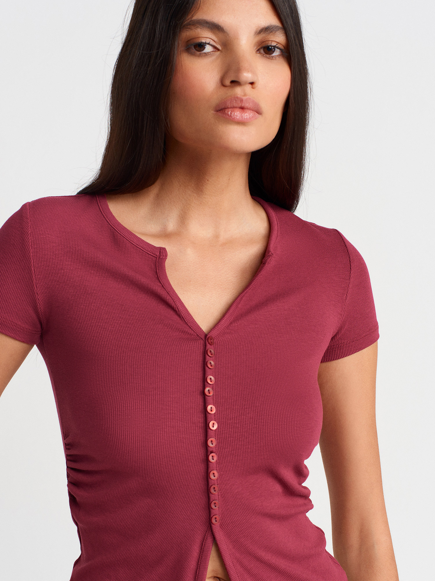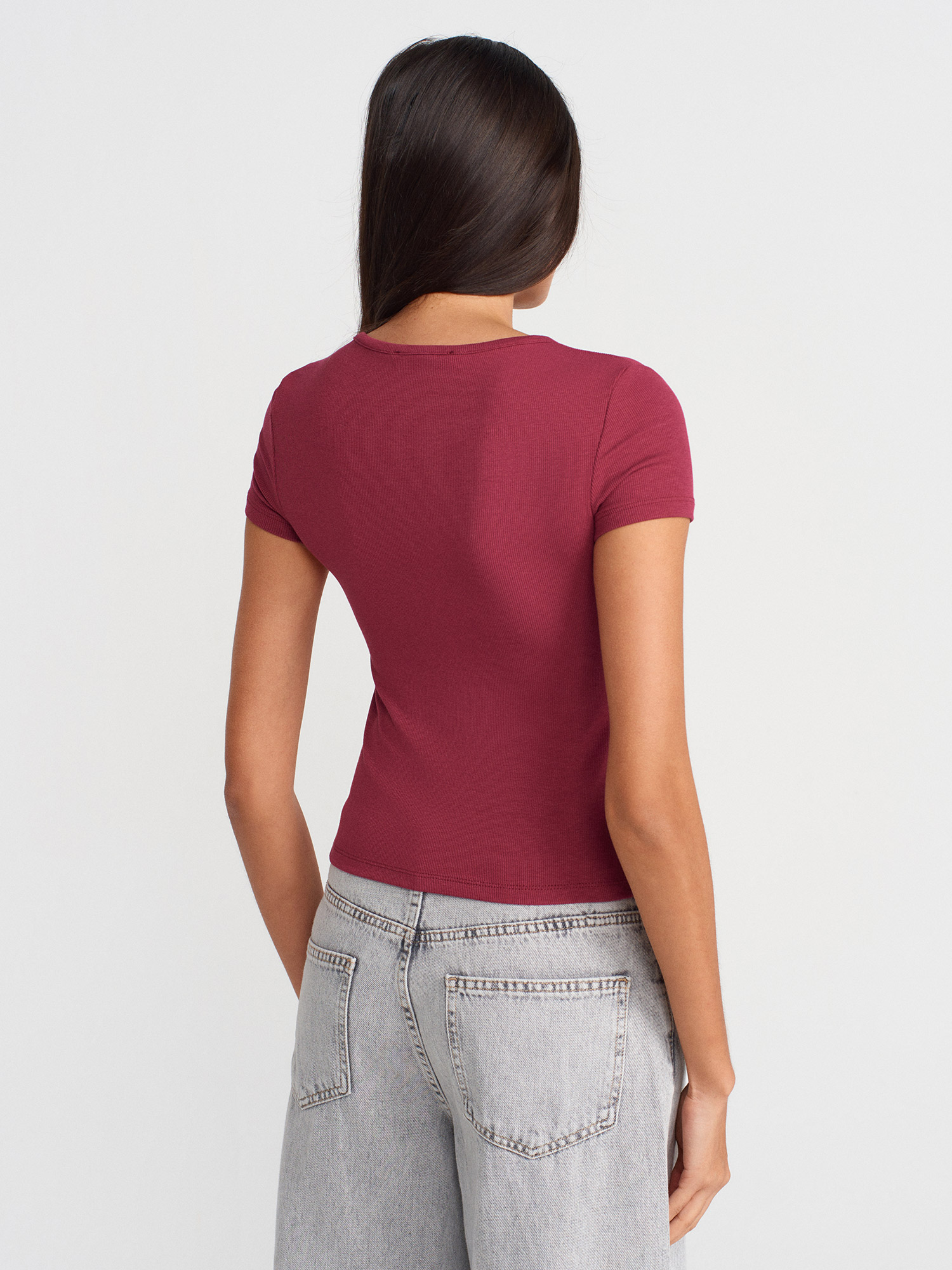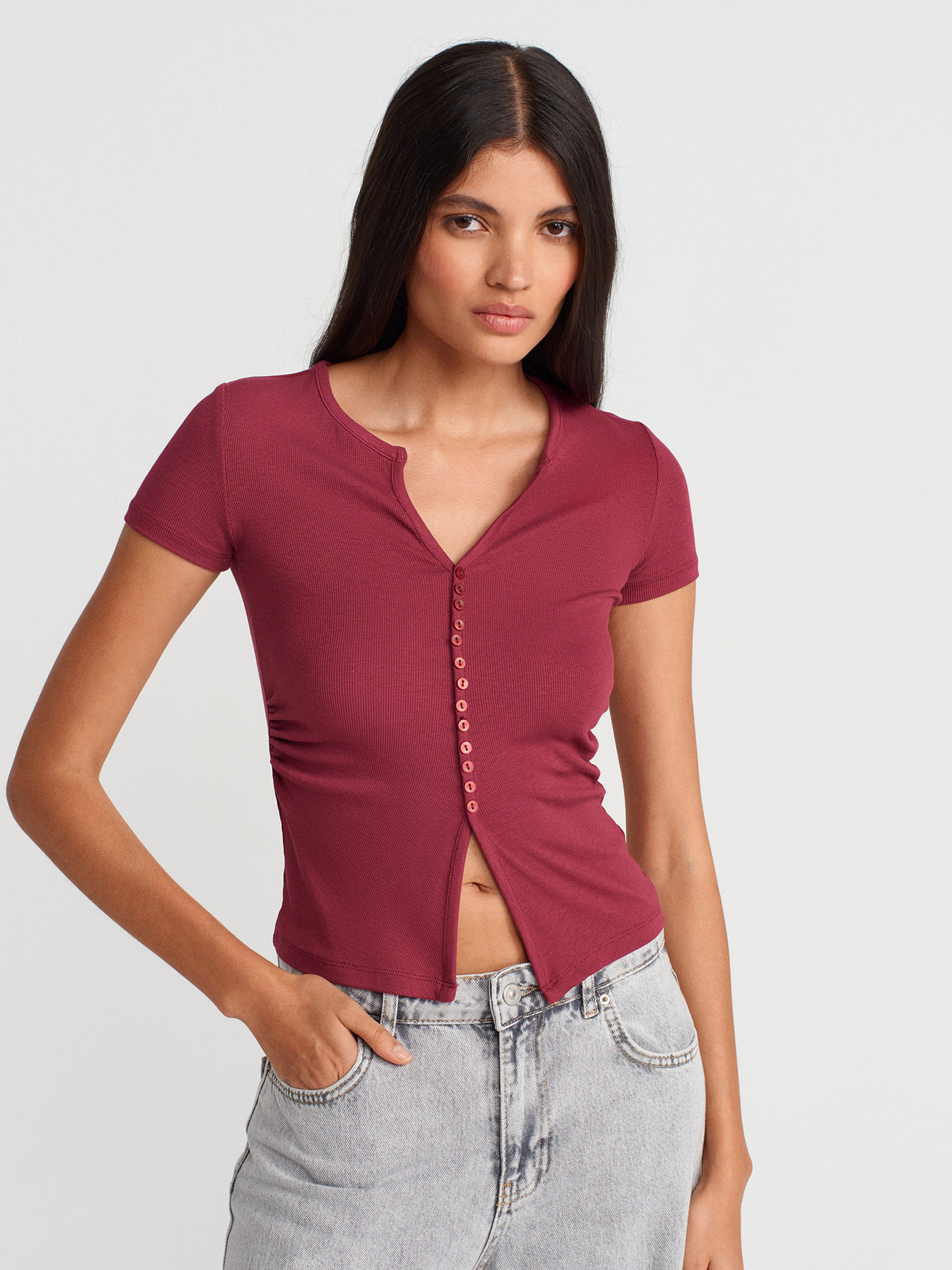 31838 Düğmeli Kısa Kollu Top-Açık Bordo