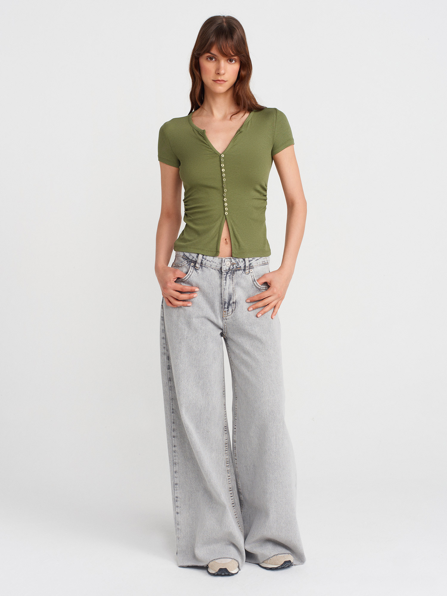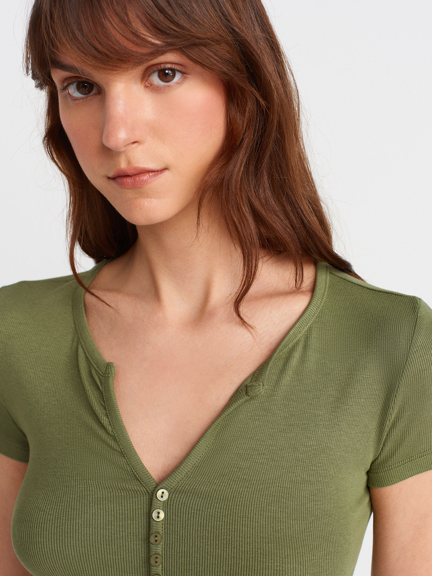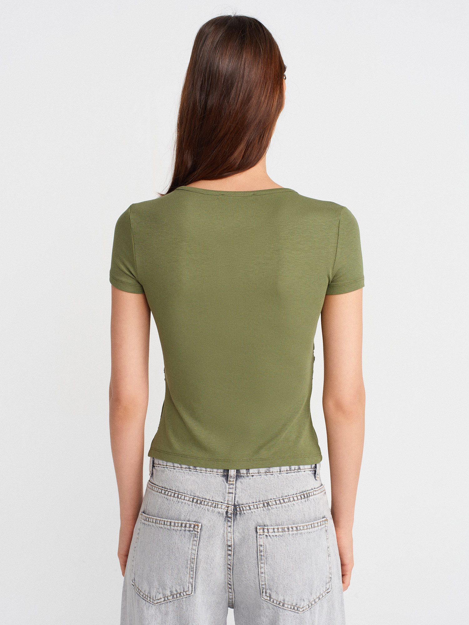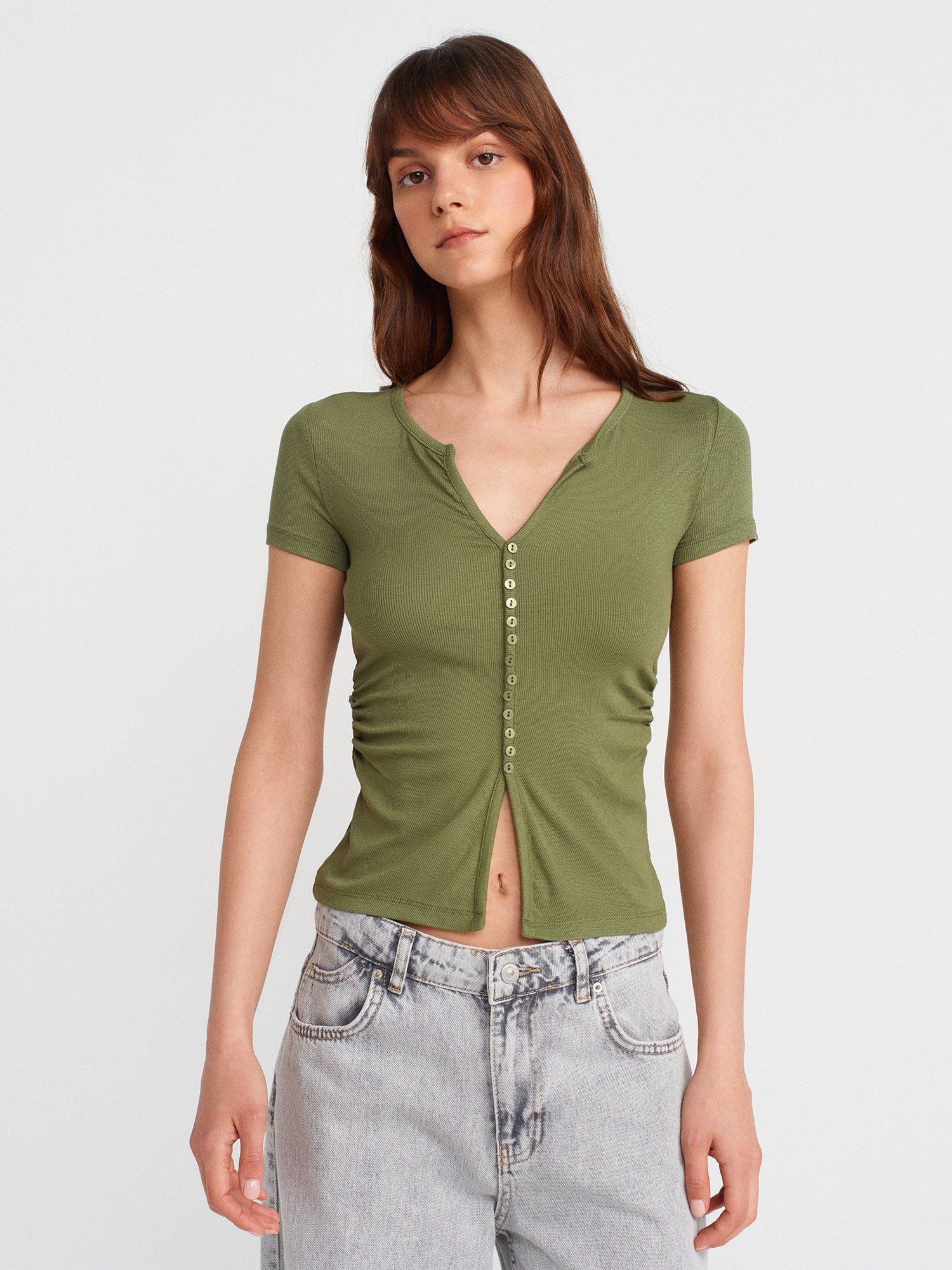31838 Düğmeli Kısa Kollu Top-Açık Haki