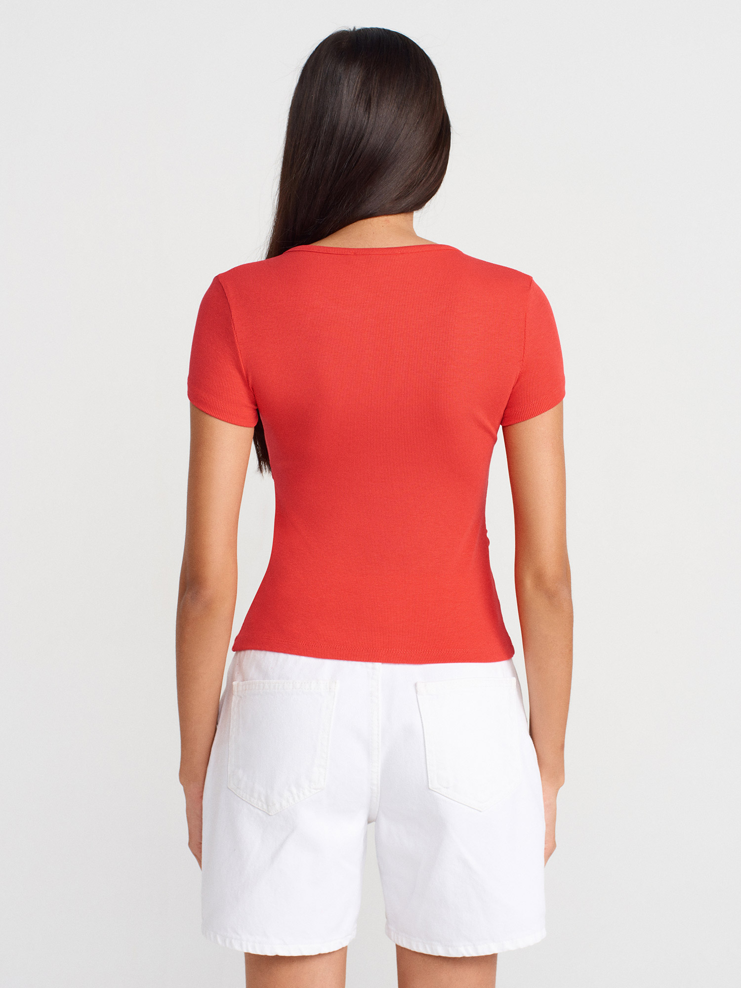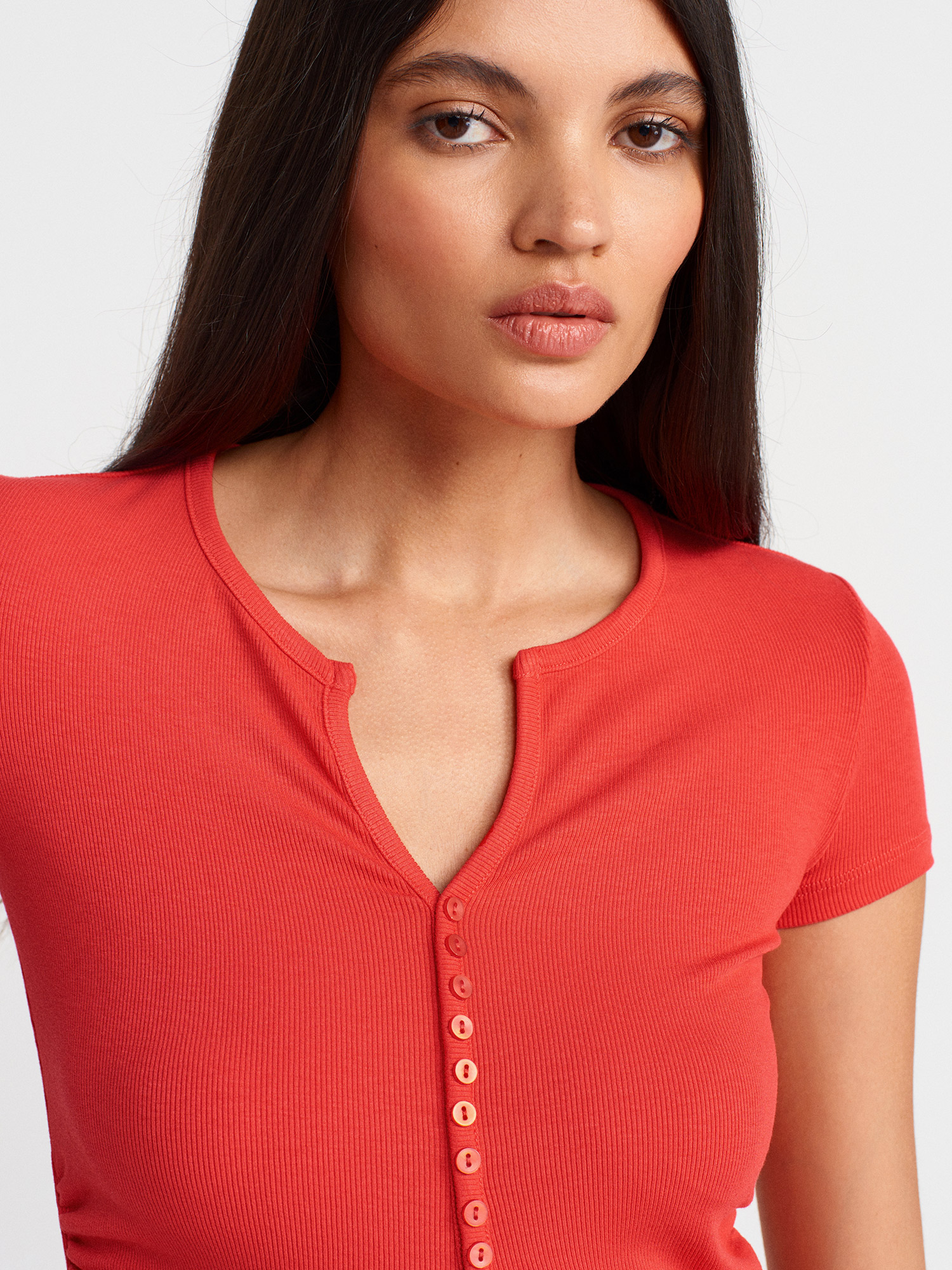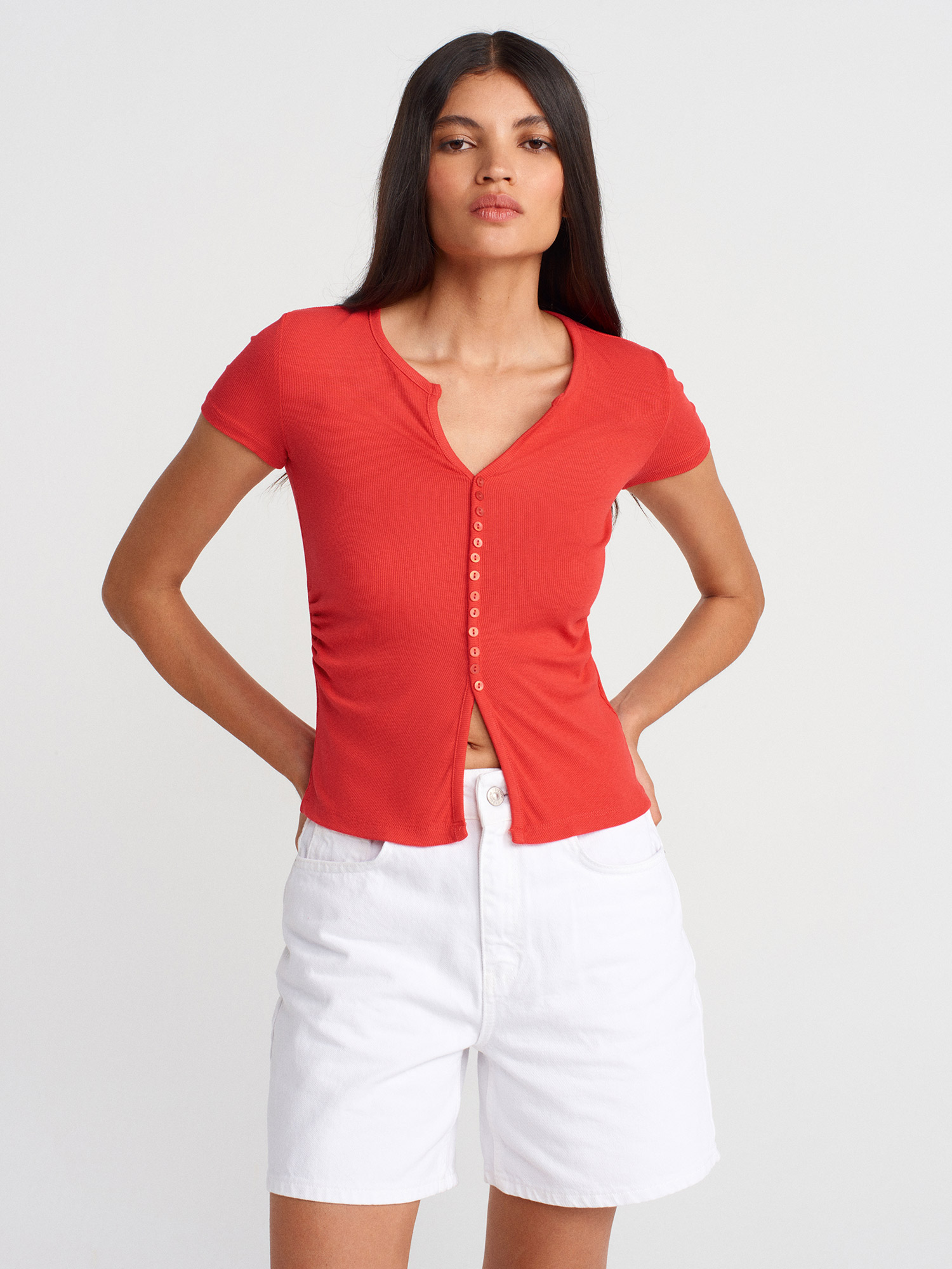 31838 Düğmeli Kısa Kollu Top-Kırmızı