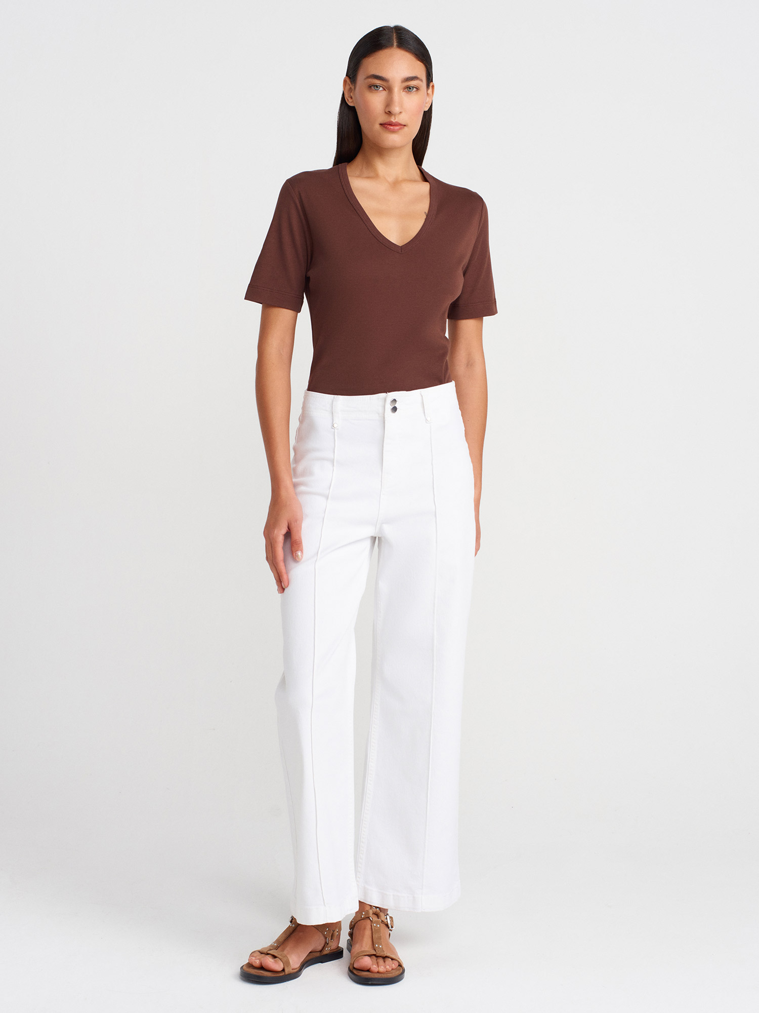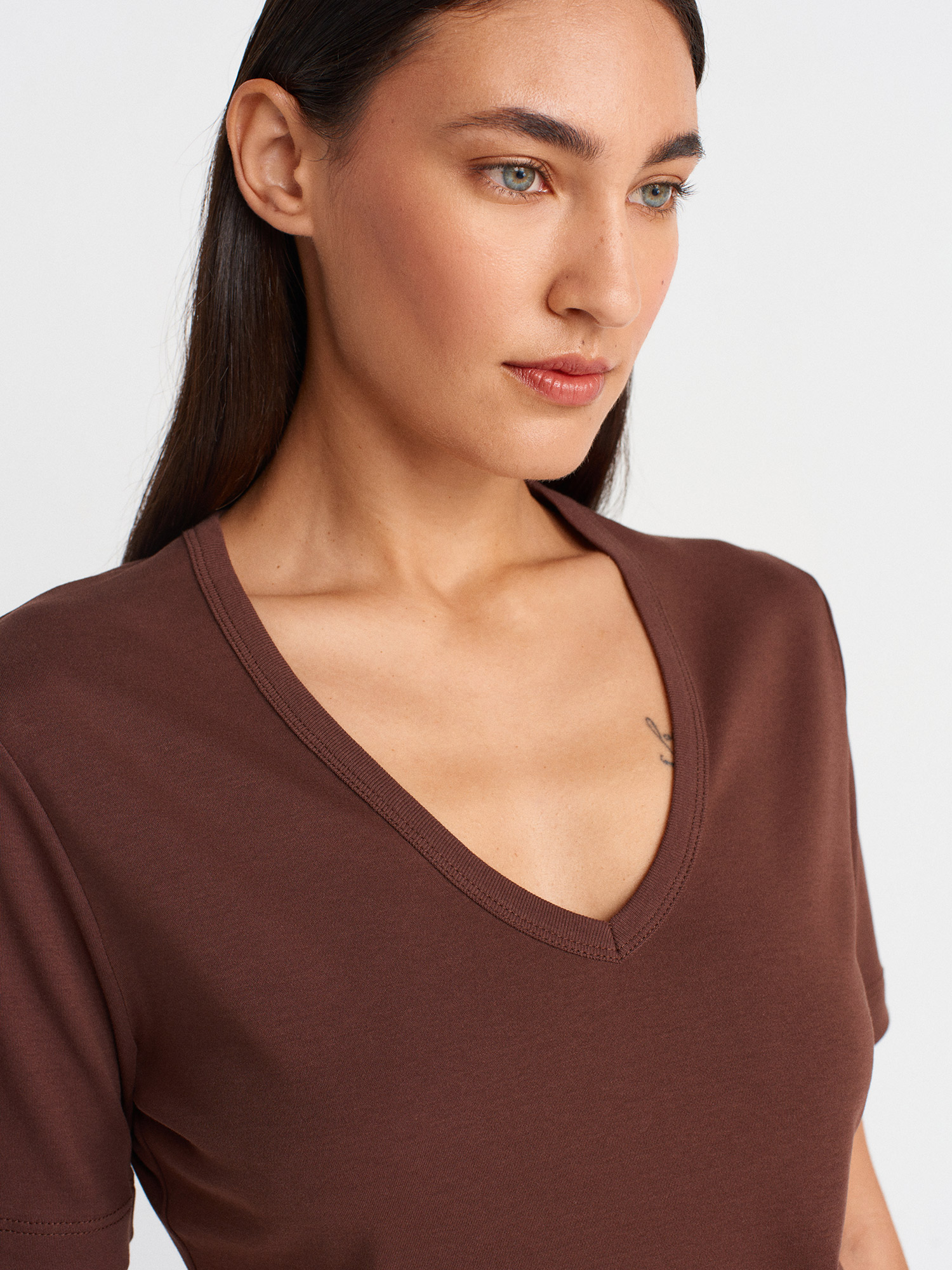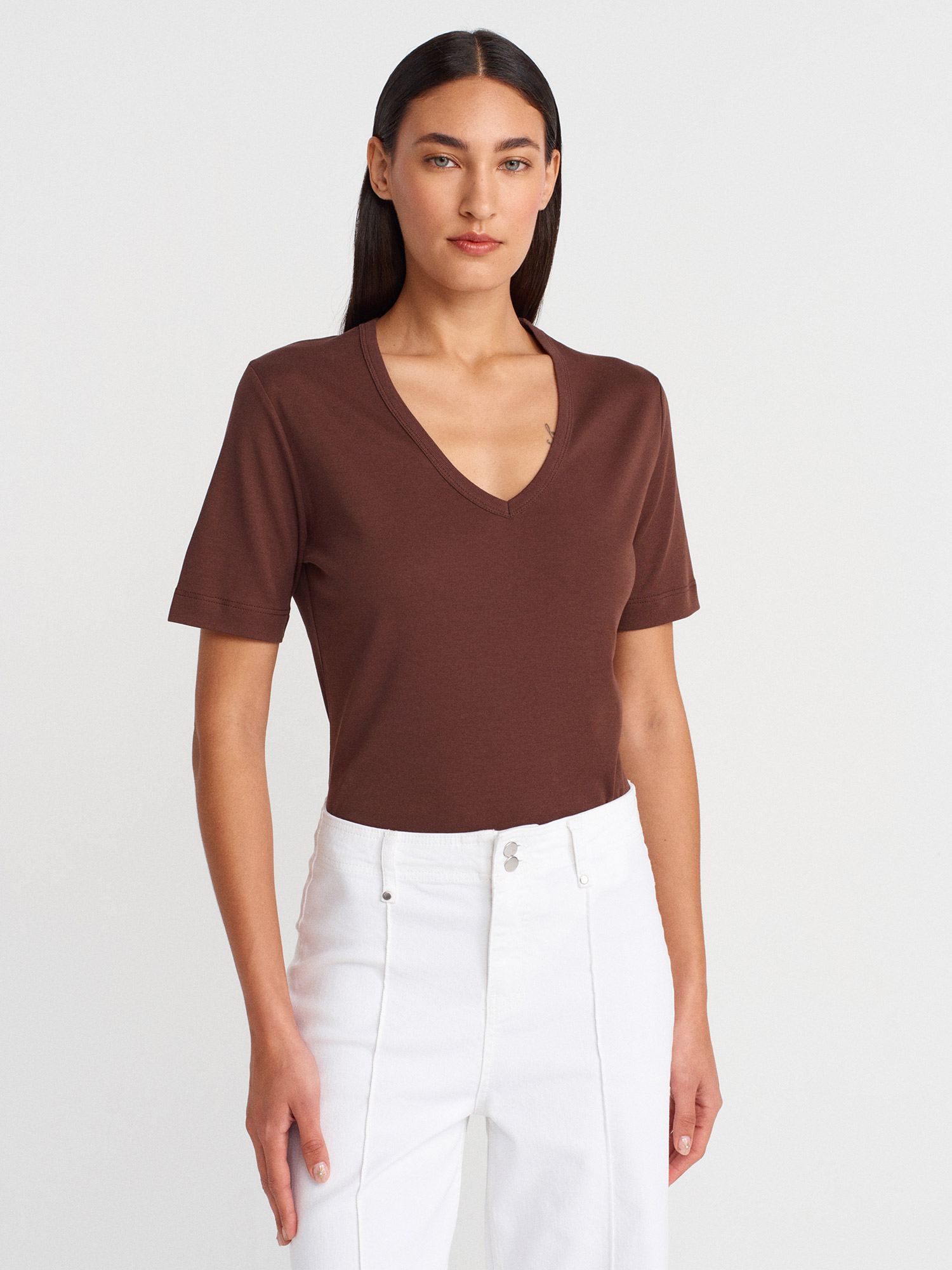 31840 V Yaka Kısa Kollu T-shirt-Açık Kahve