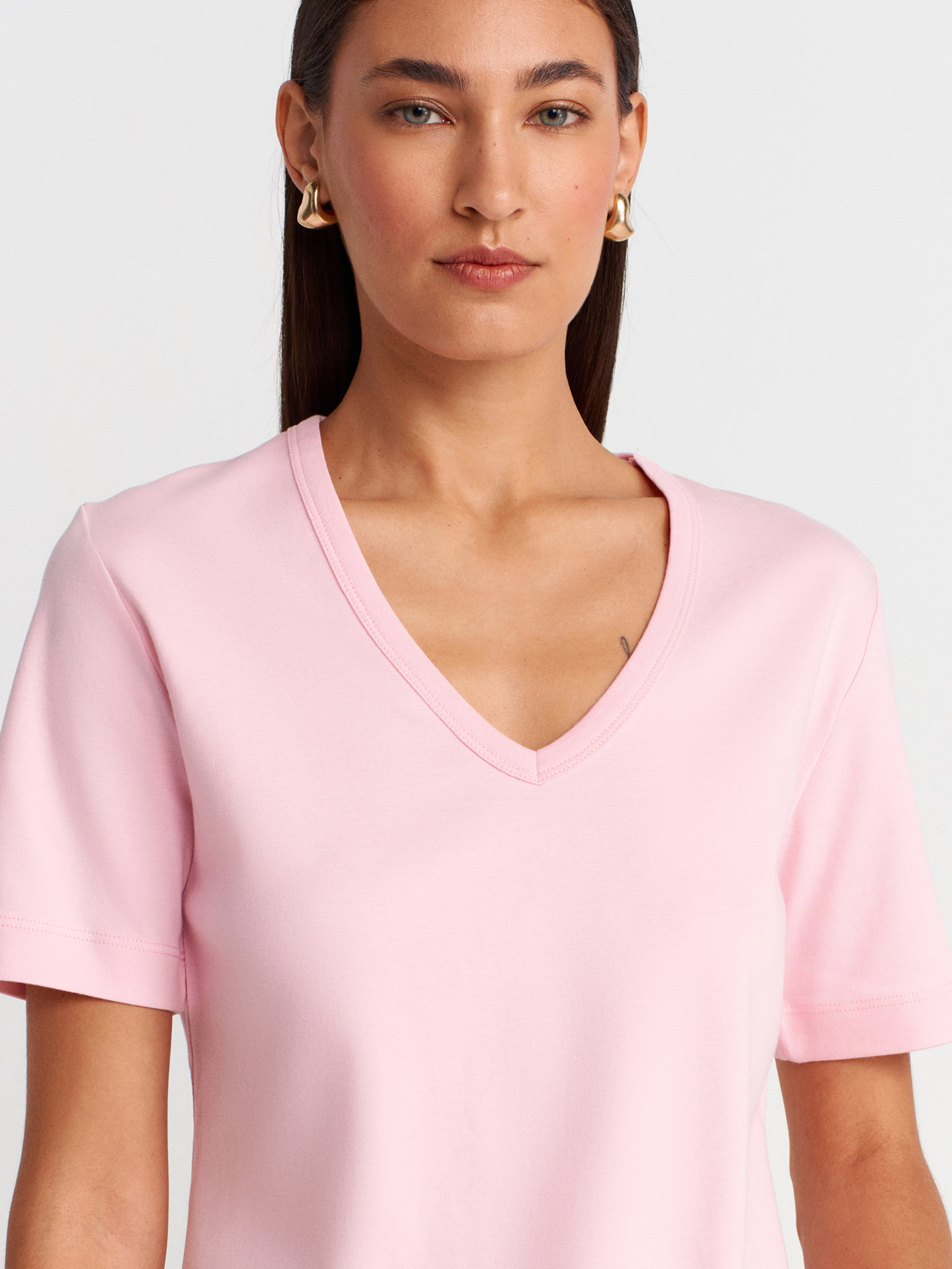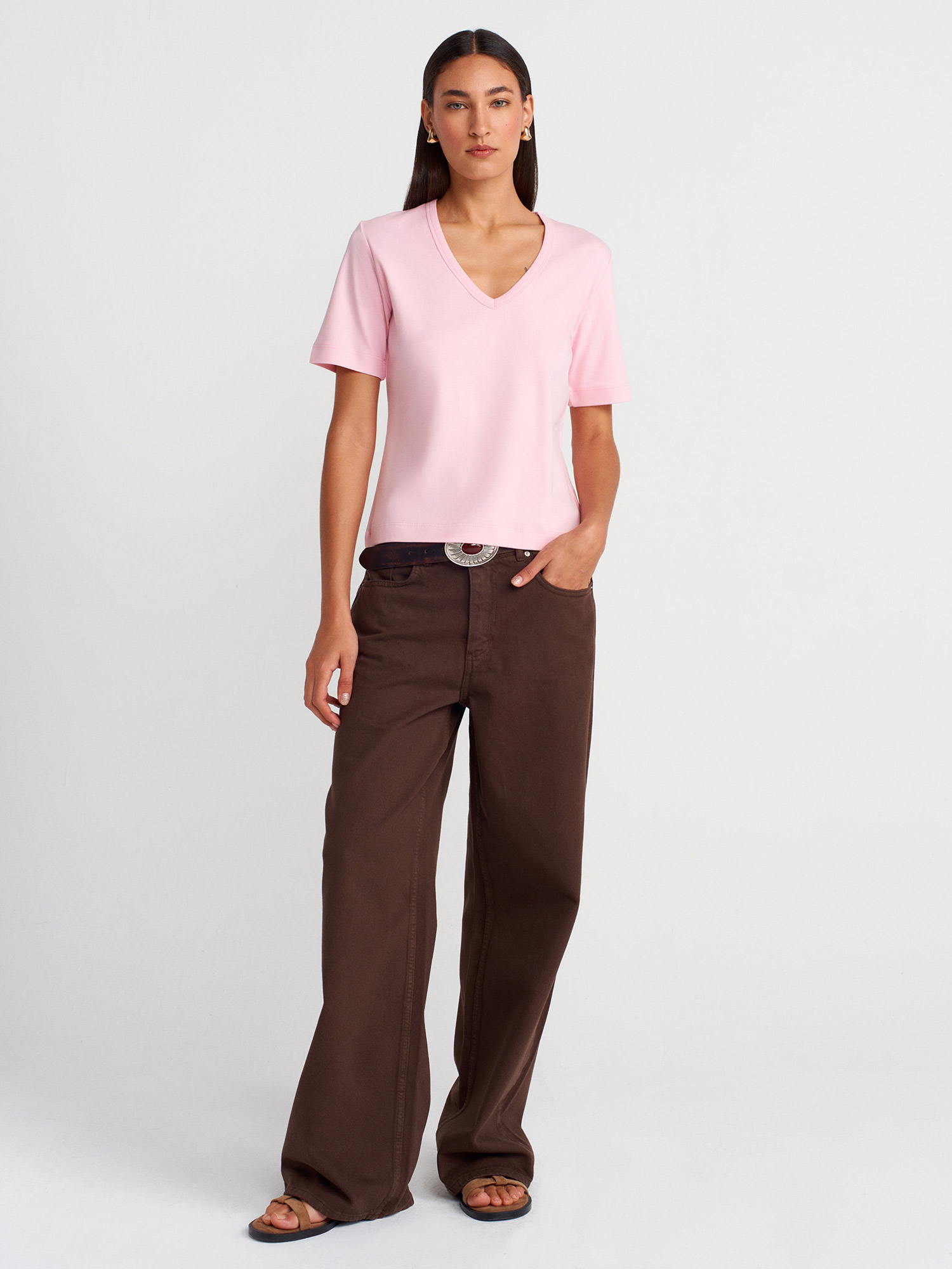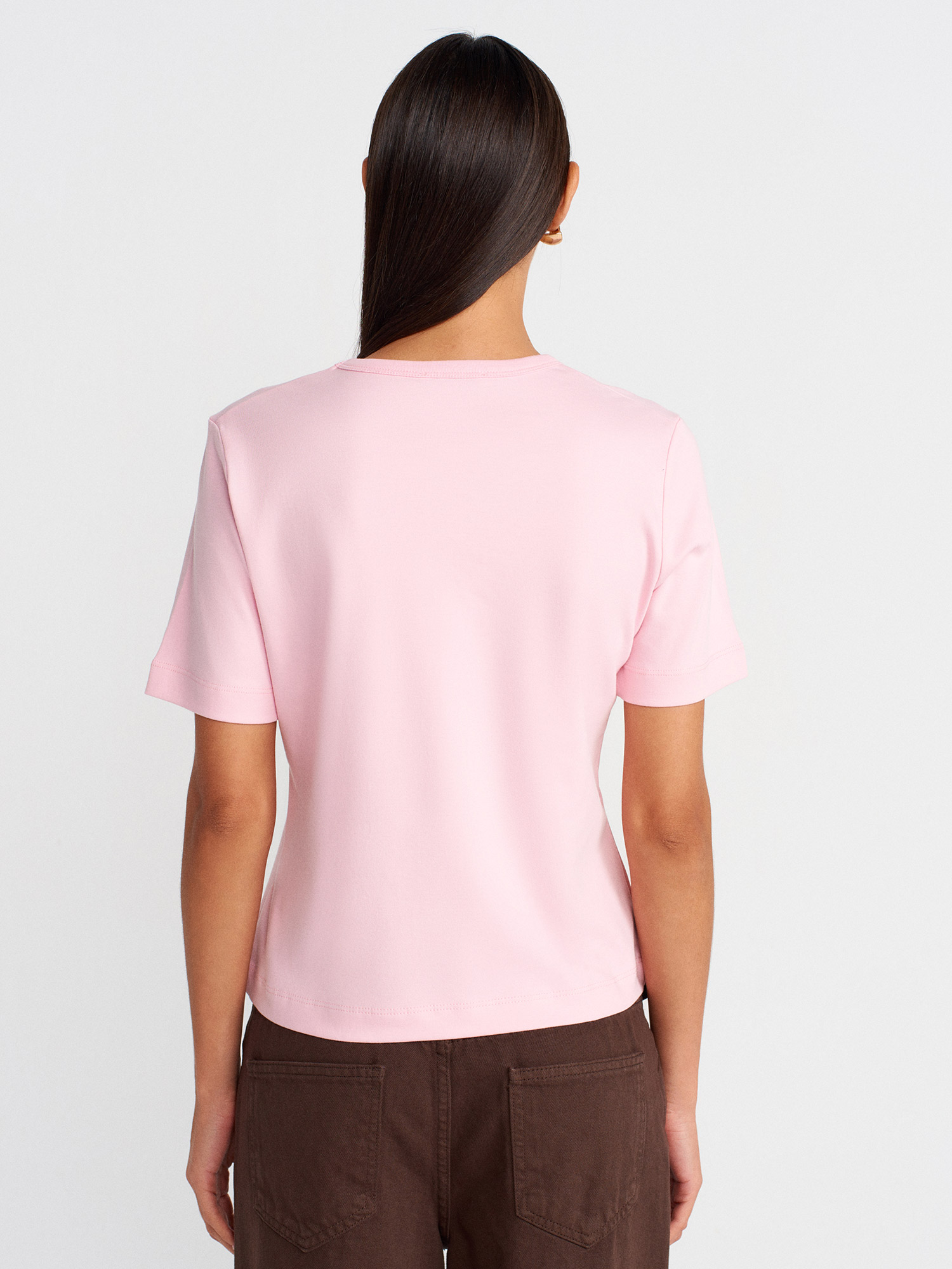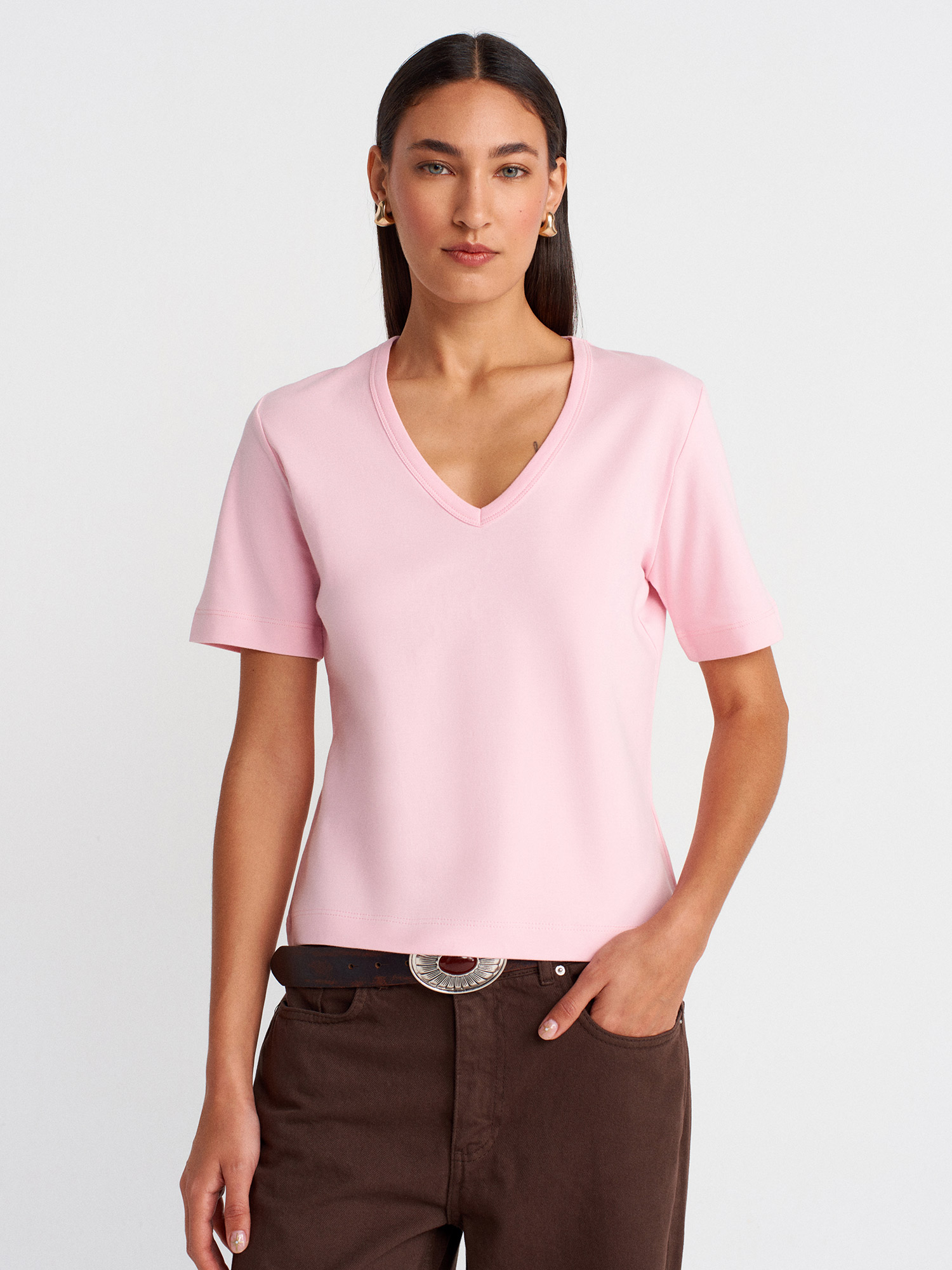 31840 V Yaka Kısa Kollu T-shirt-Toz Pembe