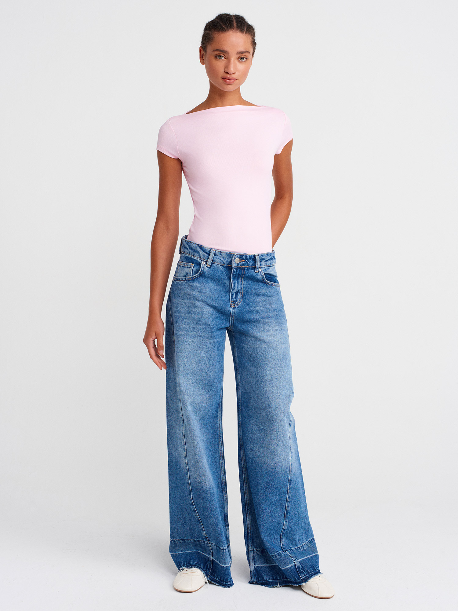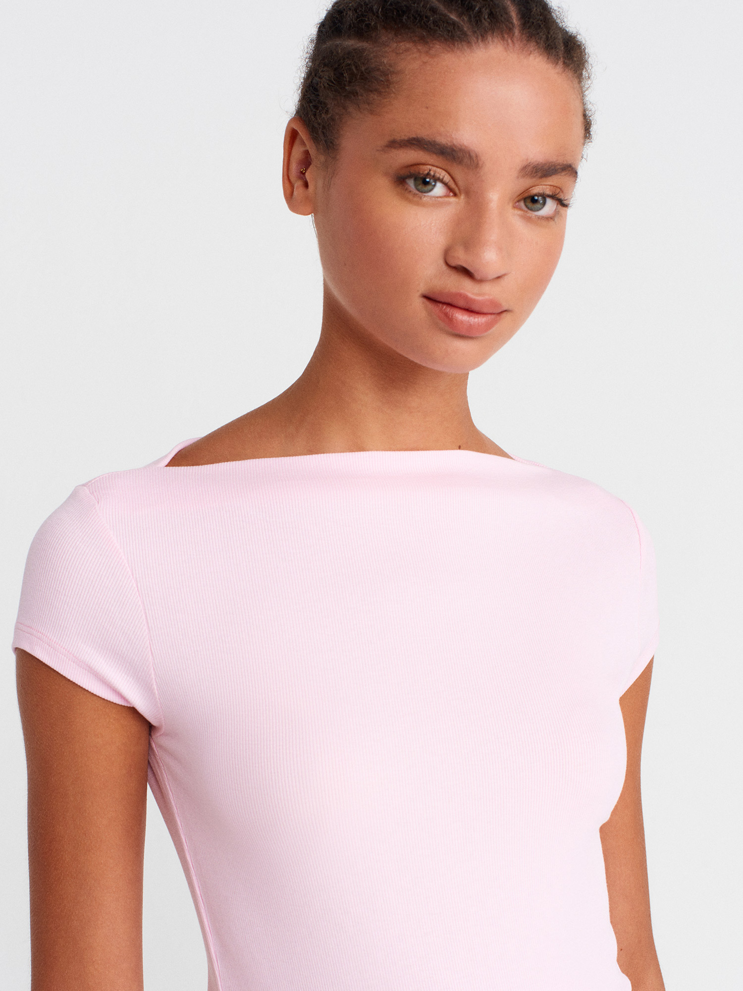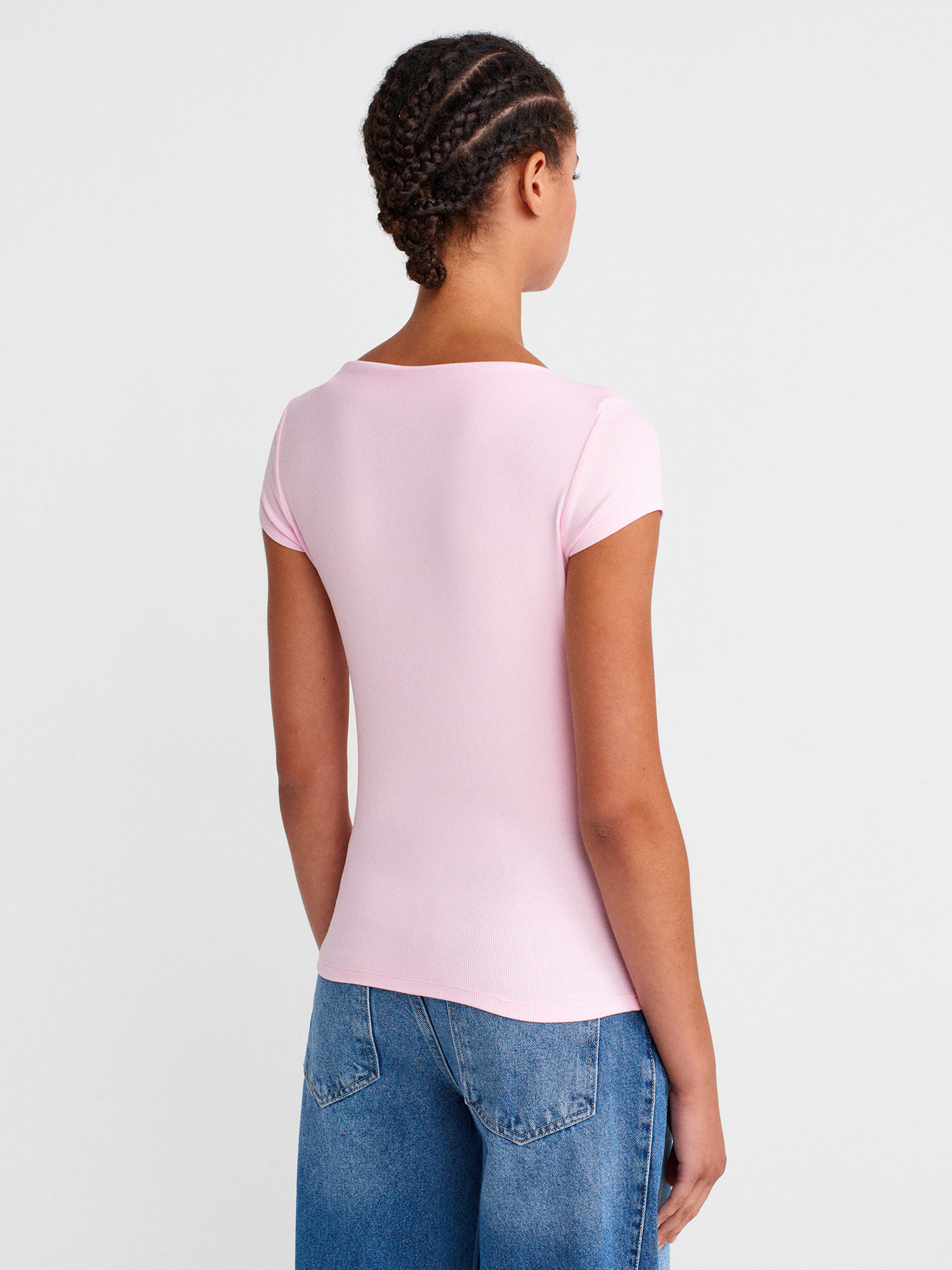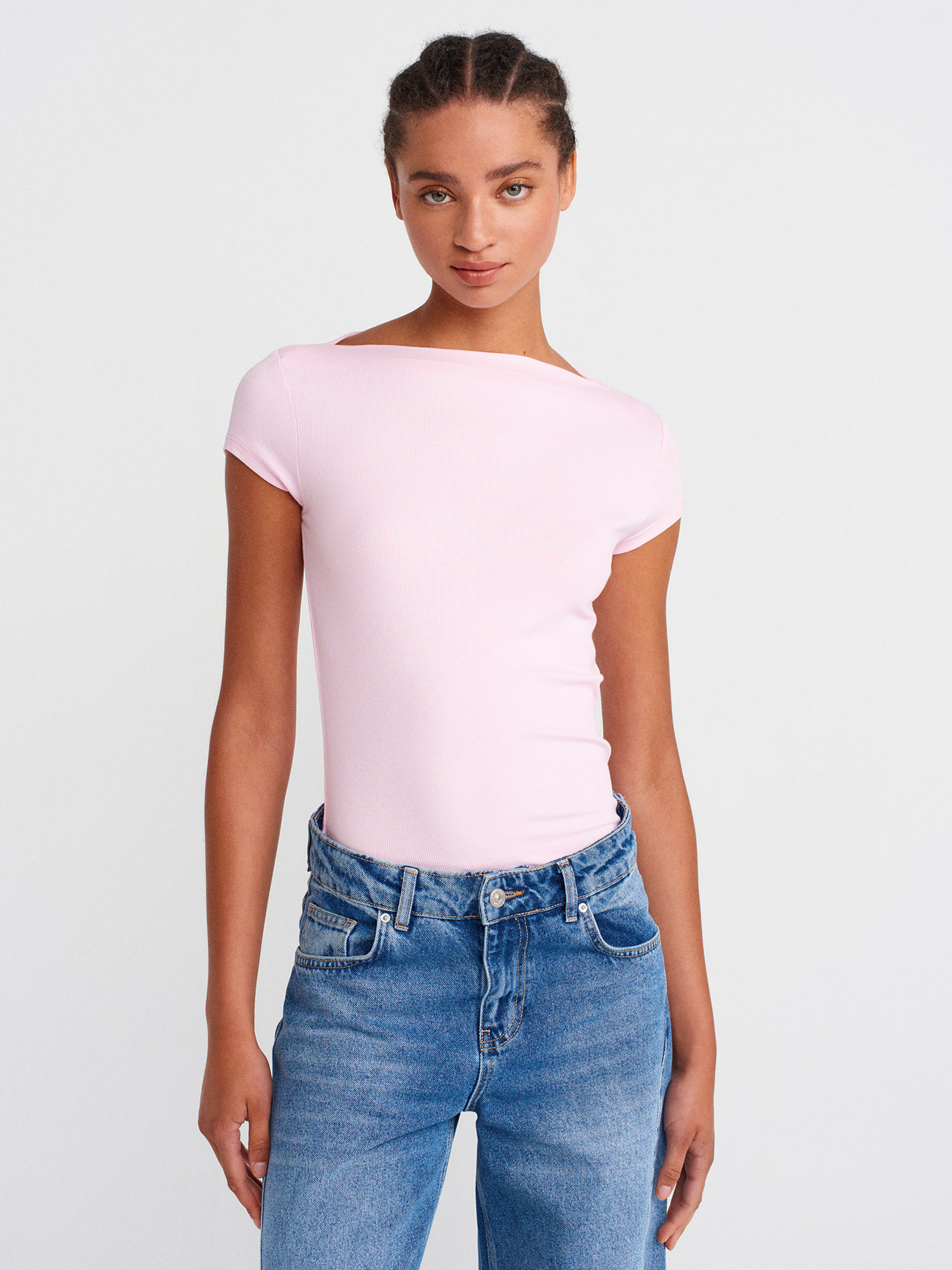 31855 Kayık Yaka T-Shirt-Açık Pembe