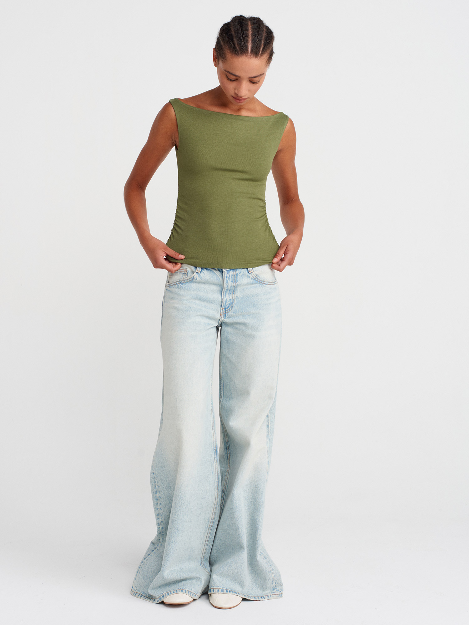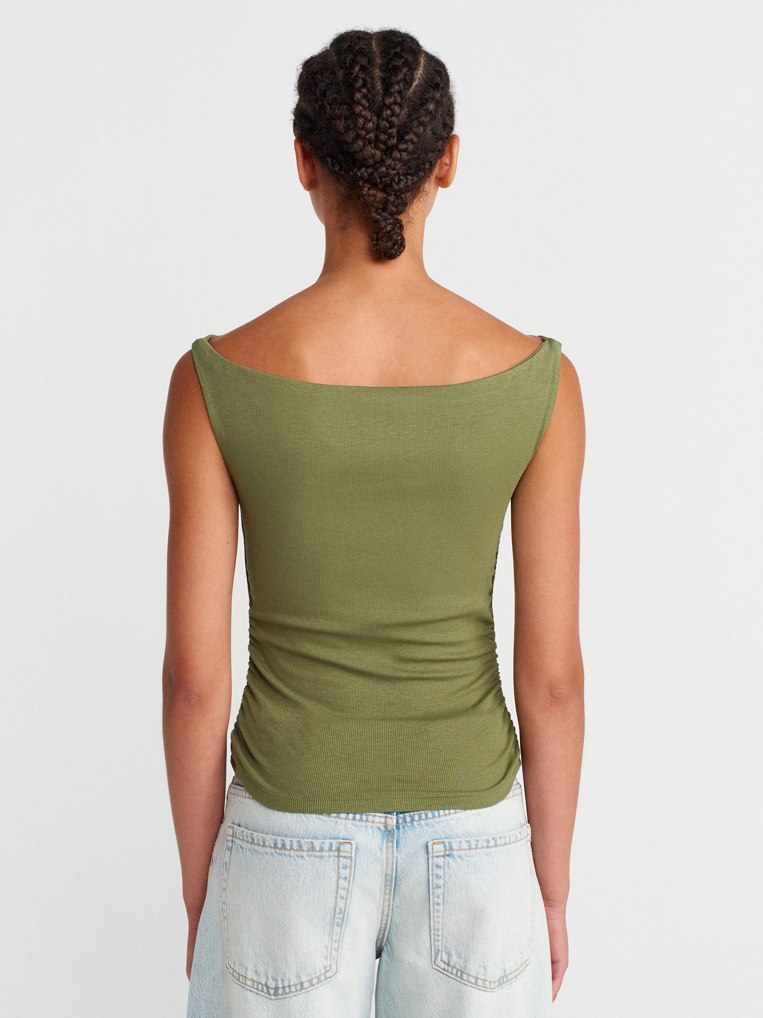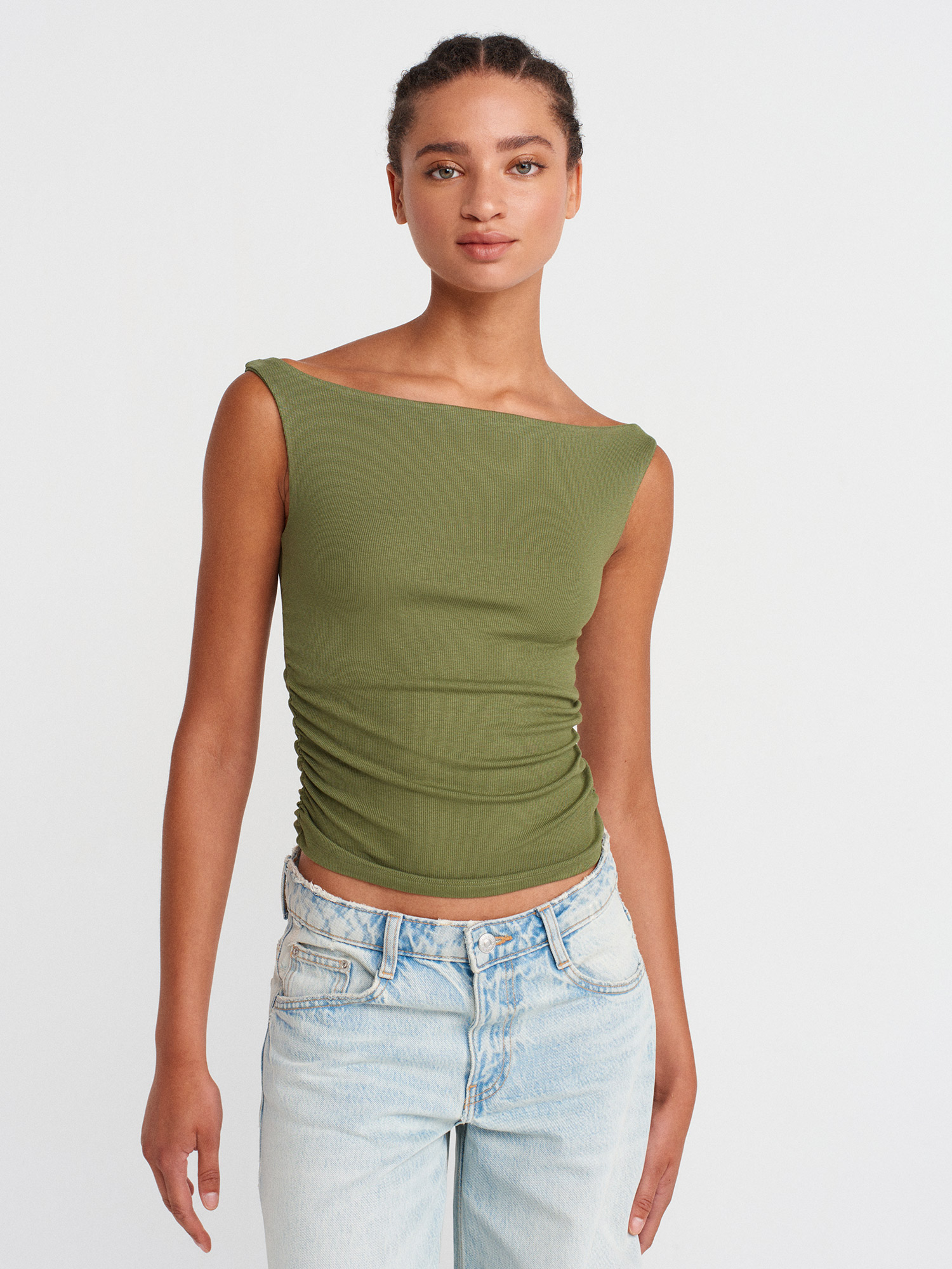 31862 Büzgülü Omuzları Açık Top-Açık Haki