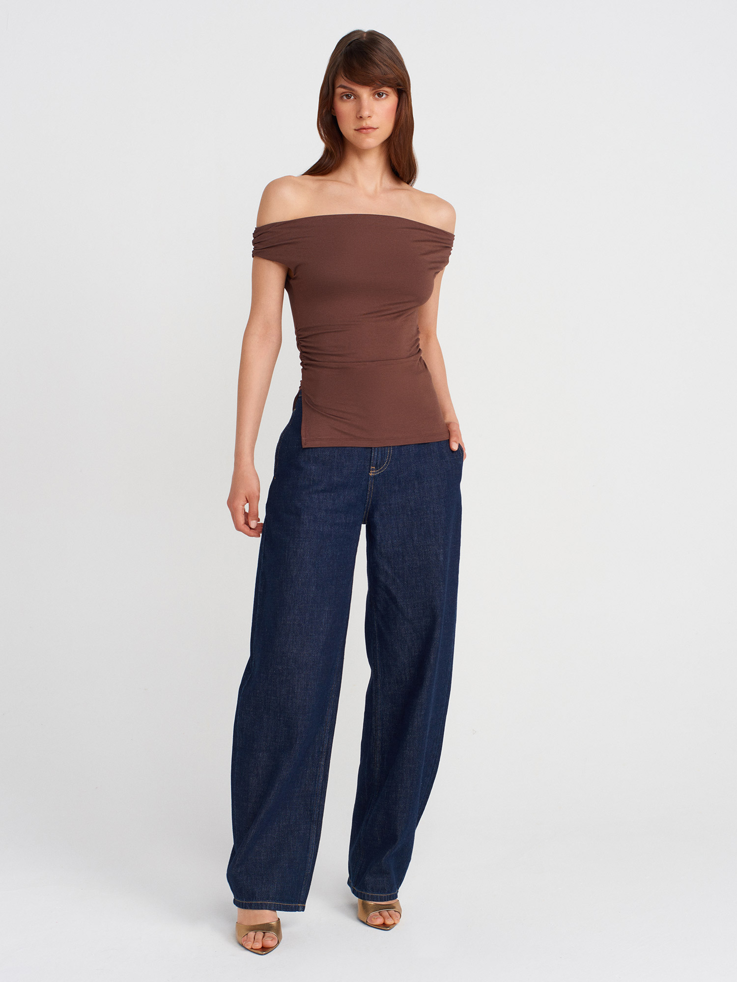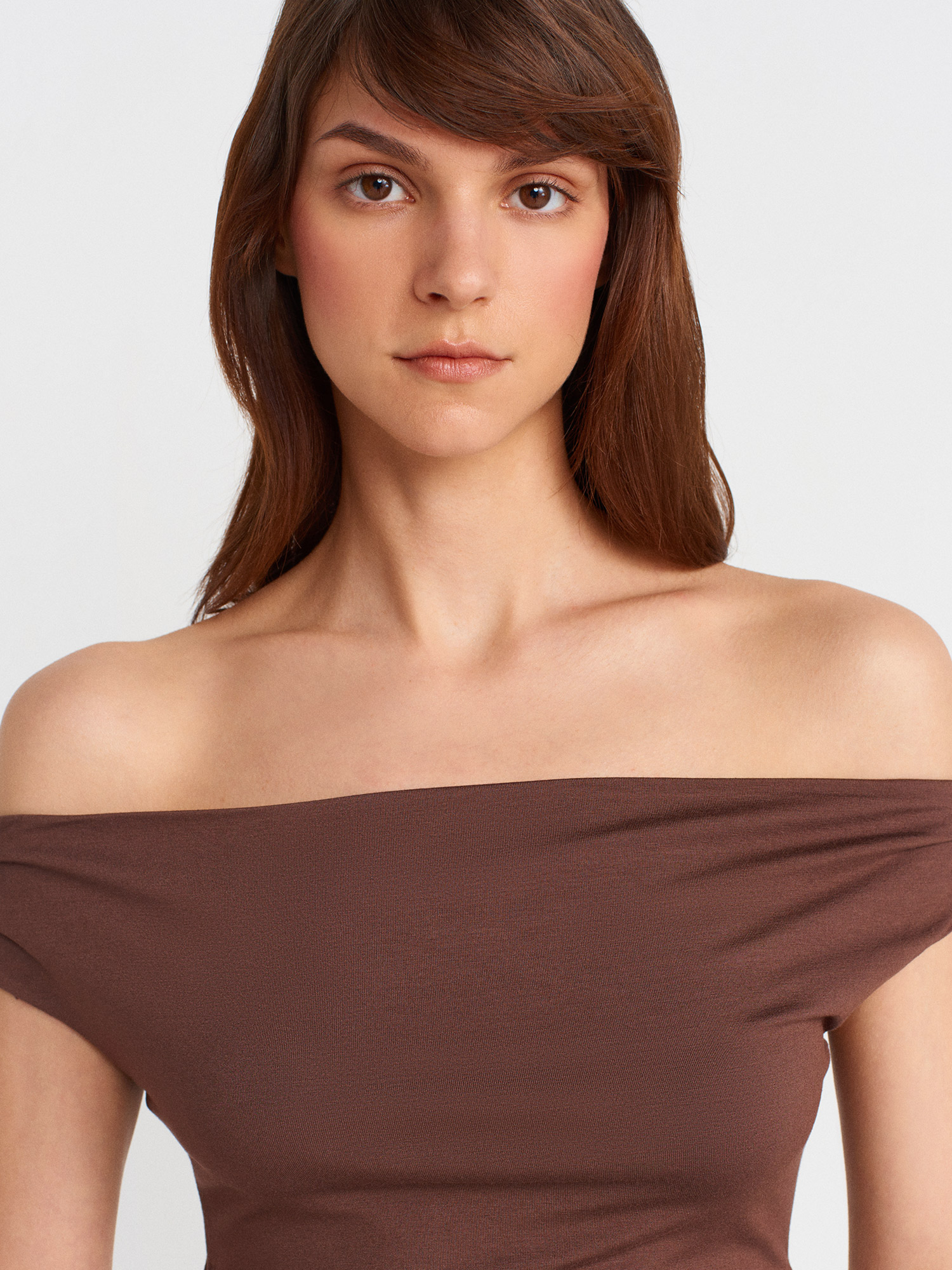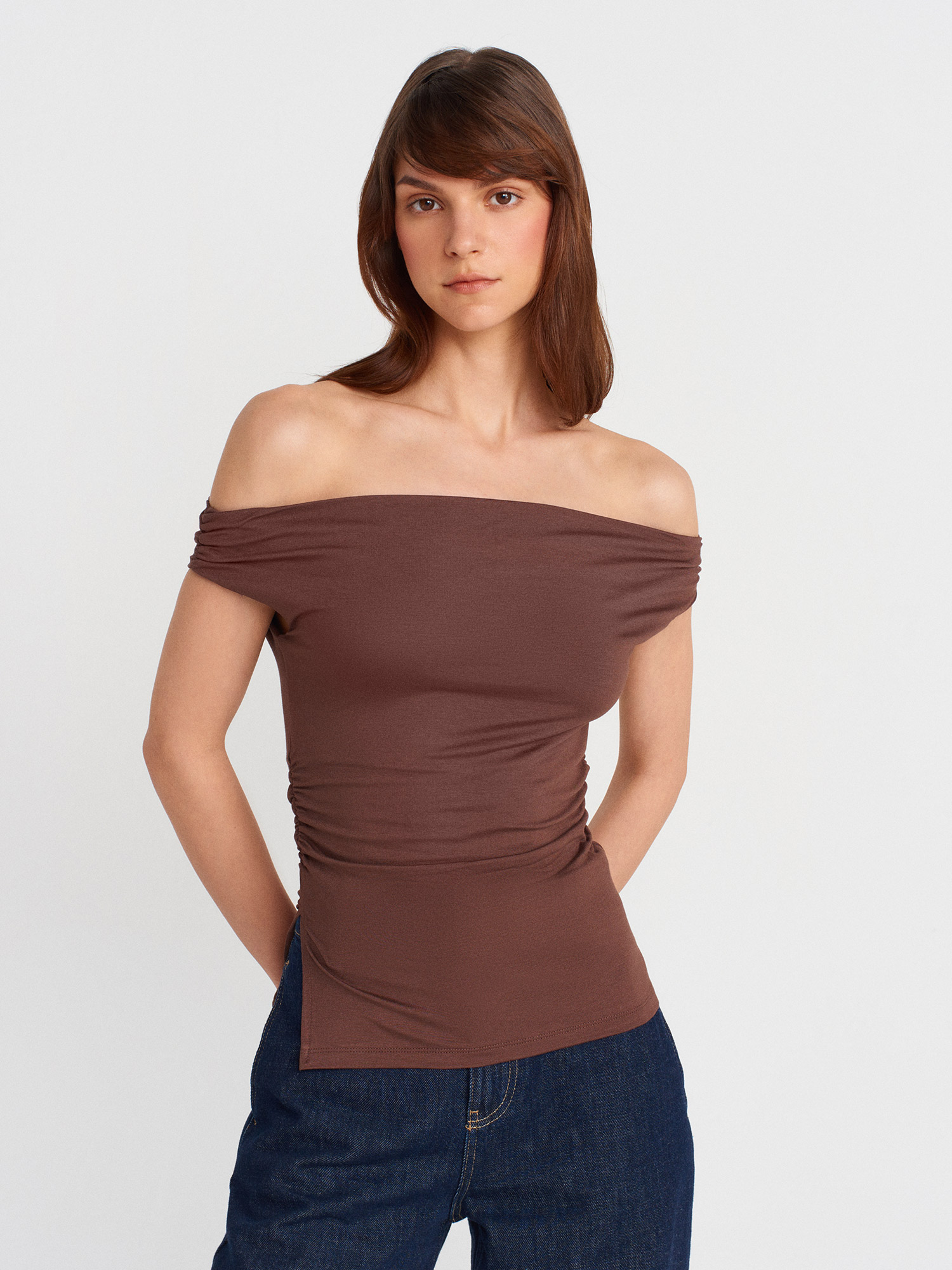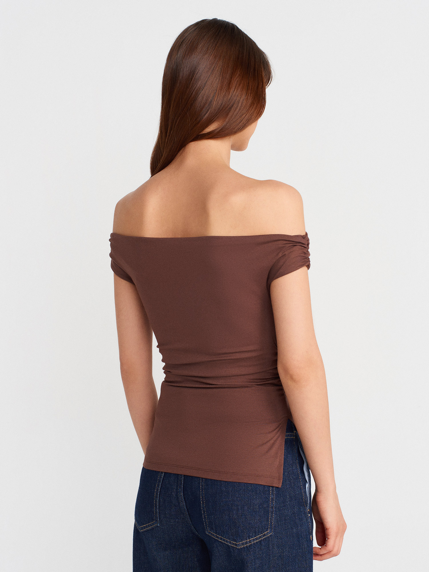 31865 Omuzları Açık Büzgülü Top-Açık Kahve