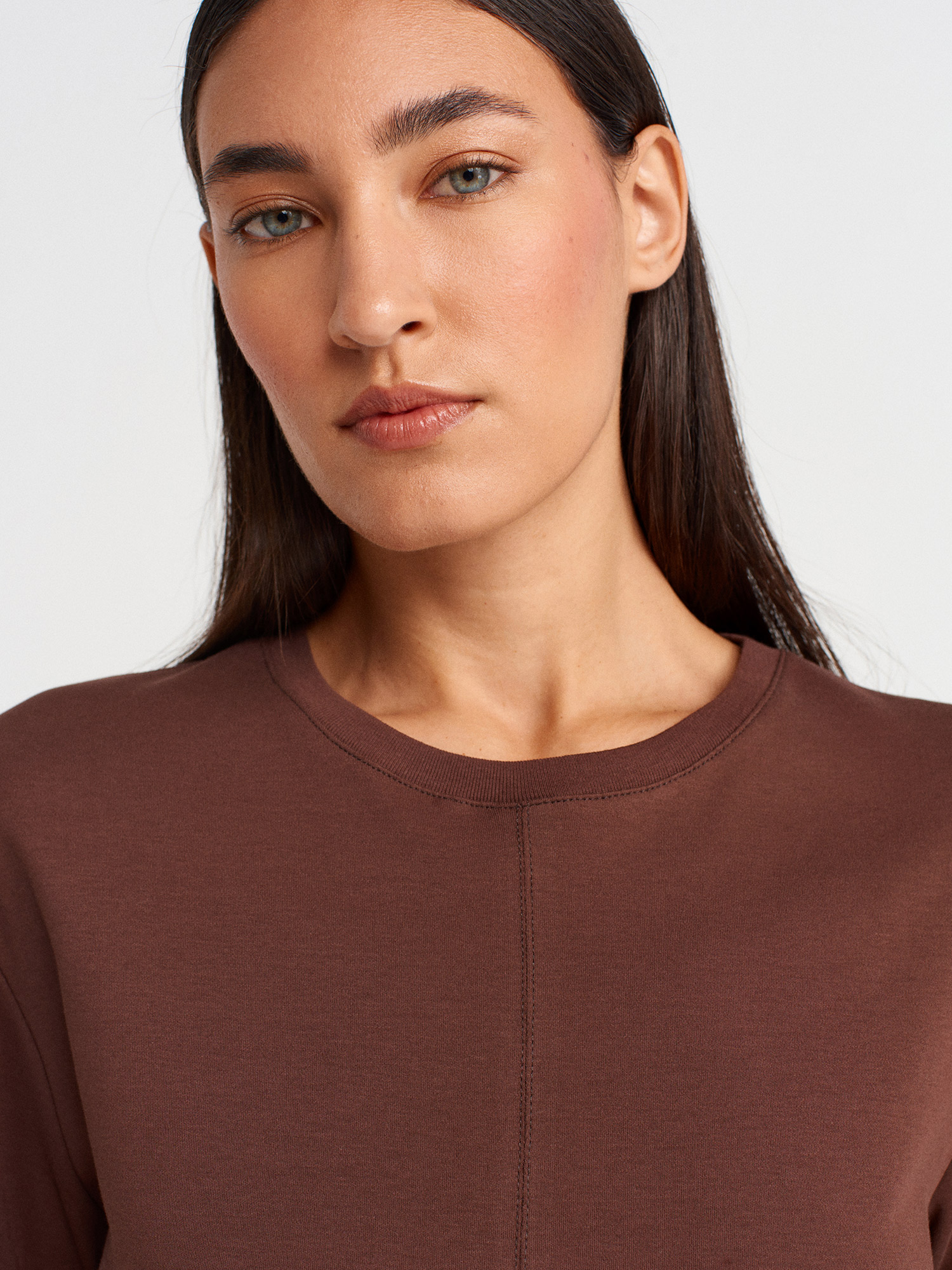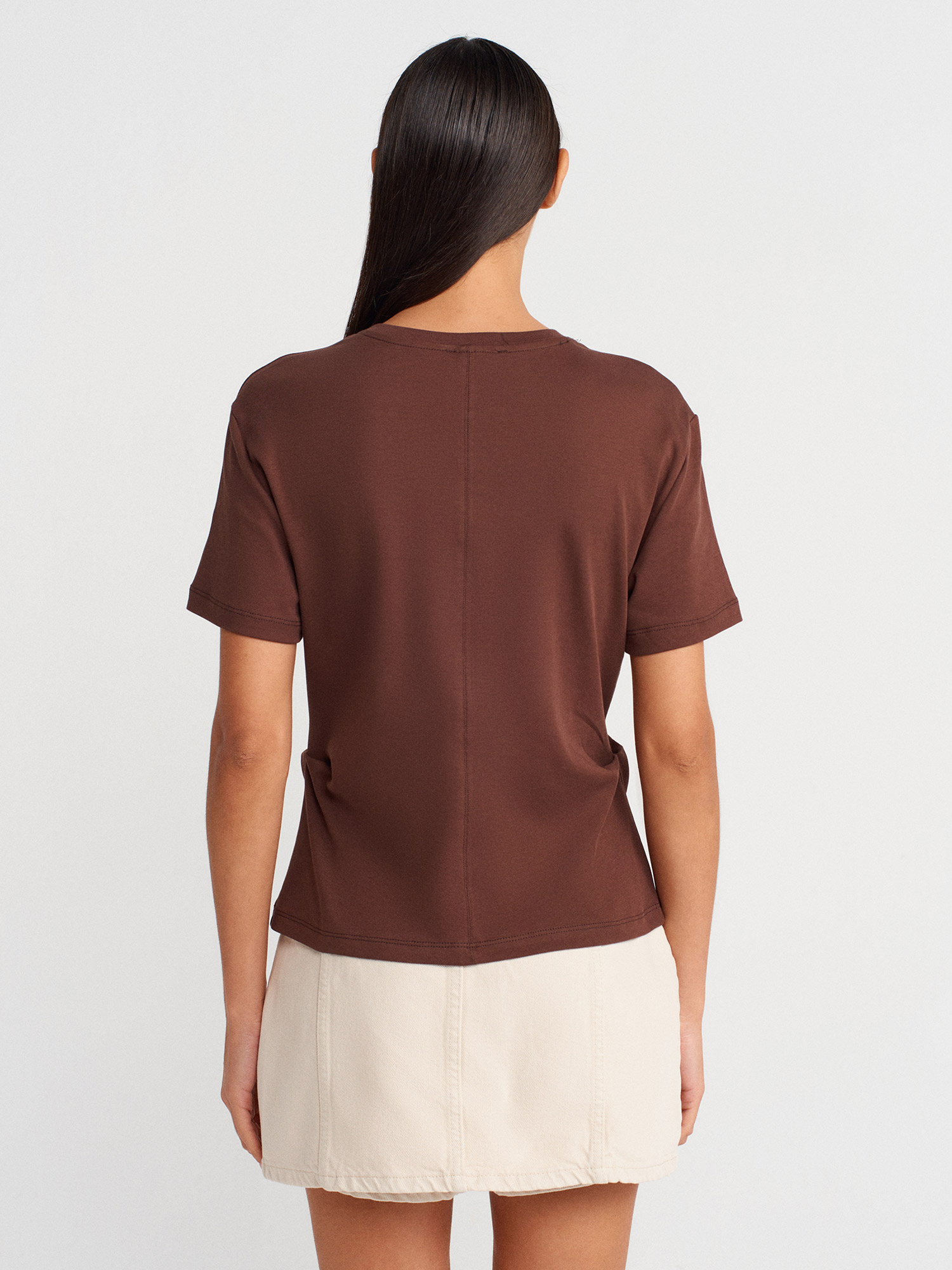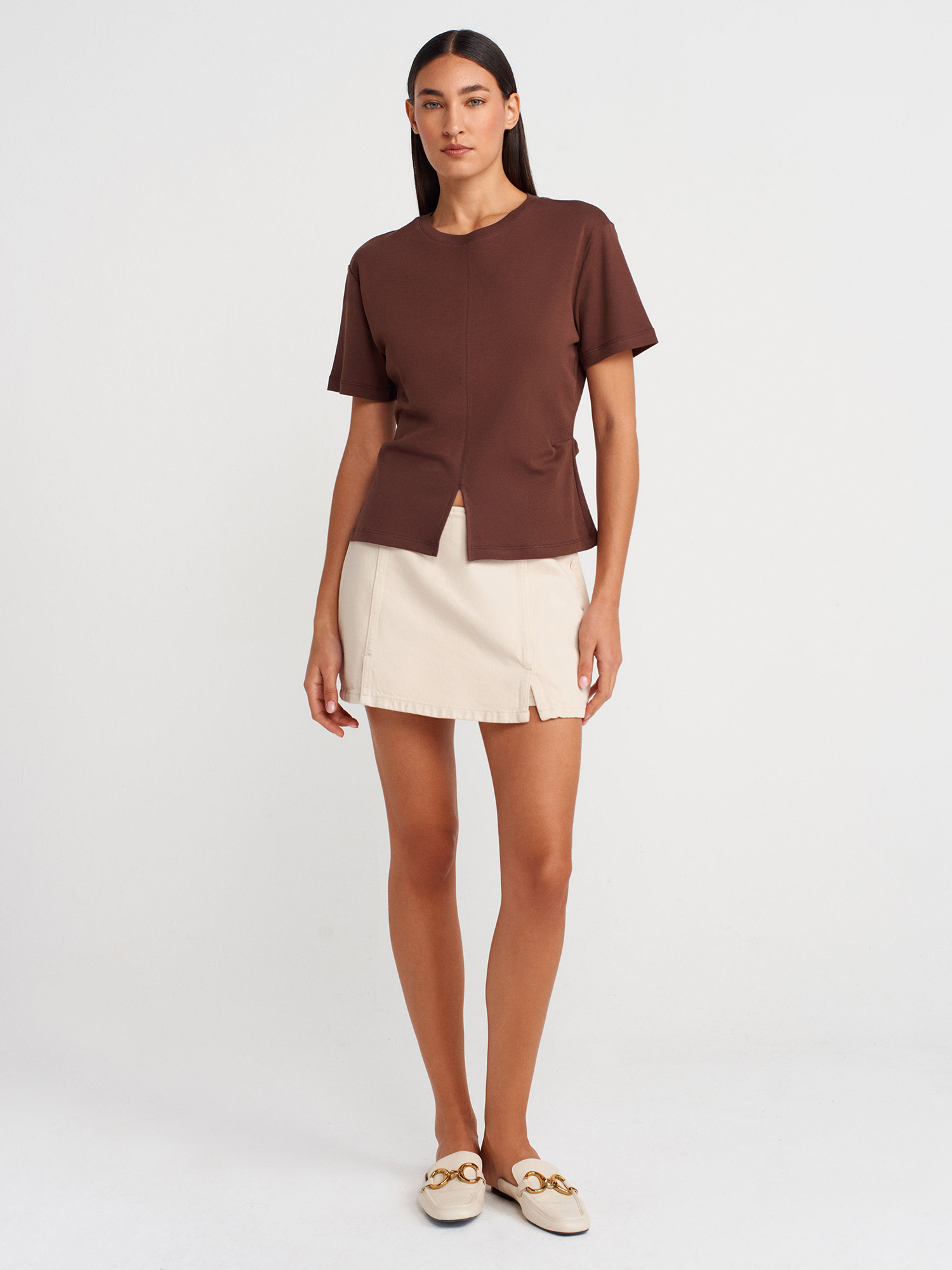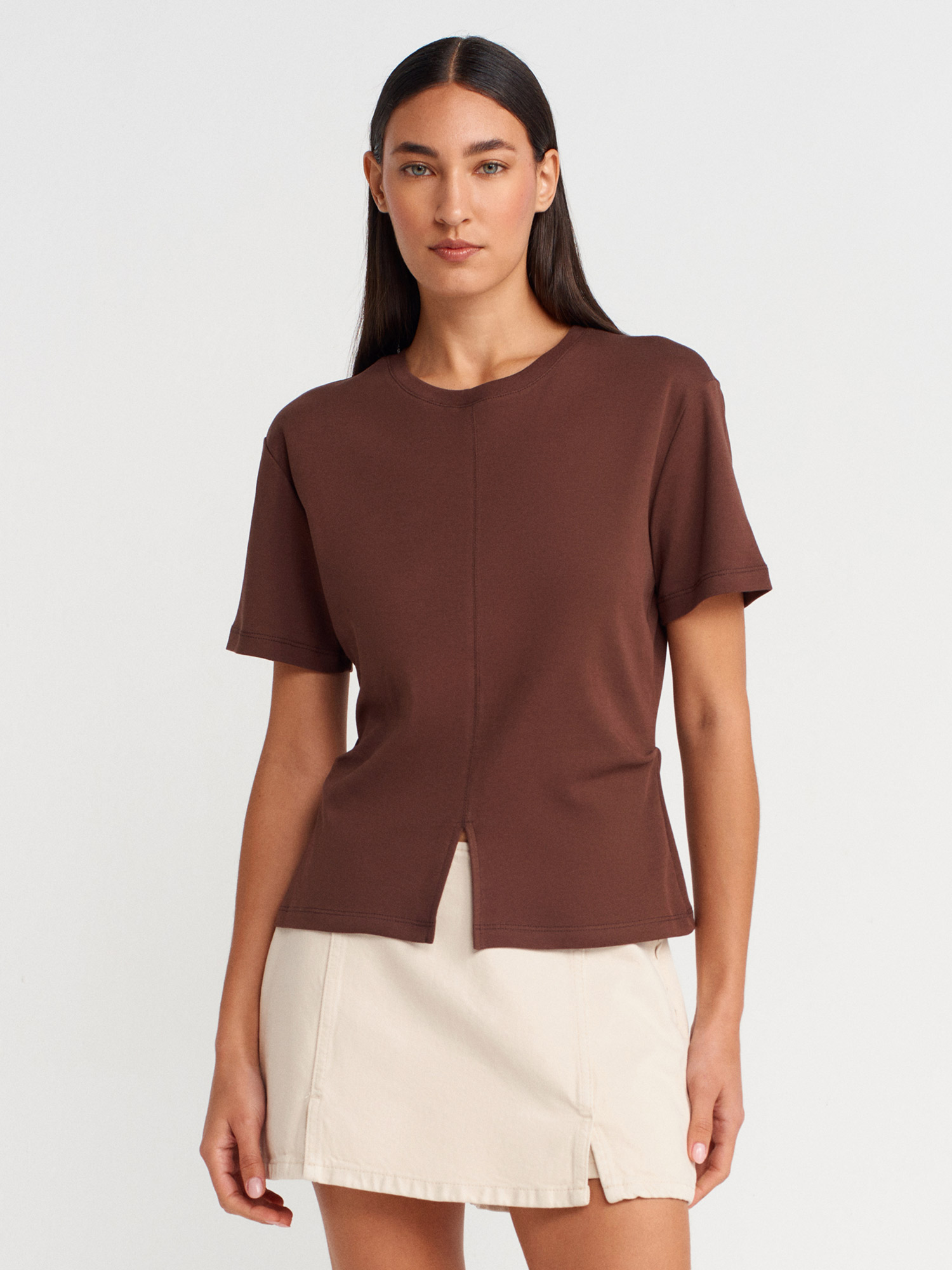 31874 %100 Pamuk Yırtmaç Detaylı T-shirt-Açık Kahve