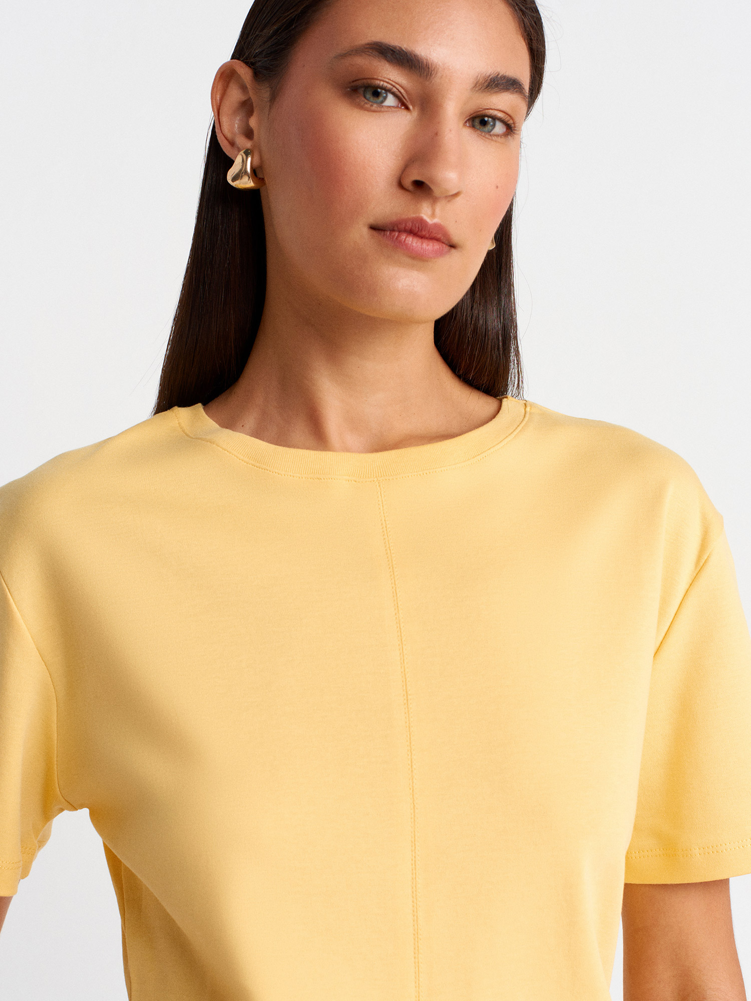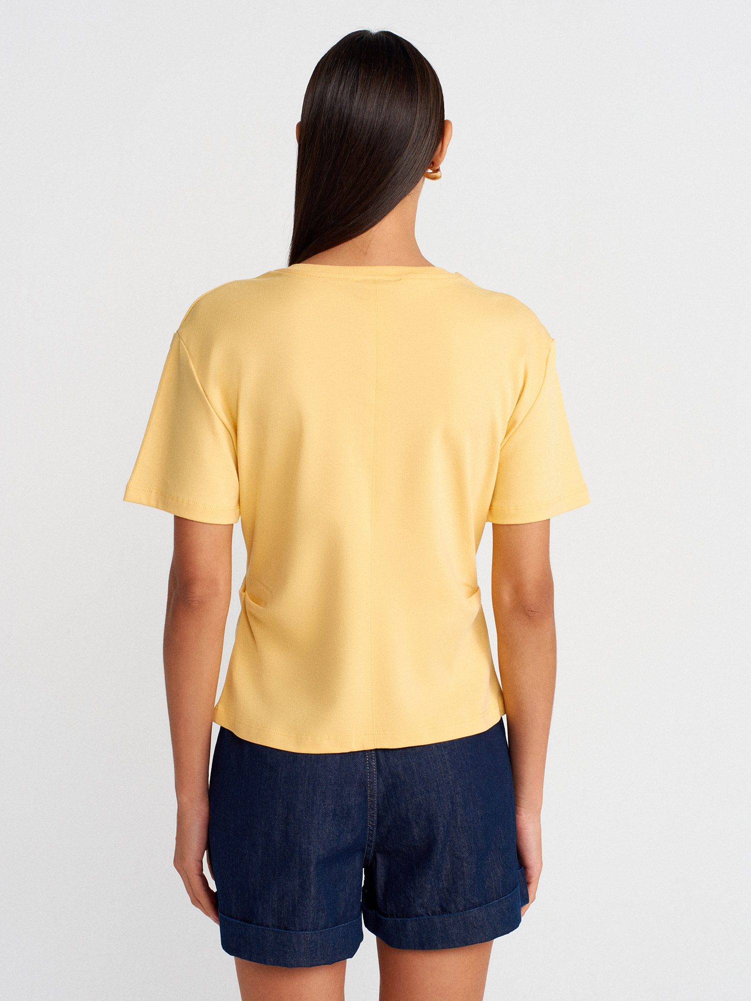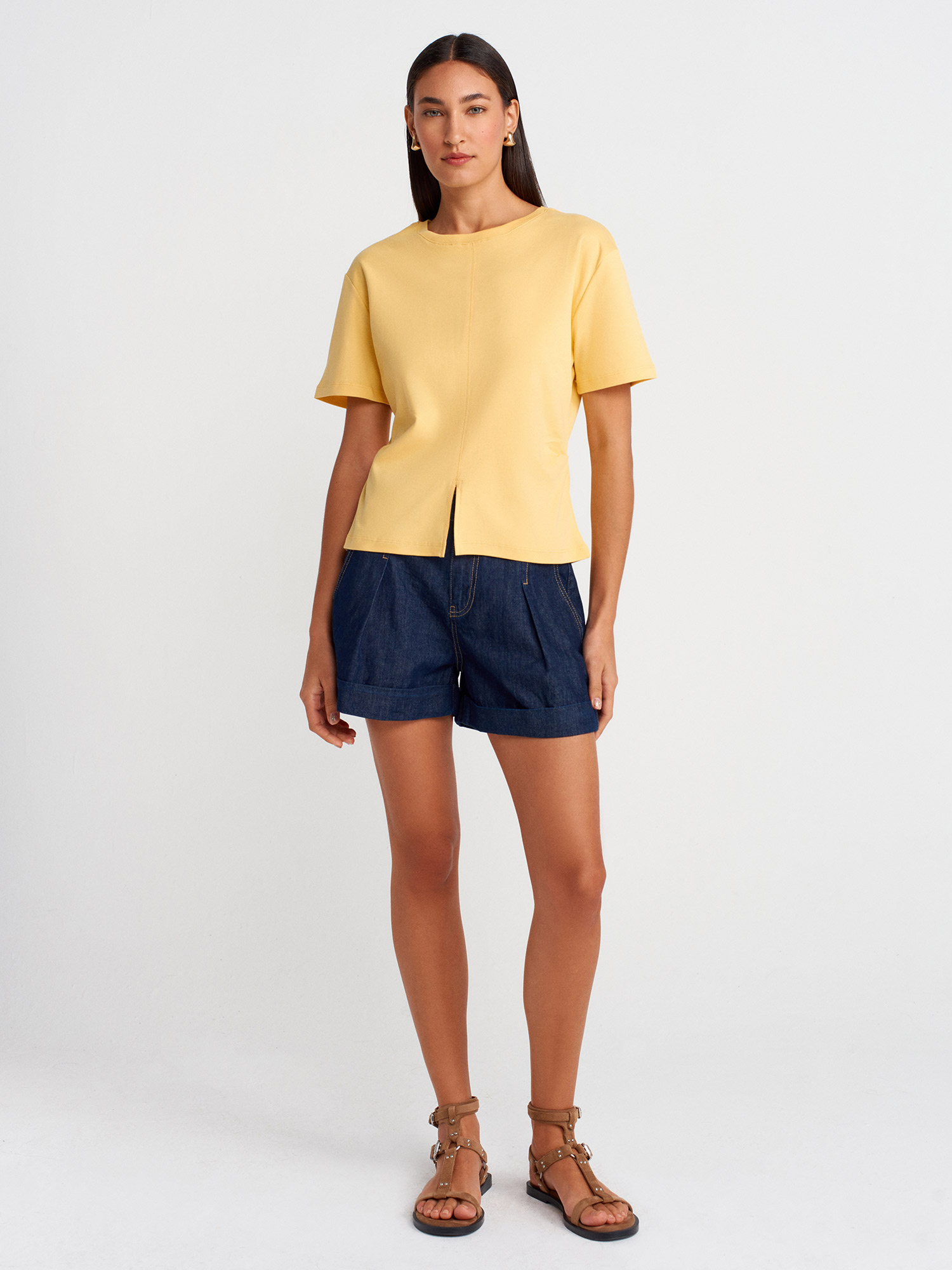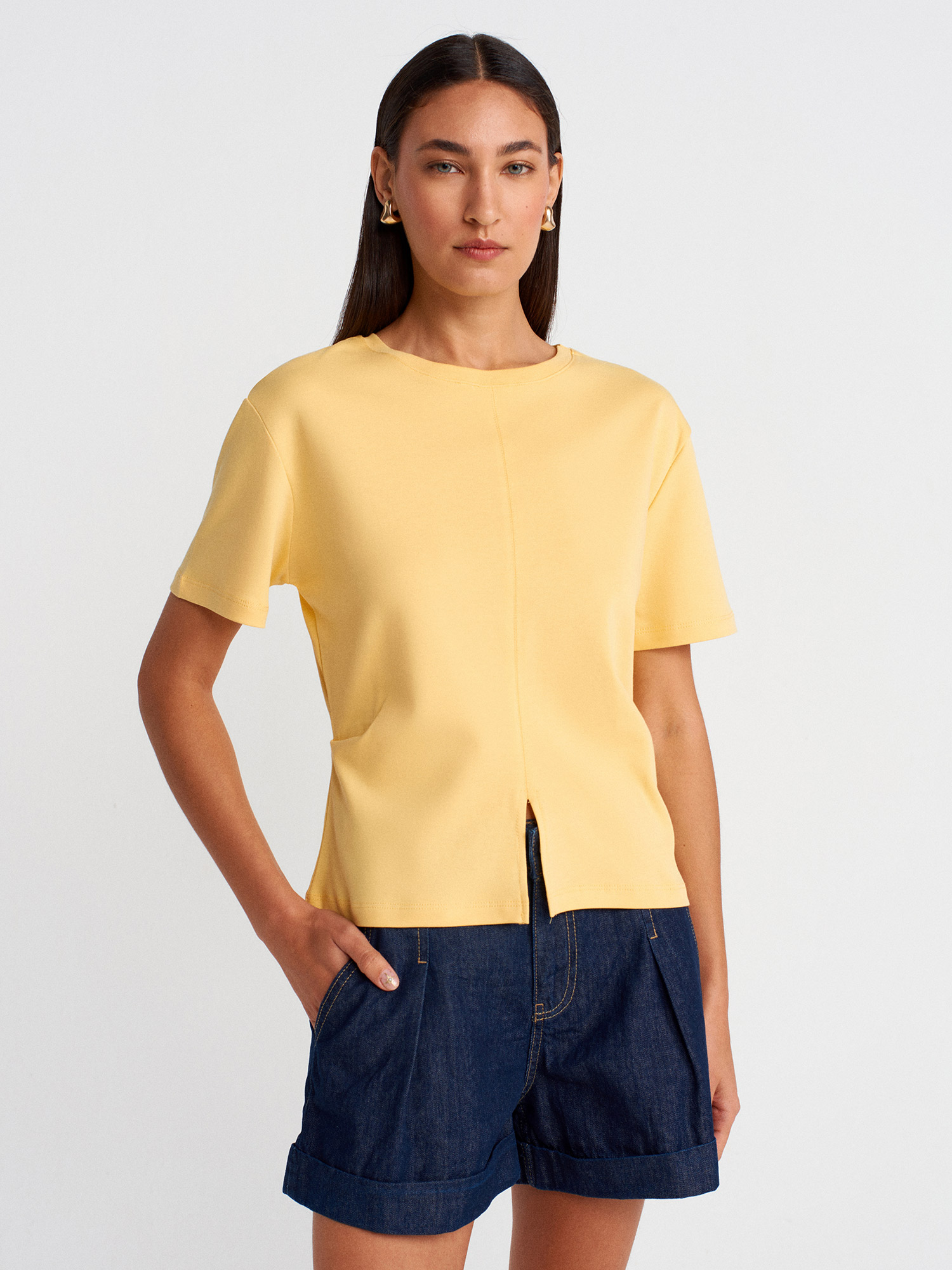31874 Yırtmaç Detaylı T-Shirt-Sarı