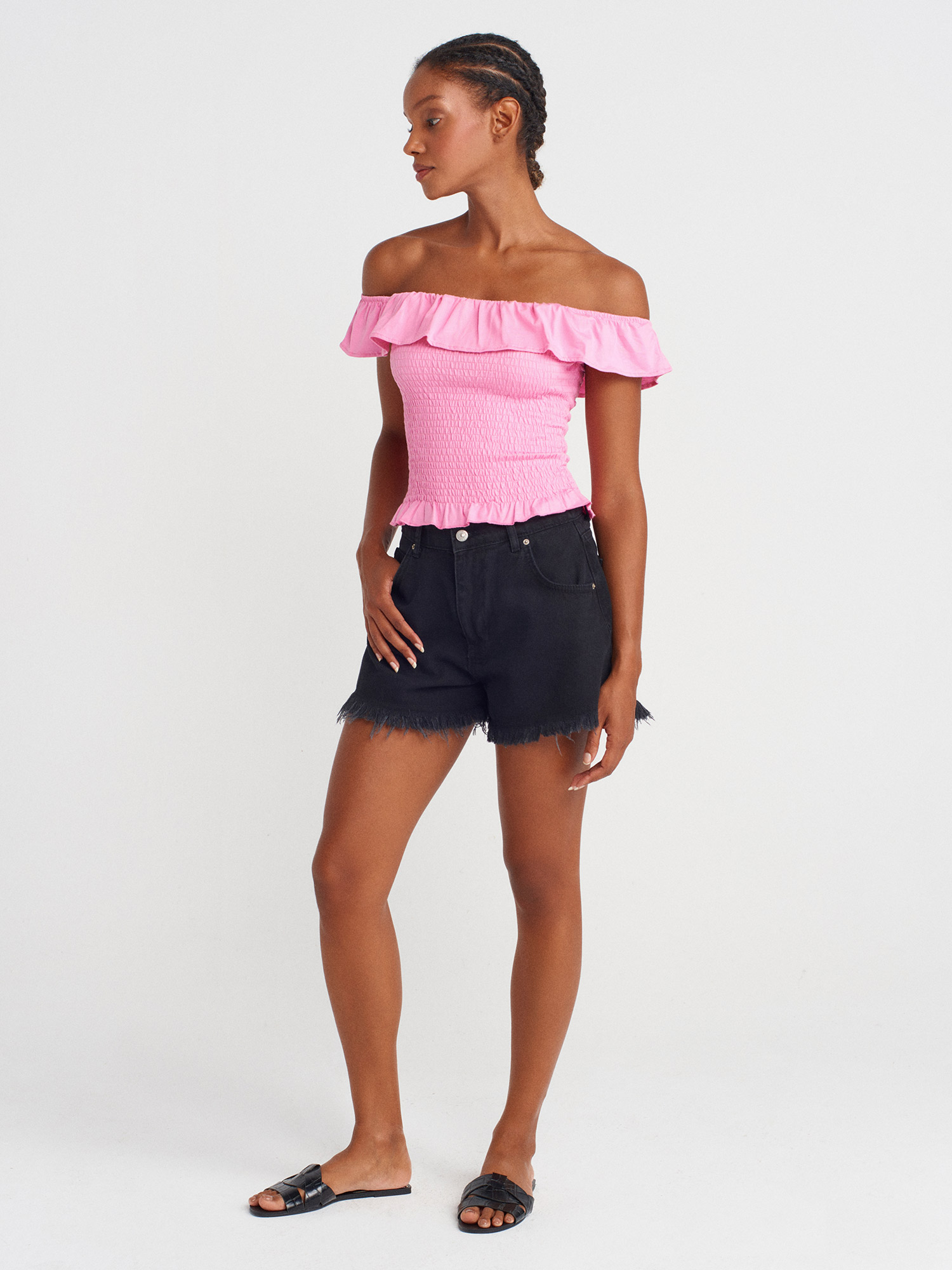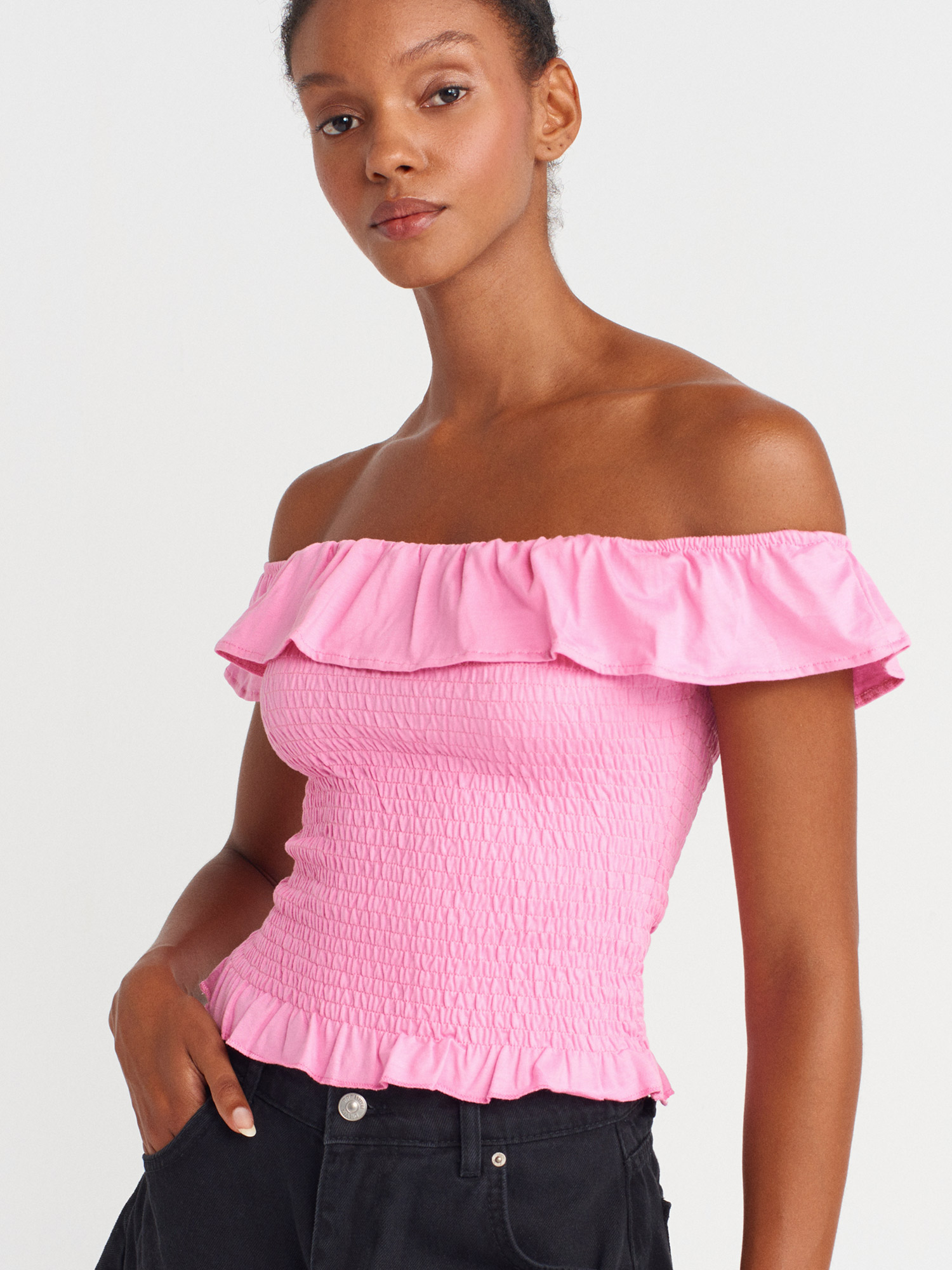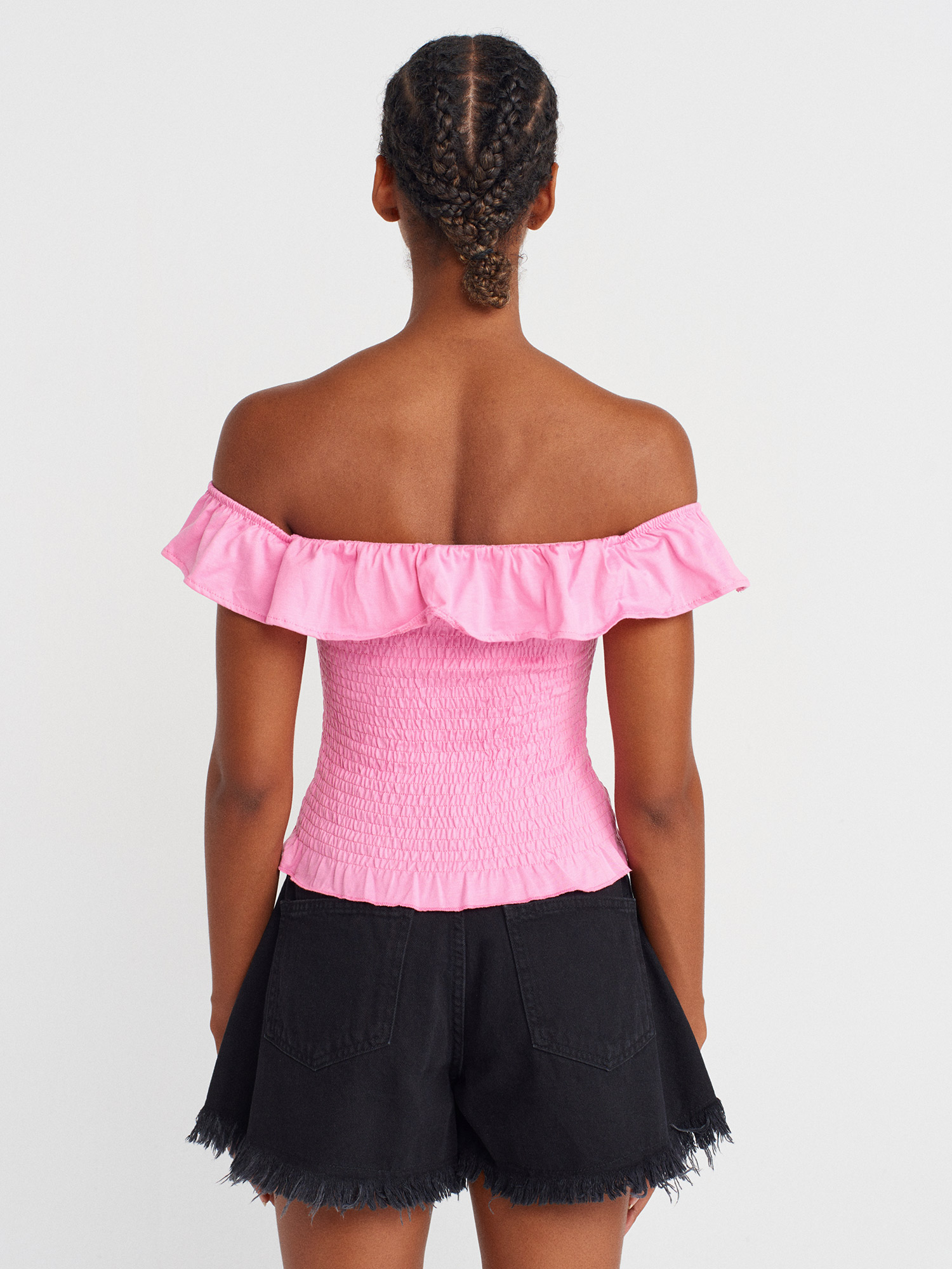 31902 Omuzları Açık Fırfırlı Top-Pembe
