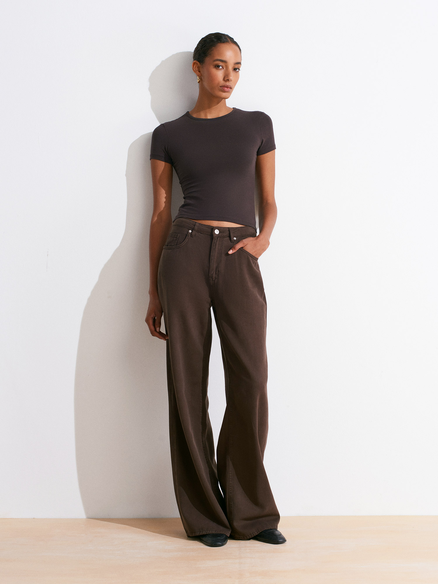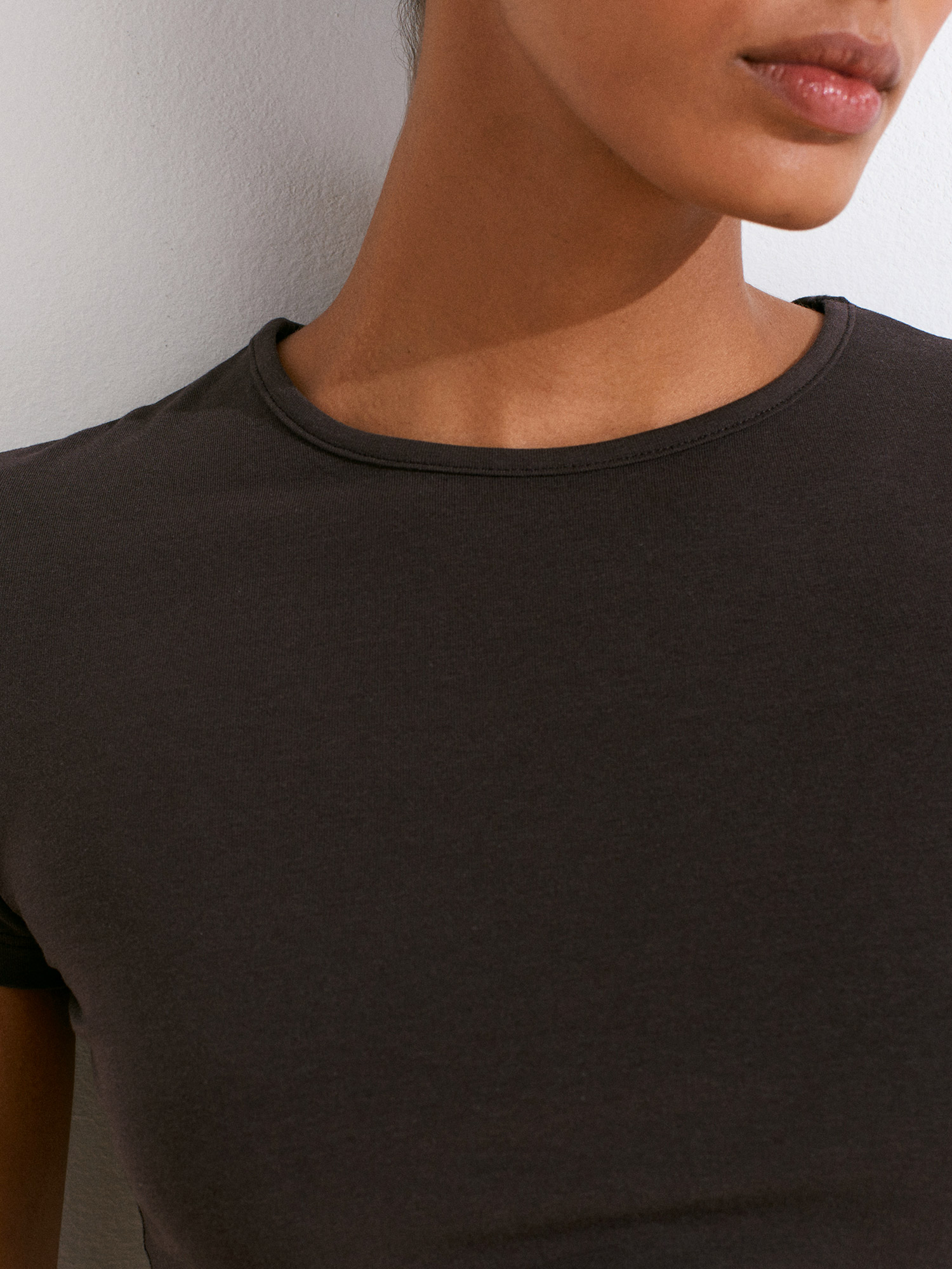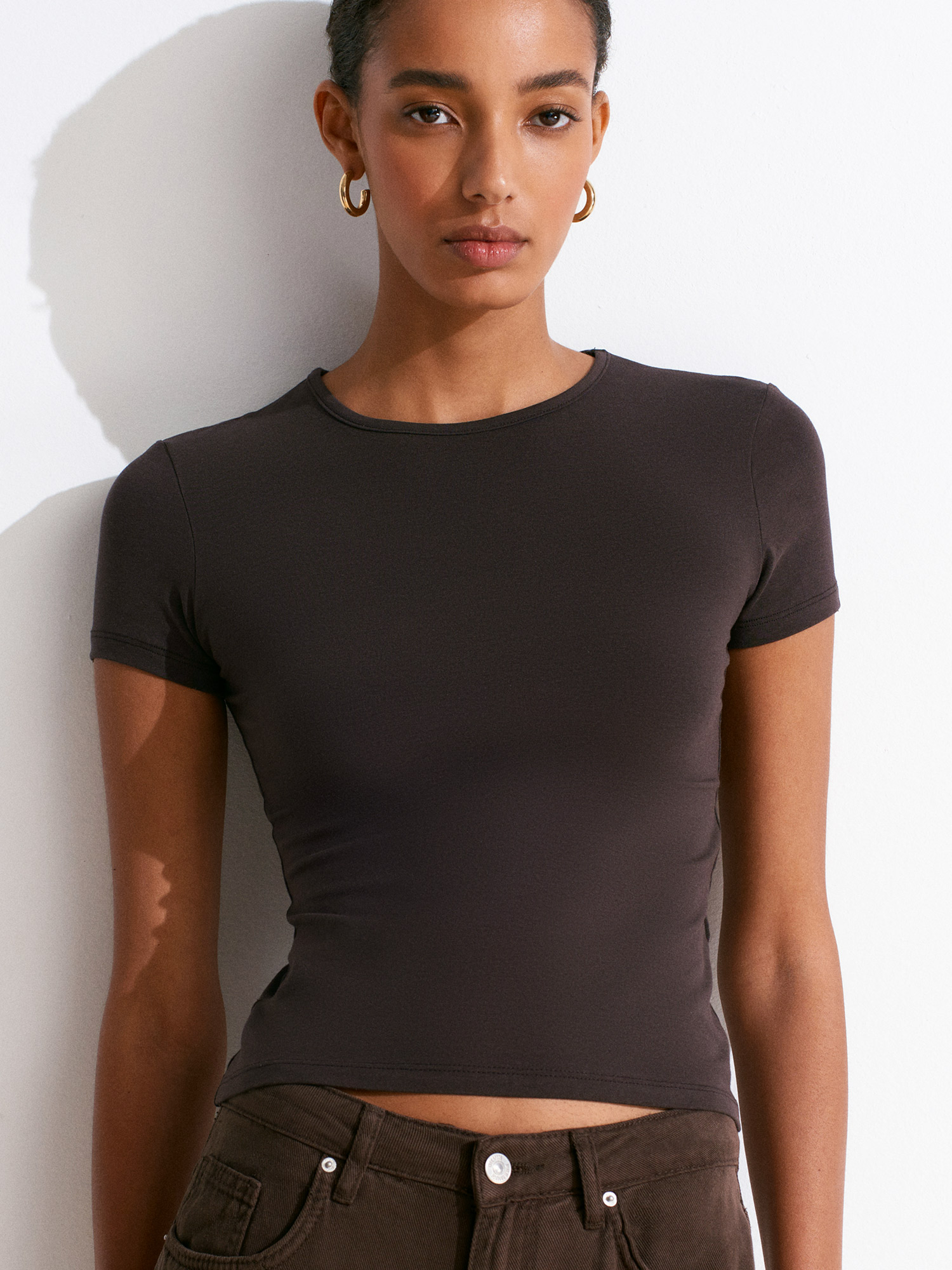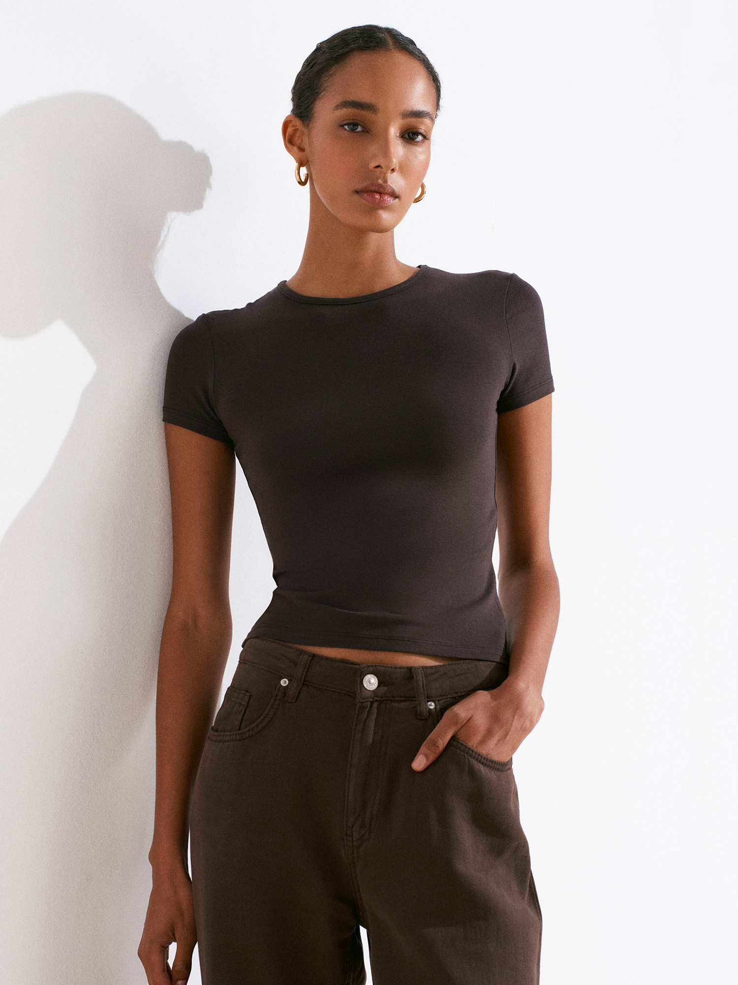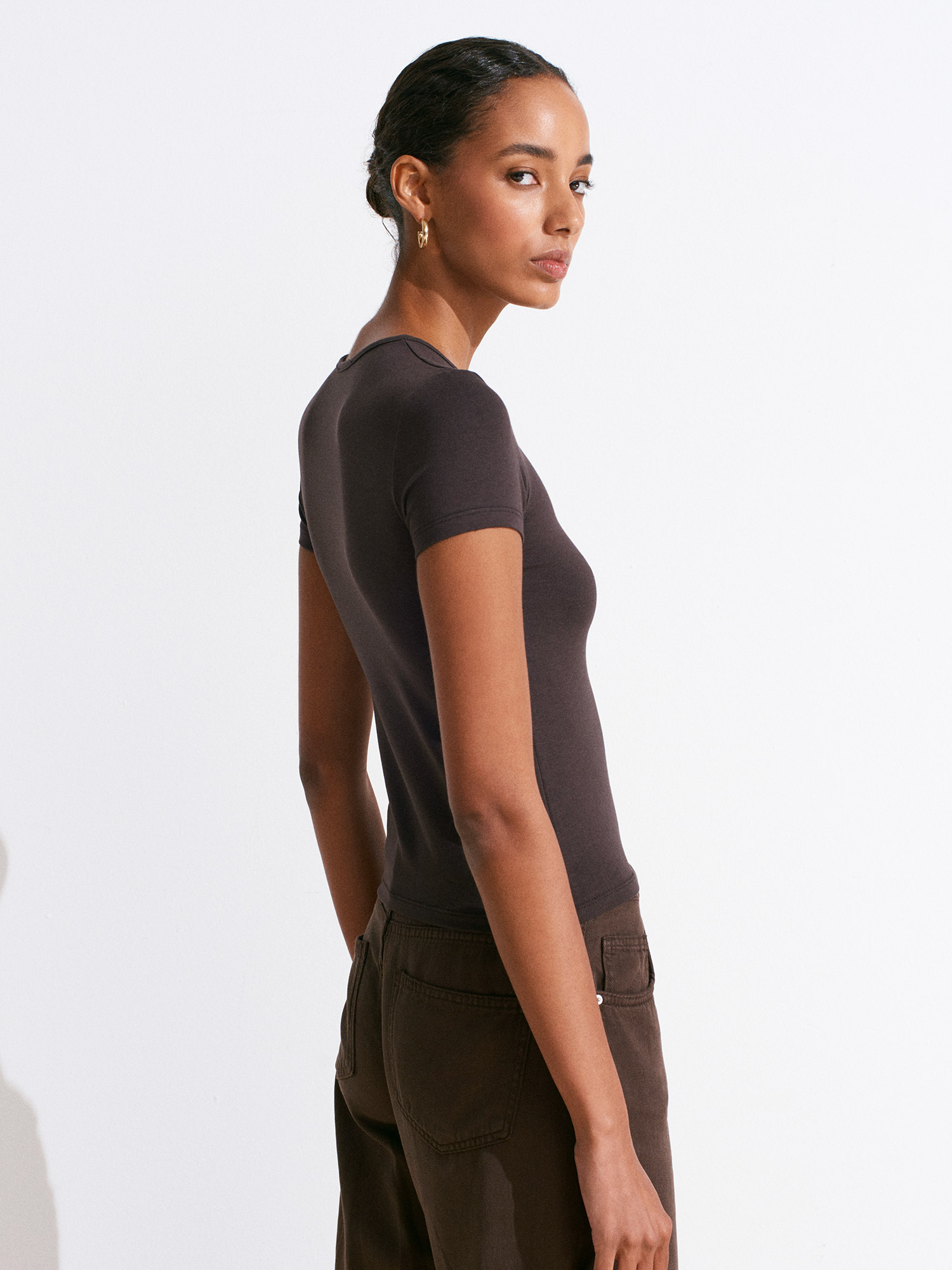 31906 Vücuda Oturan Kısa Kollu T-shirt-Koyu Kahve